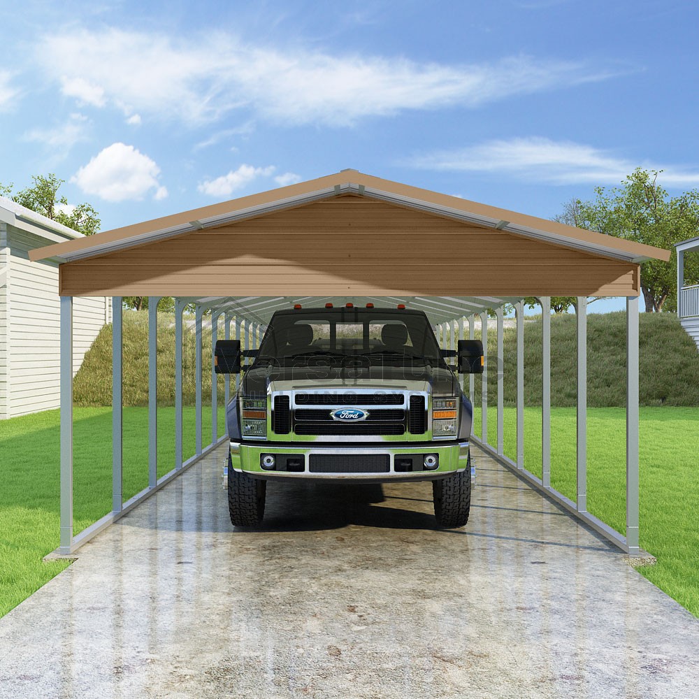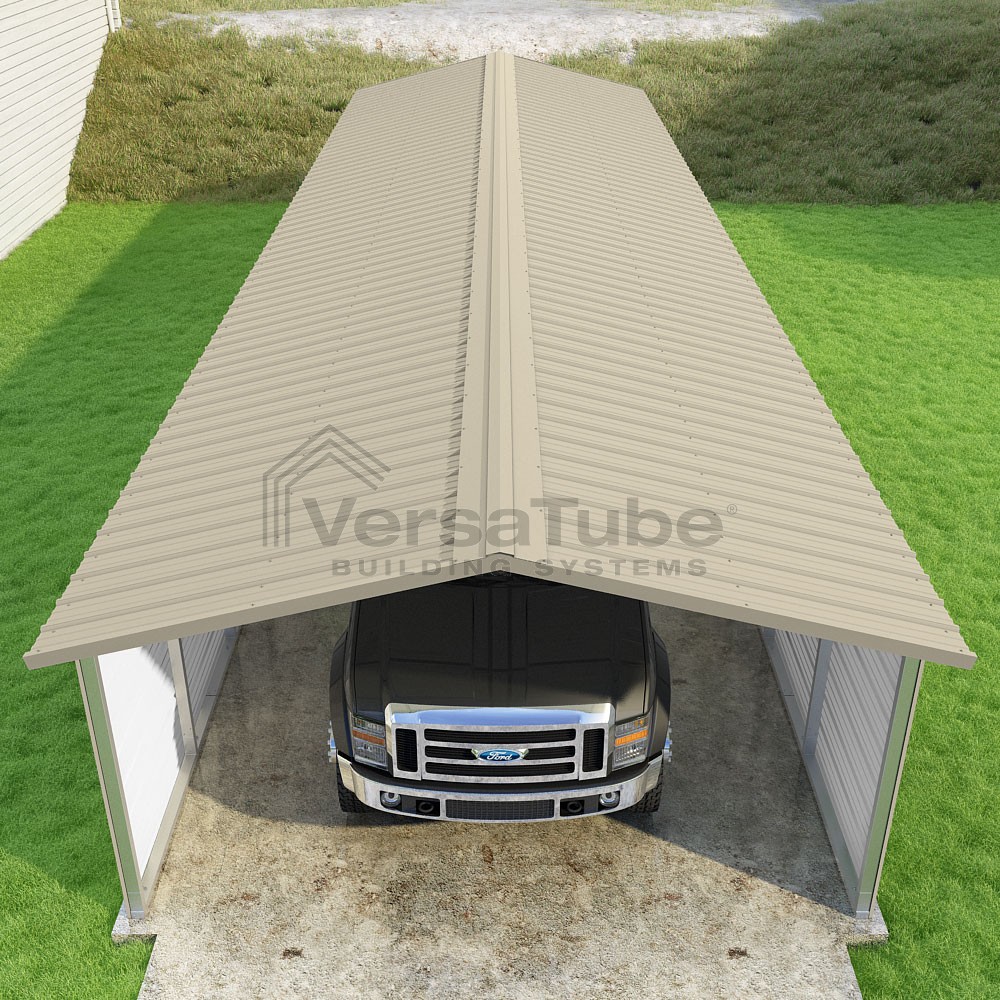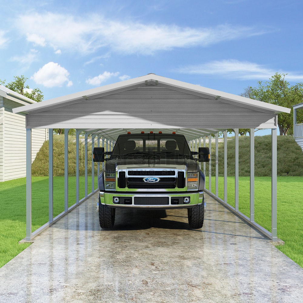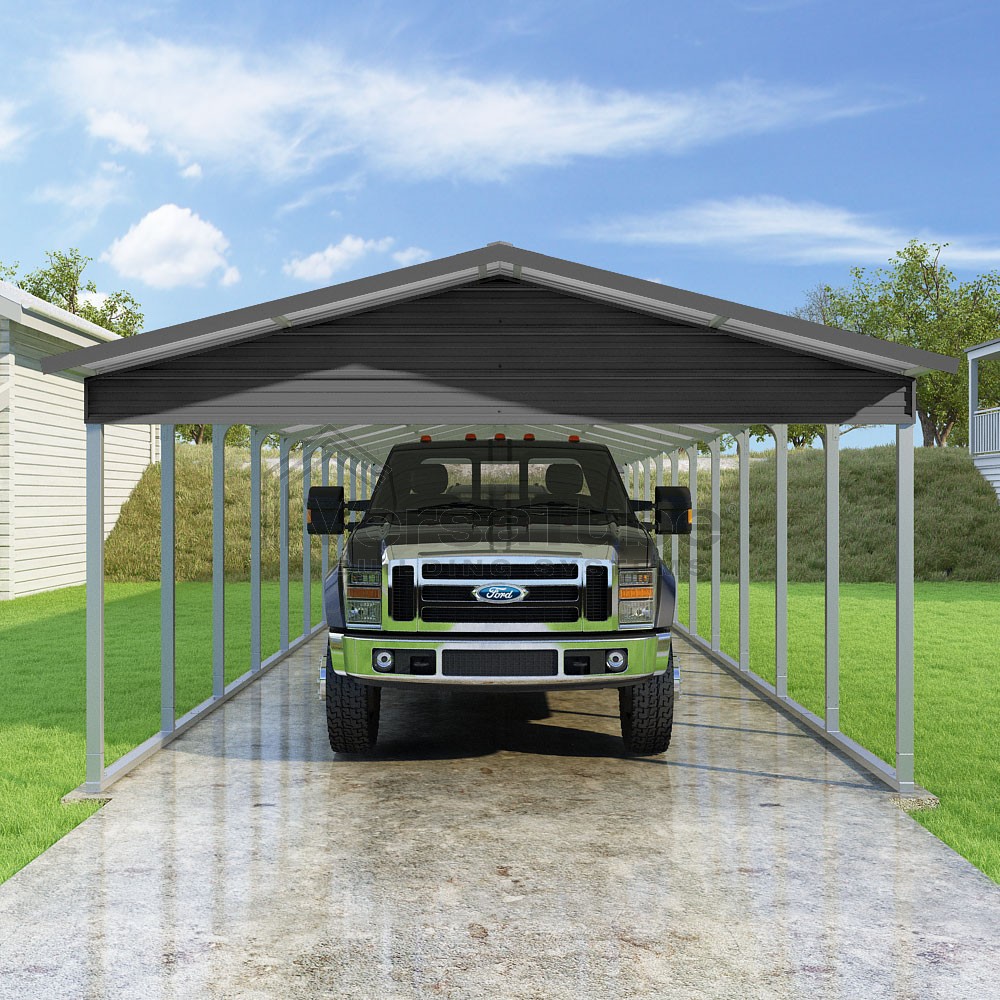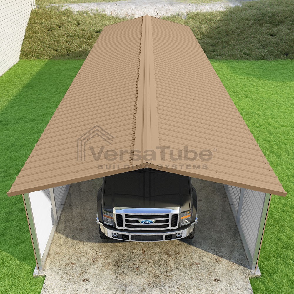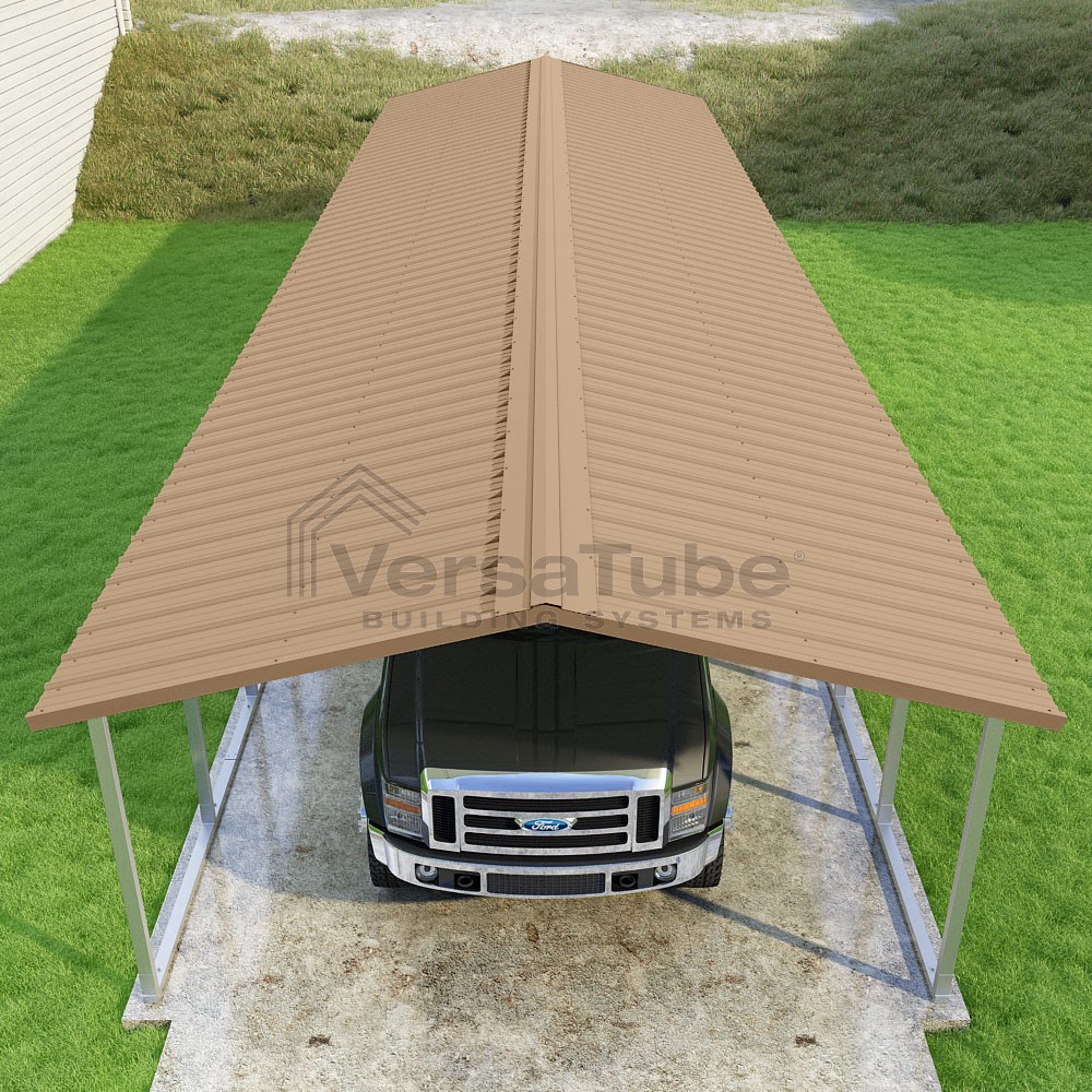 Pinnacle Series DIY carport kit features vertical sheet metal roof panels with ridge cap, gable and eave trim for an A-frame roof style and extended coverage on both ends.