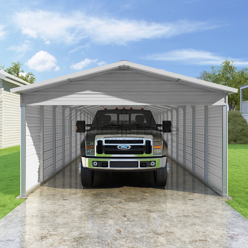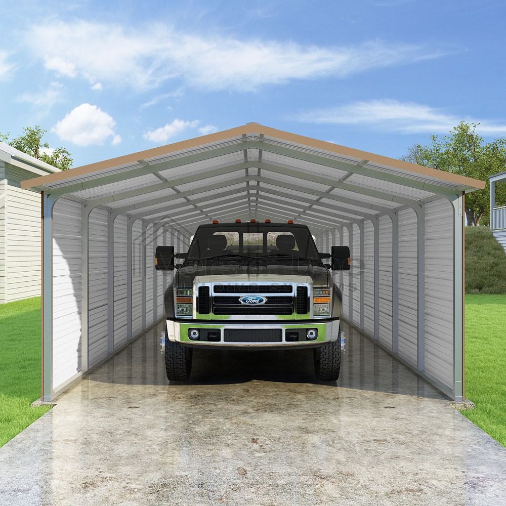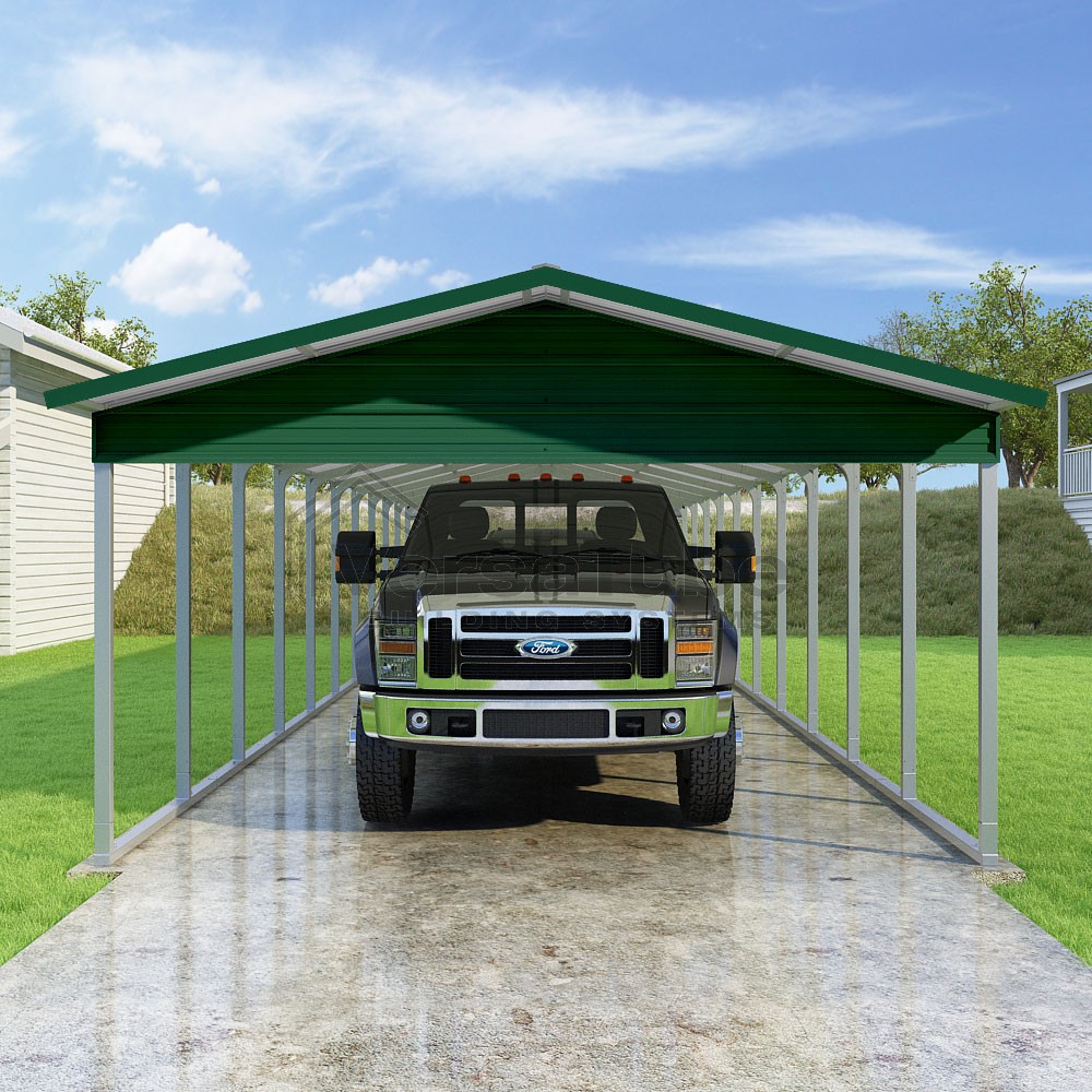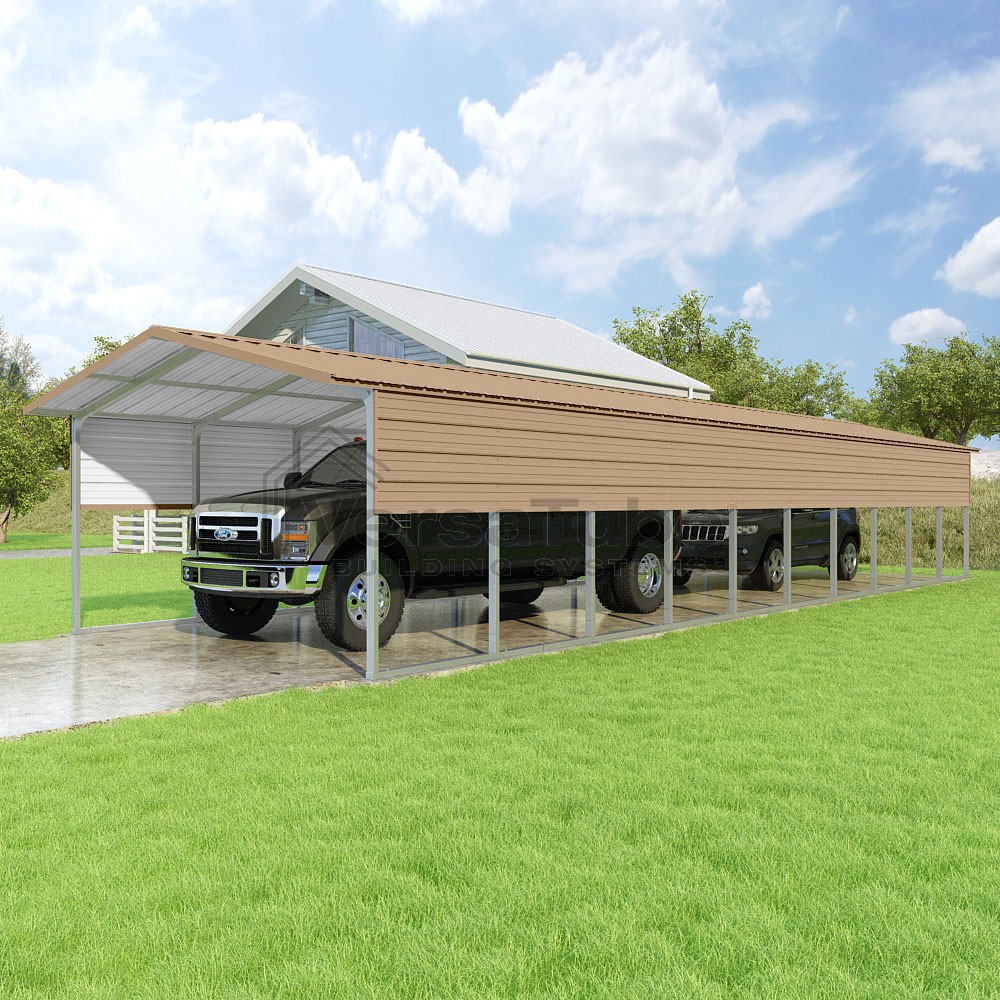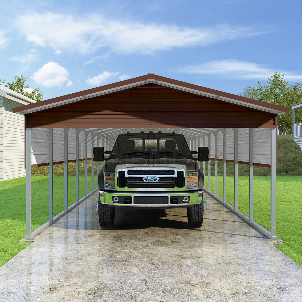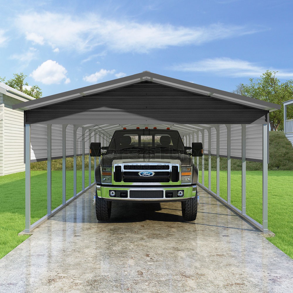 Pinnacle Series DIY carport kit features vertical sheet metal roof panels with ridge cap, gable and eave trim for an A-frame roof style and extended coverage on both ends.
