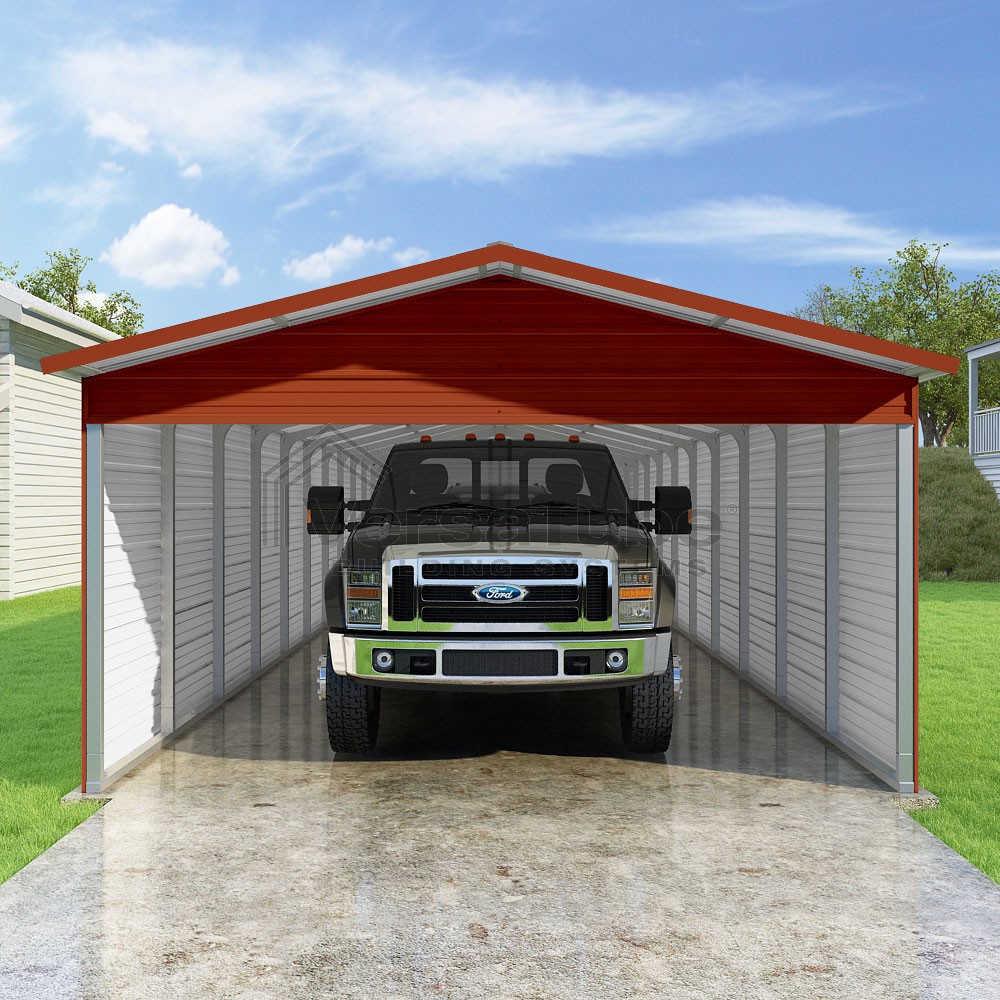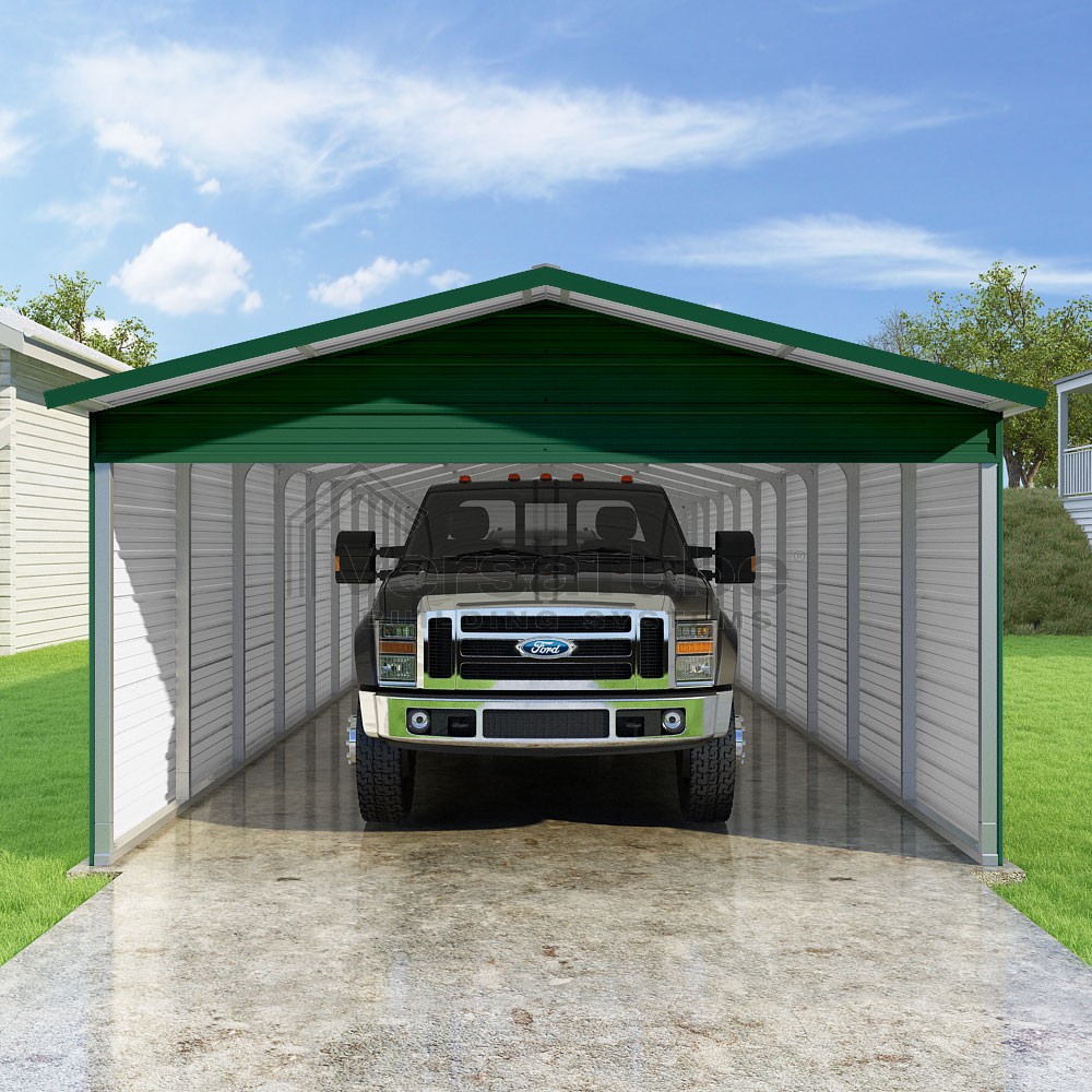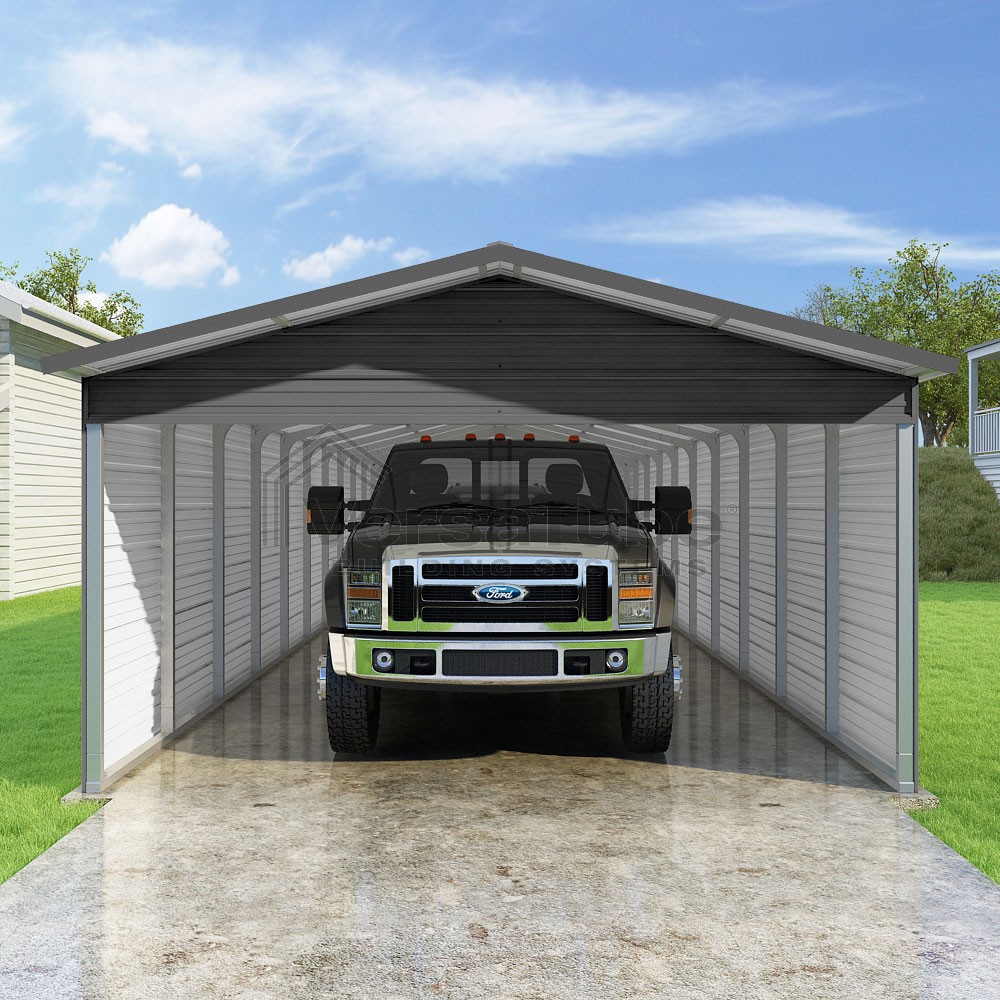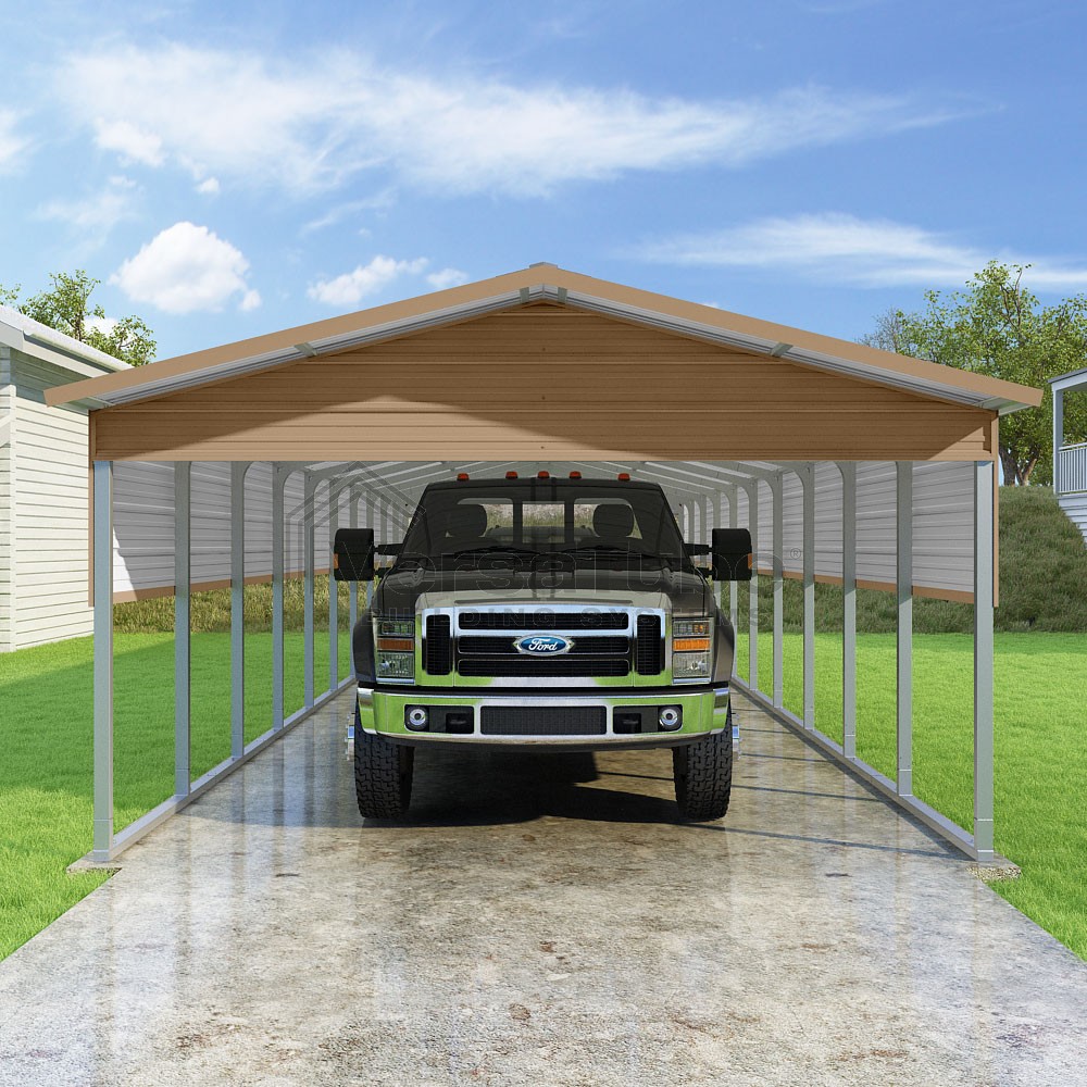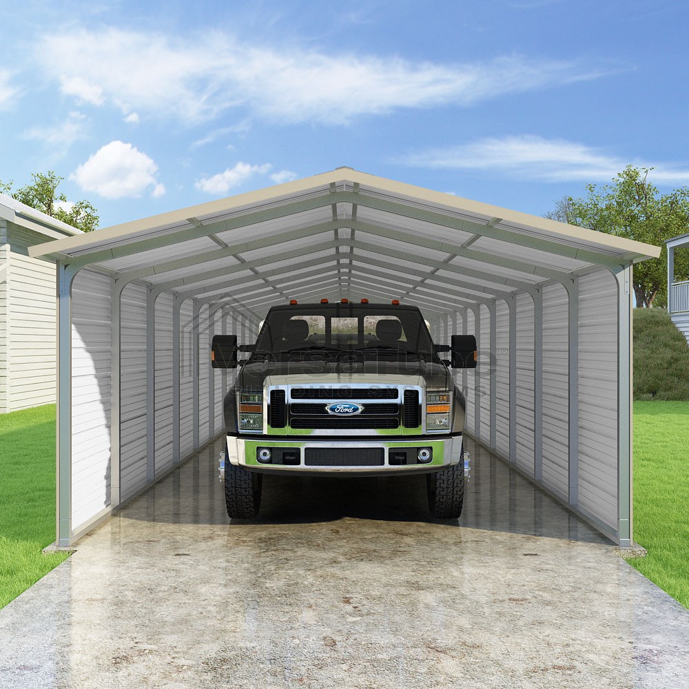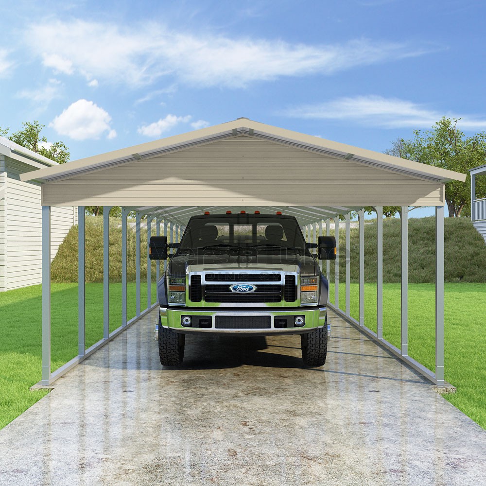 Pinnacle Series DIY carport kit features vertical sheet metal roof panels with ridge cap, gable and eave trim for an A-frame roof style and extended coverage on both ends.