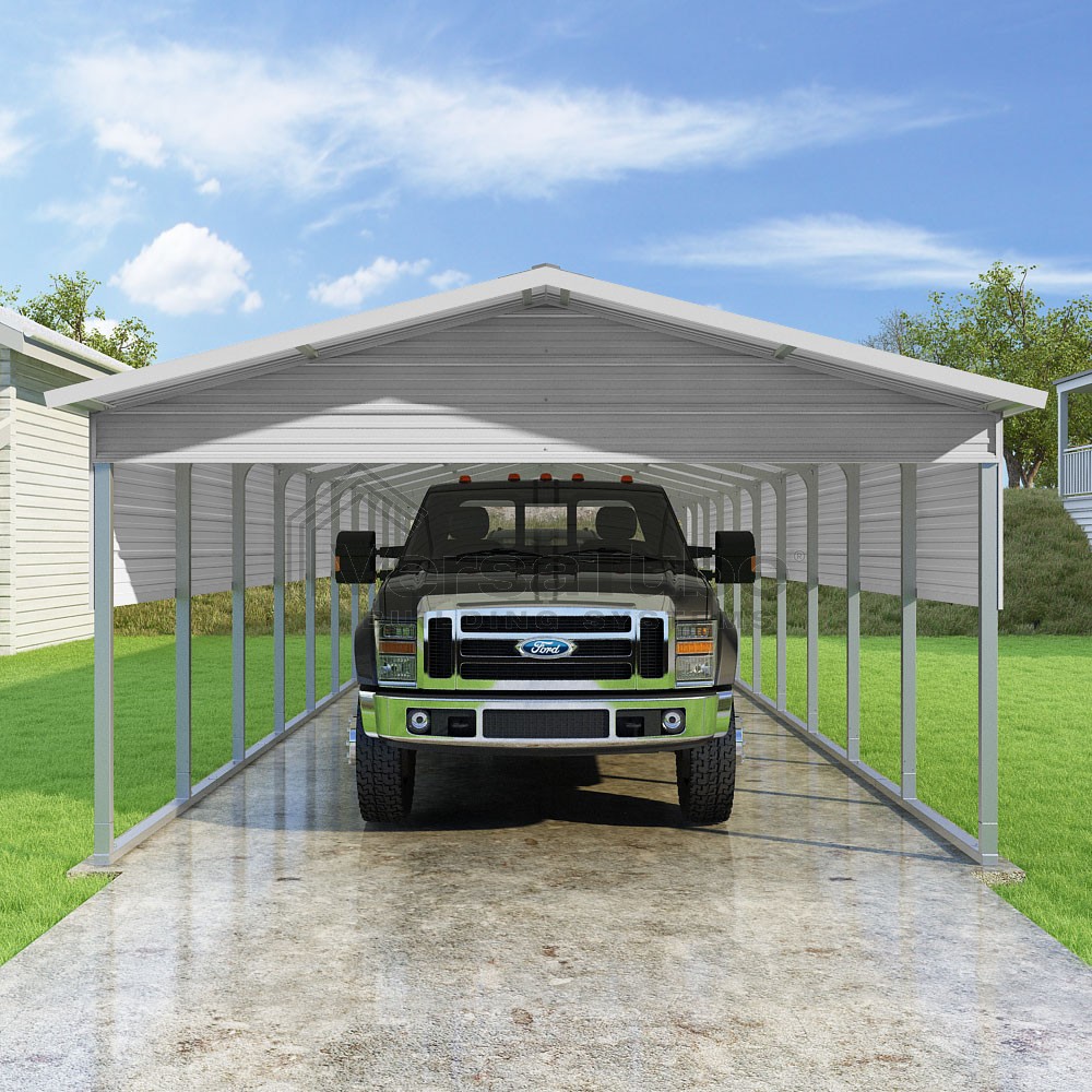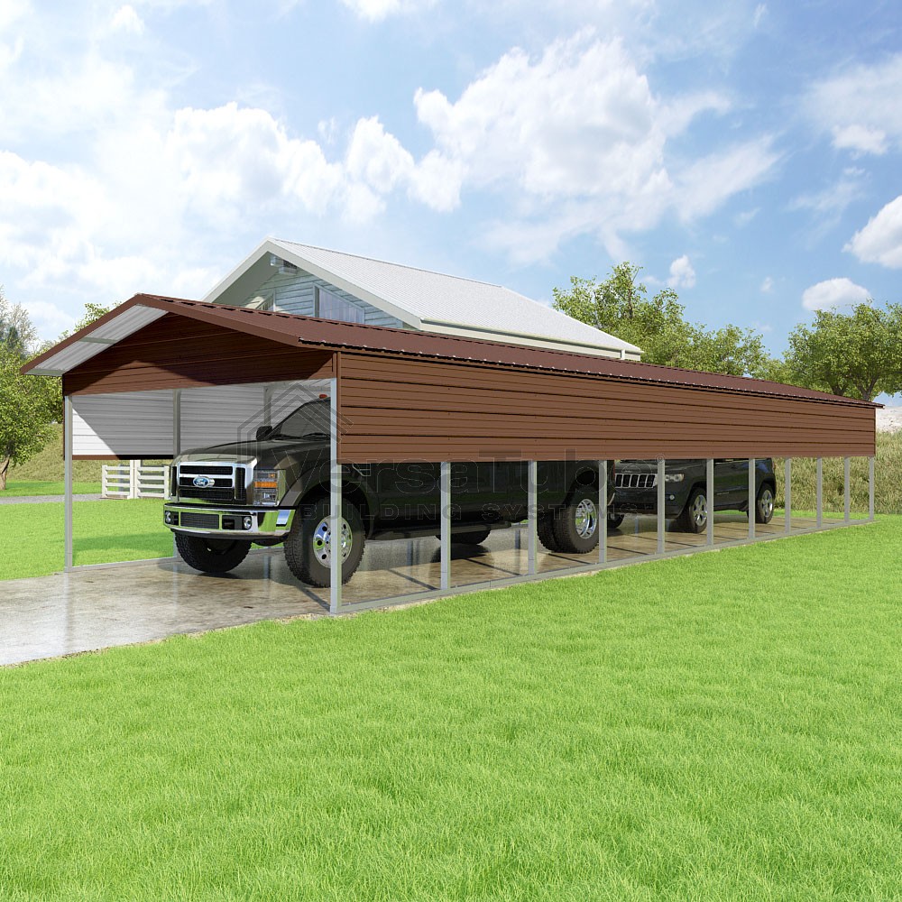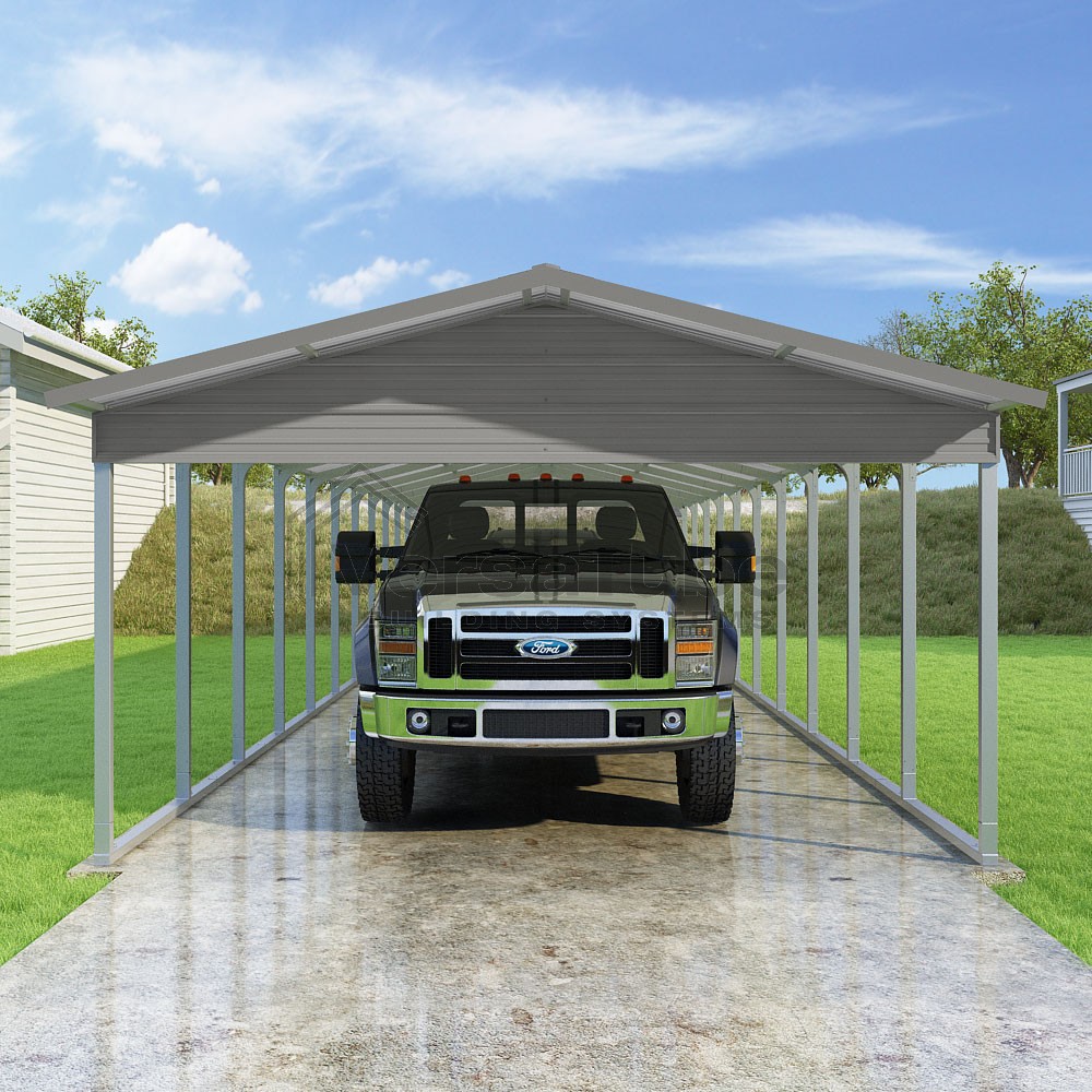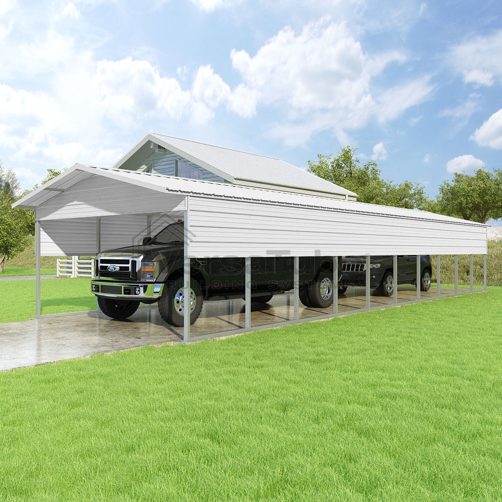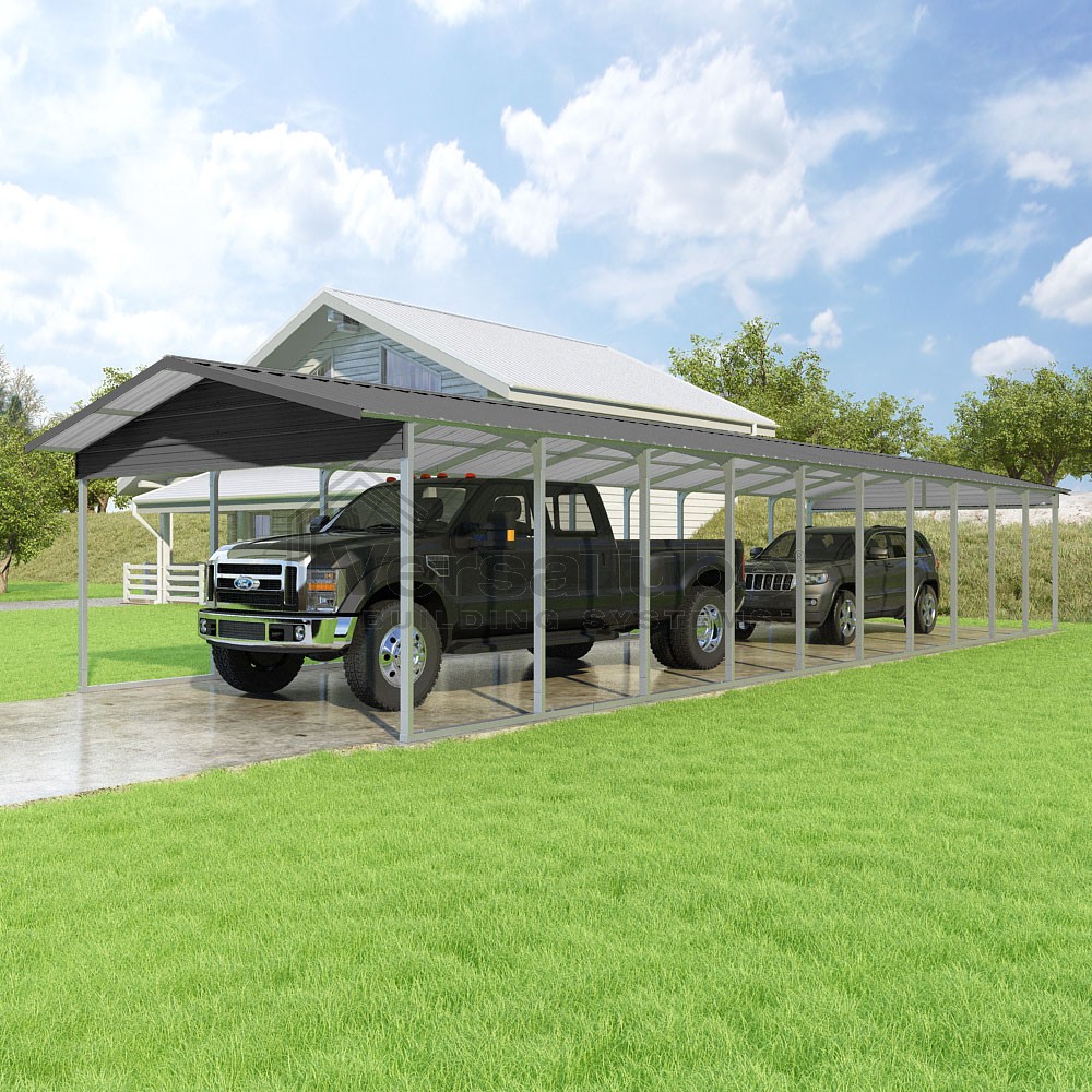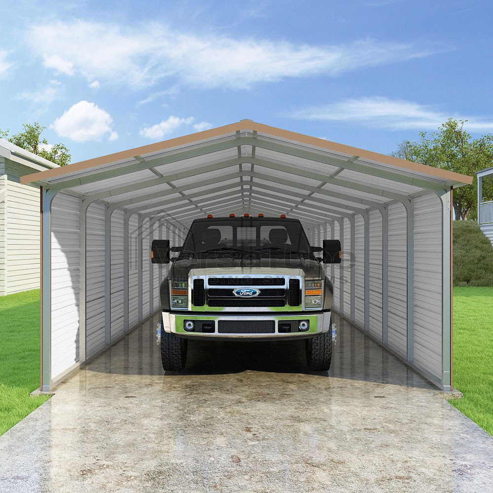 Pinnacle Series DIY carport kit features vertical sheet metal roof panels with ridge cap, gable and eave trim for an A-frame roof style and extended coverage on both ends.