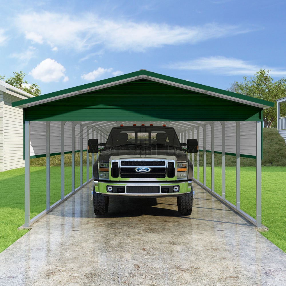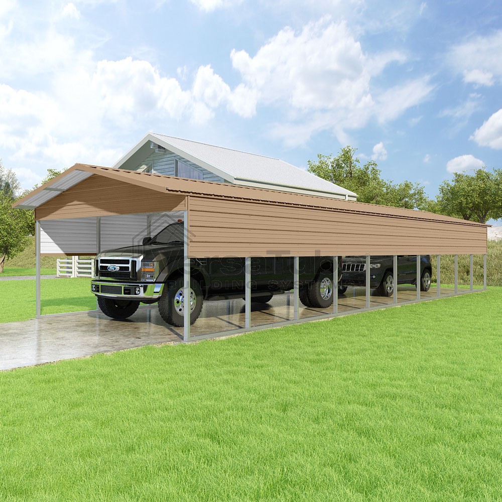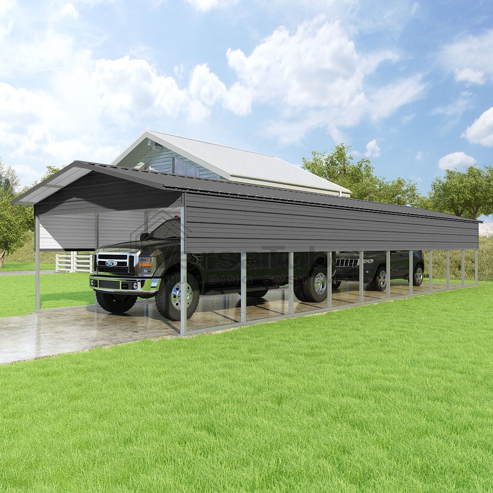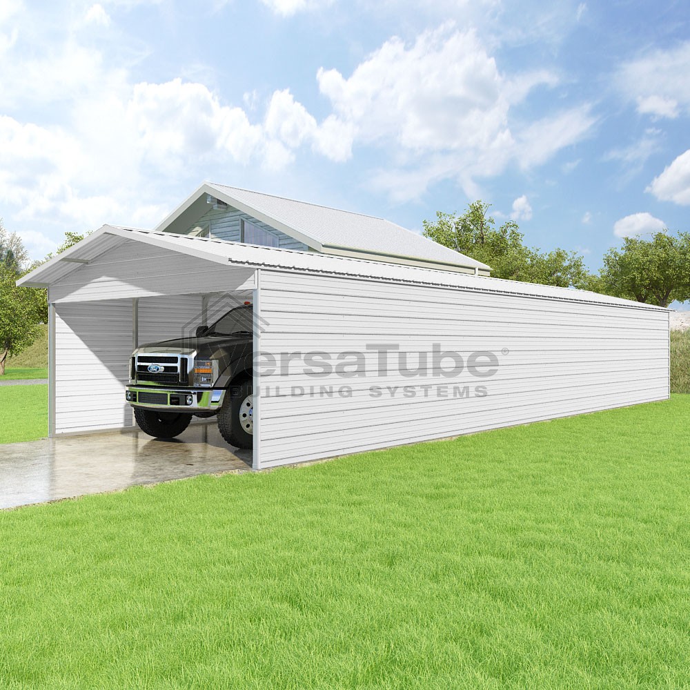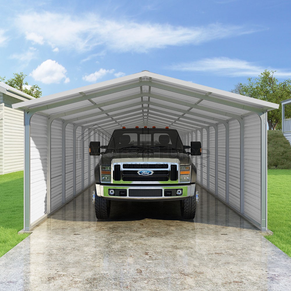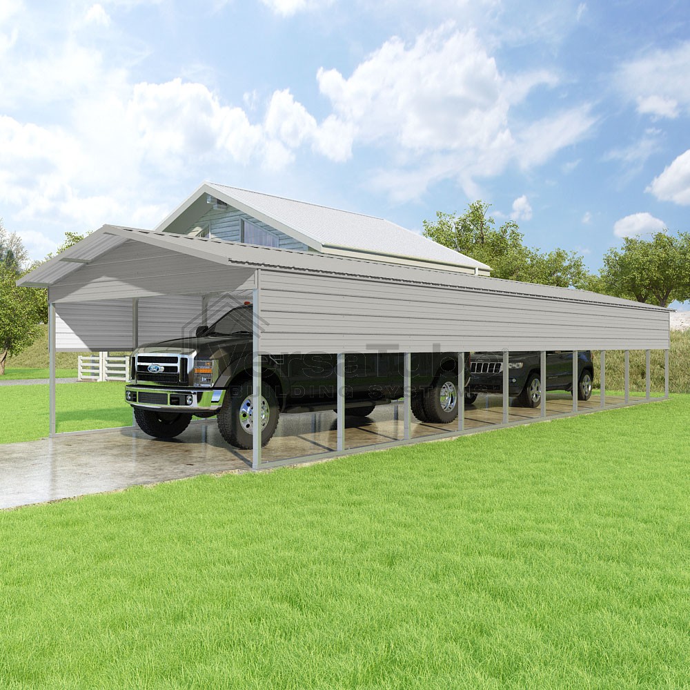 Pinnacle Series DIY carport kit features vertical sheet metal roof panels with ridge cap, gable and eave trim for an A-frame roof style and extended coverage on both ends.