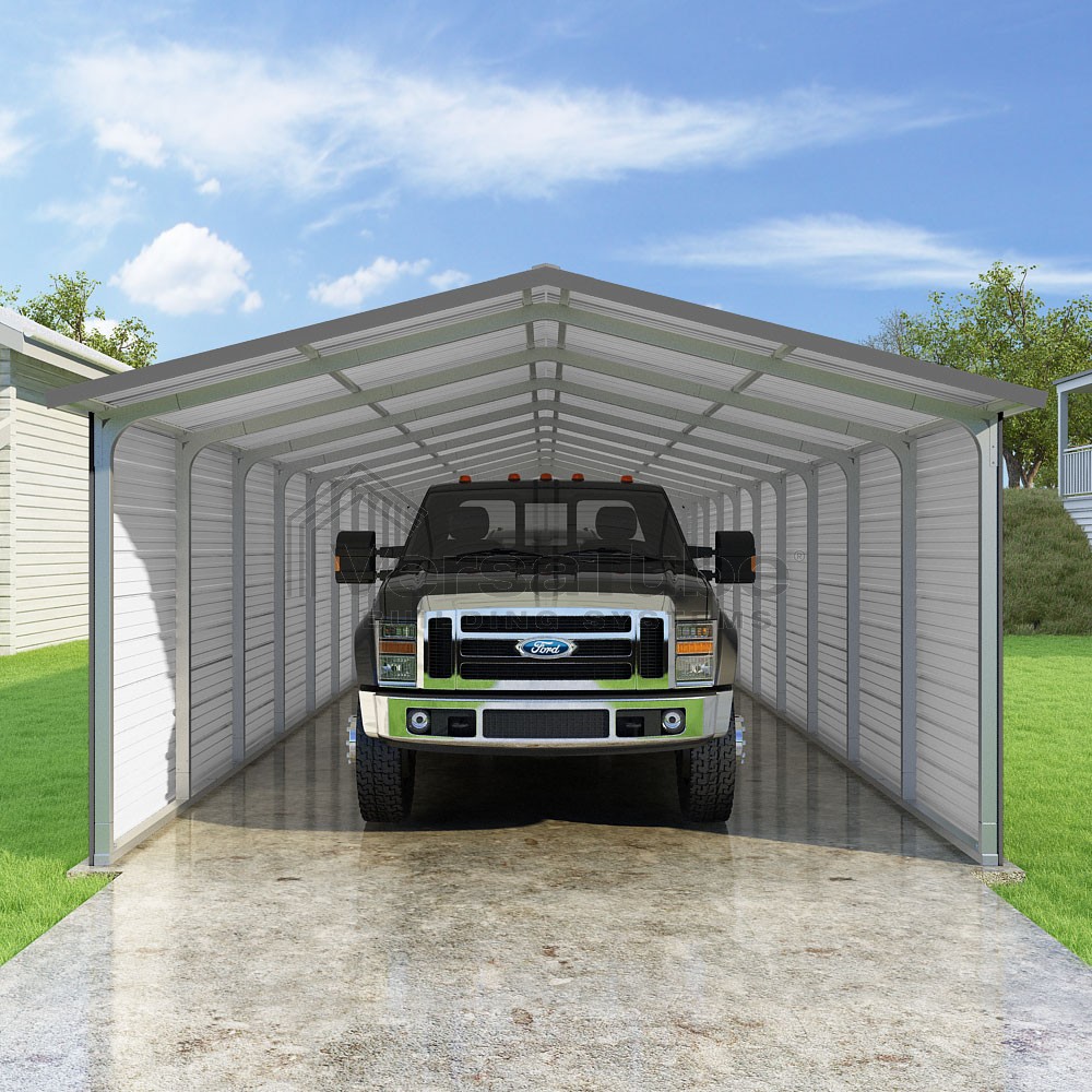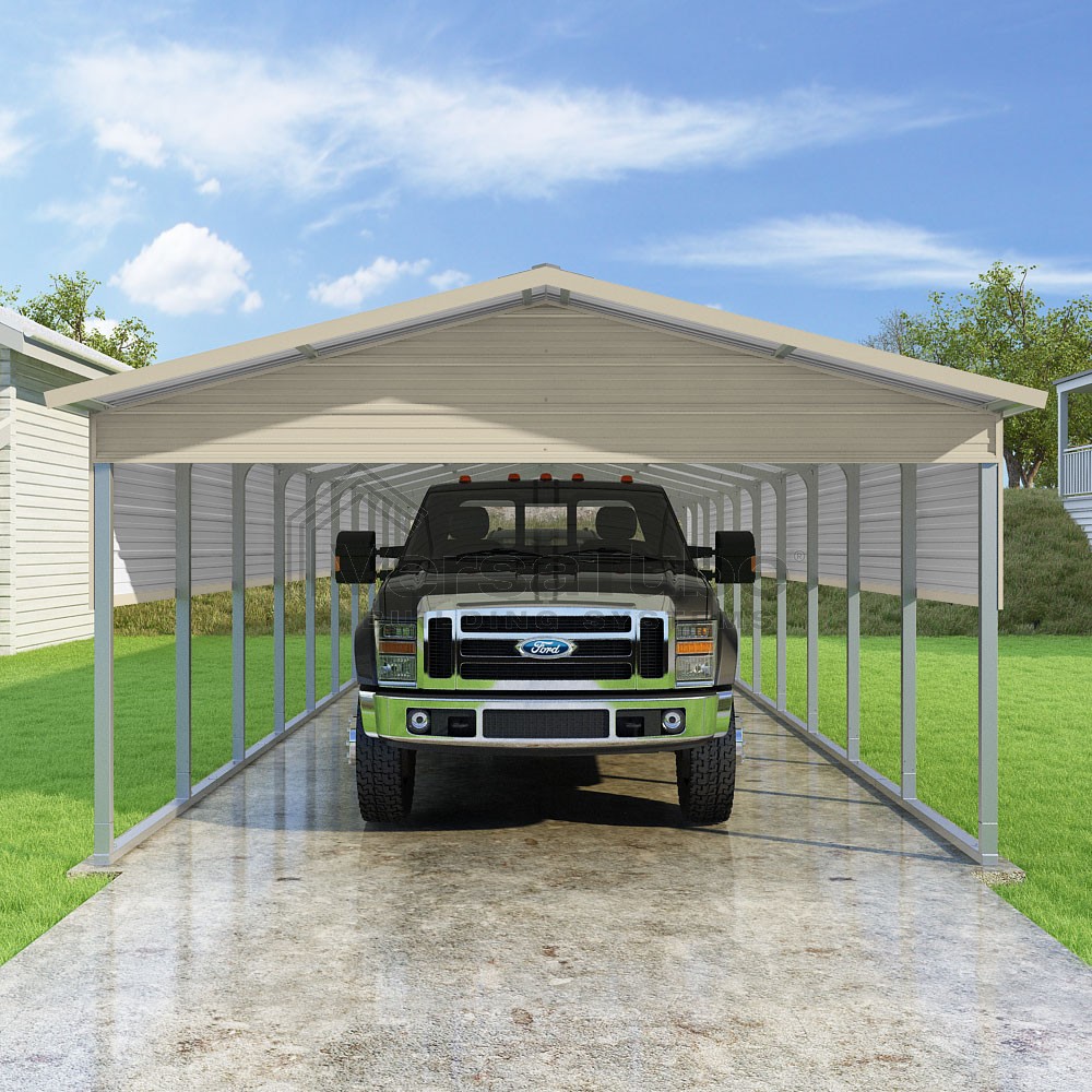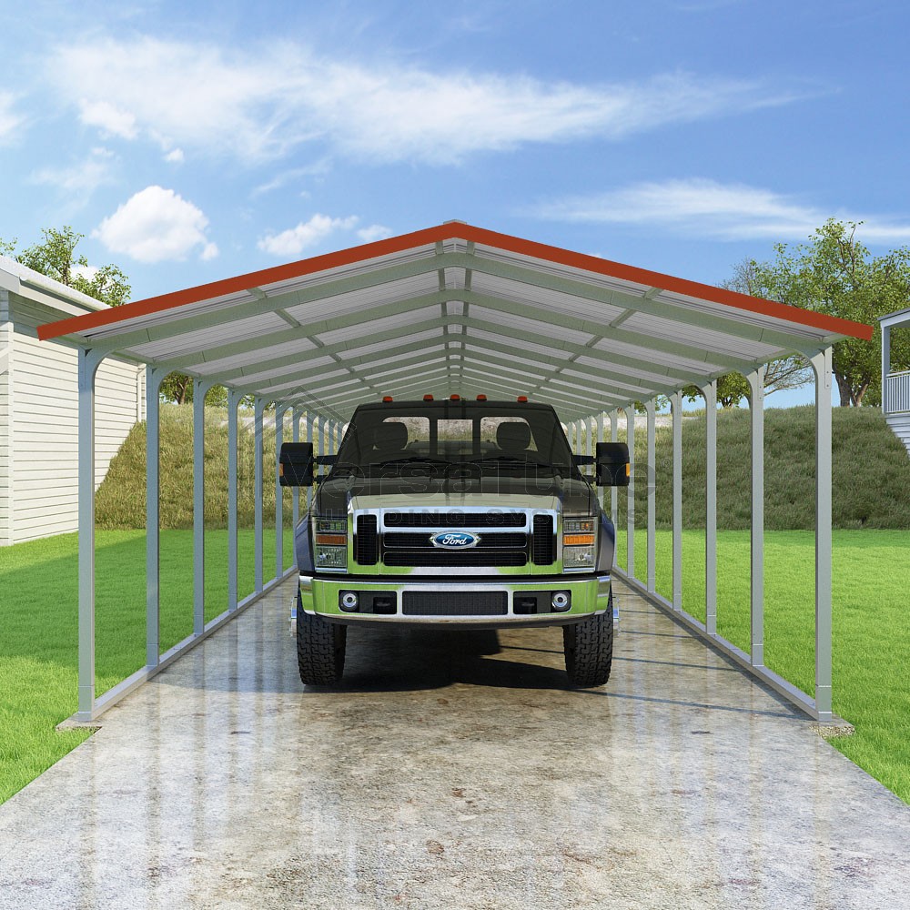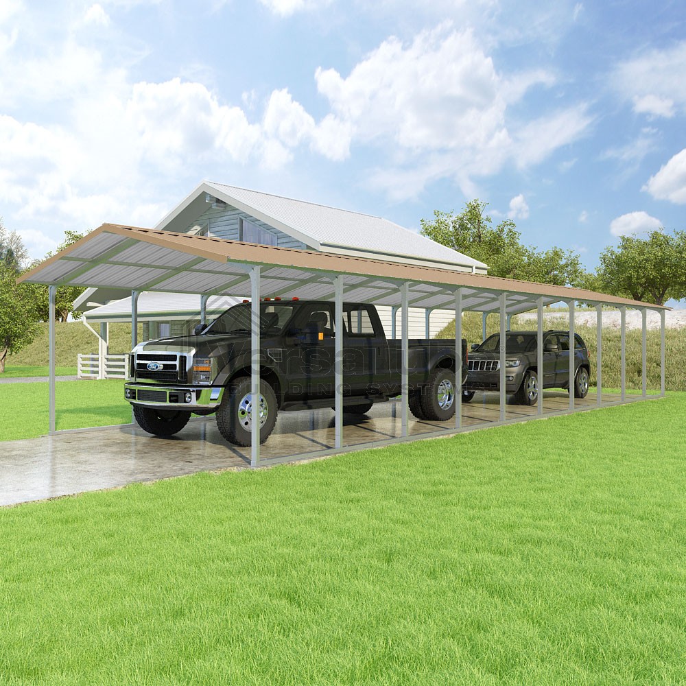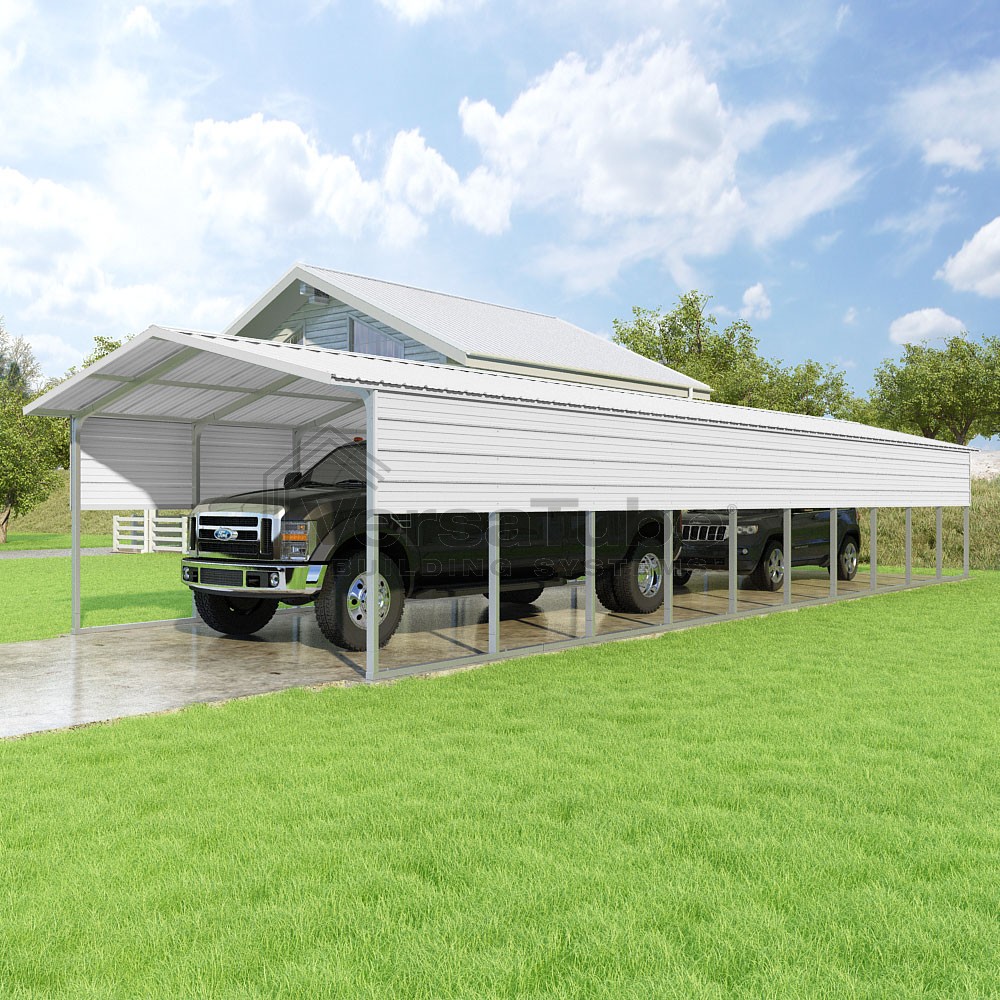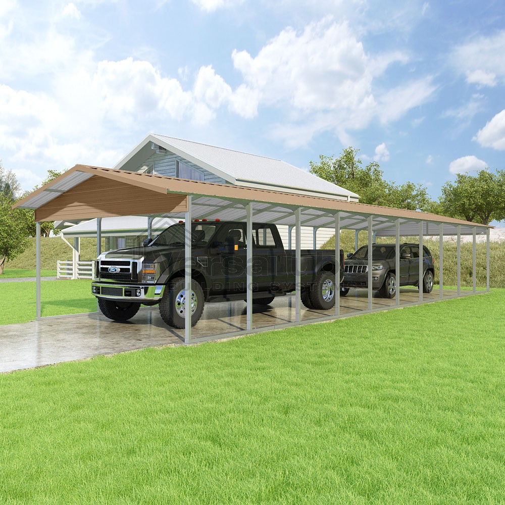 Pinnacle Series DIY carport kit features vertical sheet metal roof panels with ridge cap, gable and eave trim for an A-frame roof style and extended coverage on both ends.