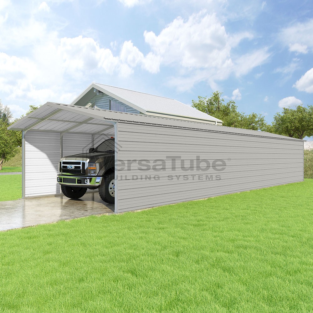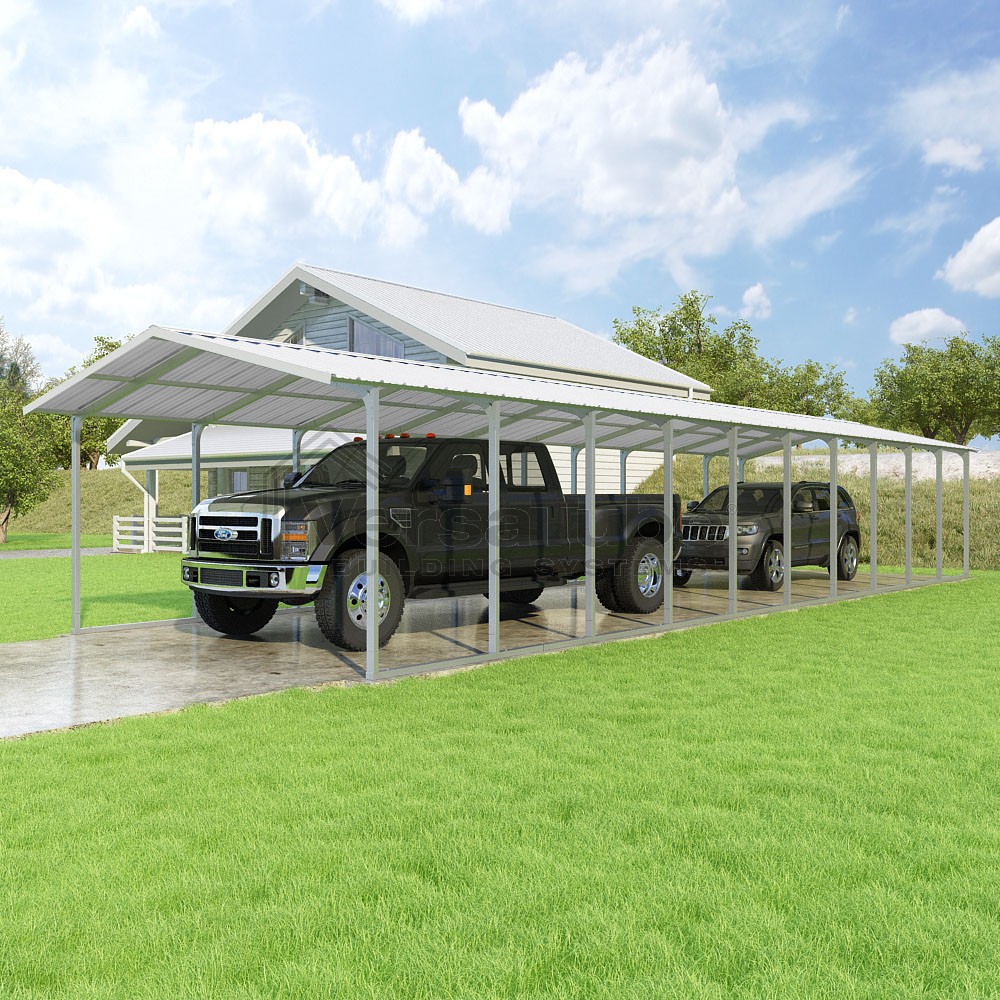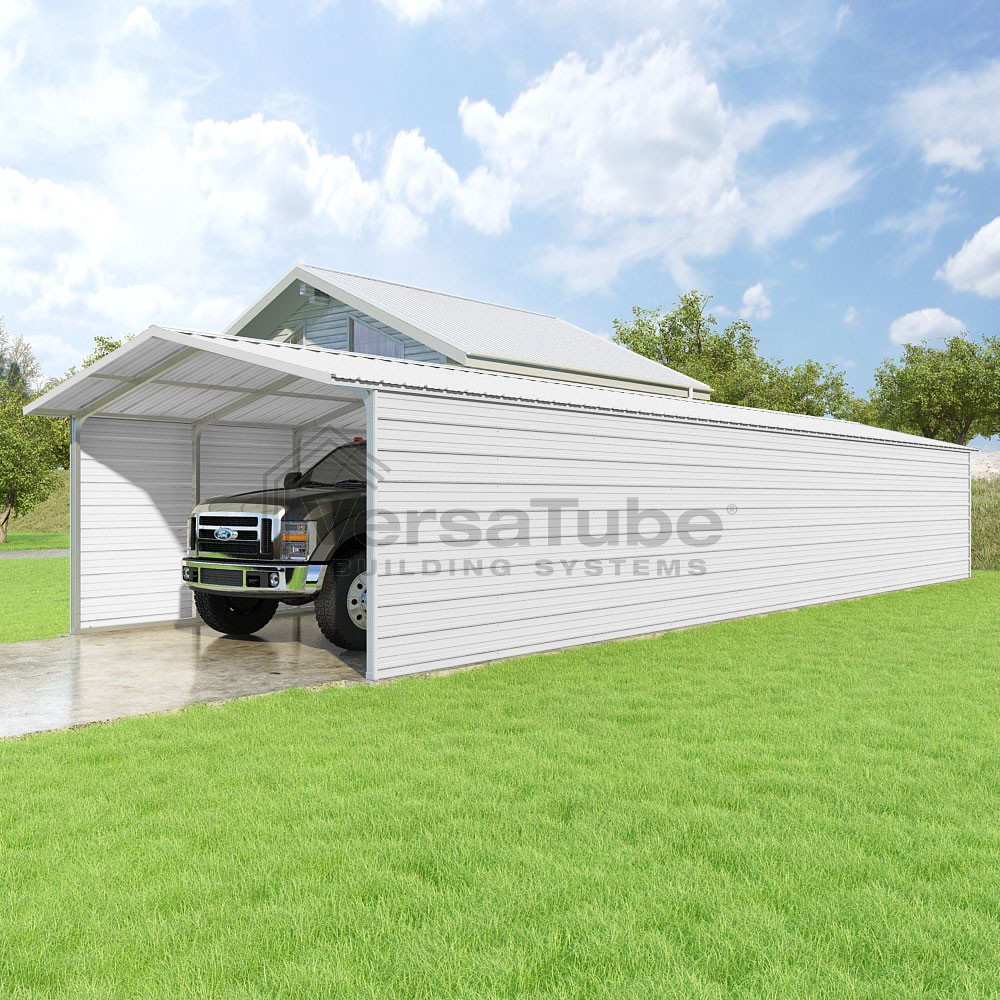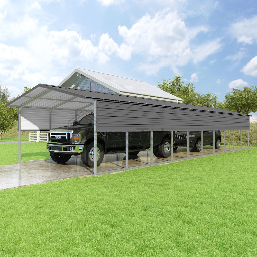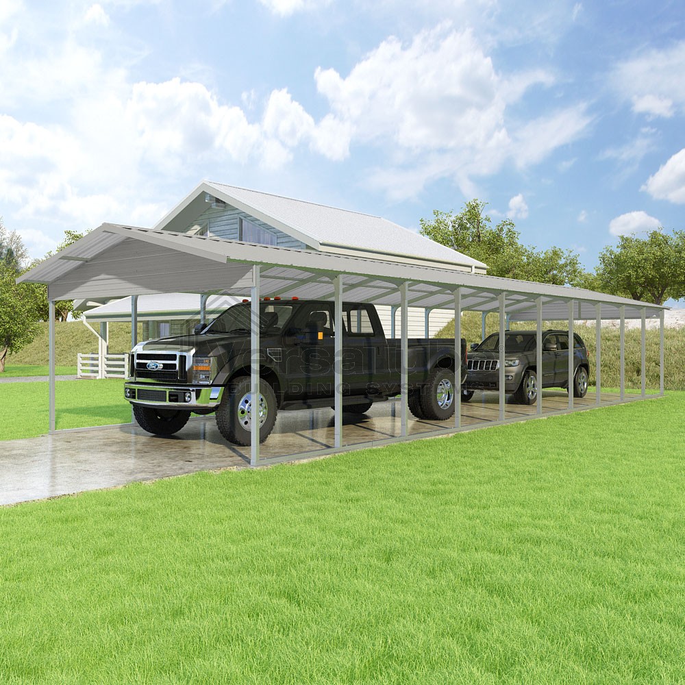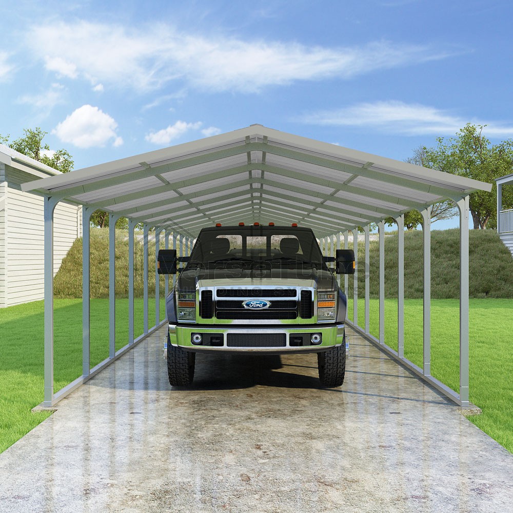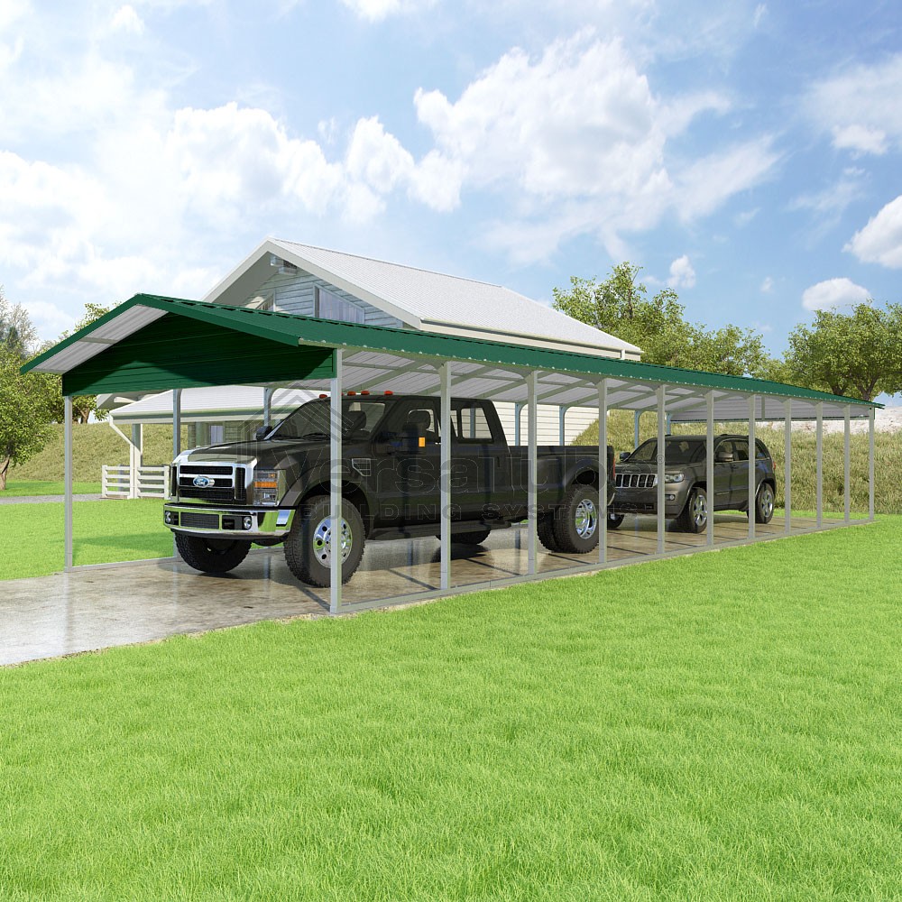 Pinnacle Series DIY carport kit features vertical sheet metal roof panels with ridge cap, gable and eave trim for an A-frame roof style and extended coverage on both ends.