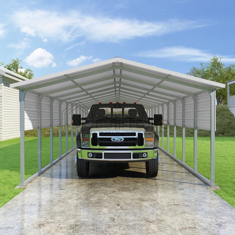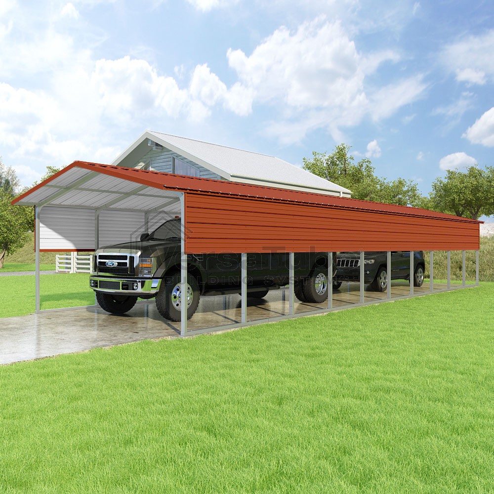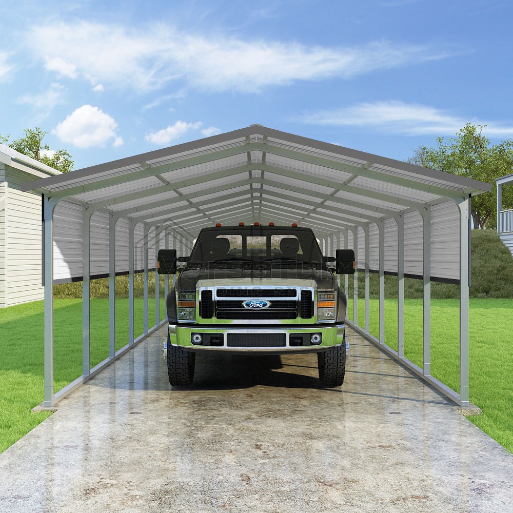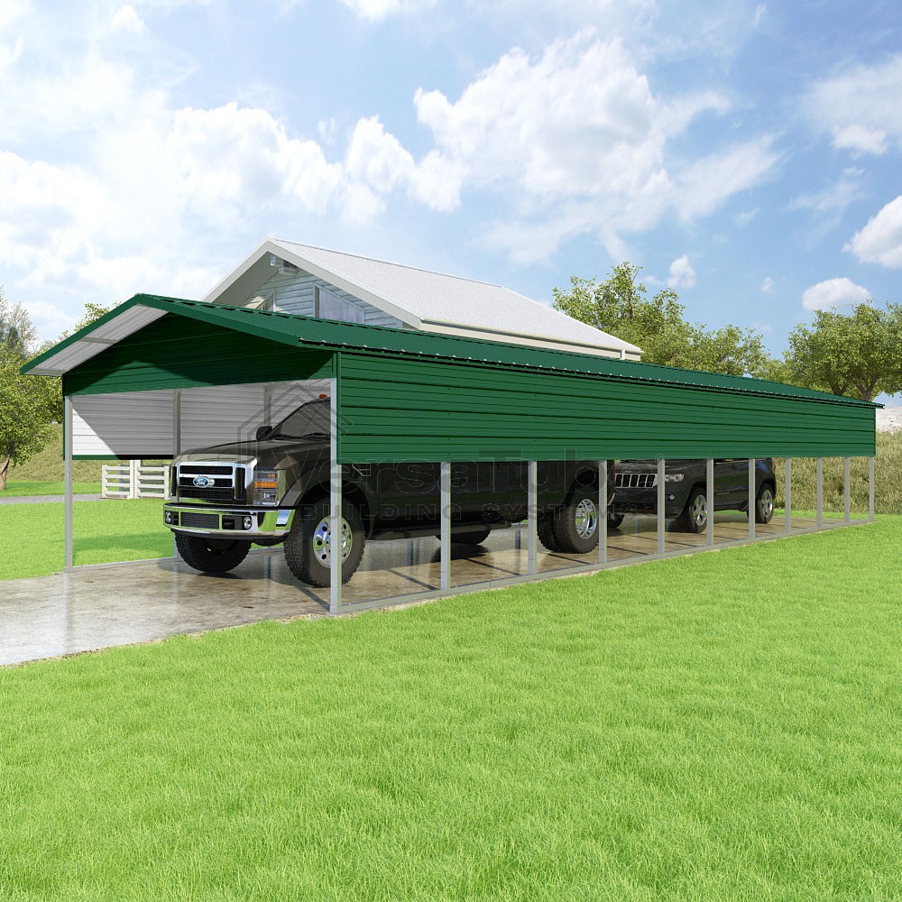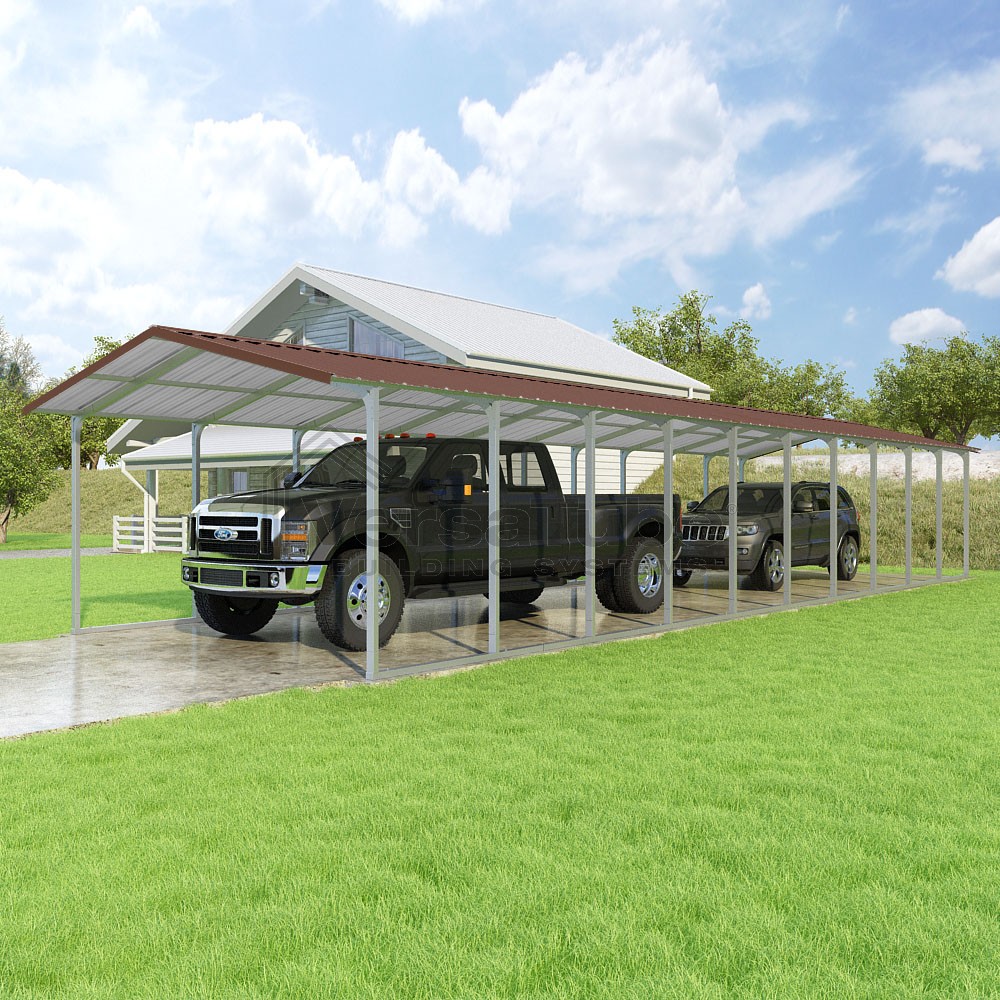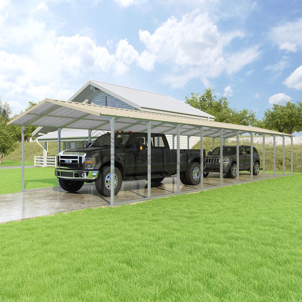 Pinnacle Series DIY carport kit features vertical sheet metal roof panels with ridge cap, gable and eave trim for an A-frame roof style and extended coverage on both ends.