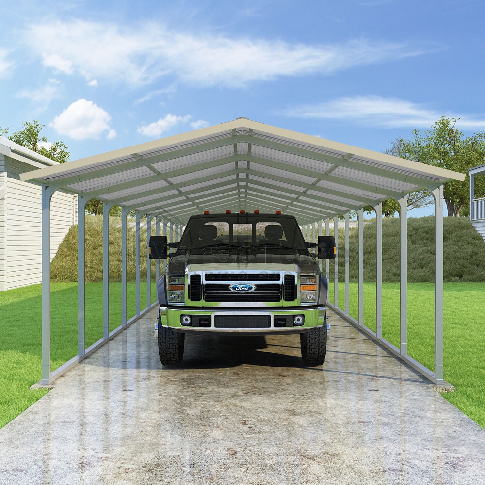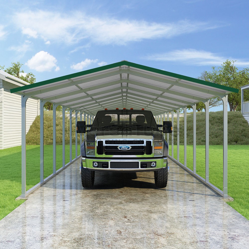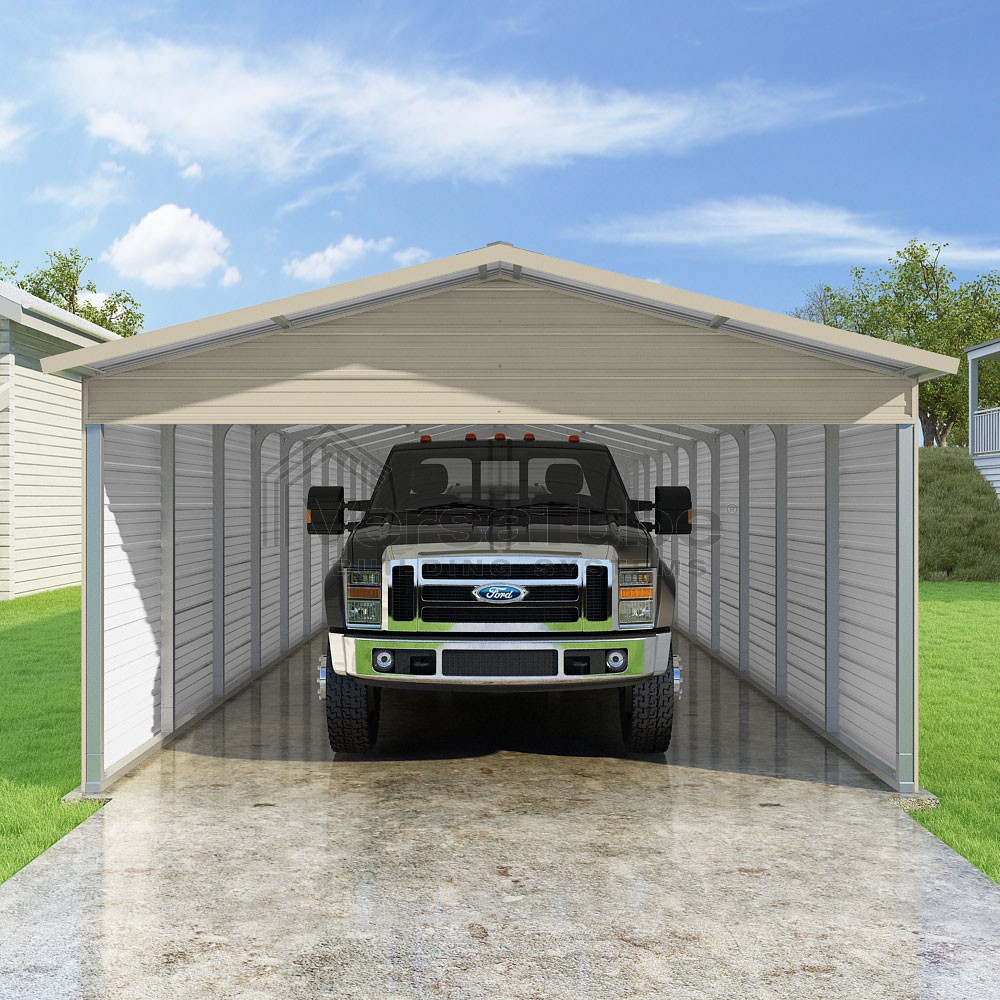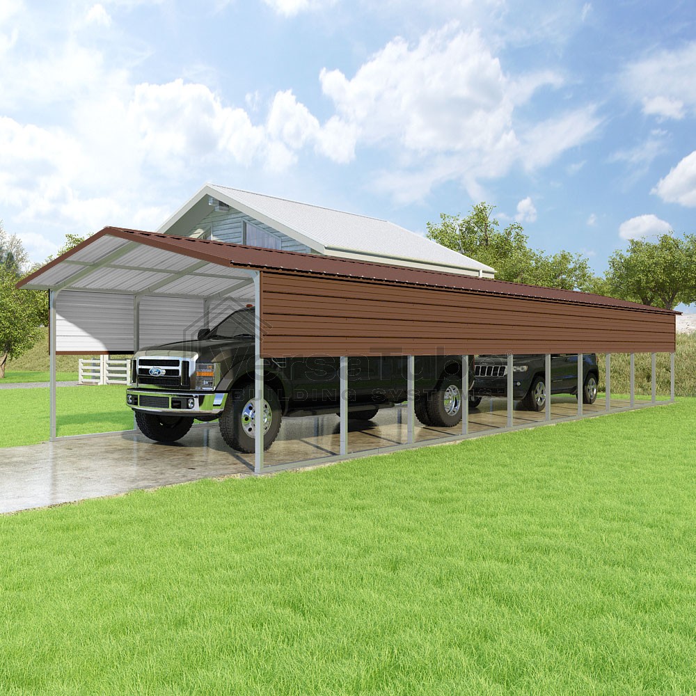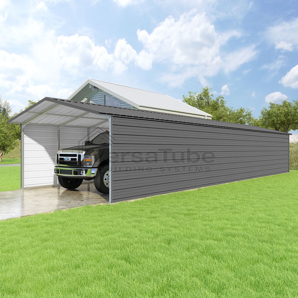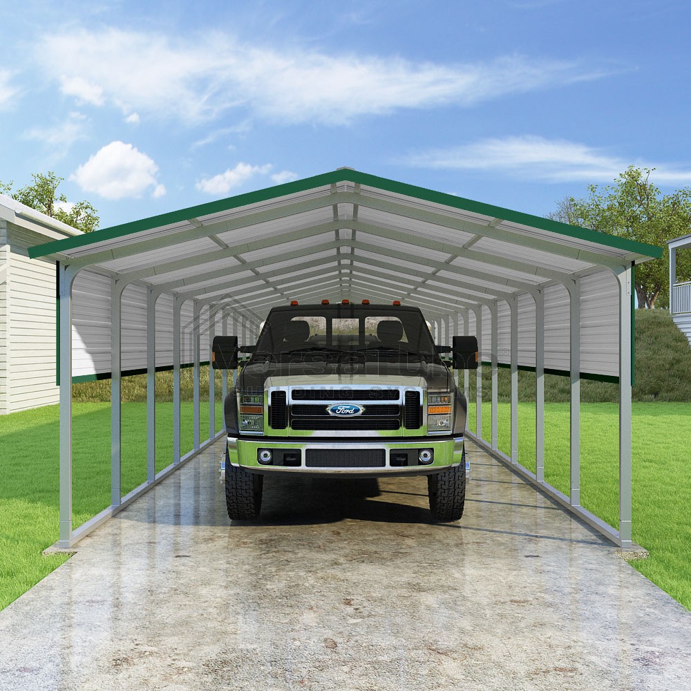 Pinnacle Series DIY carport kit features vertical sheet metal roof panels with ridge cap, gable and eave trim for an A-frame roof style and extended coverage on both ends.
