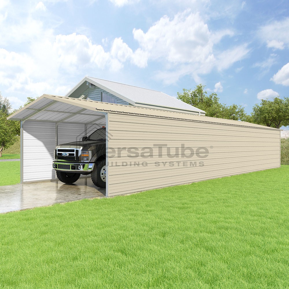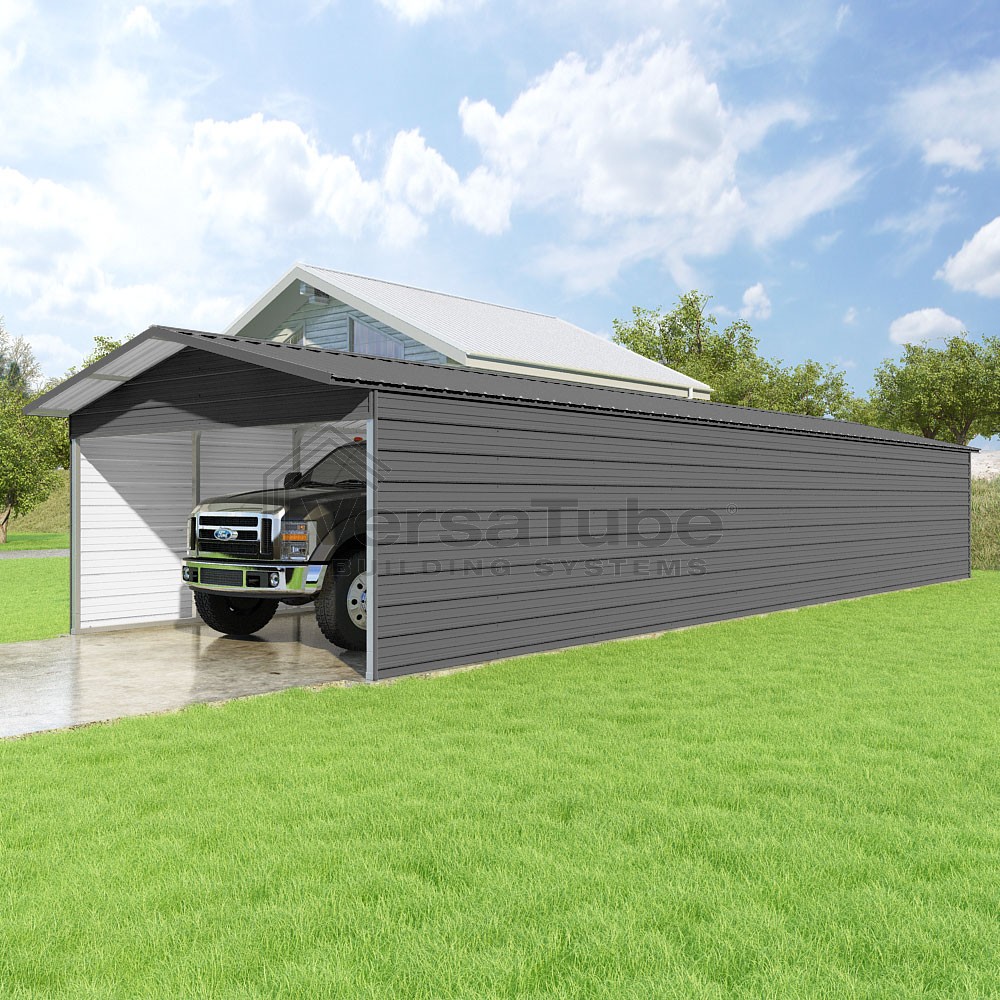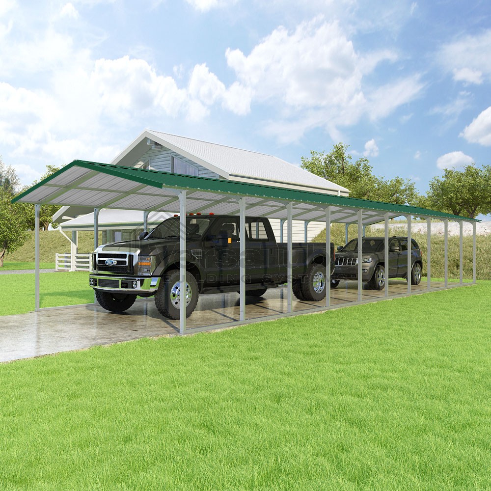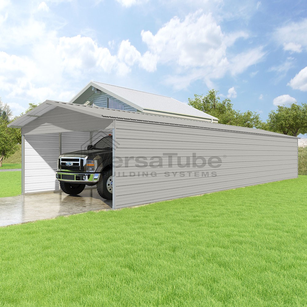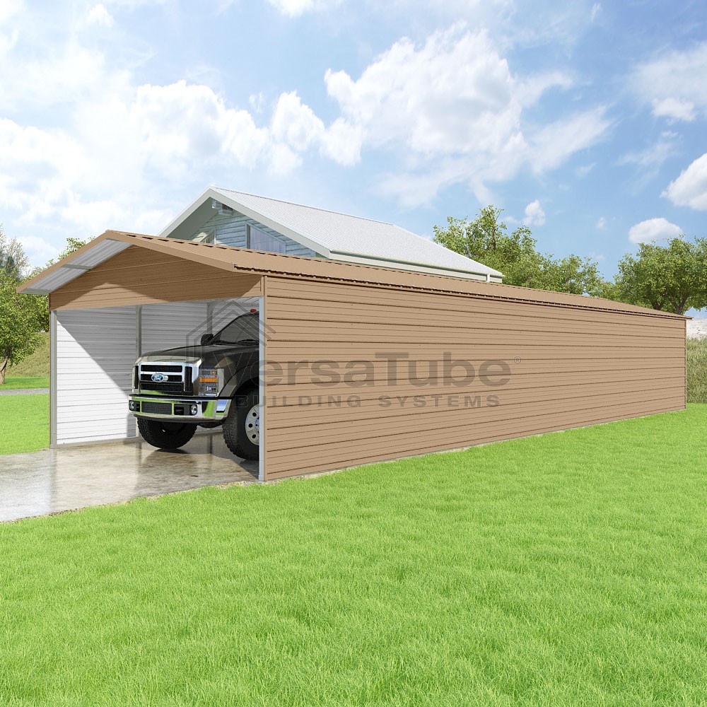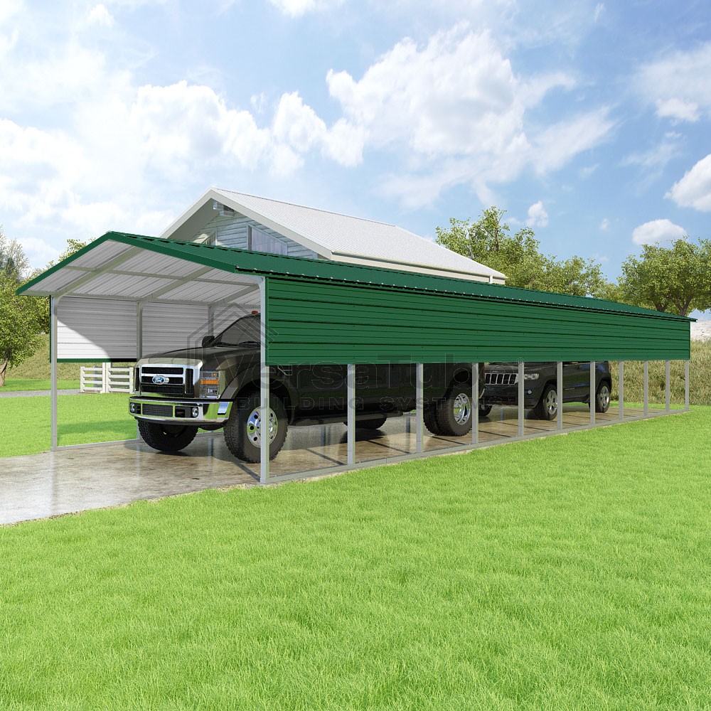 Pinnacle Series DIY carport kit features vertical sheet metal roof panels with ridge cap, gable and eave trim for an A-frame roof style and extended coverage on both ends.
