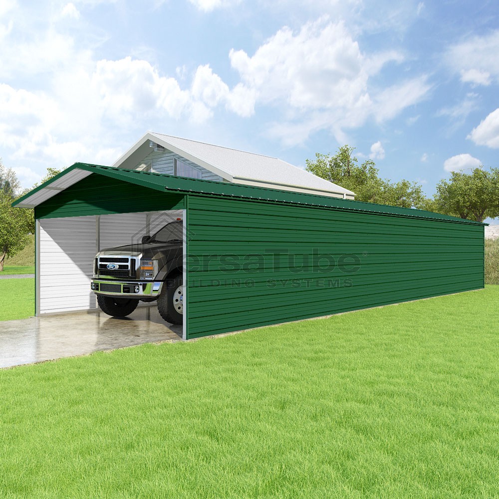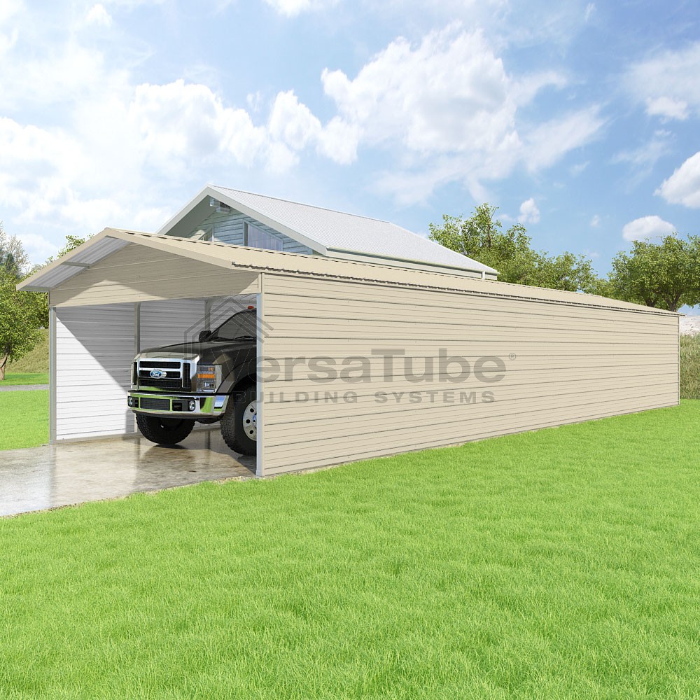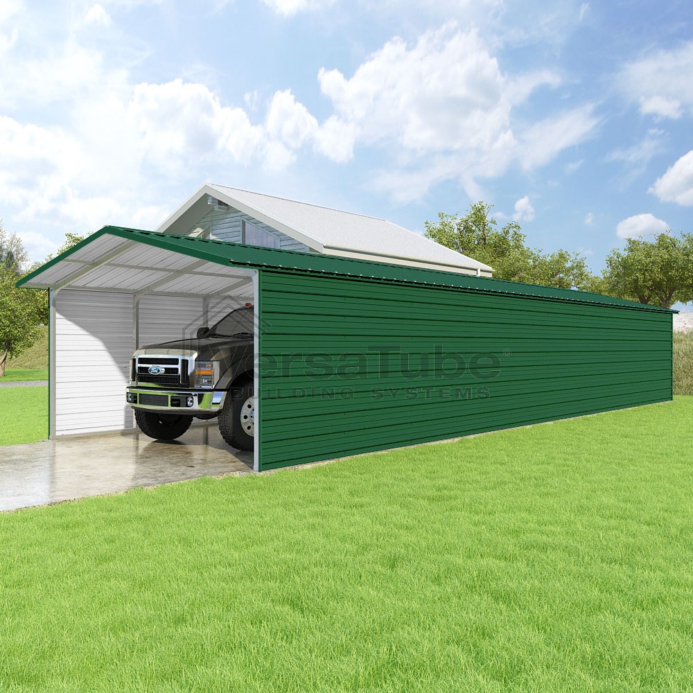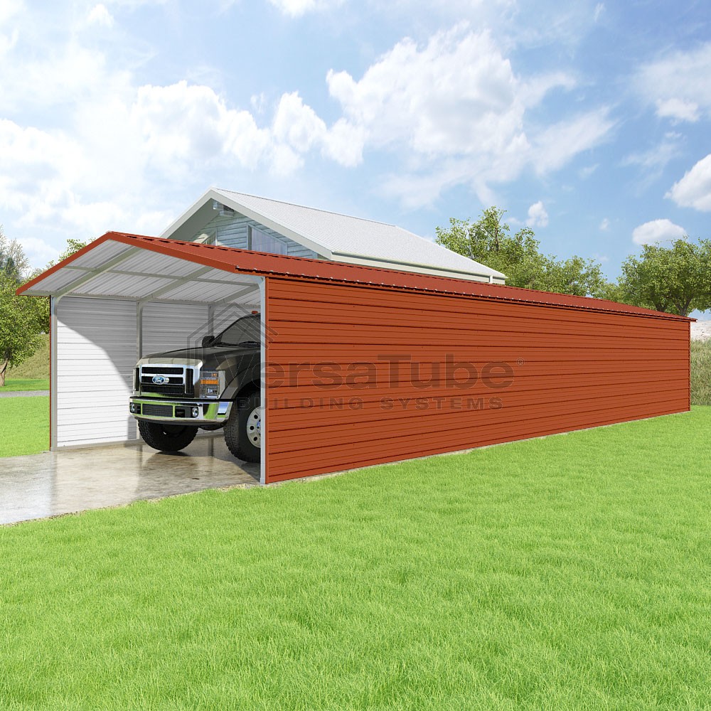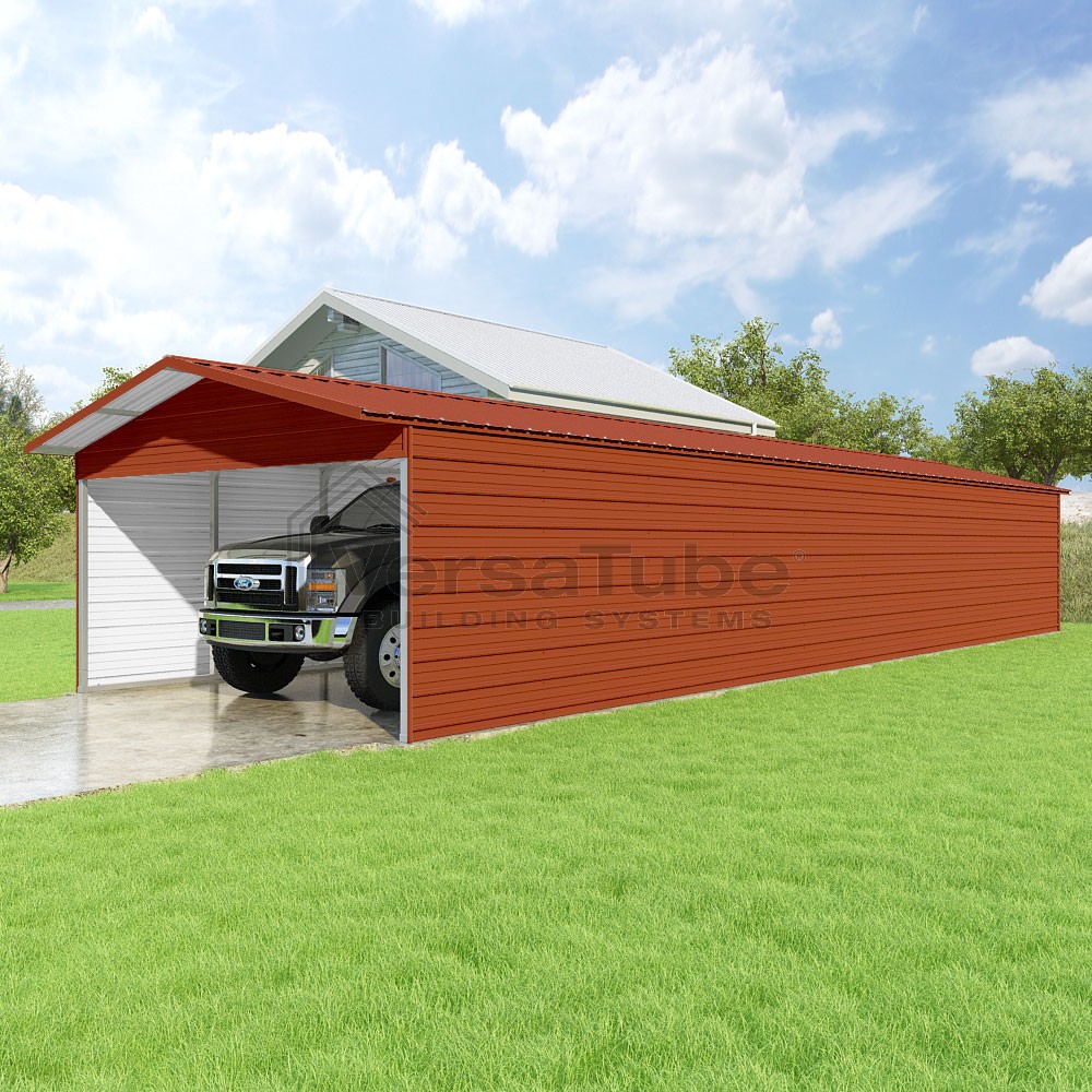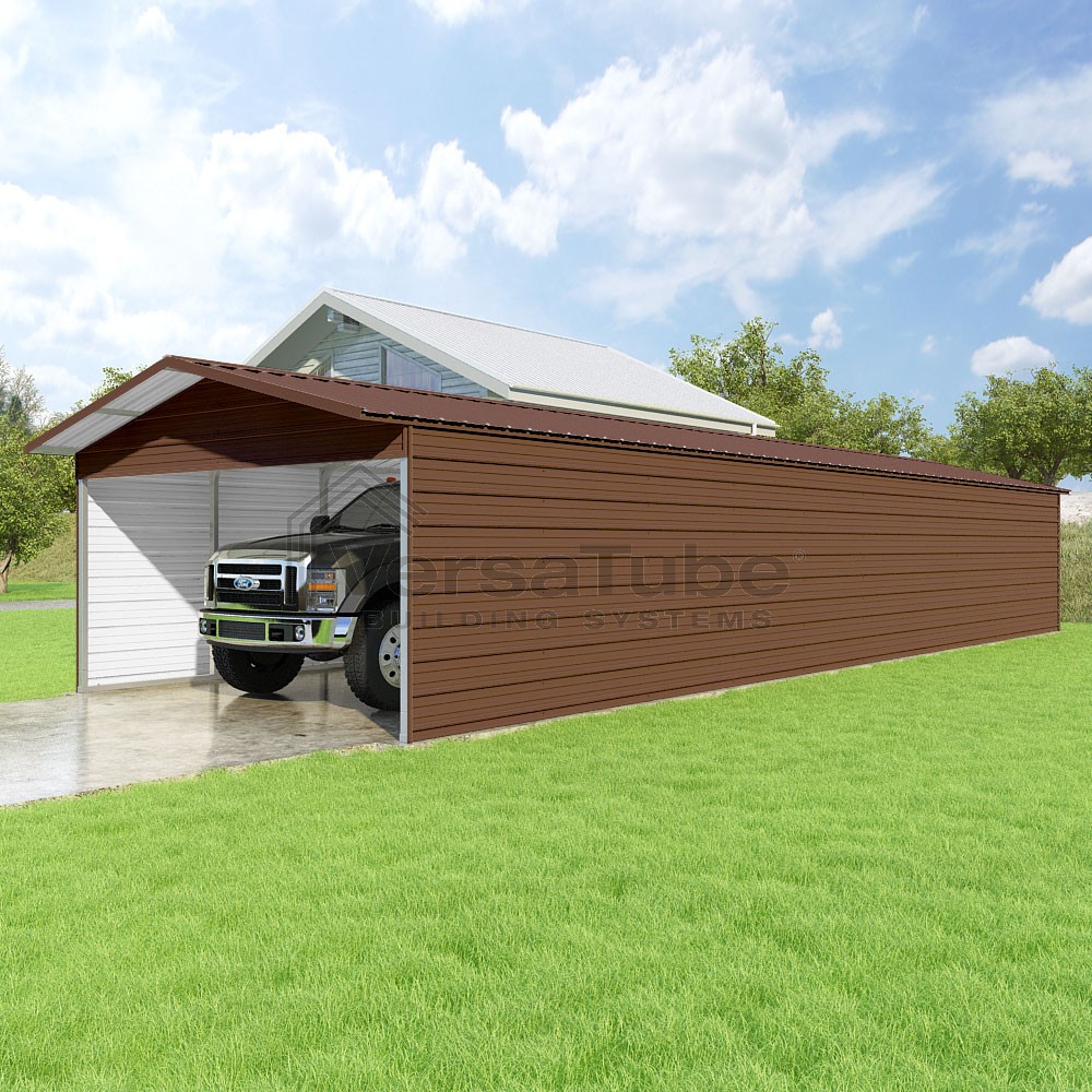 Pinnacle Series DIY carport kit features vertical sheet metal roof panels with ridge cap, gable and eave trim for an A-frame roof style and extended coverage on both ends.