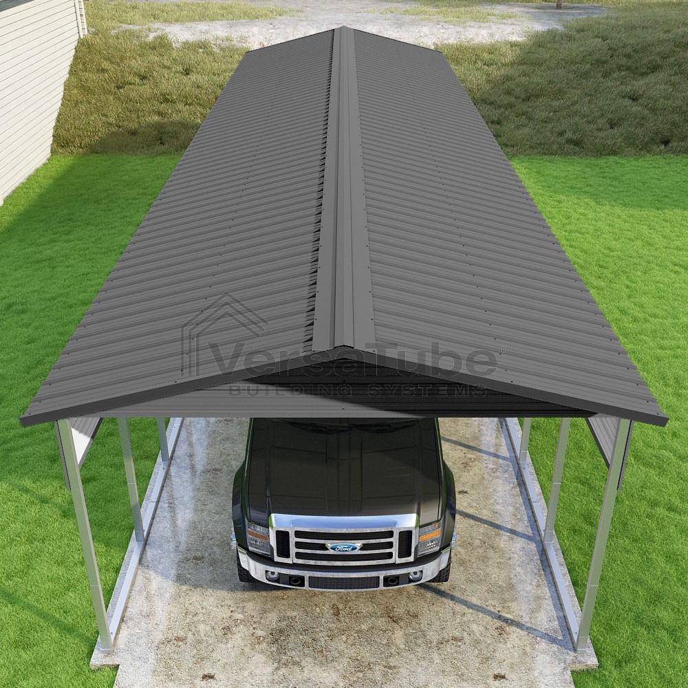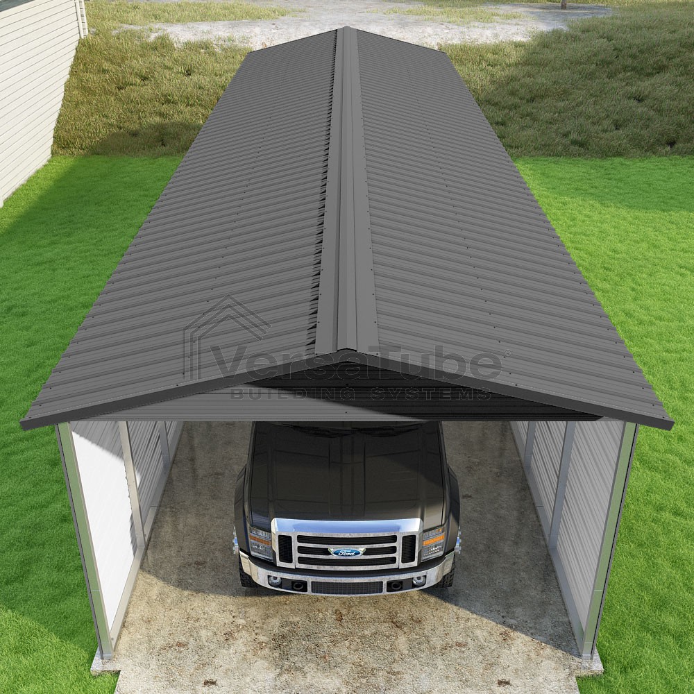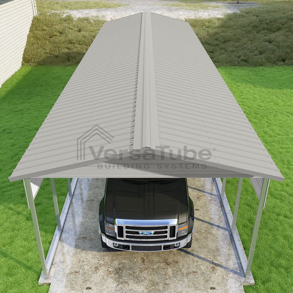 Pinnacle Series DIY carport kit features vertical sheet metal roof panels with ridge cap, gable and eave trim for an A-frame roof style and extended coverage on both ends.