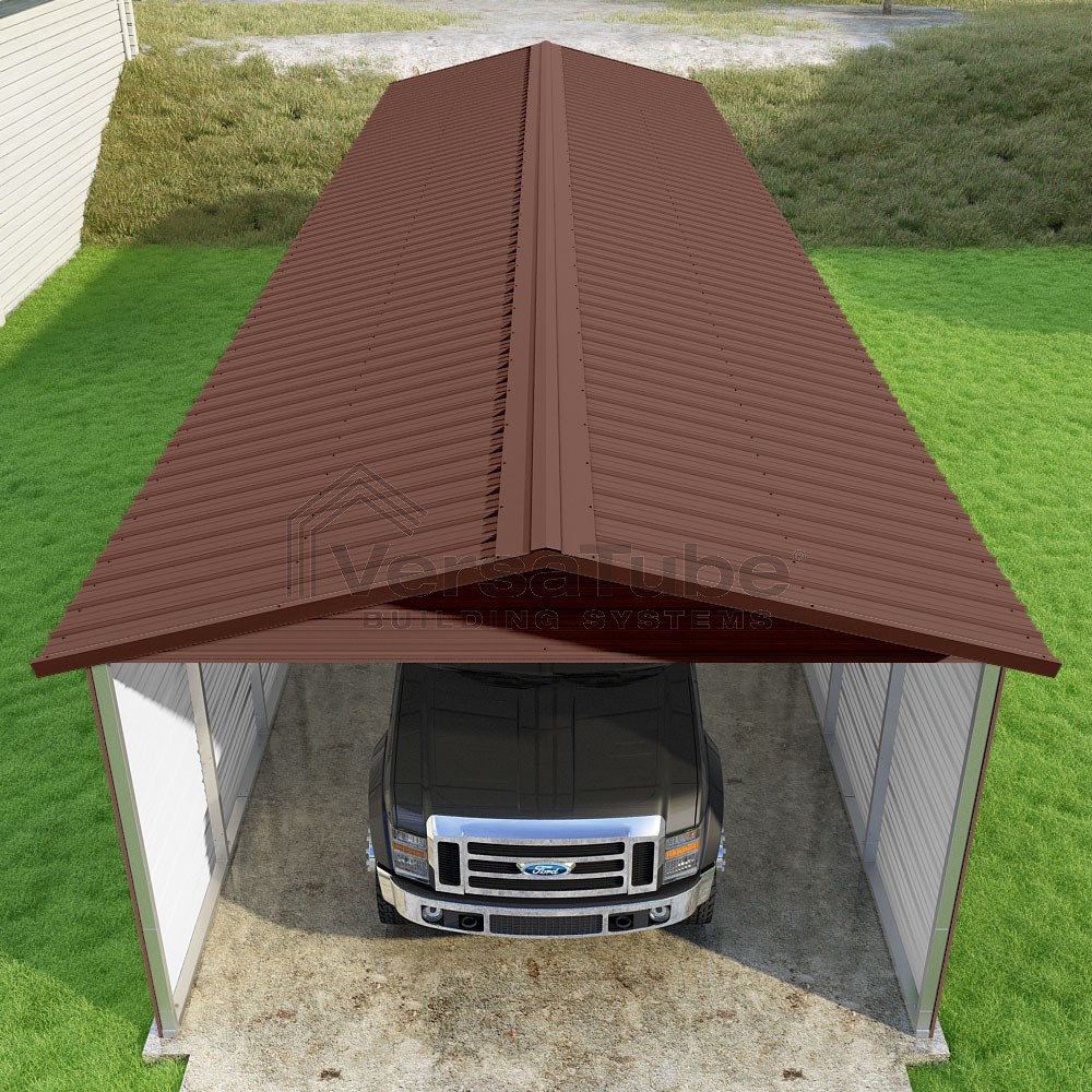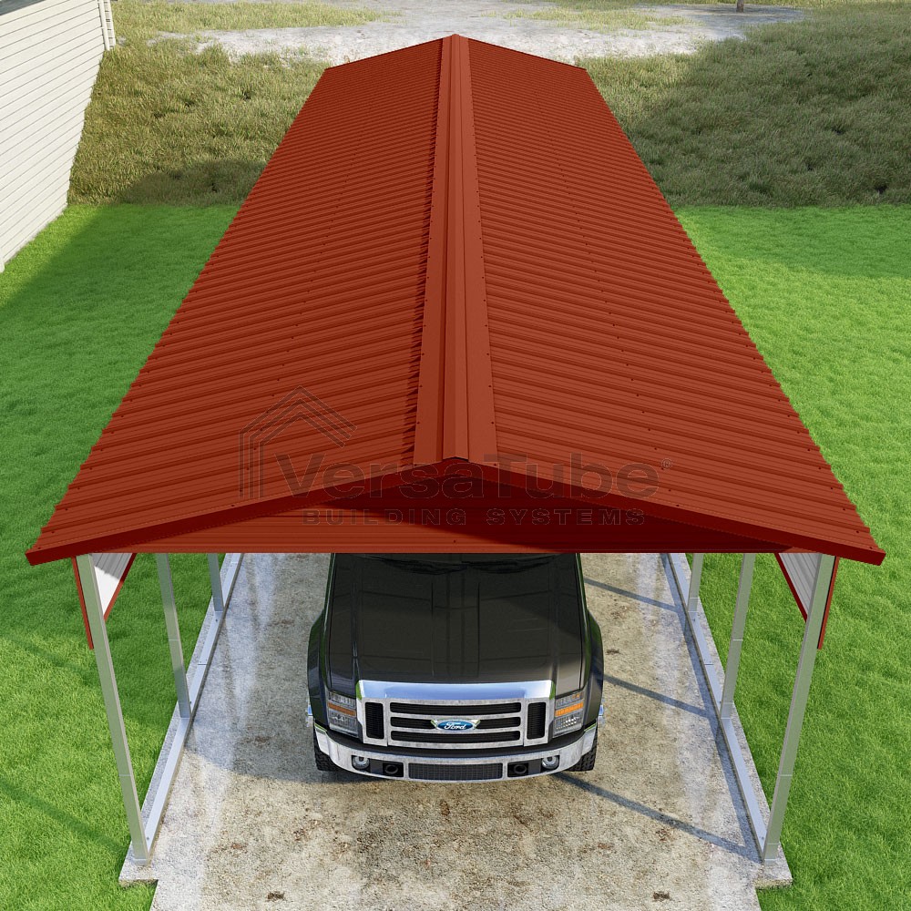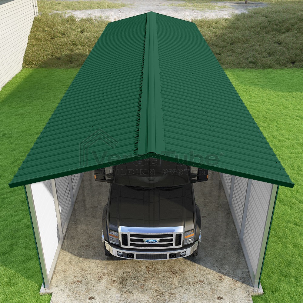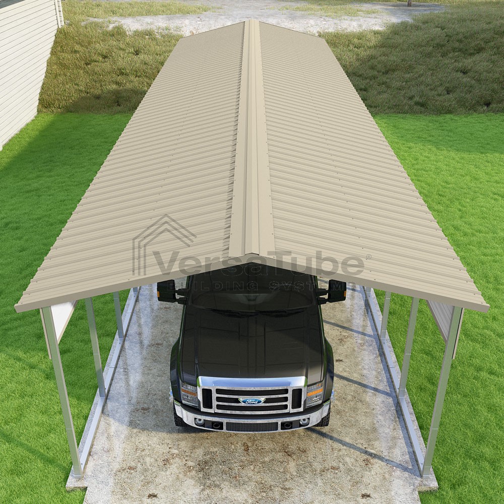 Pinnacle Series DIY carport kit features vertical sheet metal roof panels with ridge cap, gable and eave trim for an A-frame roof style and extended coverage on both ends.