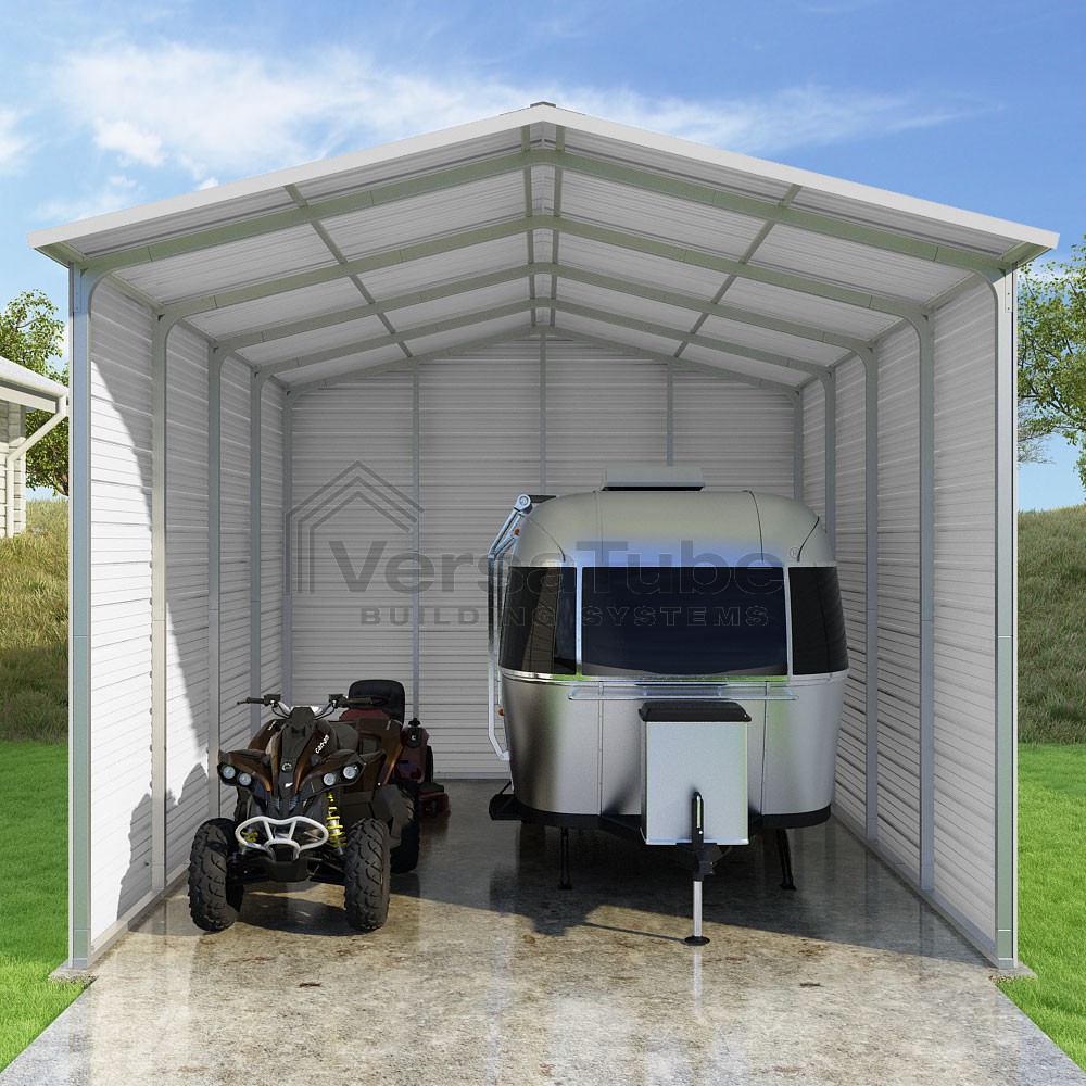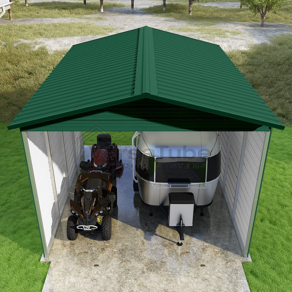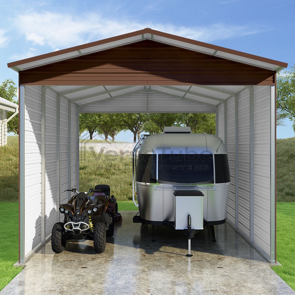 Pinnacle Series DIY carport kit features vertical sheet metal roof panels with ridge cap, gable and eave trim for an A-frame roof style and extended coverage on both ends.