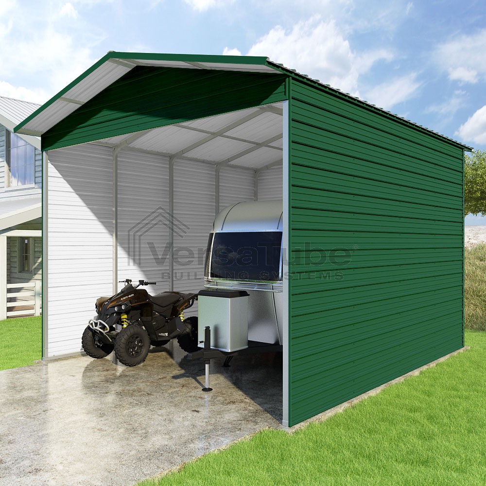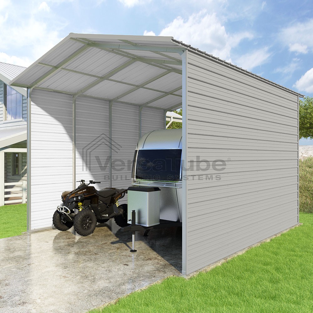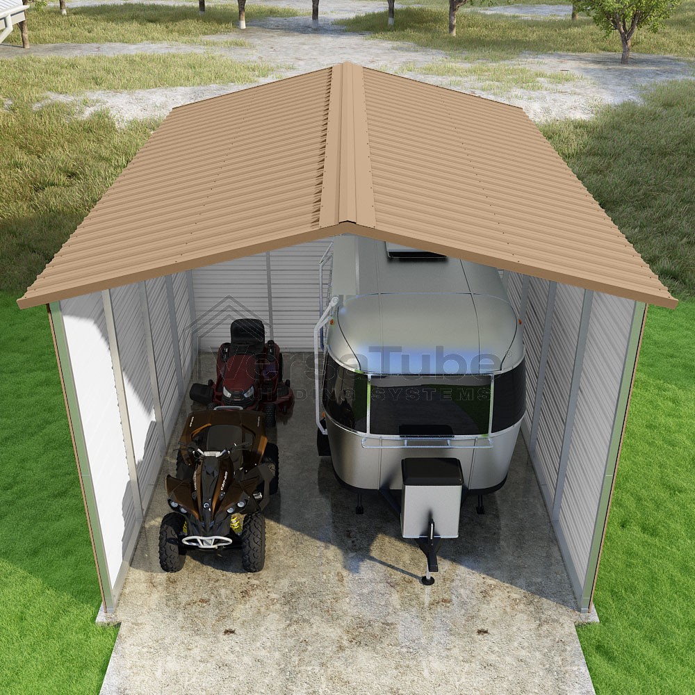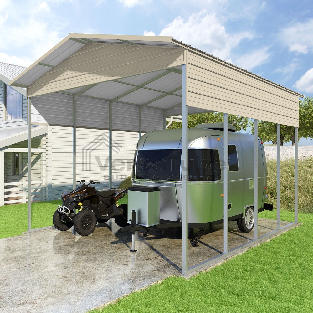 Pinnacle Series DIY carport kit features vertical sheet metal roof panels with ridge cap, gable and eave trim for an A-frame roof style and extended coverage on both ends.