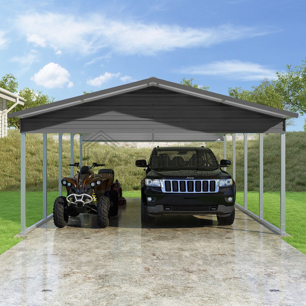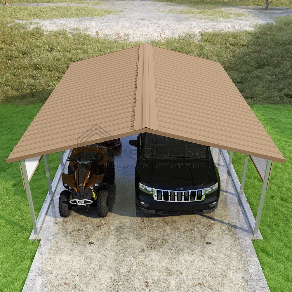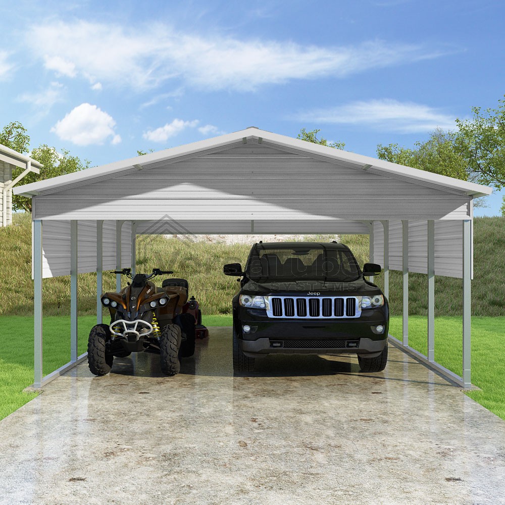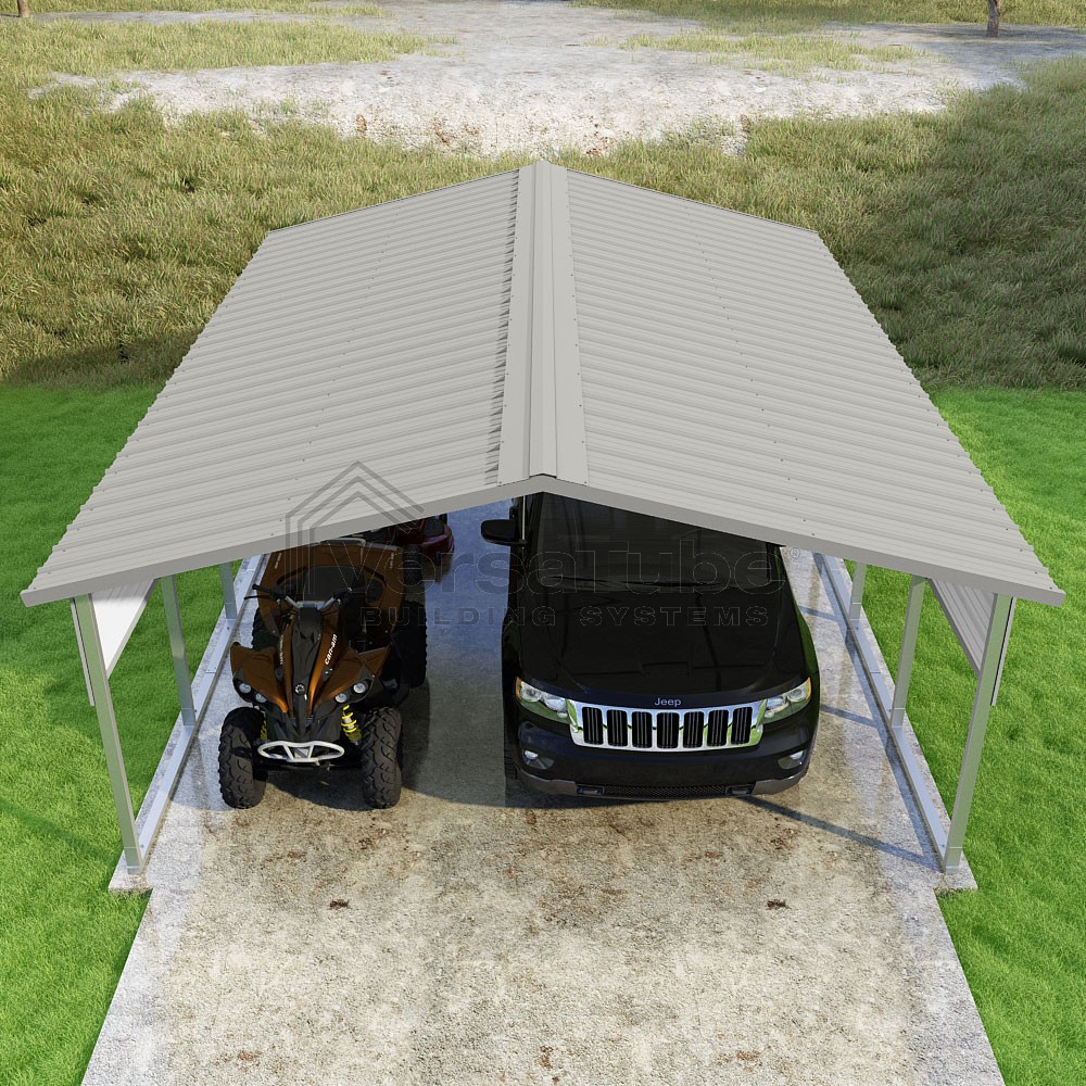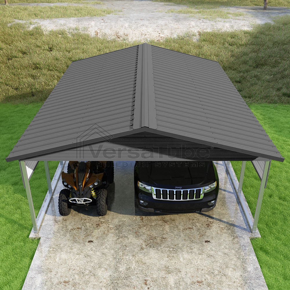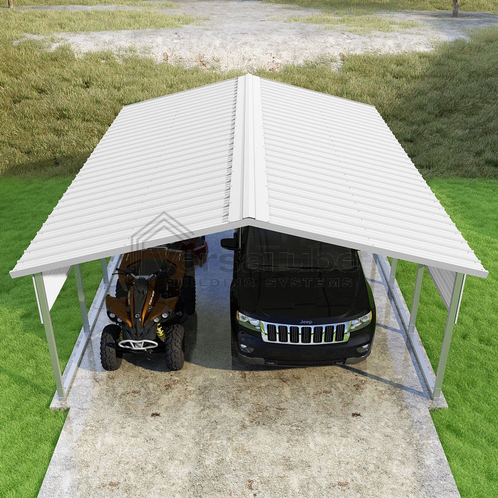 Pinnacle Series DIY carport kit features vertical sheet metal roof panels with ridge cap, gable and eave trim for an A-frame roof style and extended coverage on both ends.