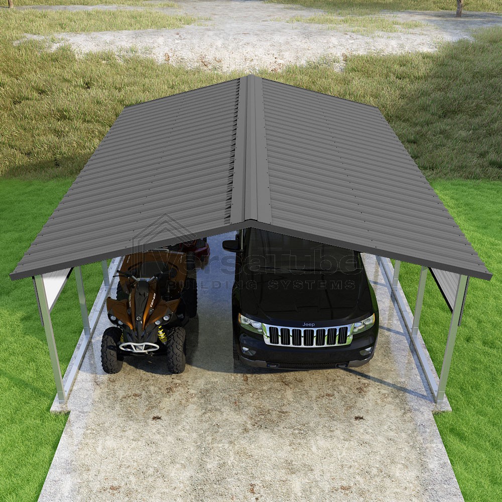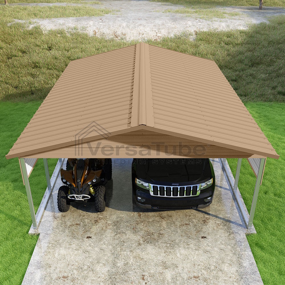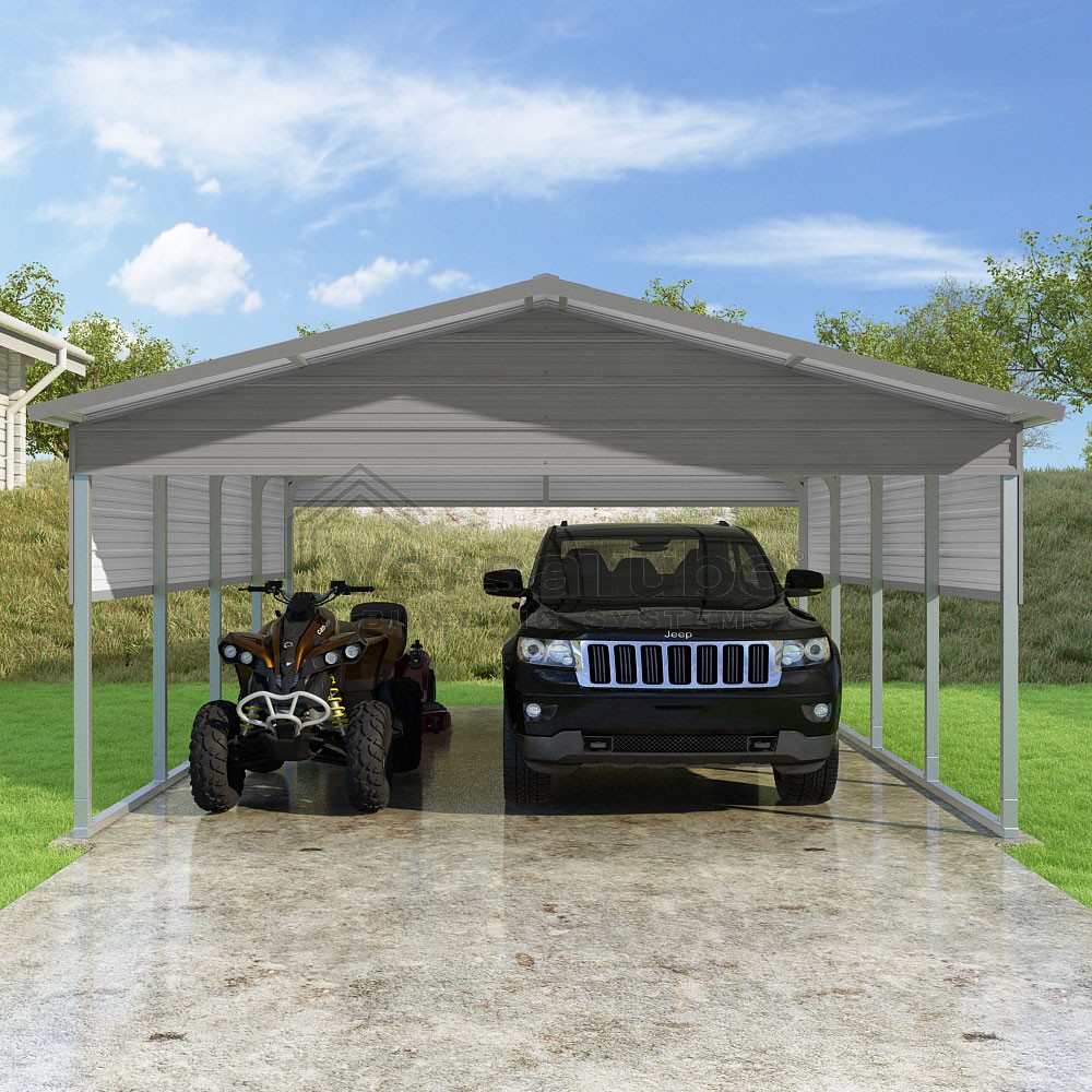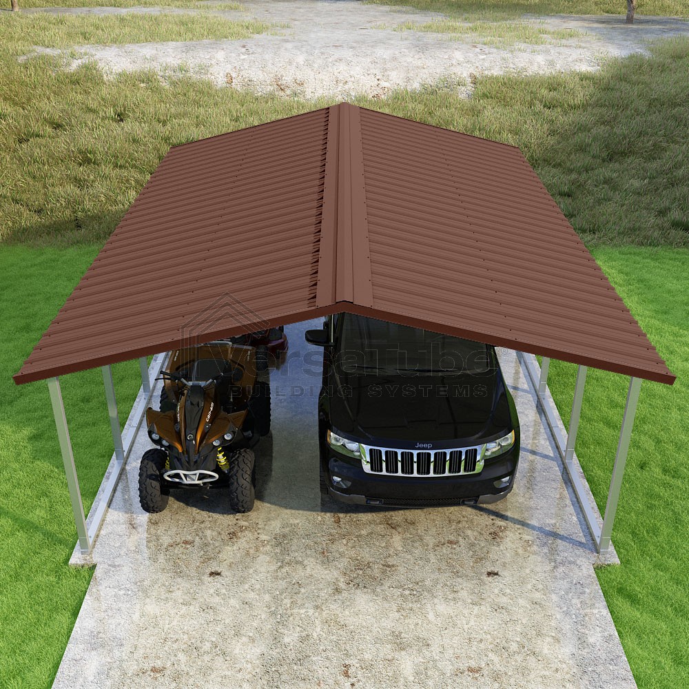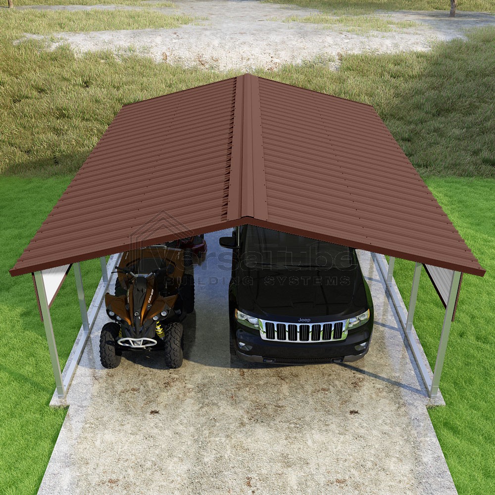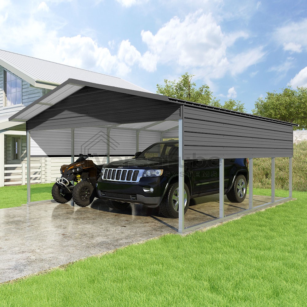 Pinnacle Series DIY carport kit features vertical sheet metal roof panels with ridge cap, gable and eave trim for an A-frame roof style and extended coverage on both ends.