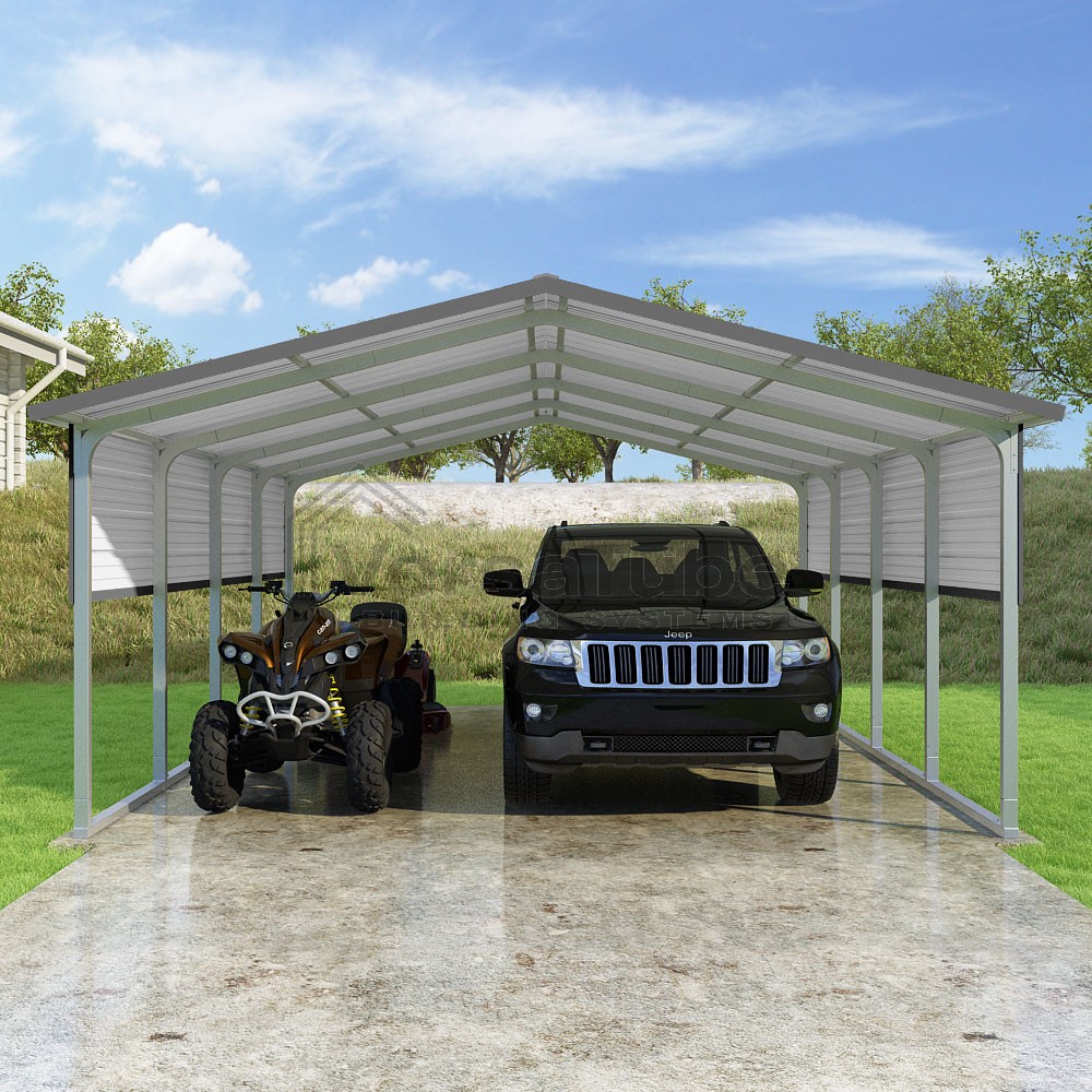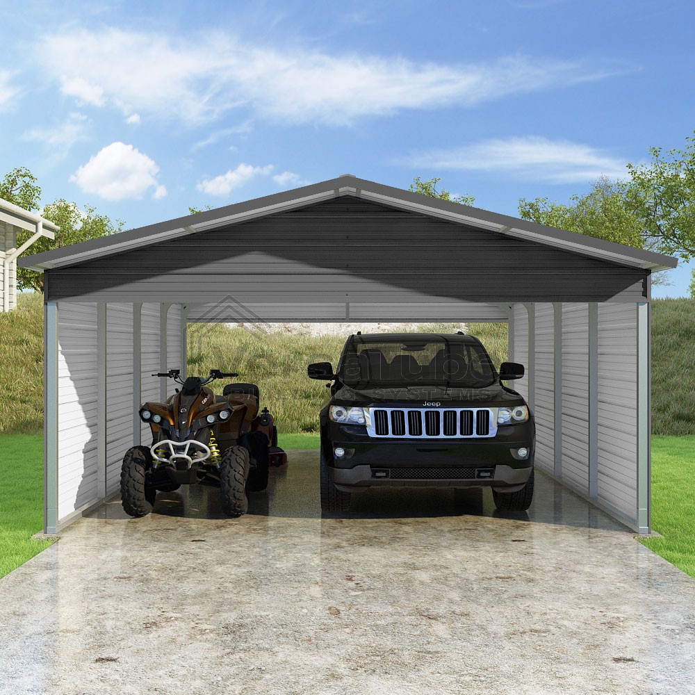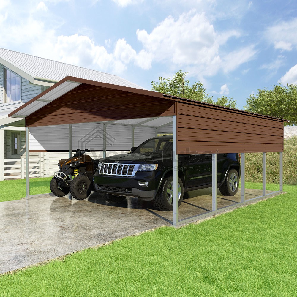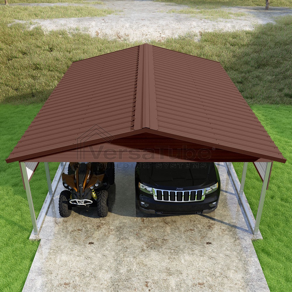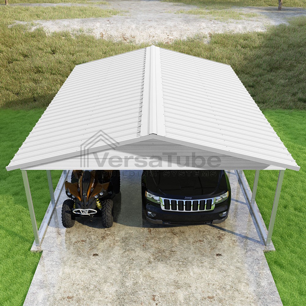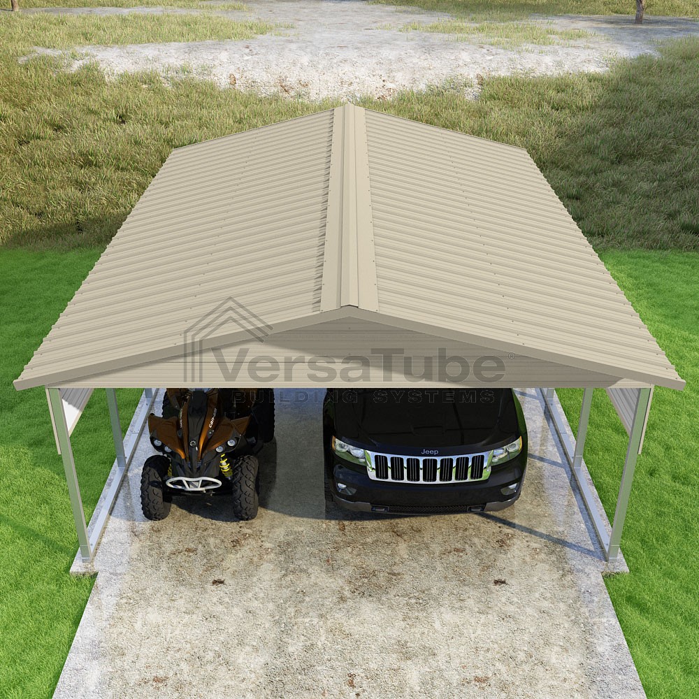Pinnacle Series DIY carport kit features vertical sheet metal roof panels with ridge cap, gable and eave trim for an A-frame roof style and extended coverage on both ends.