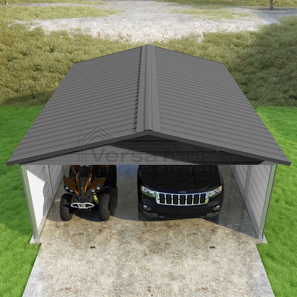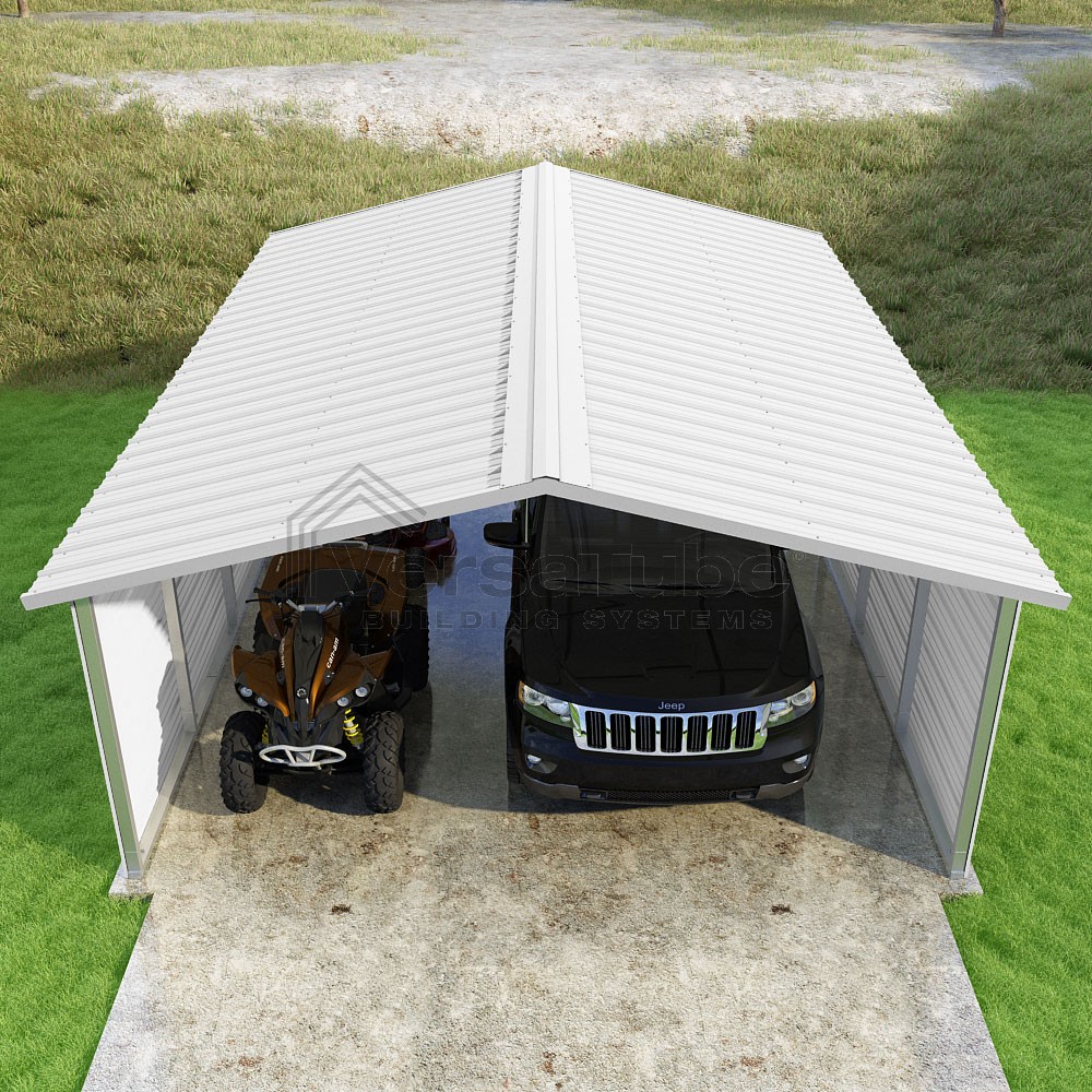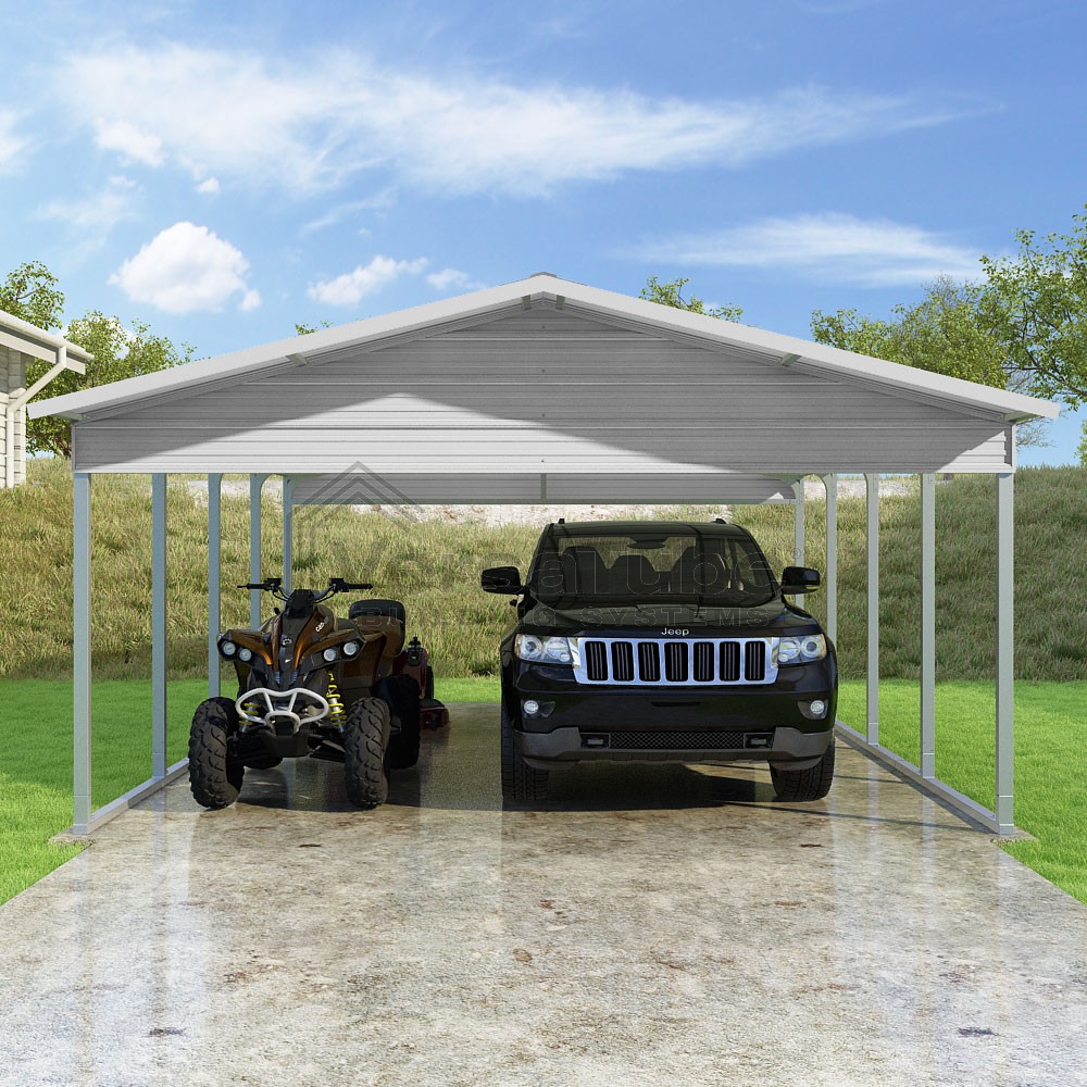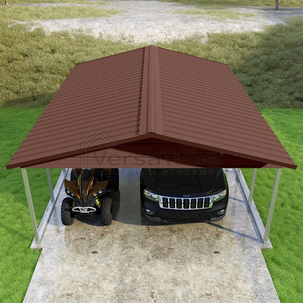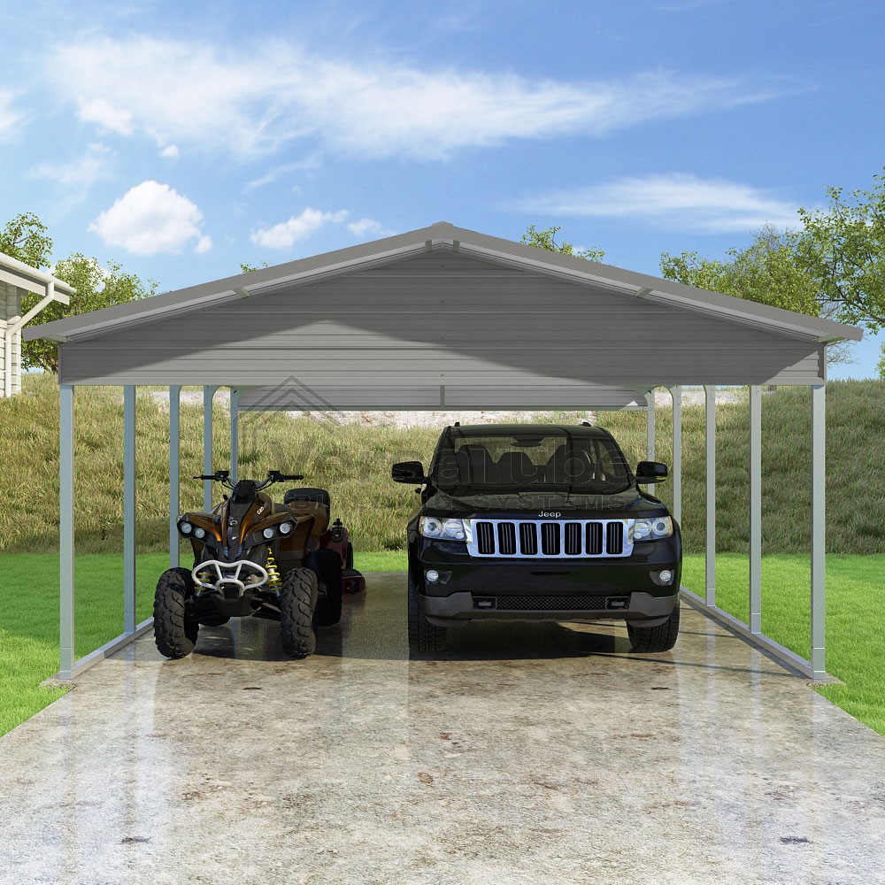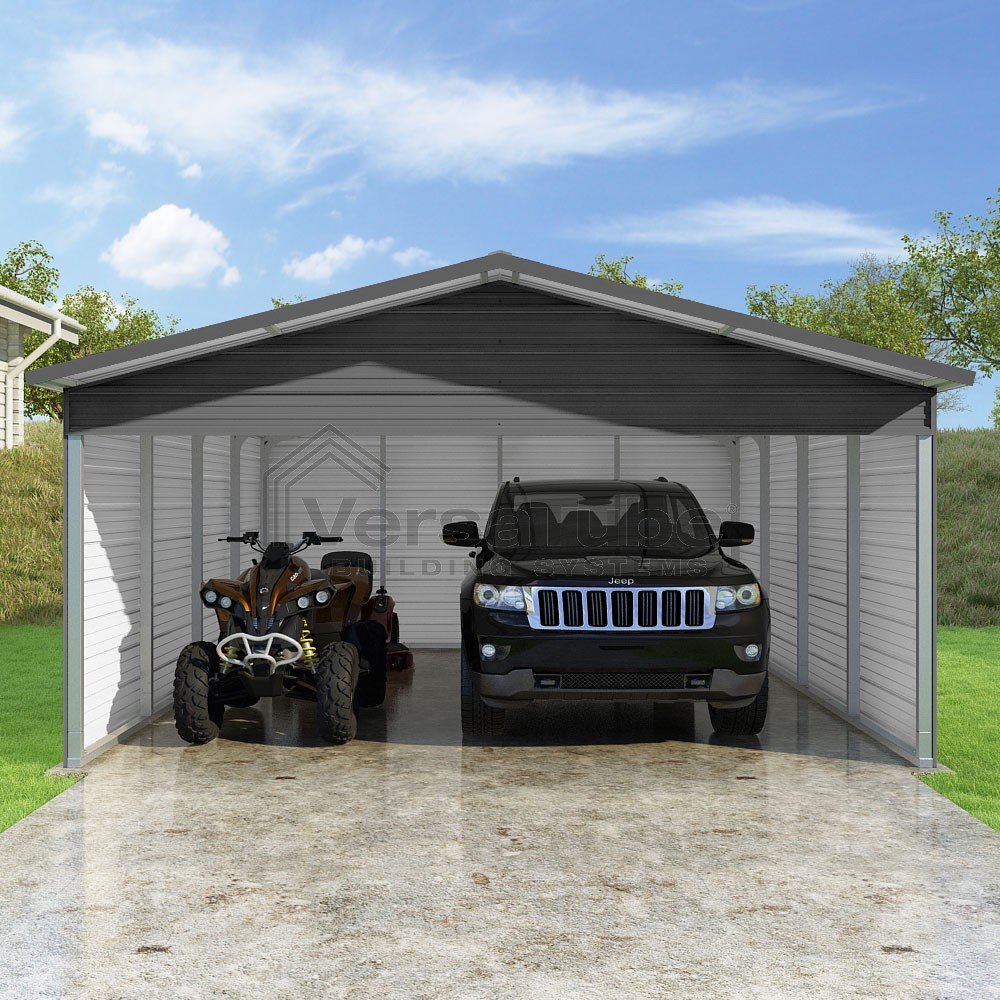 Pinnacle Series DIY carport kit features vertical sheet metal roof panels with ridge cap, gable and eave trim for an A-frame roof style and extended coverage on both ends.