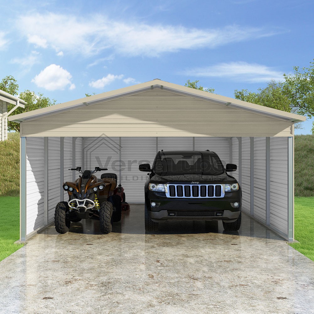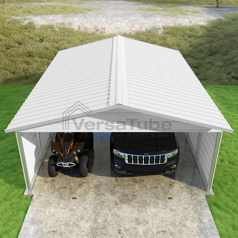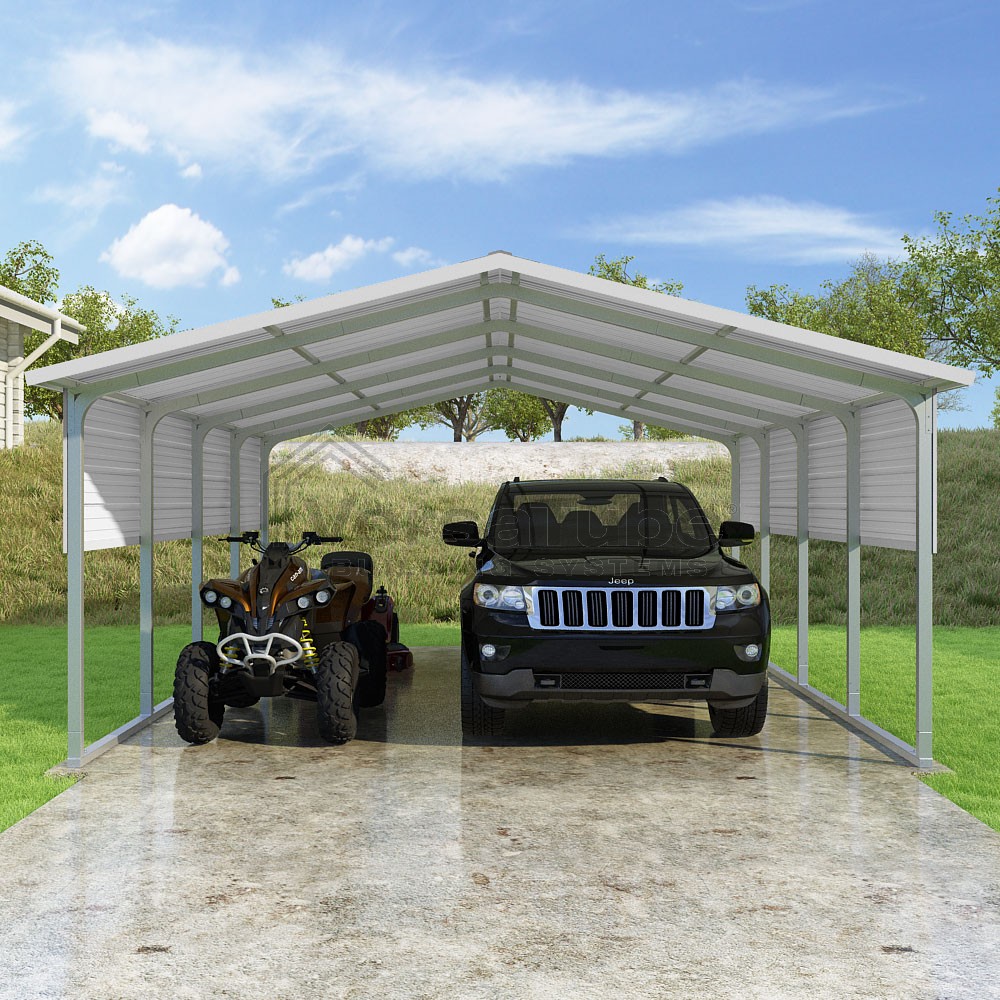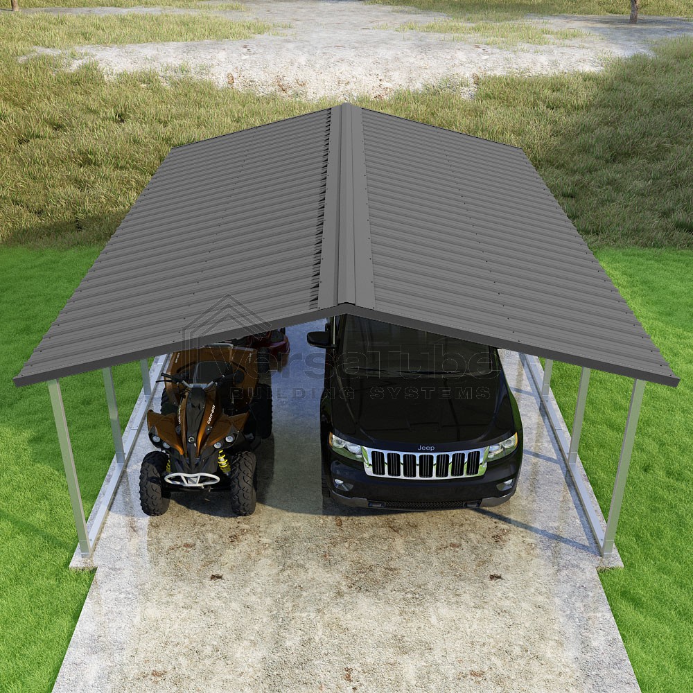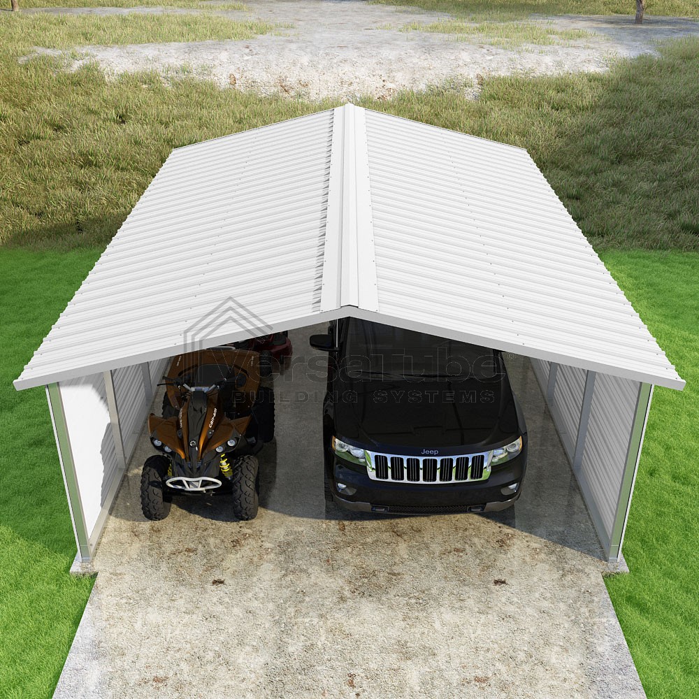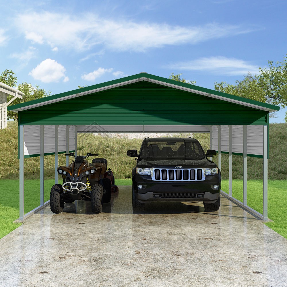 Pinnacle Series DIY carport kit features vertical sheet metal roof panels with ridge cap, gable and eave trim for an A-frame roof style and extended coverage on both ends.