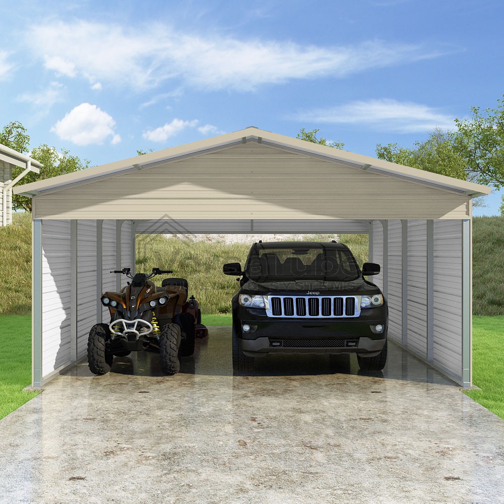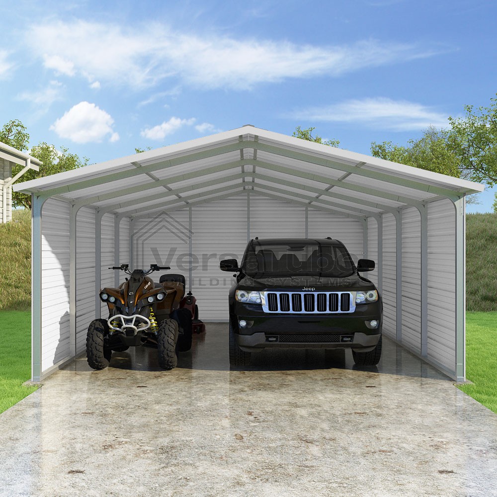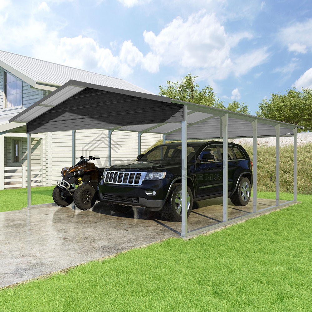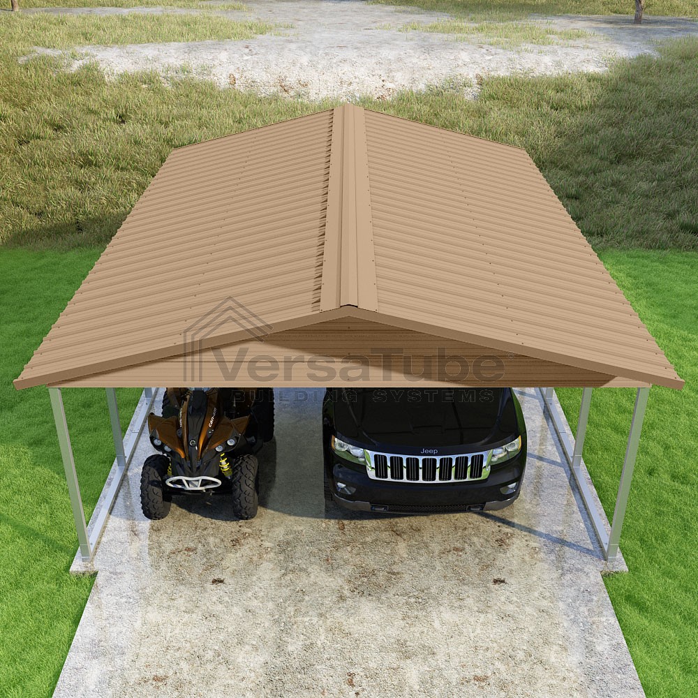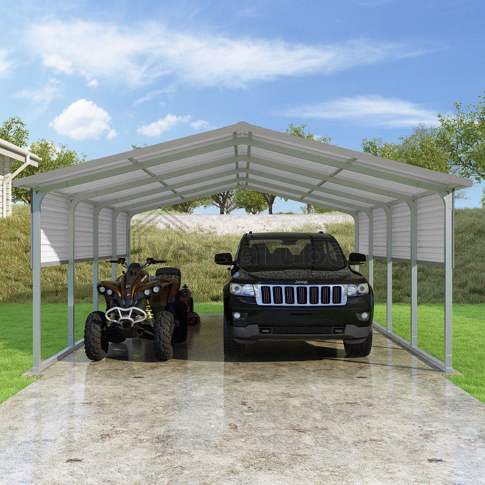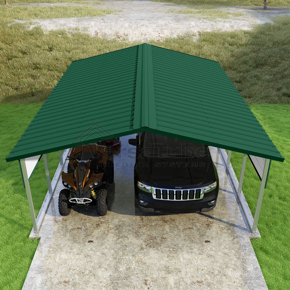 Pinnacle Series DIY carport kit features vertical sheet metal roof panels with ridge cap, gable and eave trim for an A-frame roof style and extended coverage on both ends.