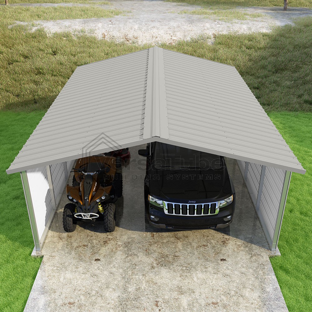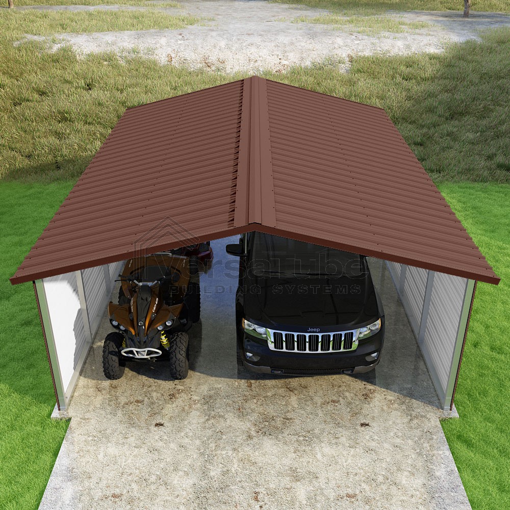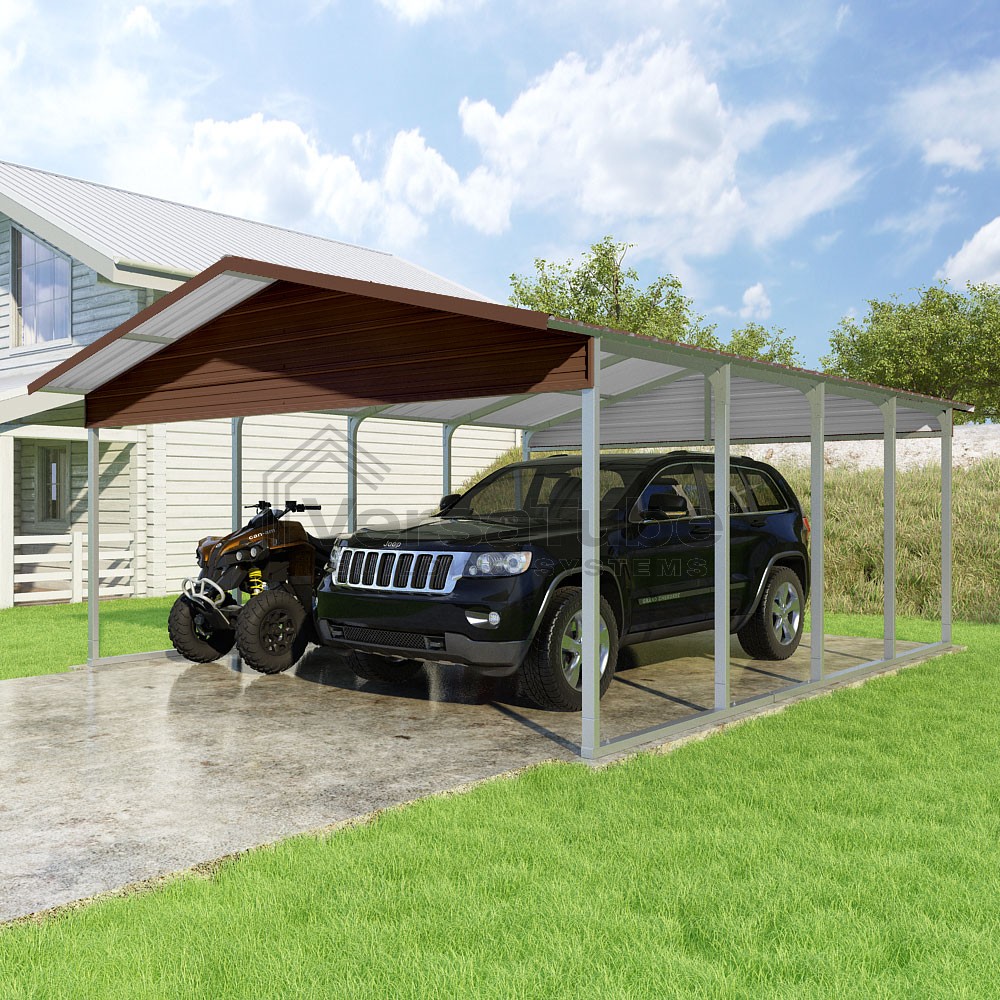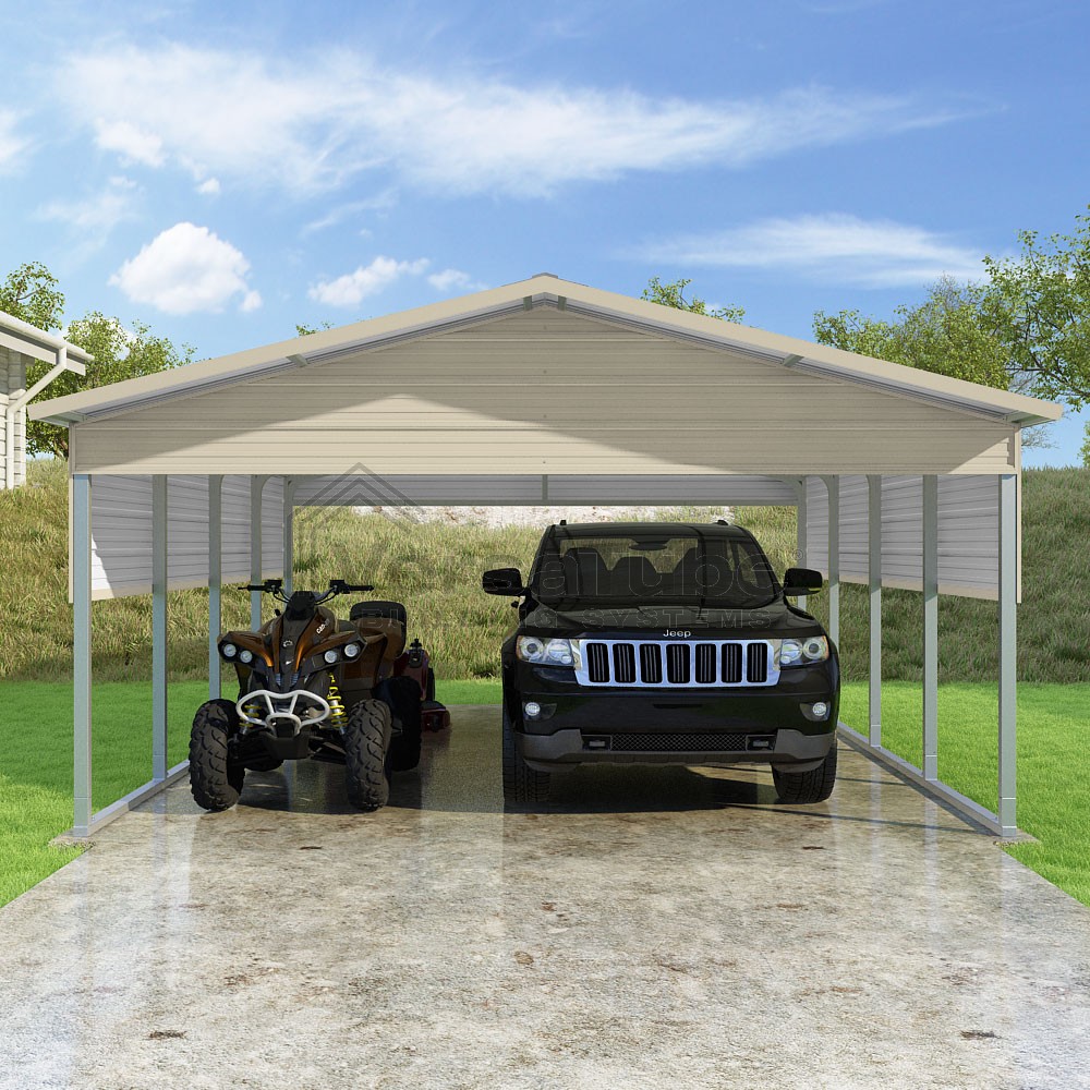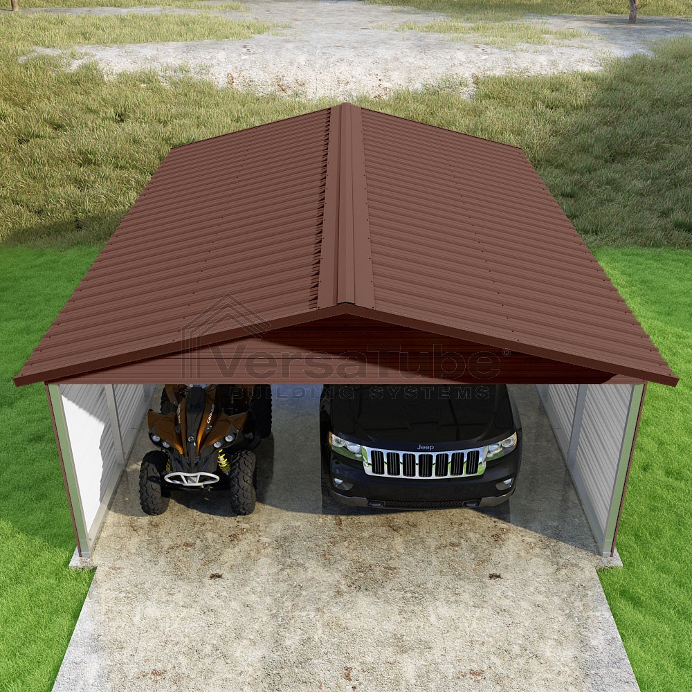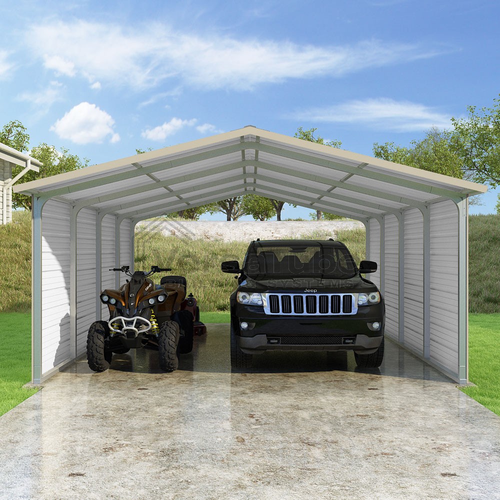 Pinnacle Series DIY carport kit features vertical sheet metal roof panels with ridge cap, gable and eave trim for an A-frame roof style and extended coverage on both ends.