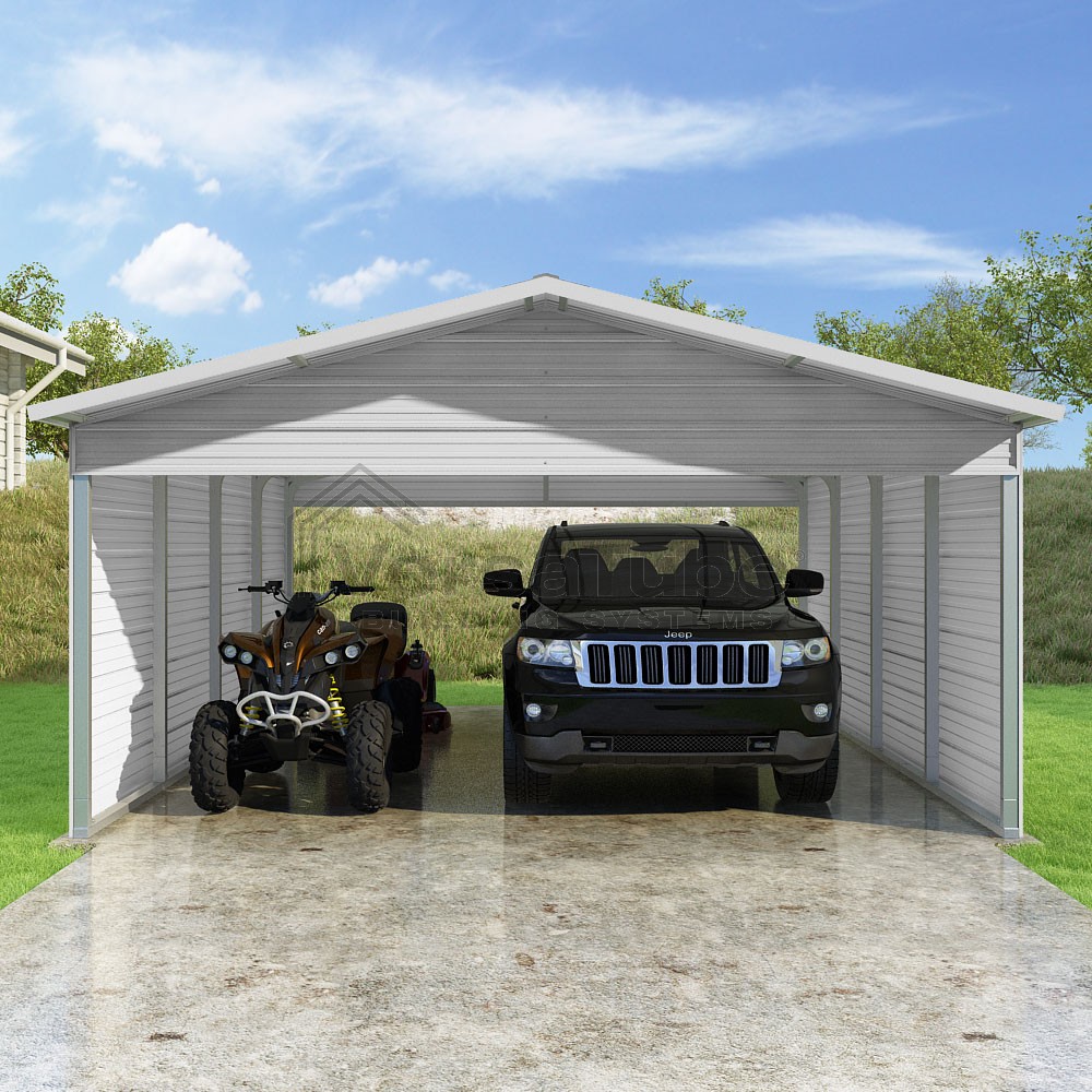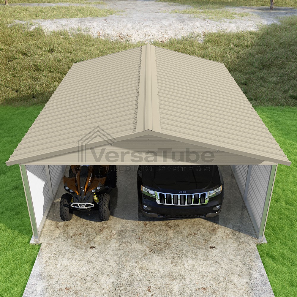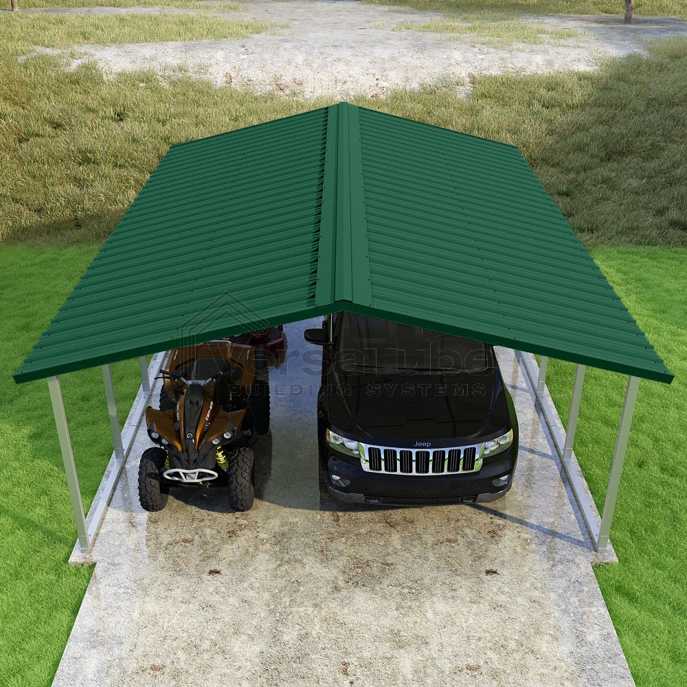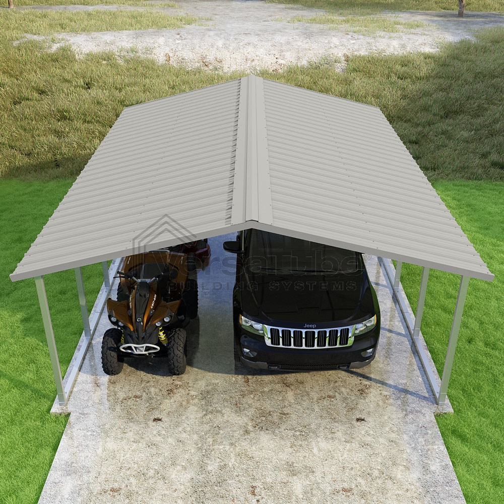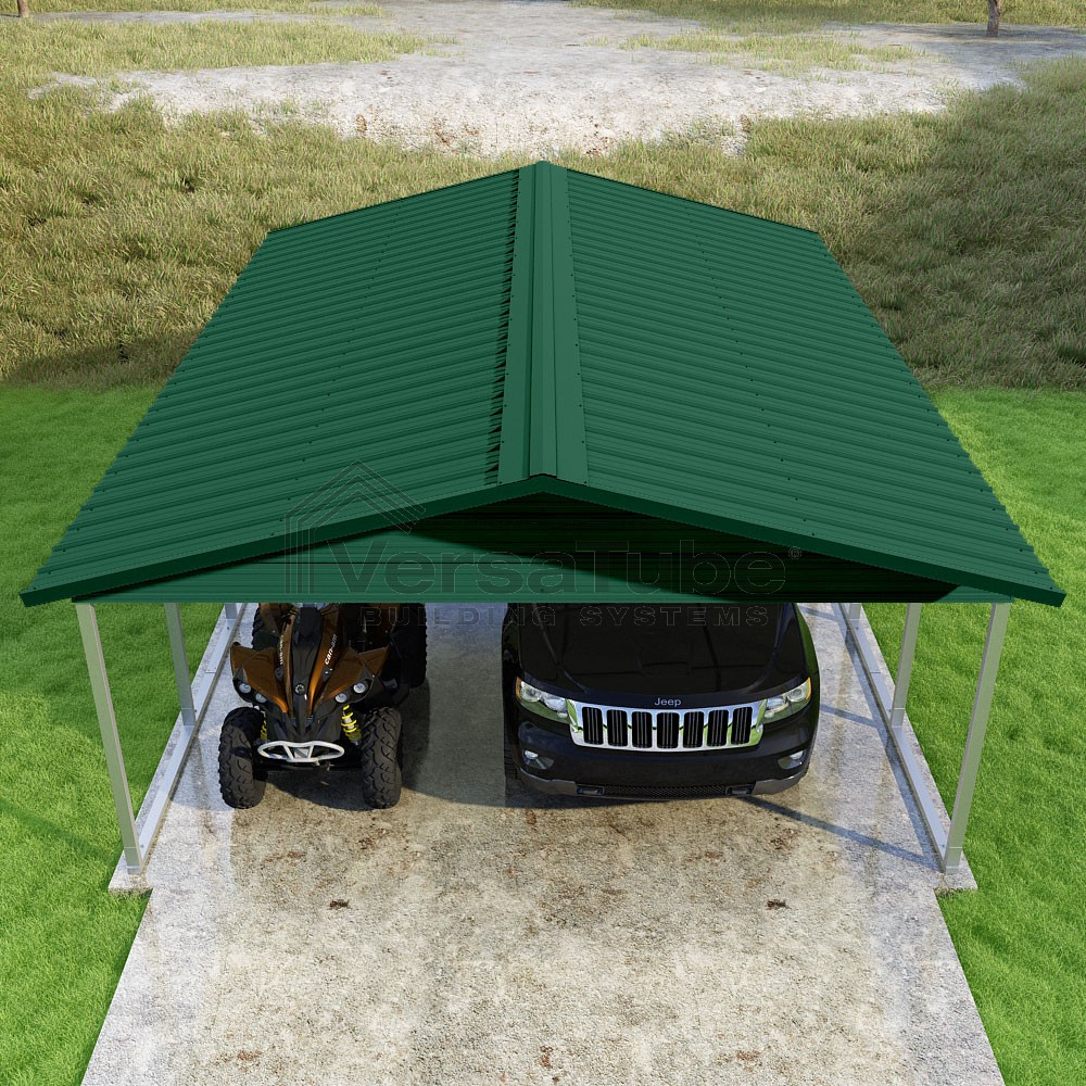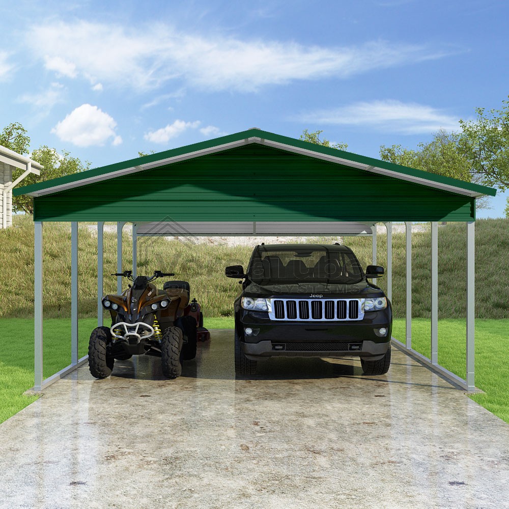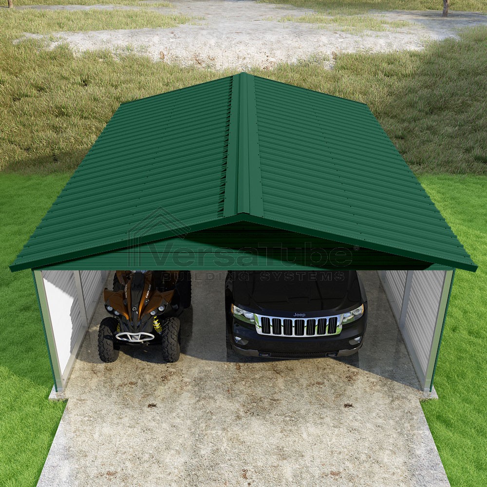 Pinnacle Series DIY carport kit features vertical sheet metal roof panels with ridge cap, gable and eave trim for an A-frame roof style and extended coverage on both ends.