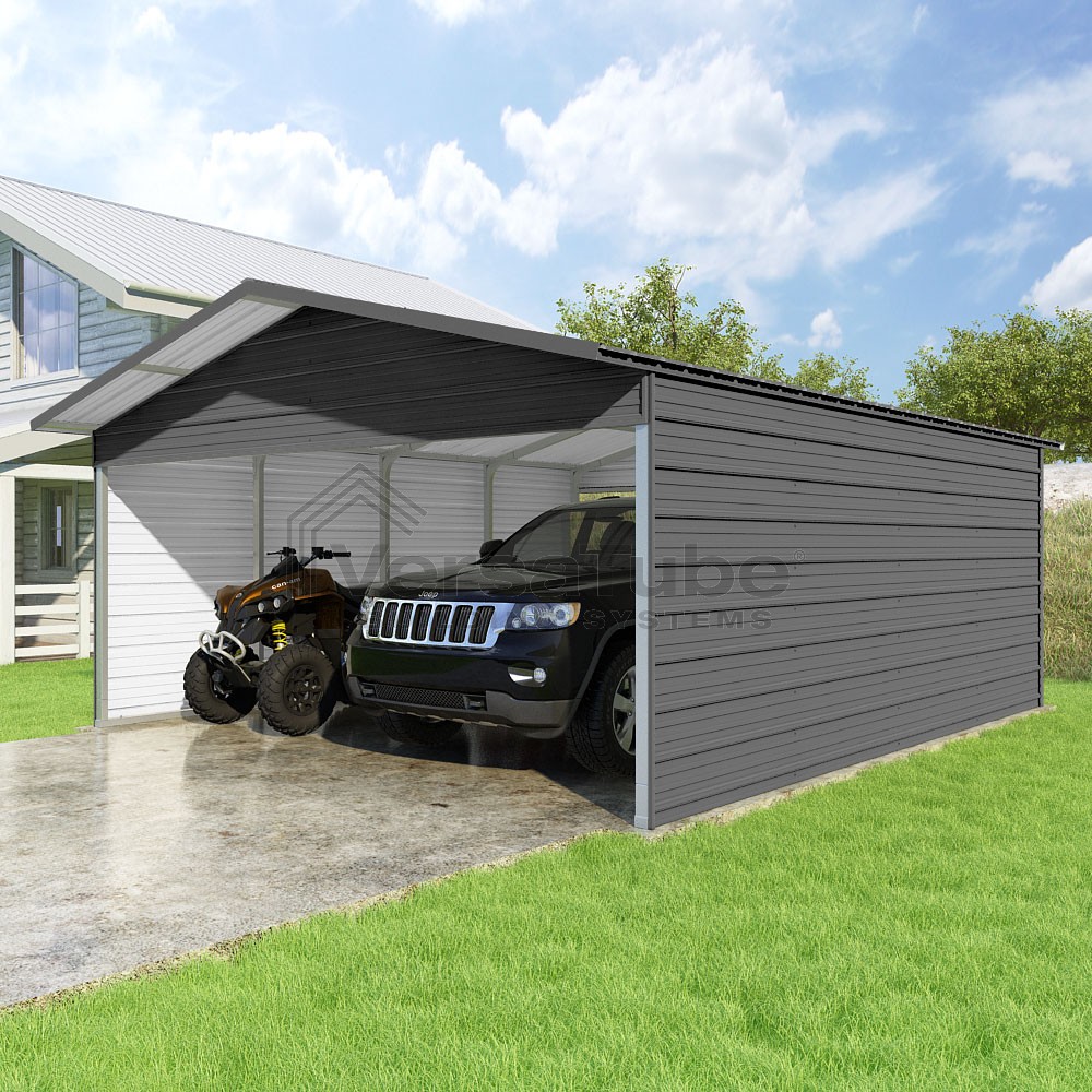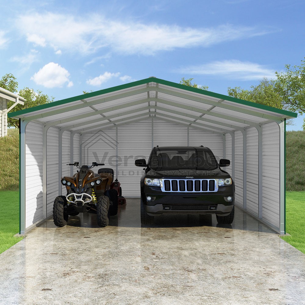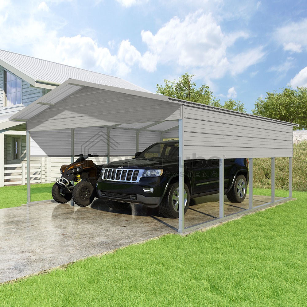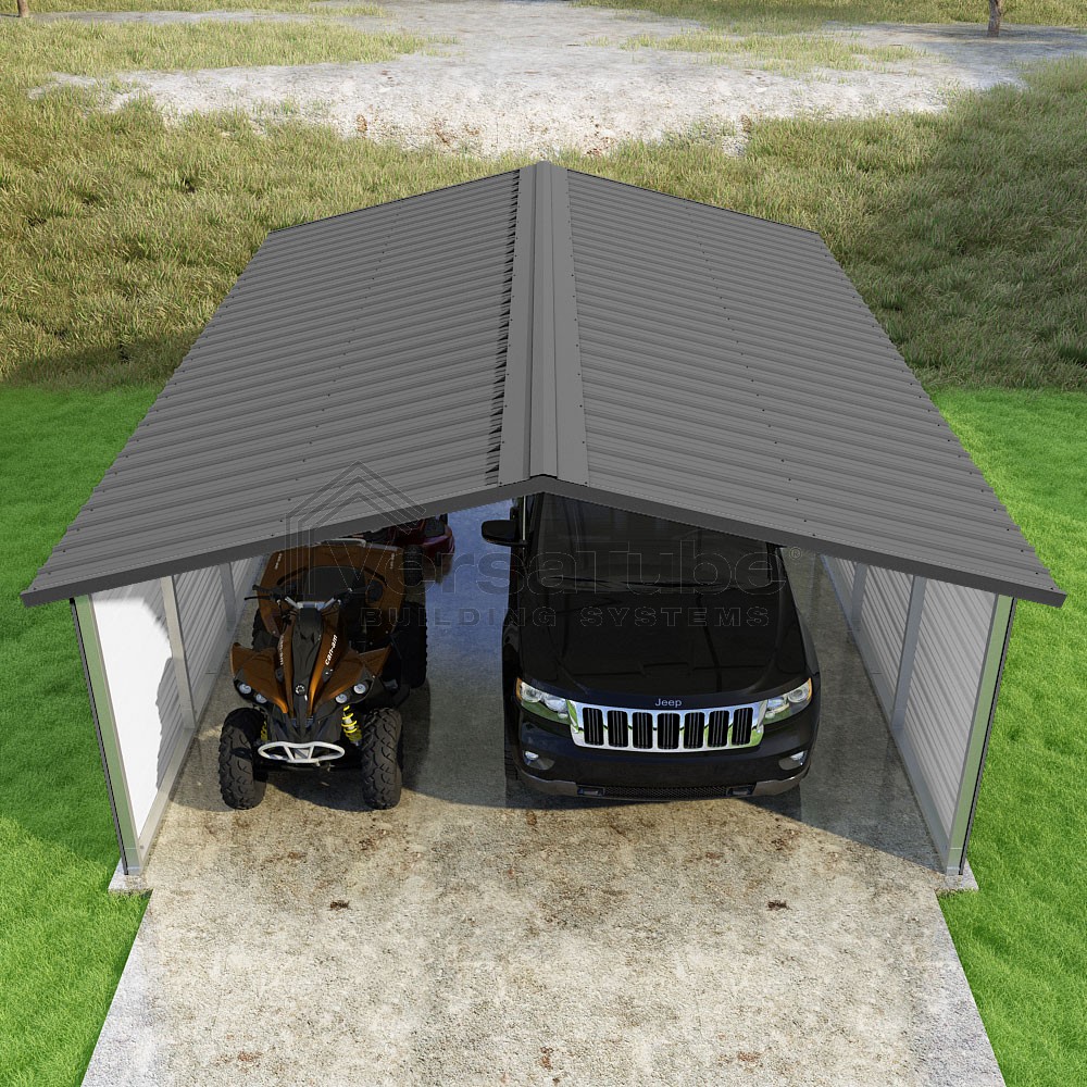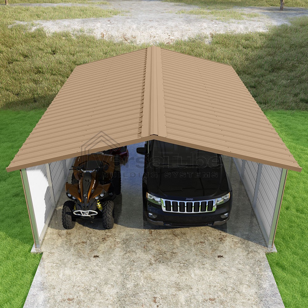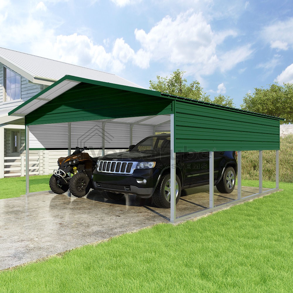 Pinnacle Series DIY carport kit features vertical sheet metal roof panels with ridge cap, gable and eave trim for an A-frame roof style and extended coverage on both ends.