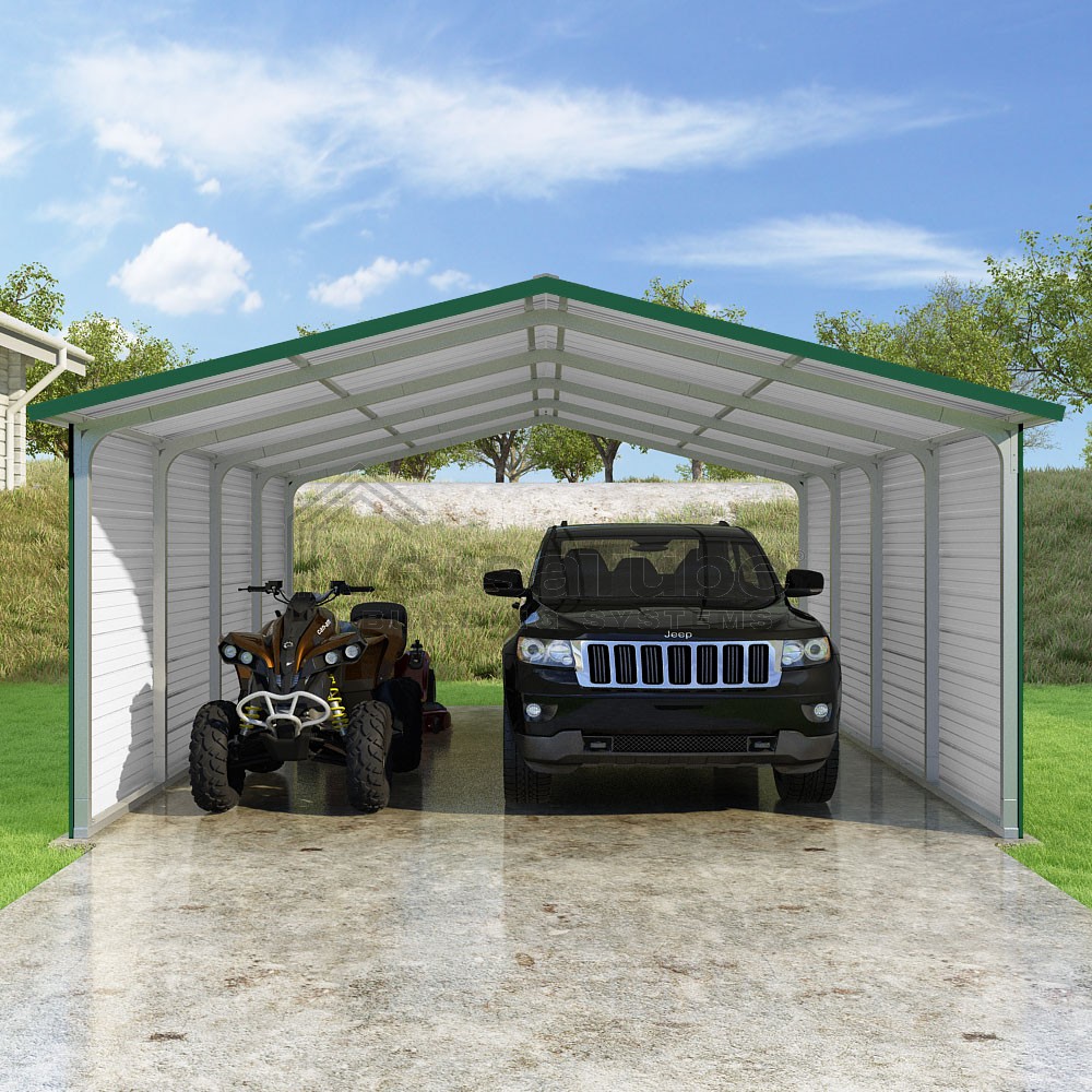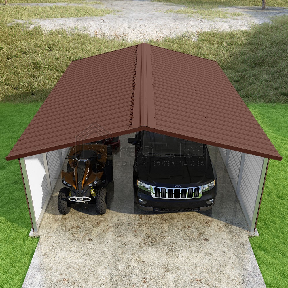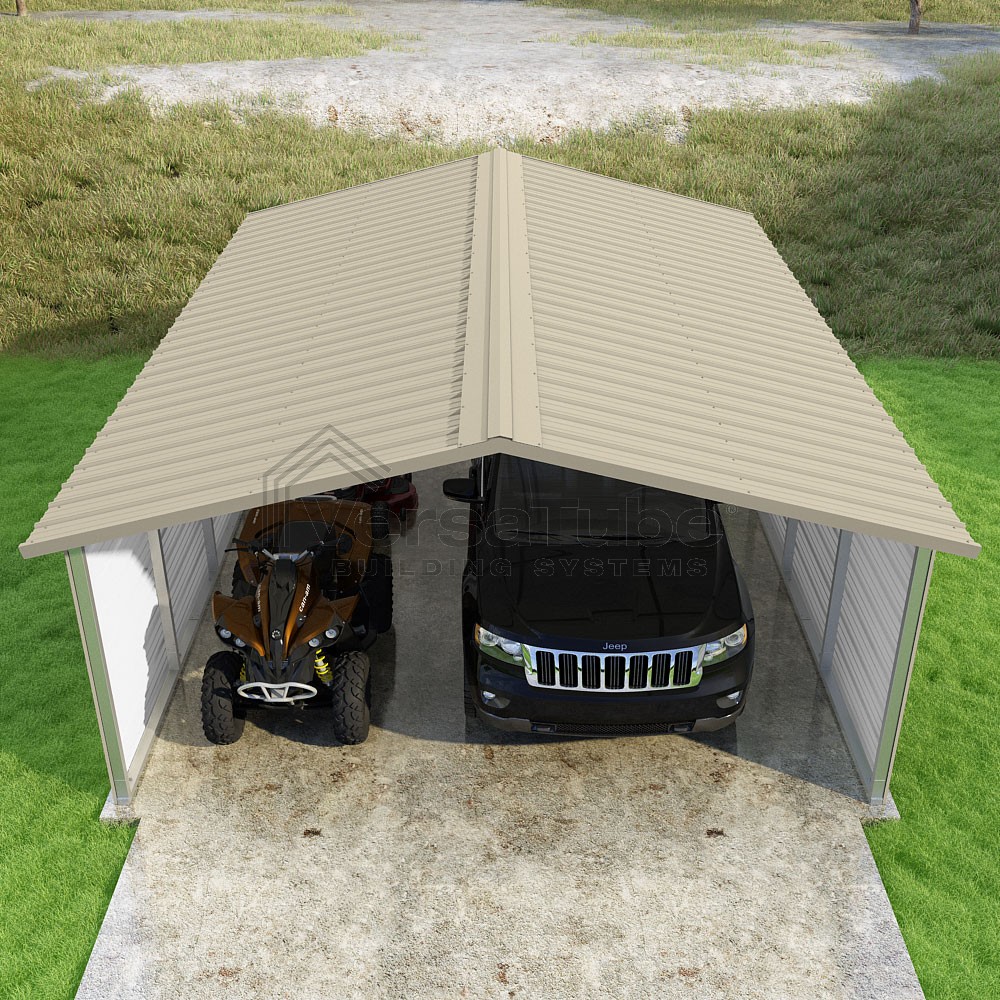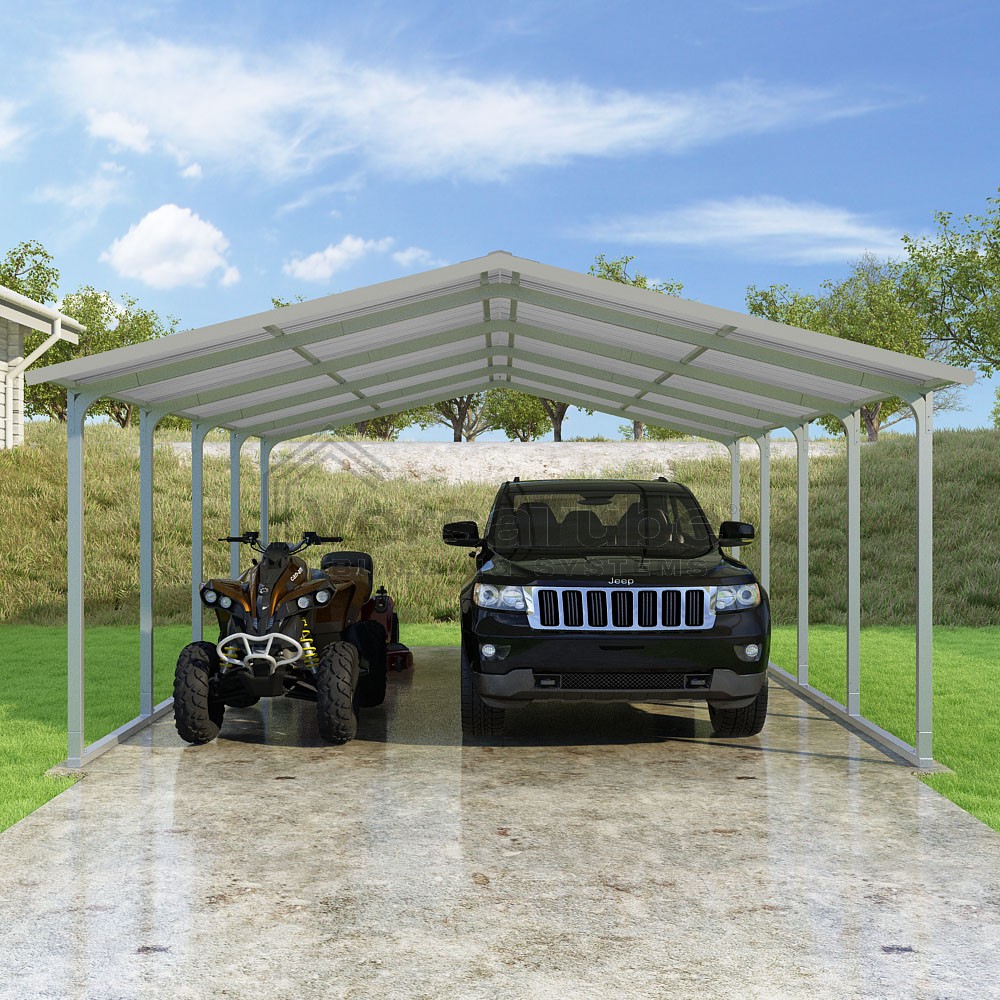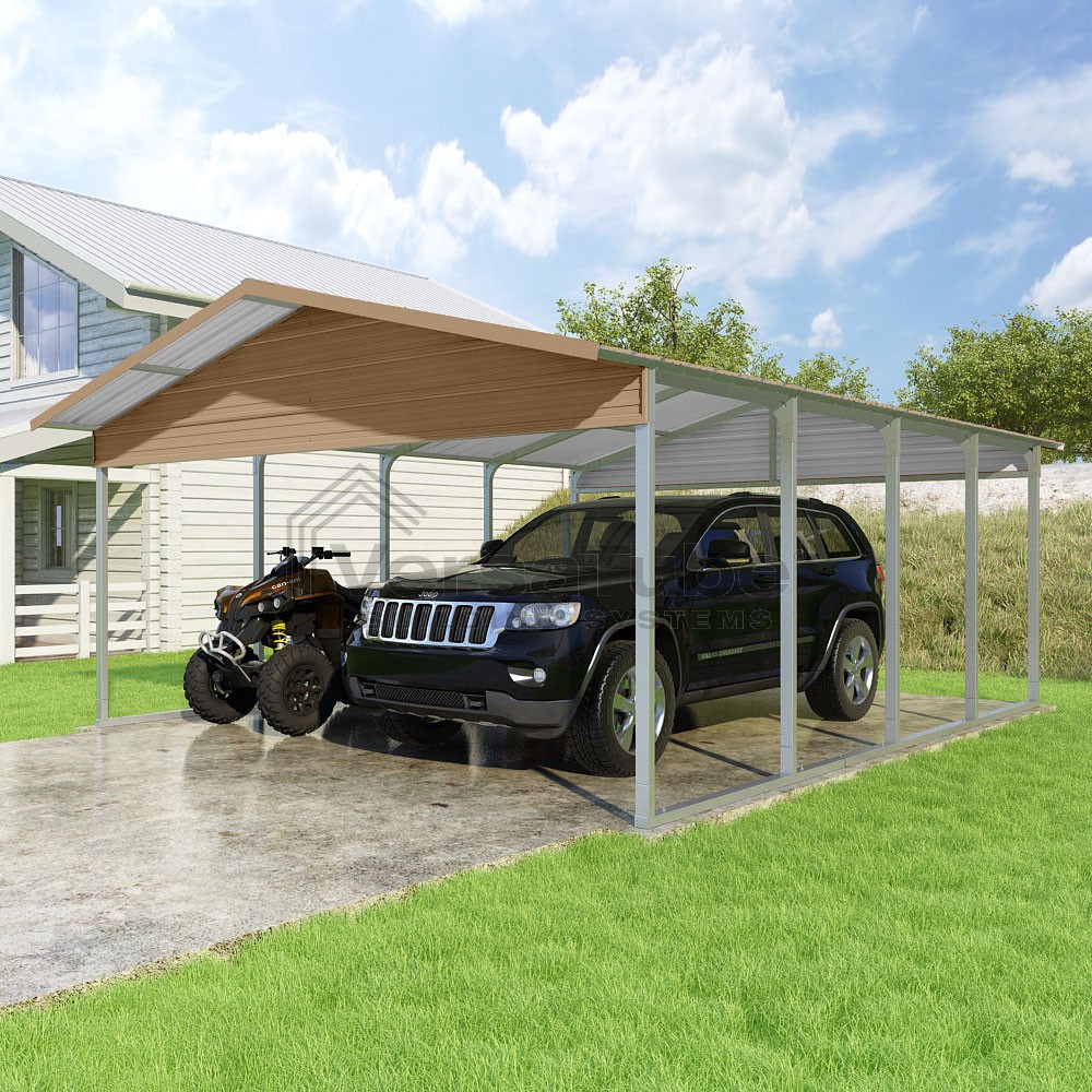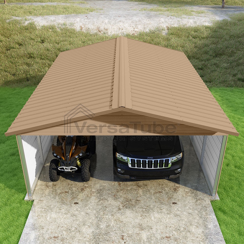 Pinnacle Series DIY carport kit features vertical sheet metal roof panels with ridge cap, gable and eave trim for an A-frame roof style and extended coverage on both ends.