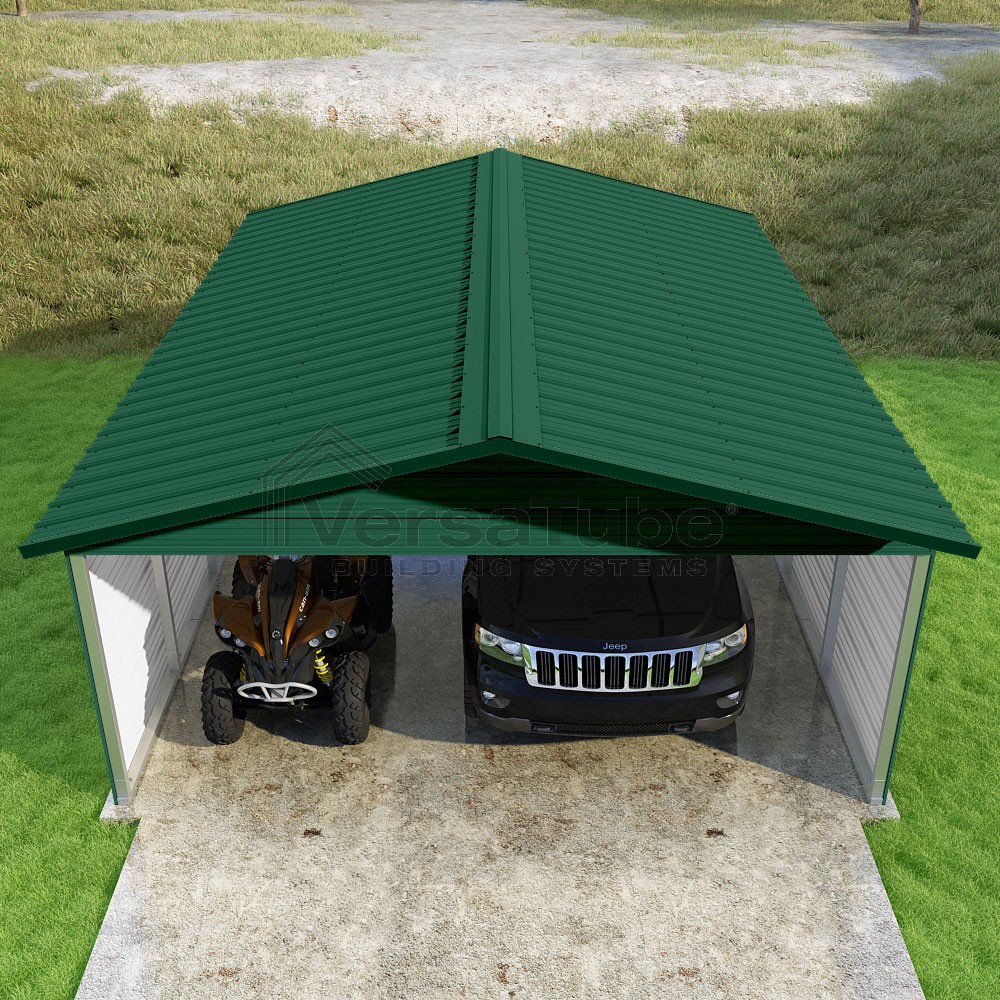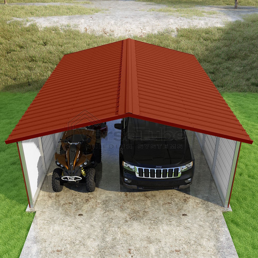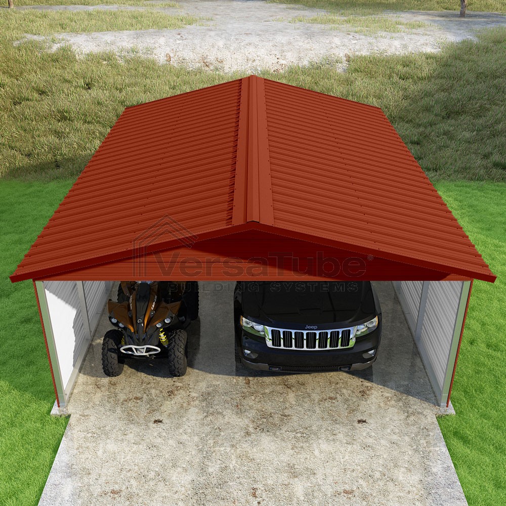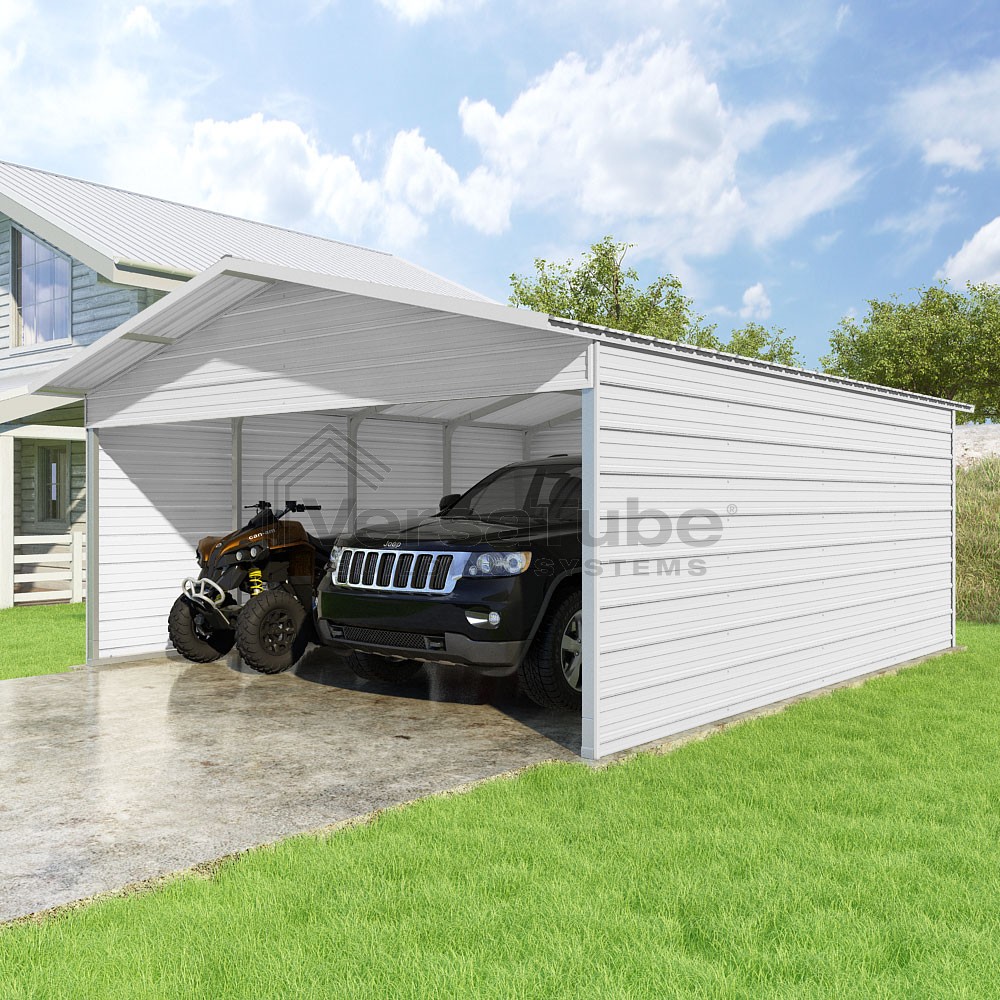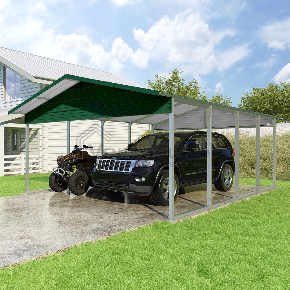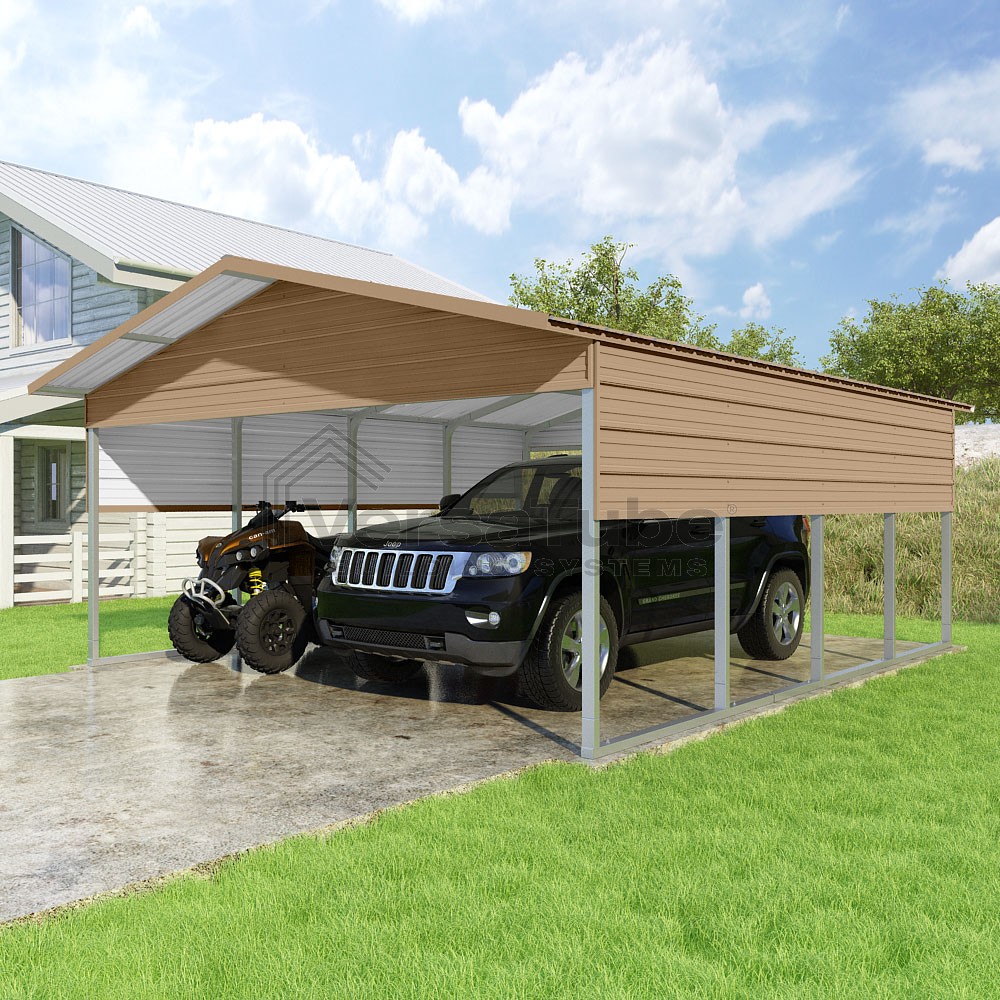 Pinnacle Series DIY carport kit features vertical sheet metal roof panels with ridge cap, gable and eave trim for an A-frame roof style and extended coverage on both ends.
