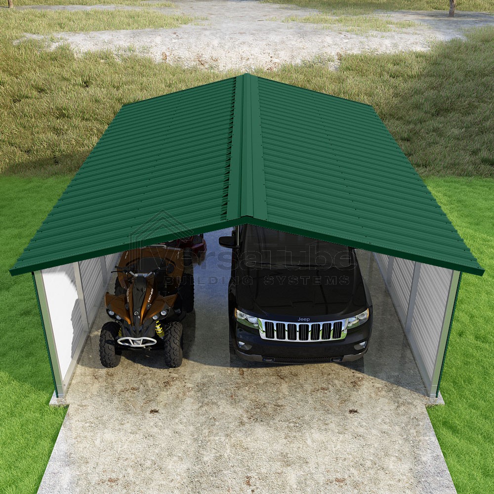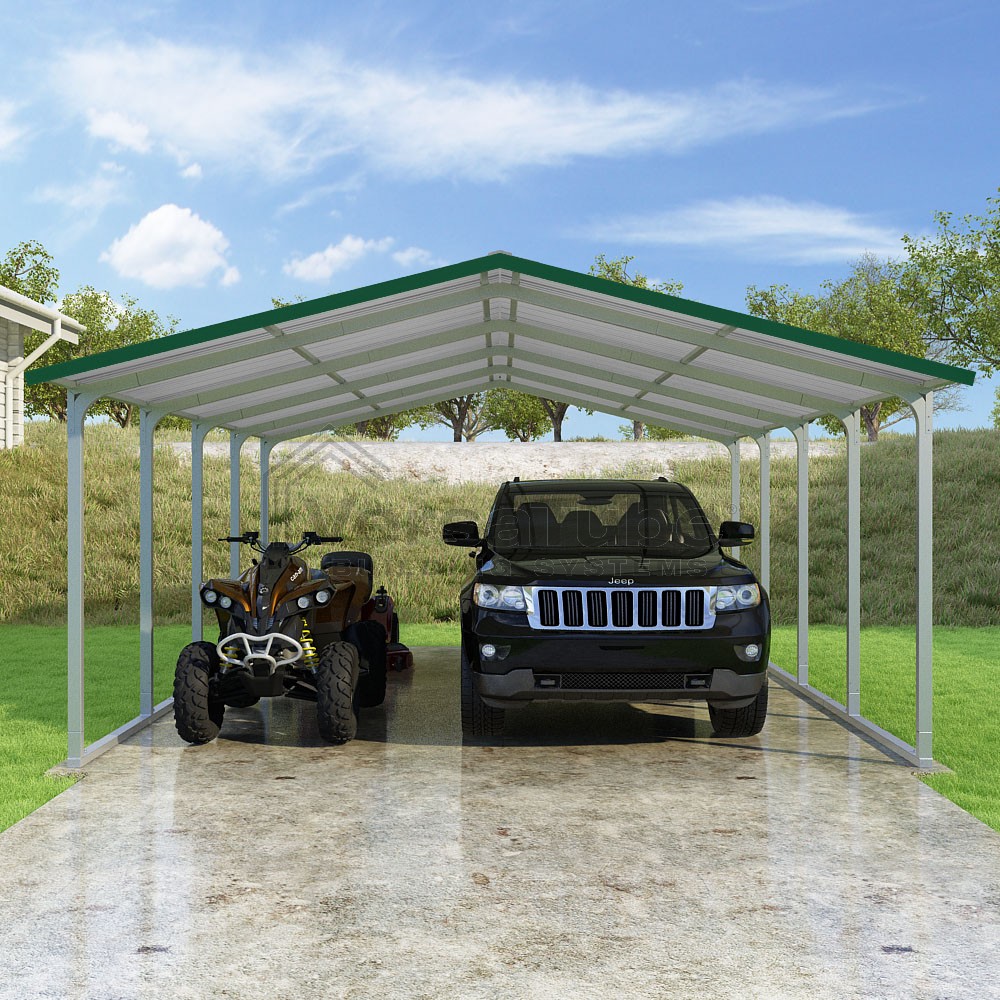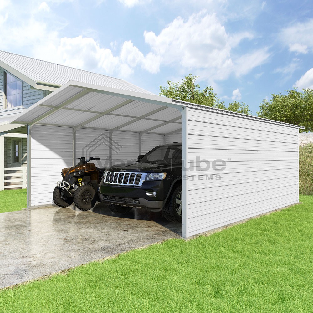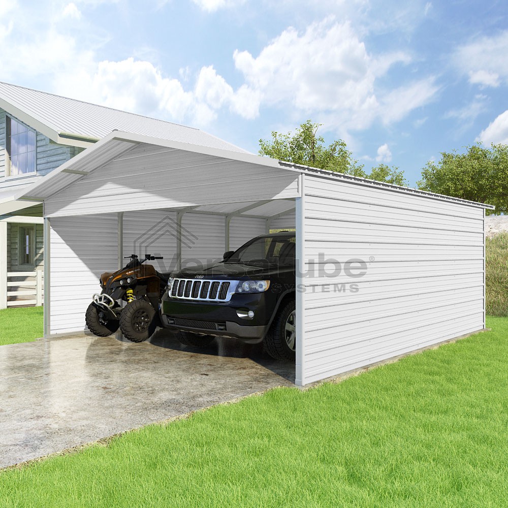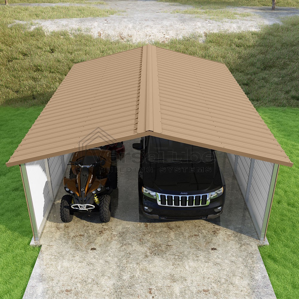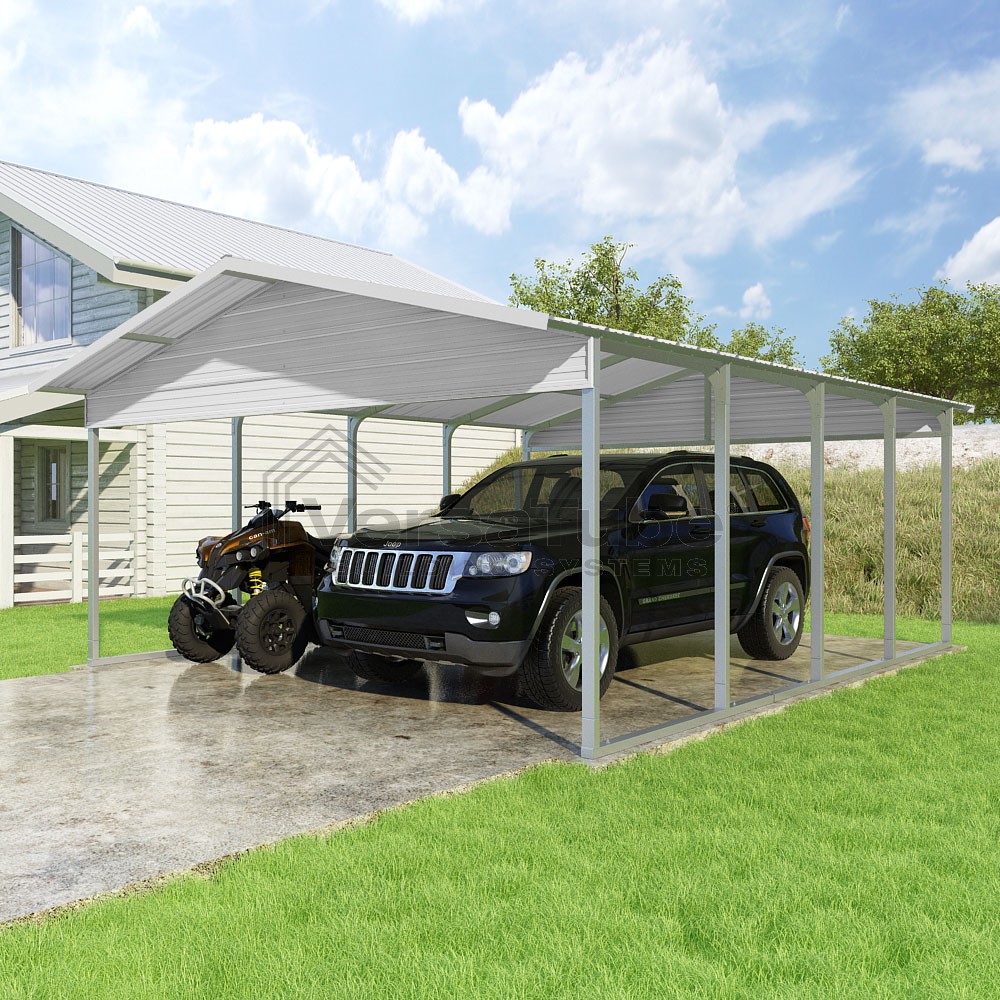 Pinnacle Series DIY carport kit features vertical sheet metal roof panels with ridge cap, gable and eave trim for an A-frame roof style and extended coverage on both ends.