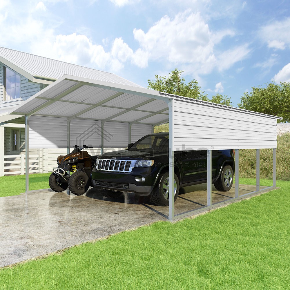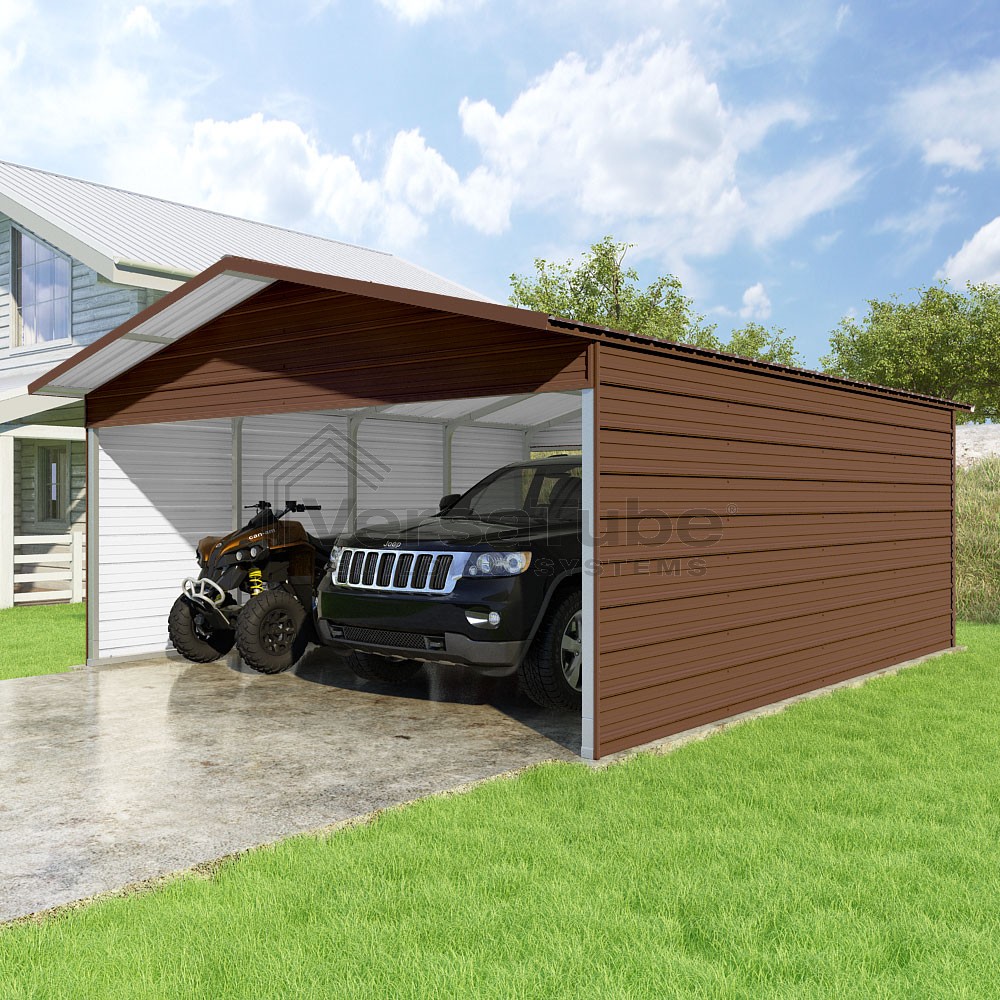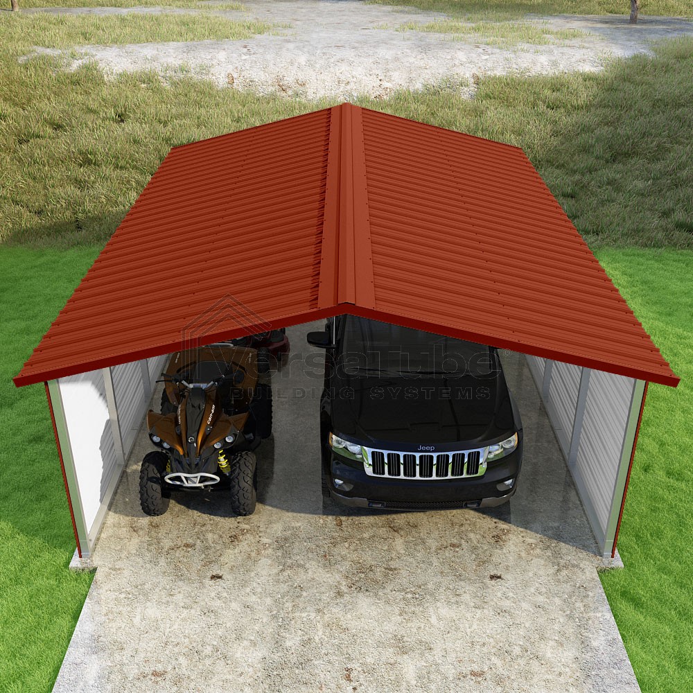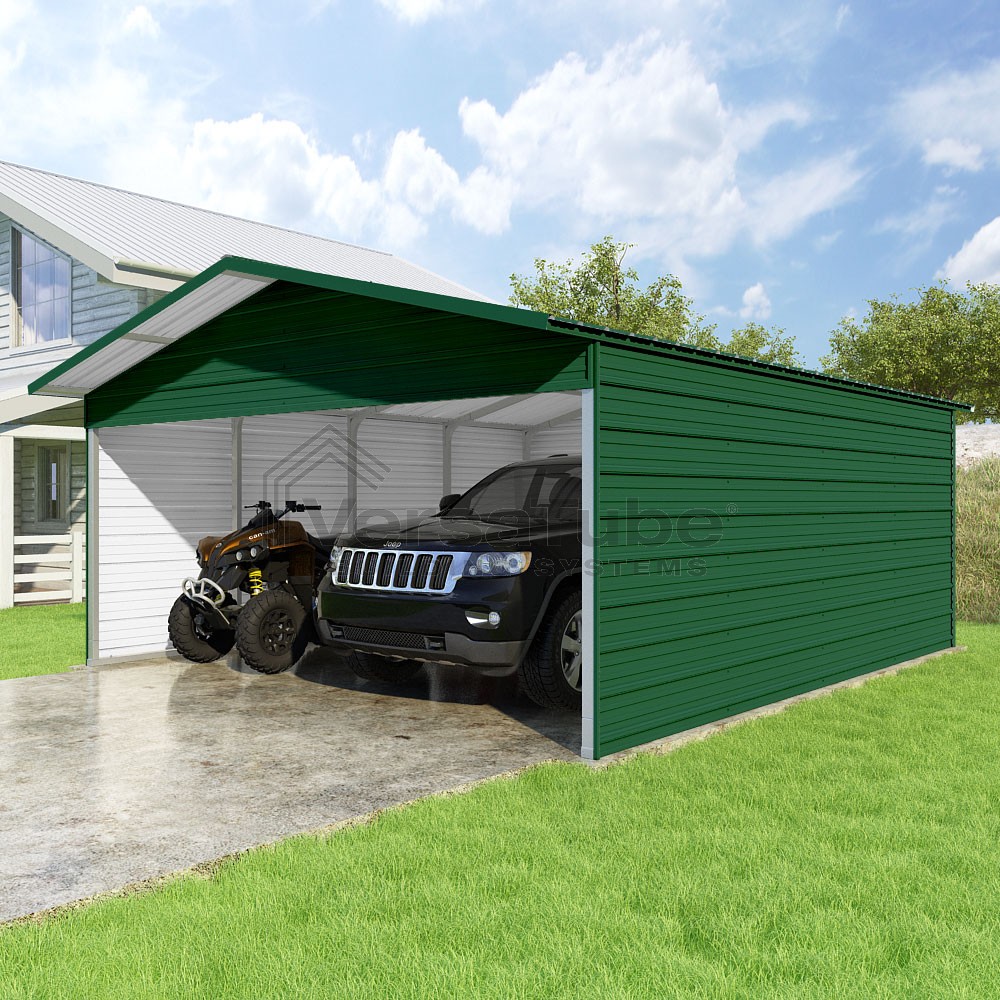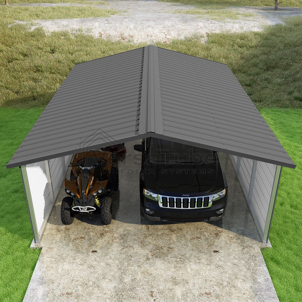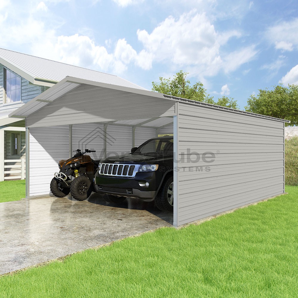 Pinnacle Series DIY carport kit features vertical sheet metal roof panels with ridge cap, gable and eave trim for an A-frame roof style and extended coverage on both ends.