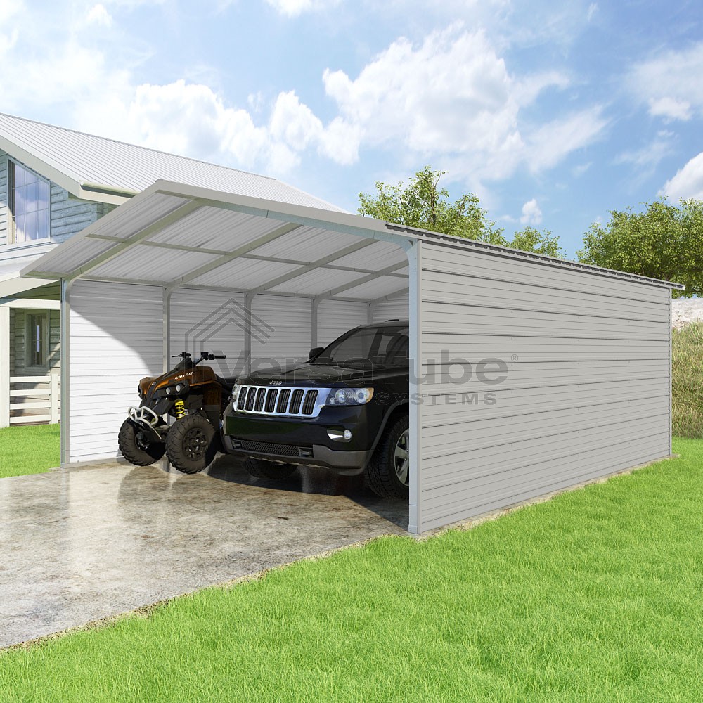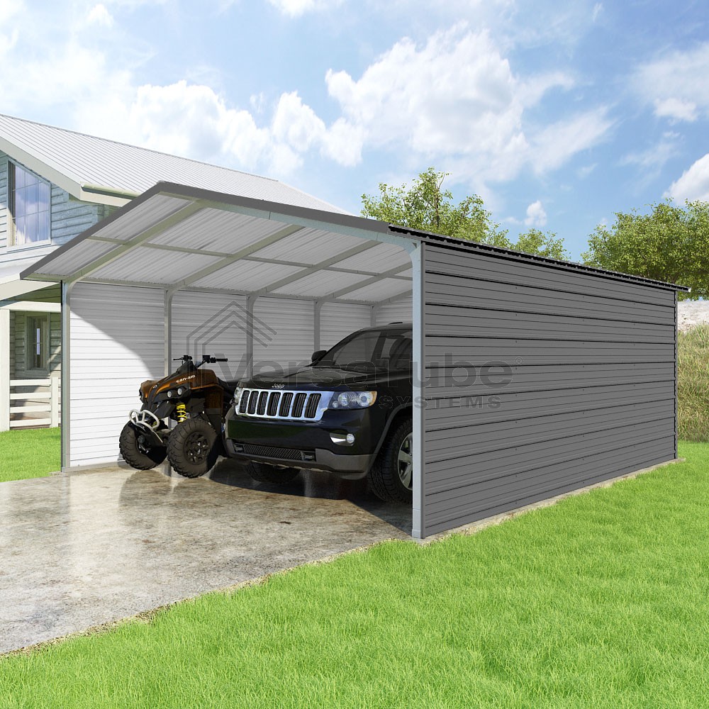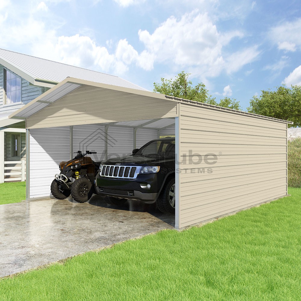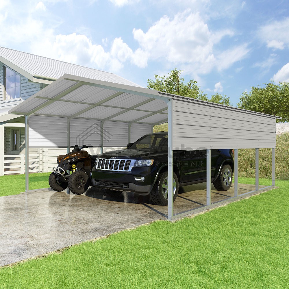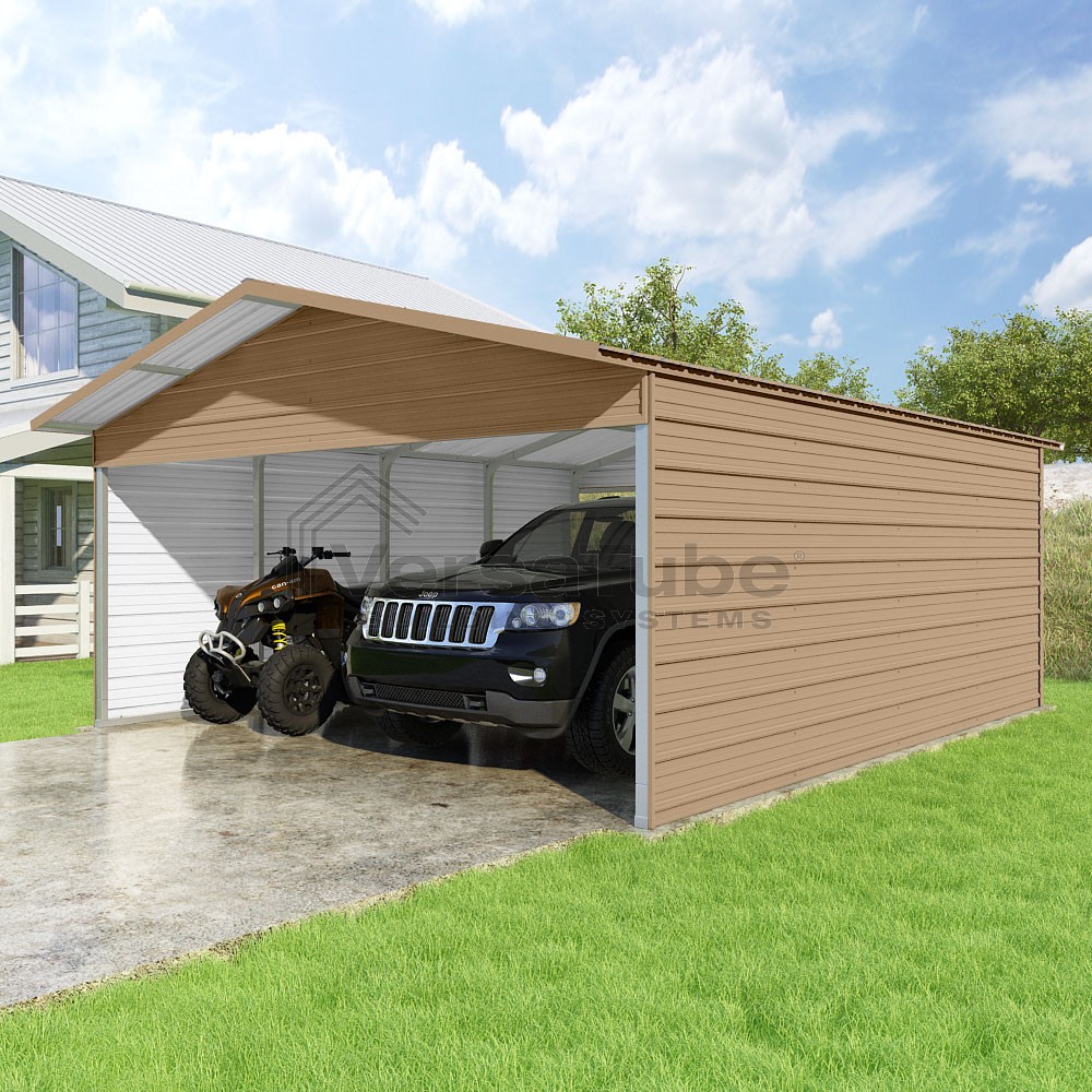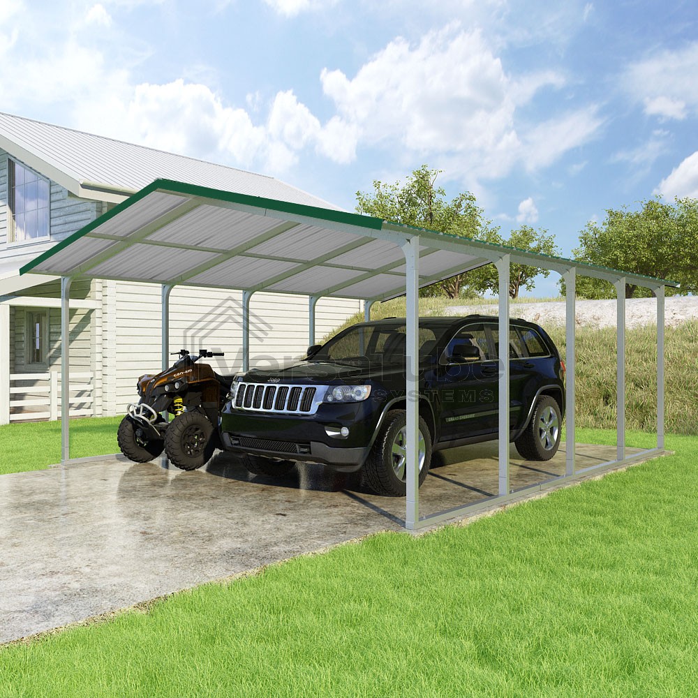 Pinnacle Series DIY carport kit features vertical sheet metal roof panels with ridge cap, gable and eave trim for an A-frame roof style and extended coverage on both ends.