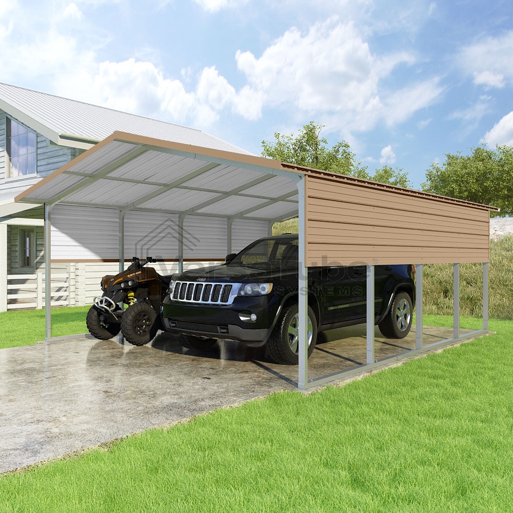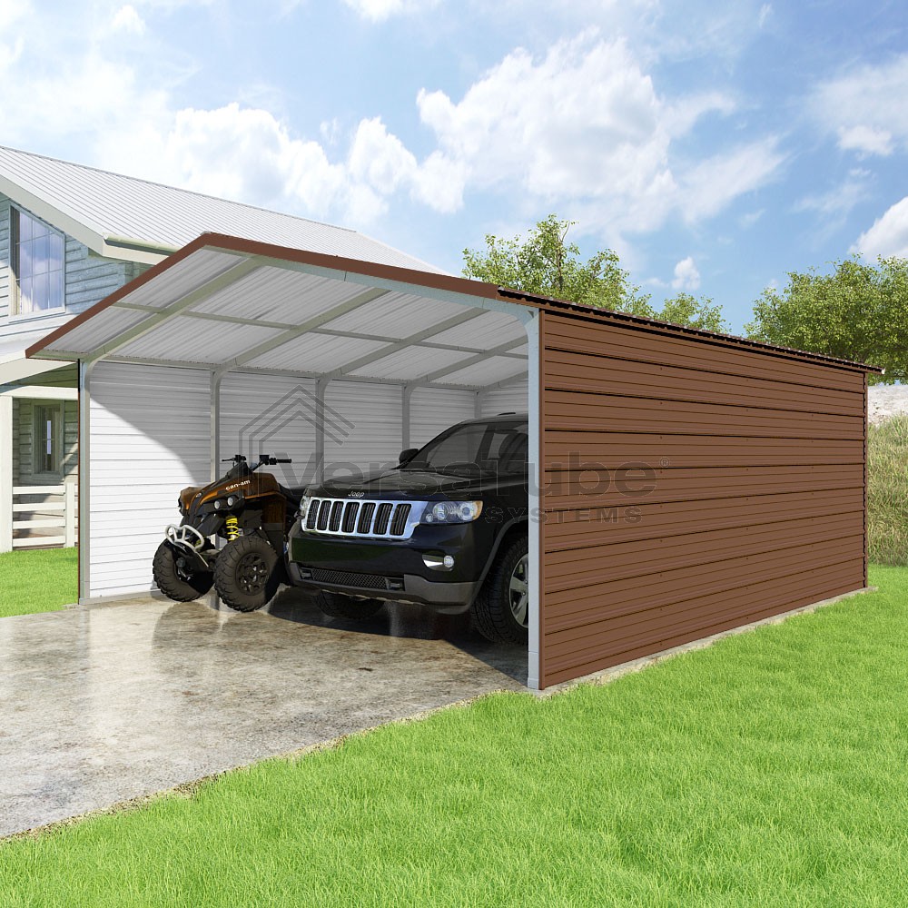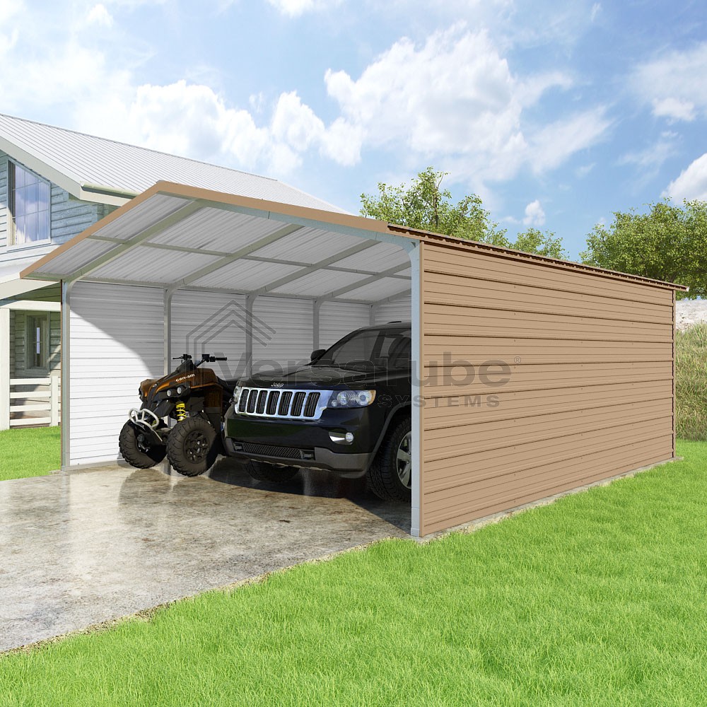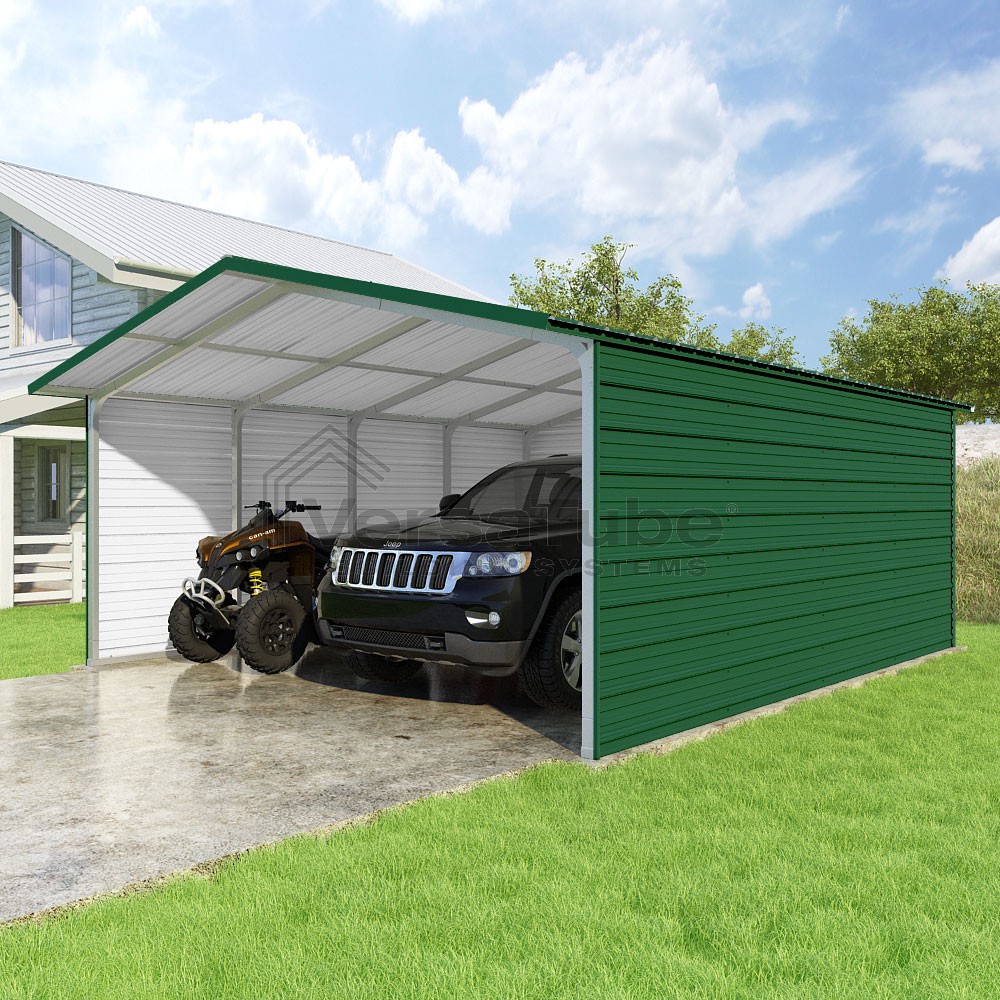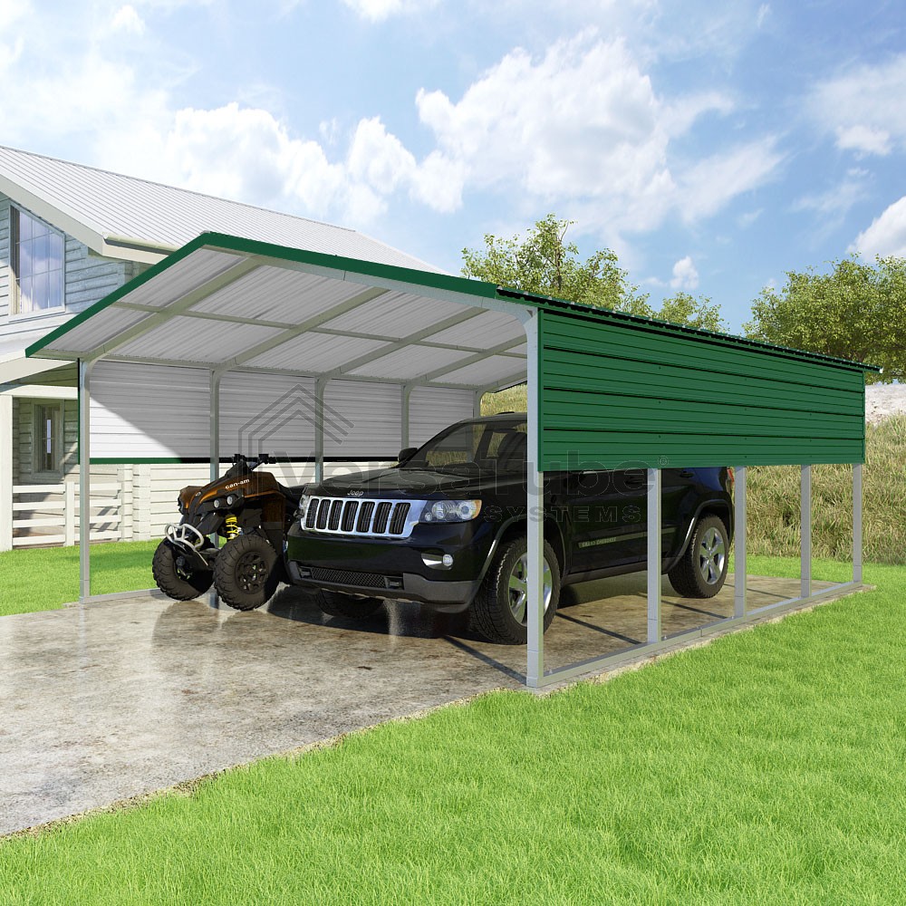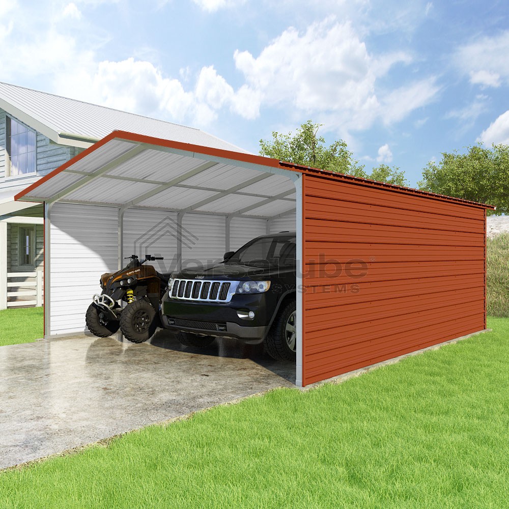 Pinnacle Series DIY carport kit features vertical sheet metal roof panels with ridge cap, gable and eave trim for an A-frame roof style and extended coverage on both ends.