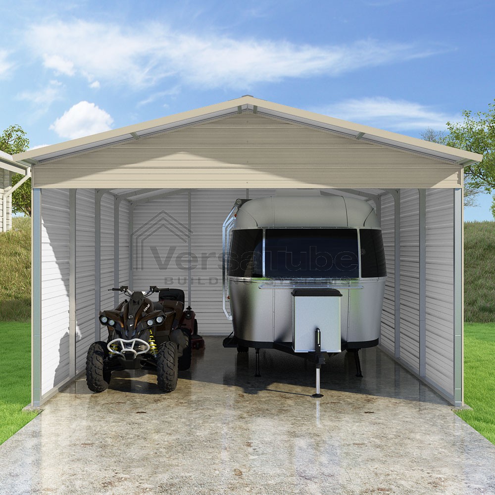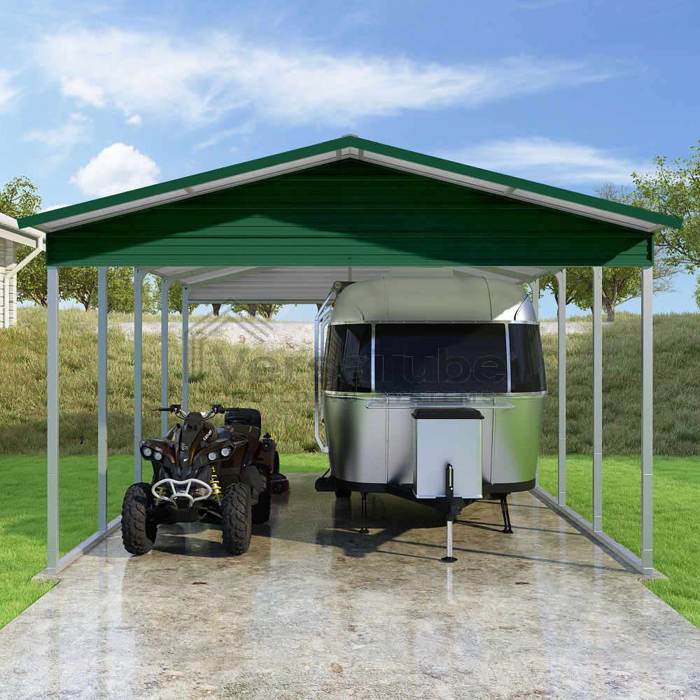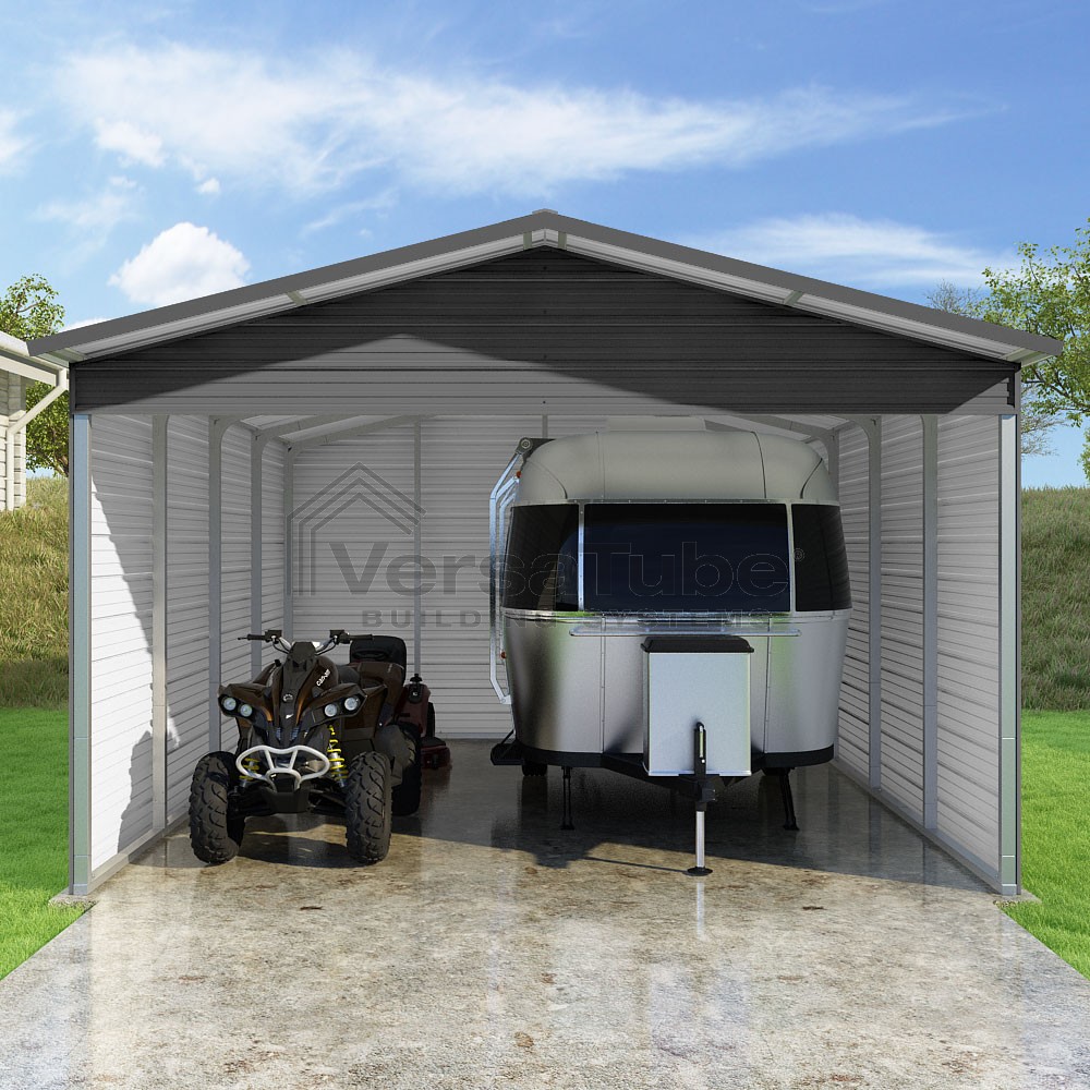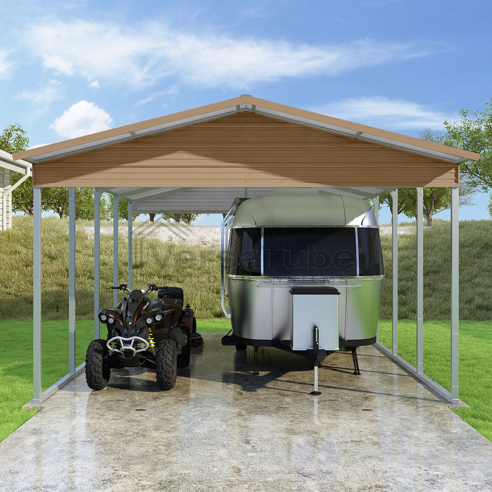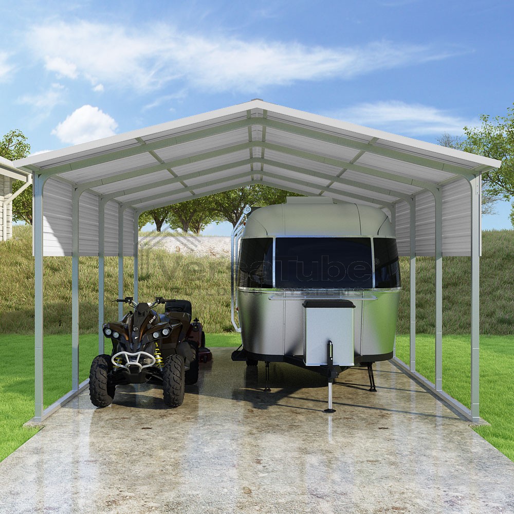 Pinnacle Series DIY carport kit features vertical sheet metal roof panels with ridge cap, gable and eave trim for an A-frame roof style and extended coverage on both ends.