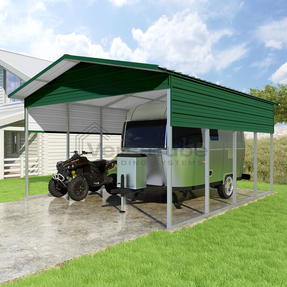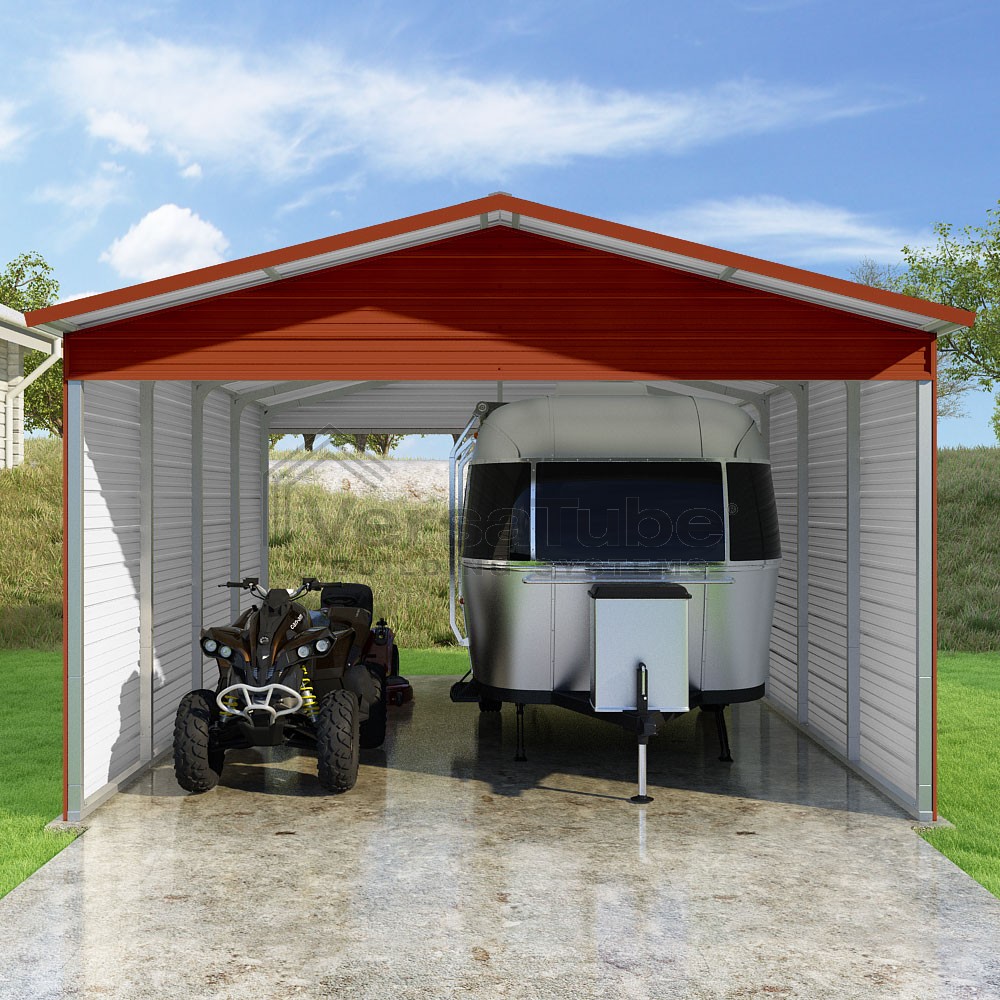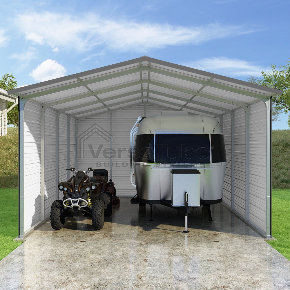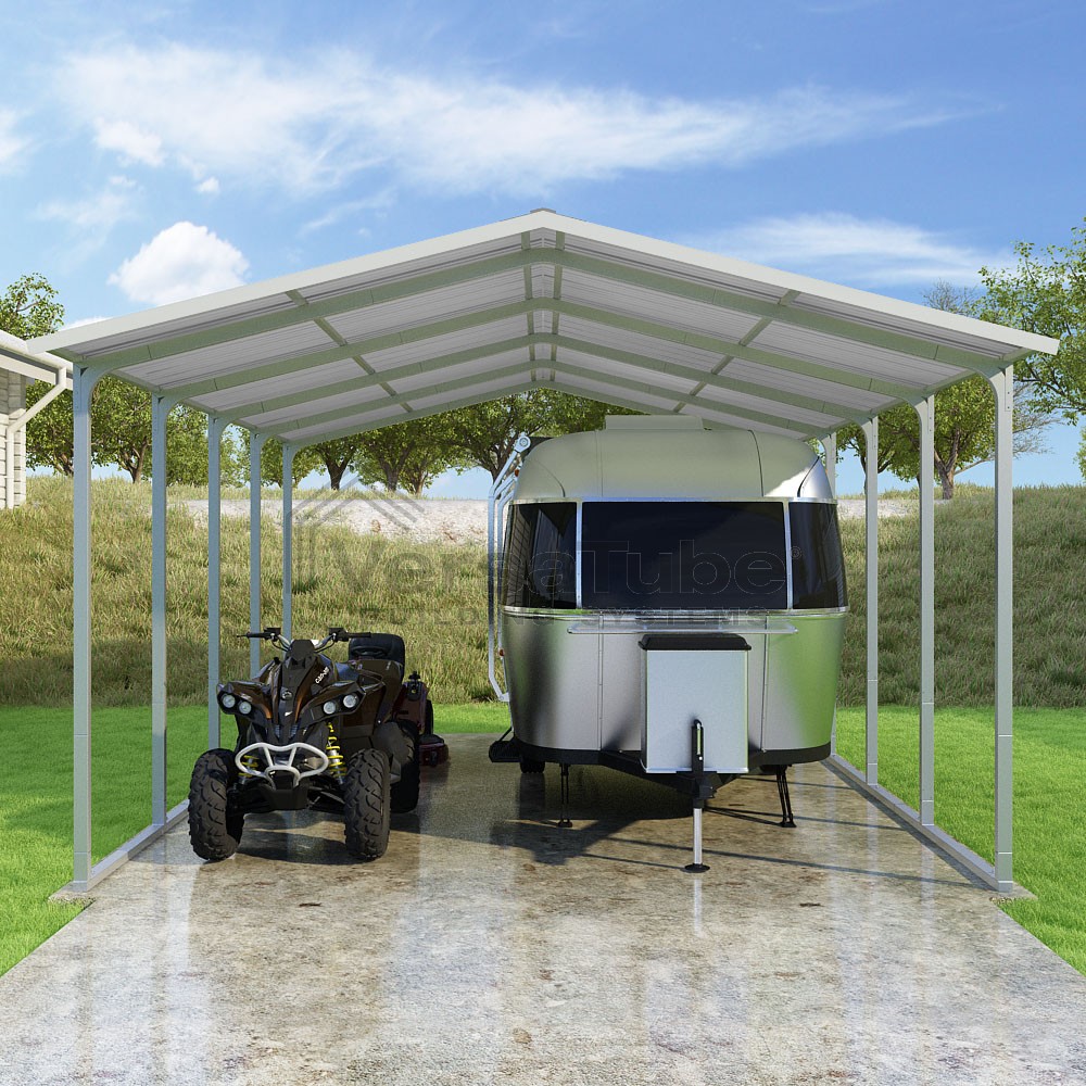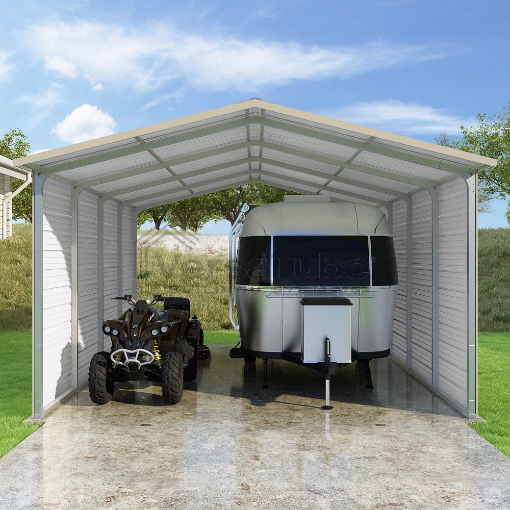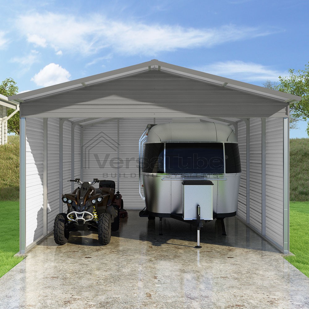 Pinnacle Series DIY carport kit features vertical sheet metal roof panels with ridge cap, gable and eave trim for an A-frame roof style and extended coverage on both ends.