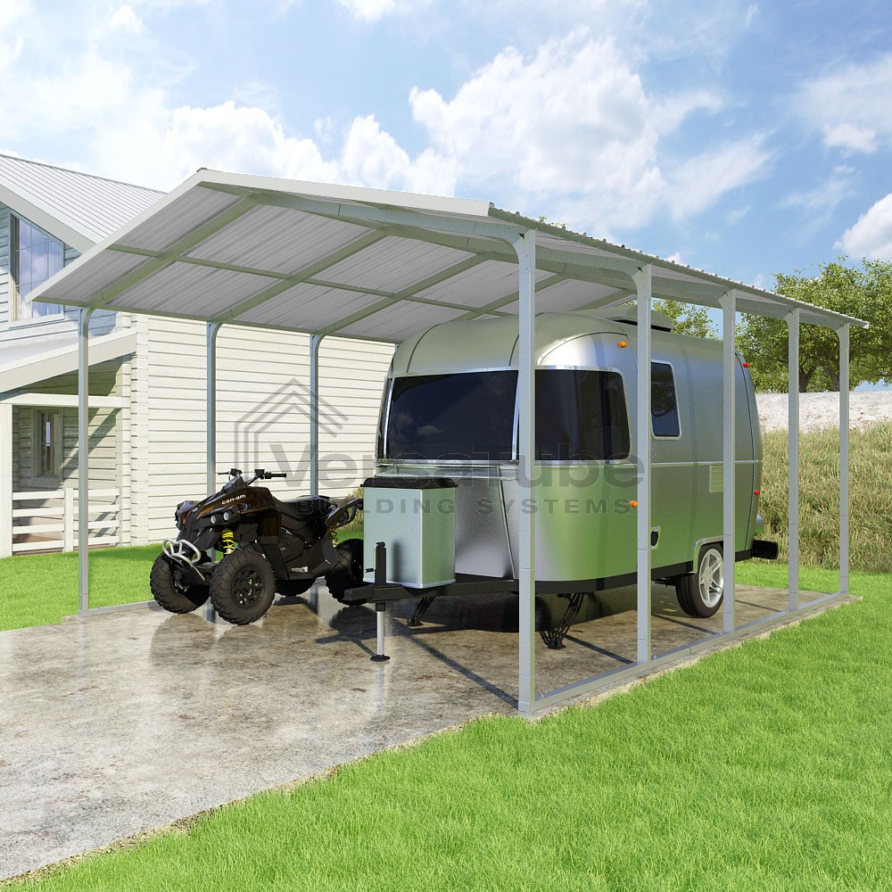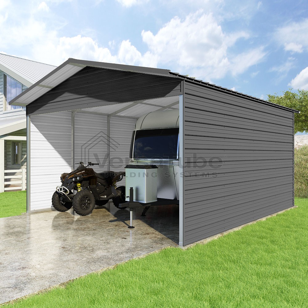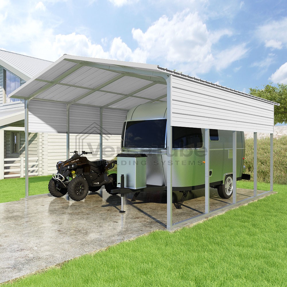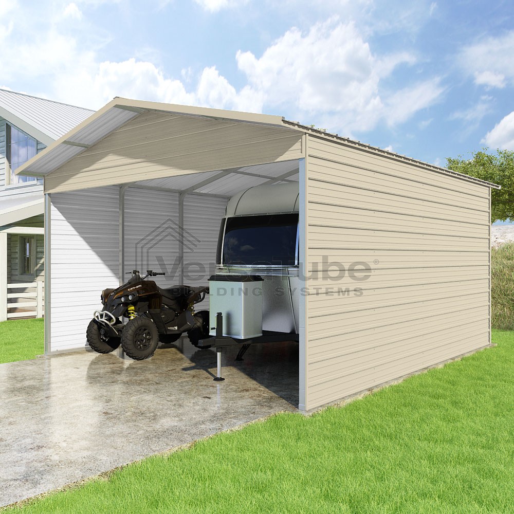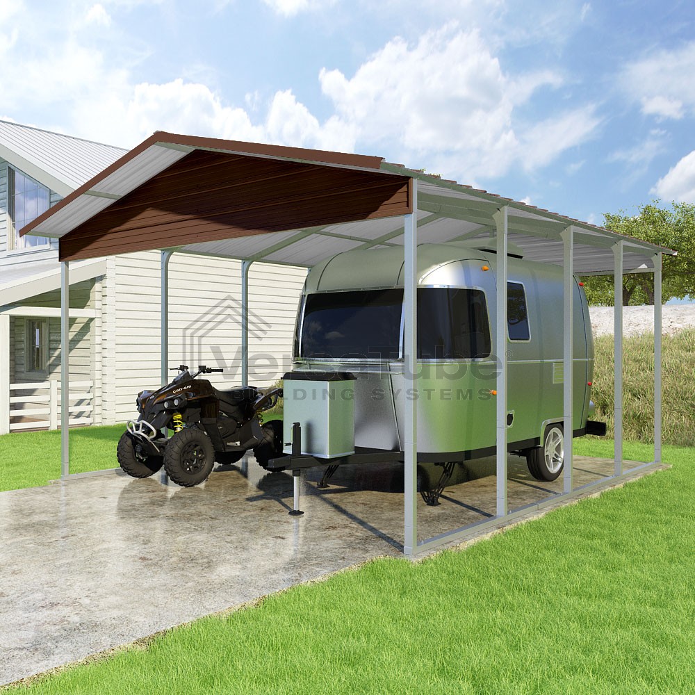 Pinnacle Series DIY carport kit features vertical sheet metal roof panels with ridge cap, gable and eave trim for an A-frame roof style and extended coverage on both ends.