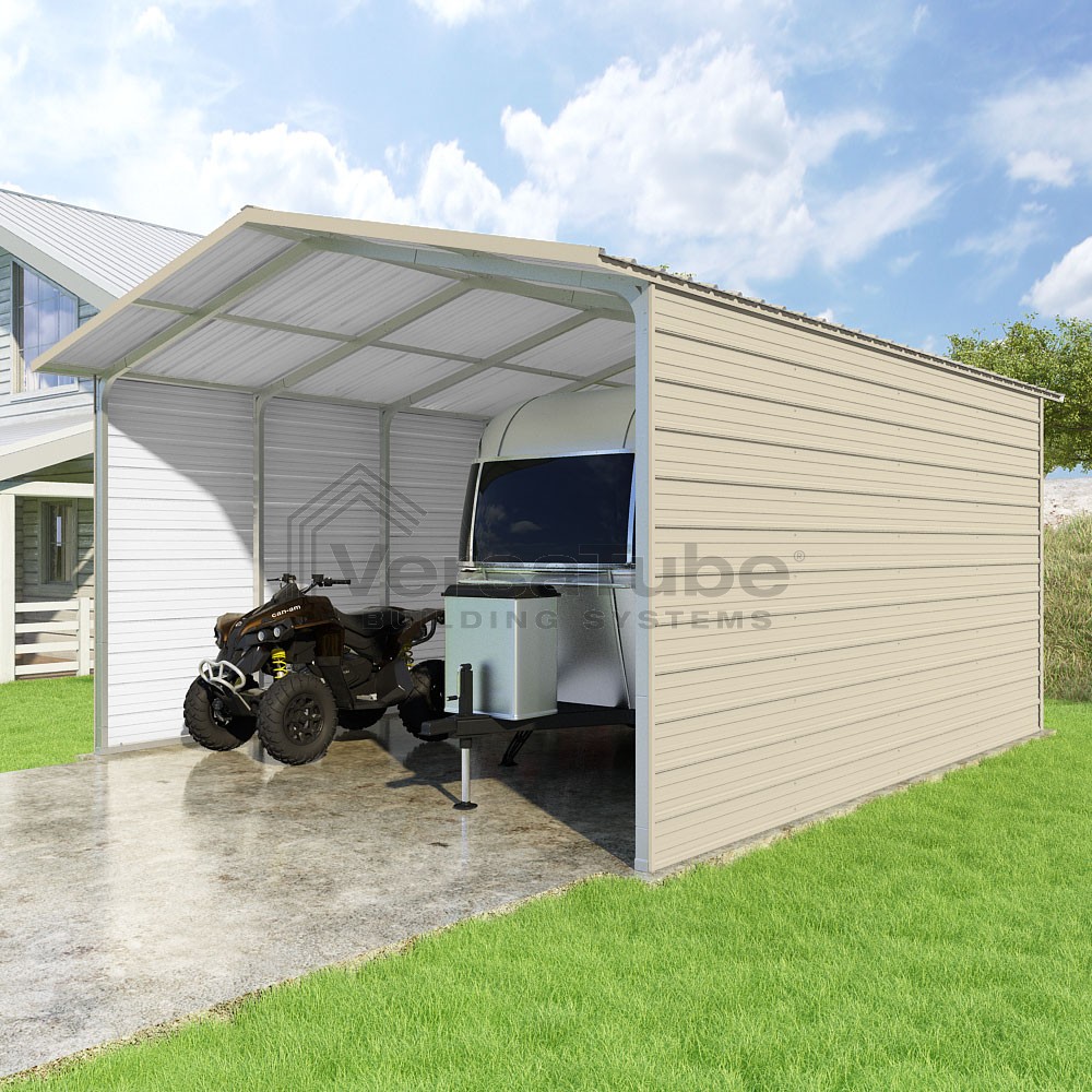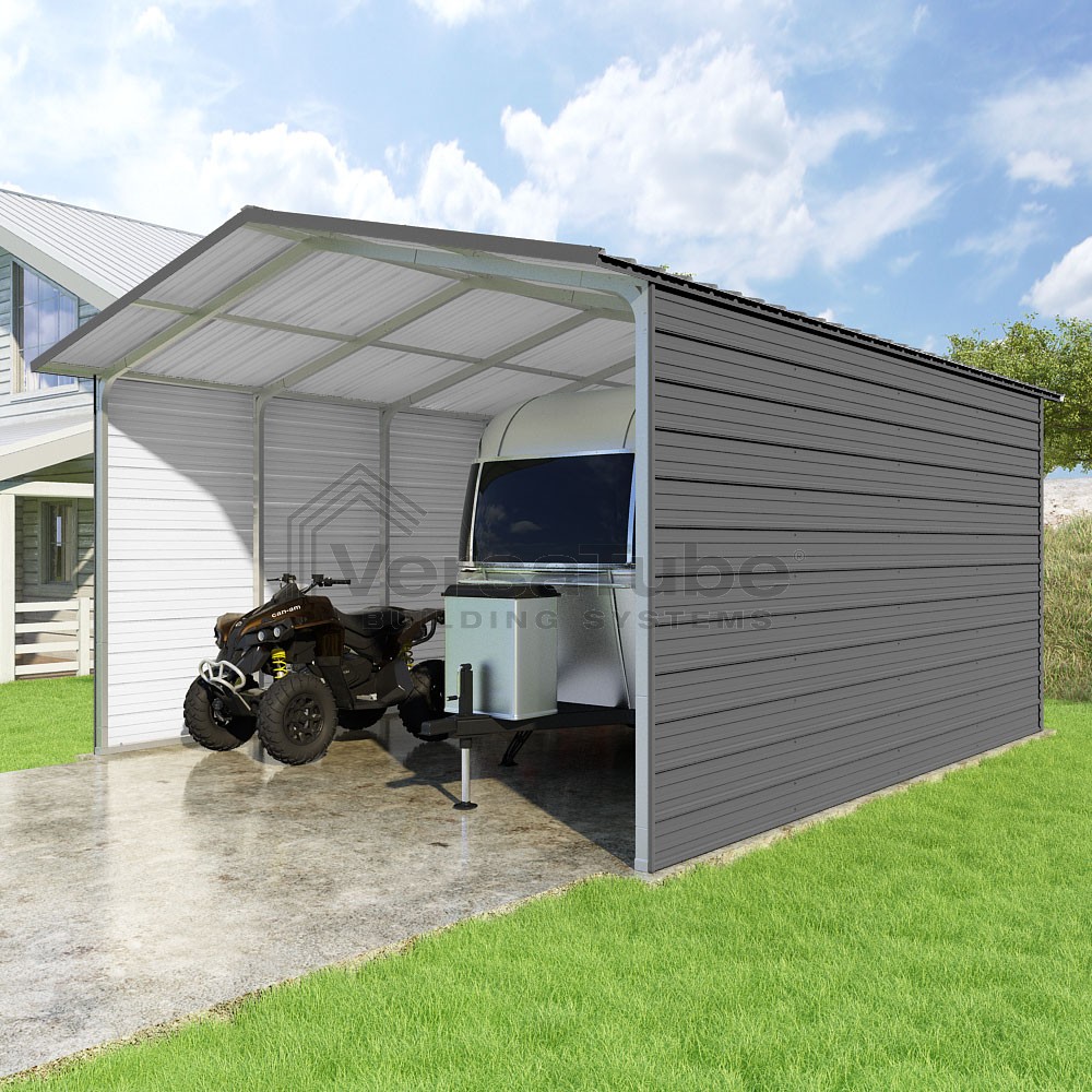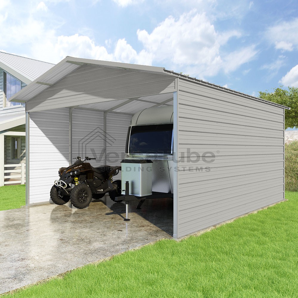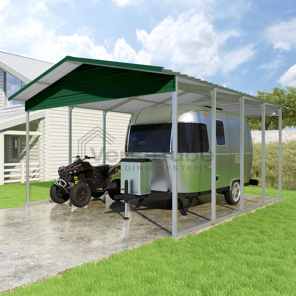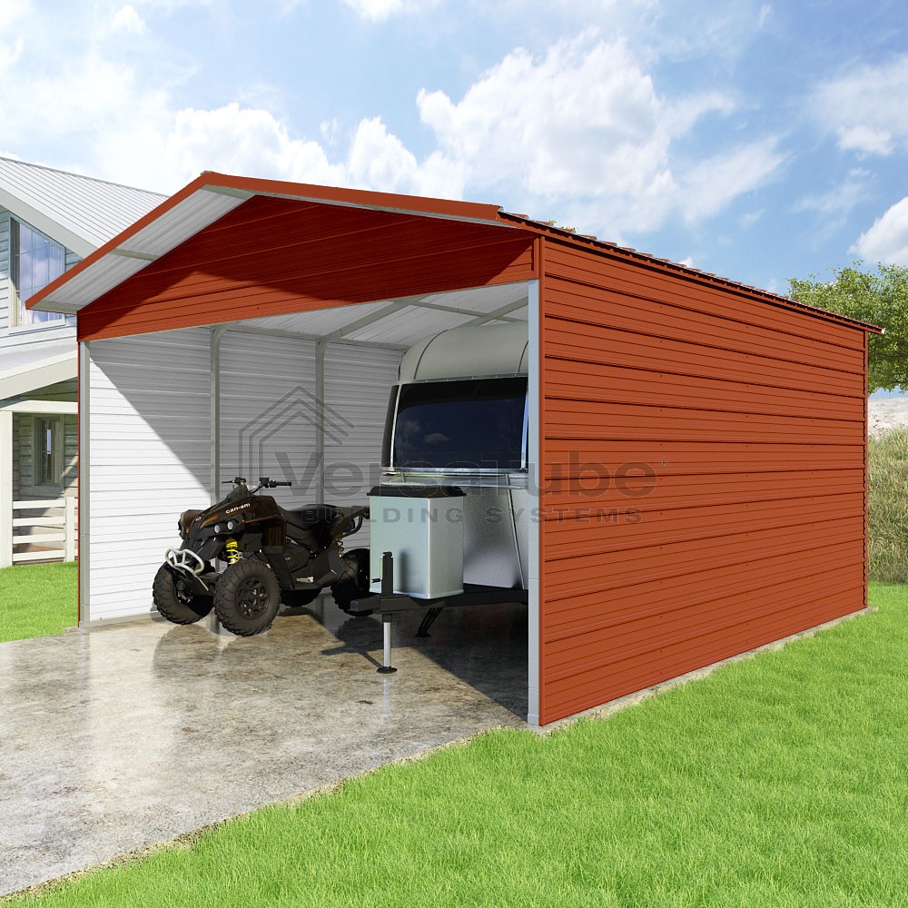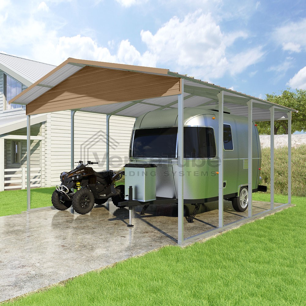 Pinnacle Series DIY carport kit features vertical sheet metal roof panels with ridge cap, gable and eave trim for an A-frame roof style and extended coverage on both ends.