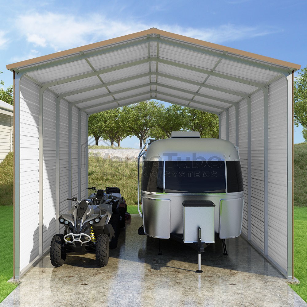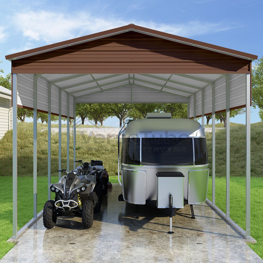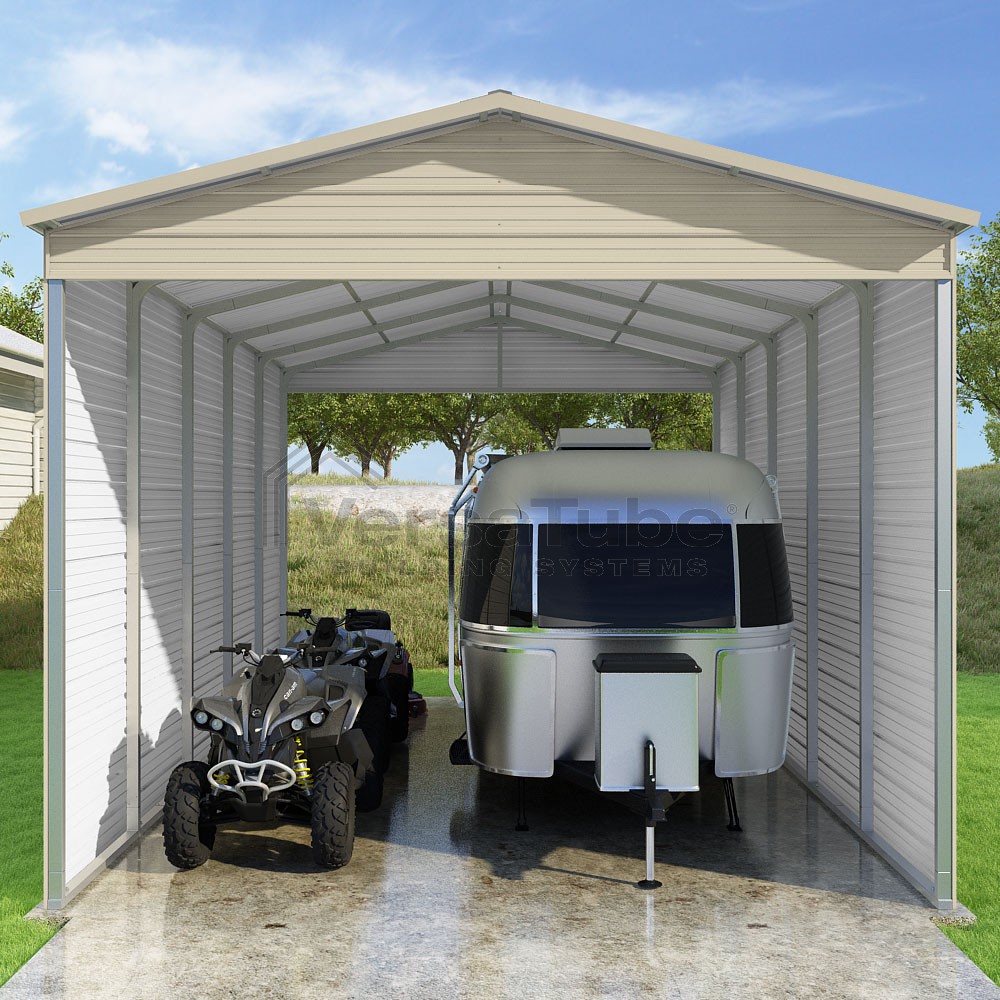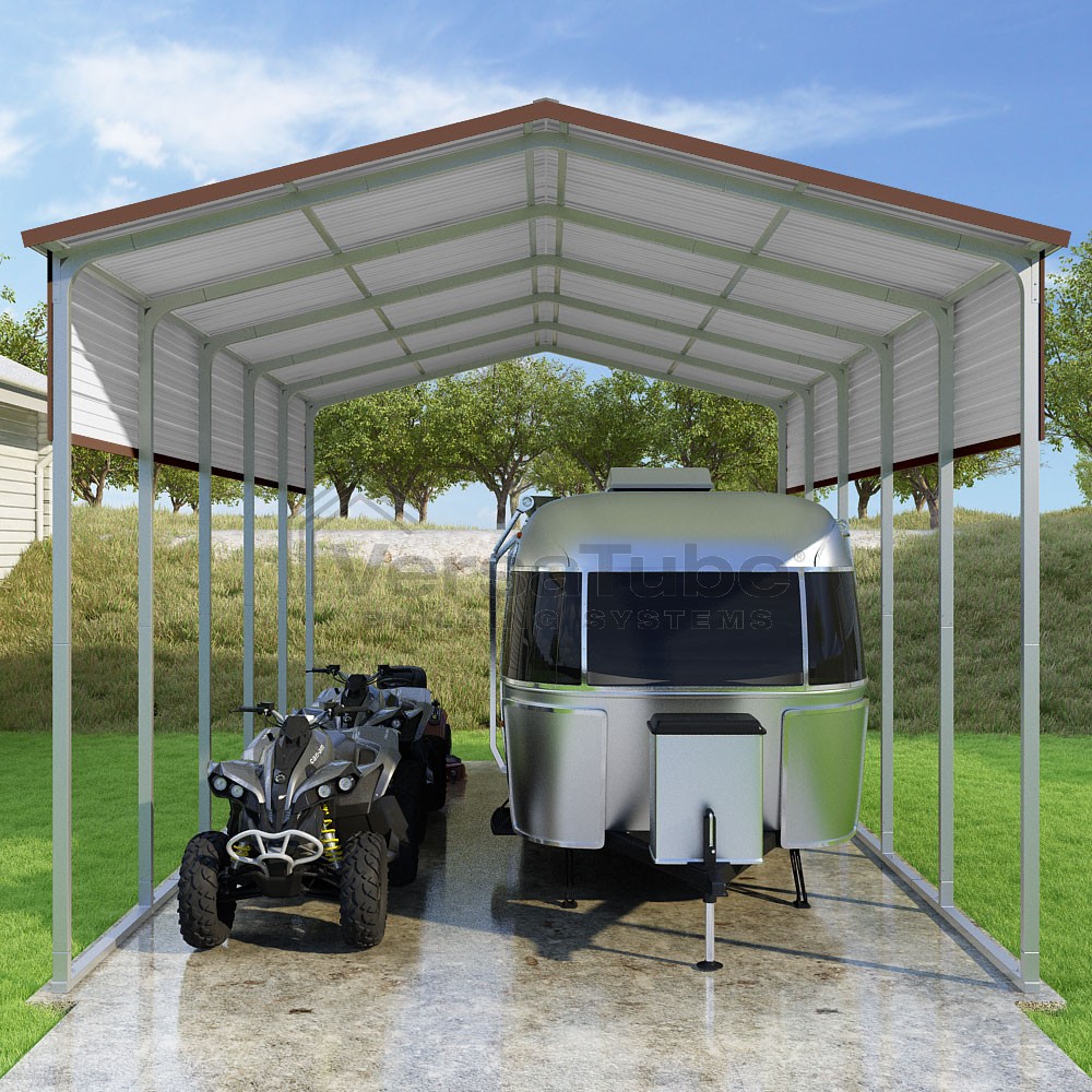 Pinnacle Series DIY carport kit features vertical sheet metal roof panels with ridge cap, gable and eave trim for an A-frame roof style and extended coverage on both ends.