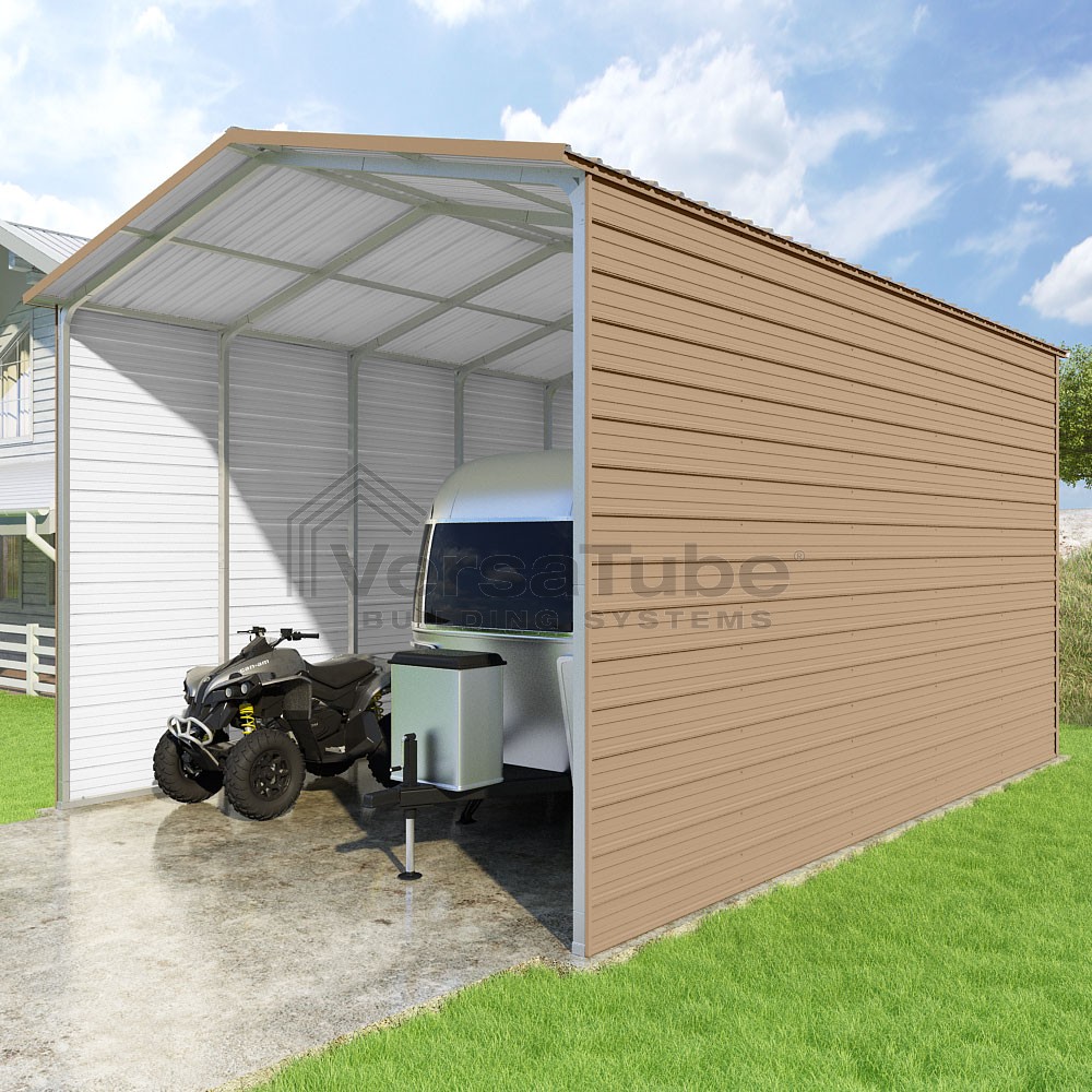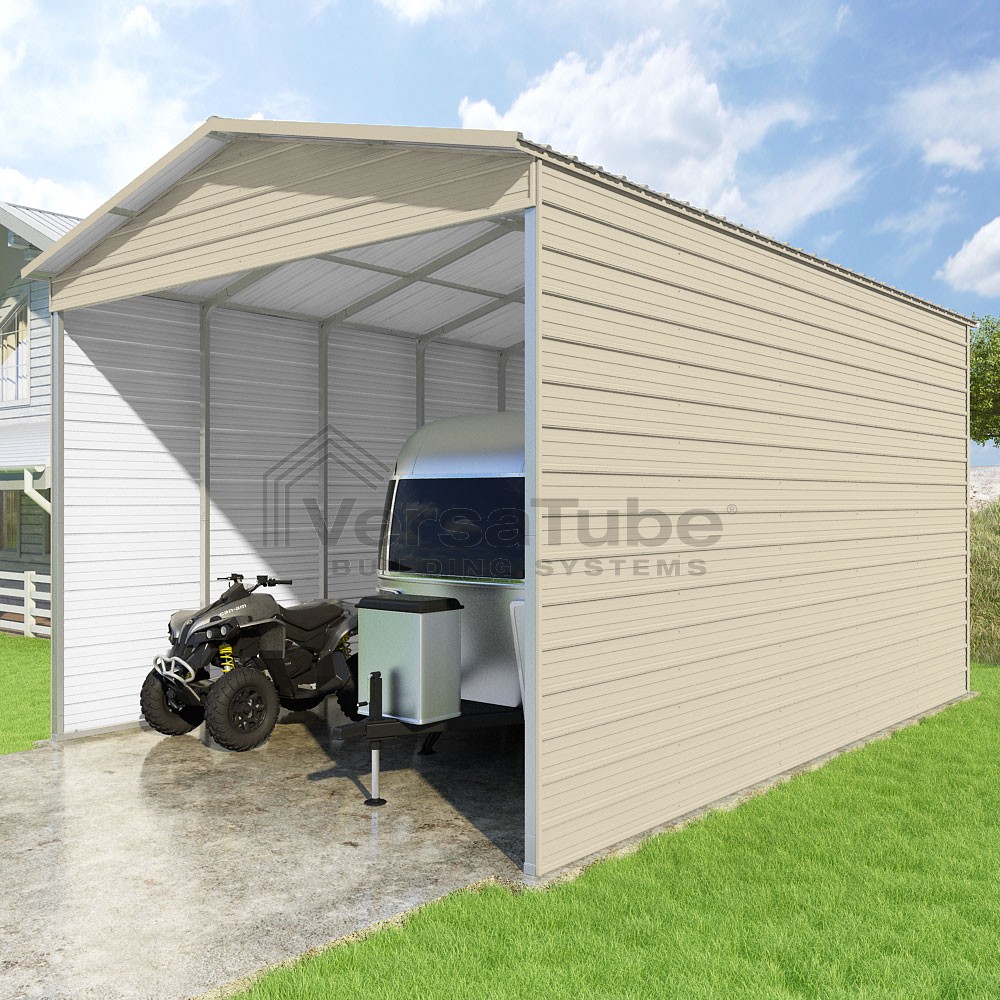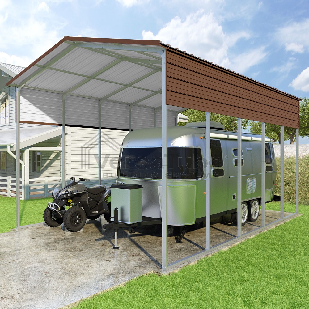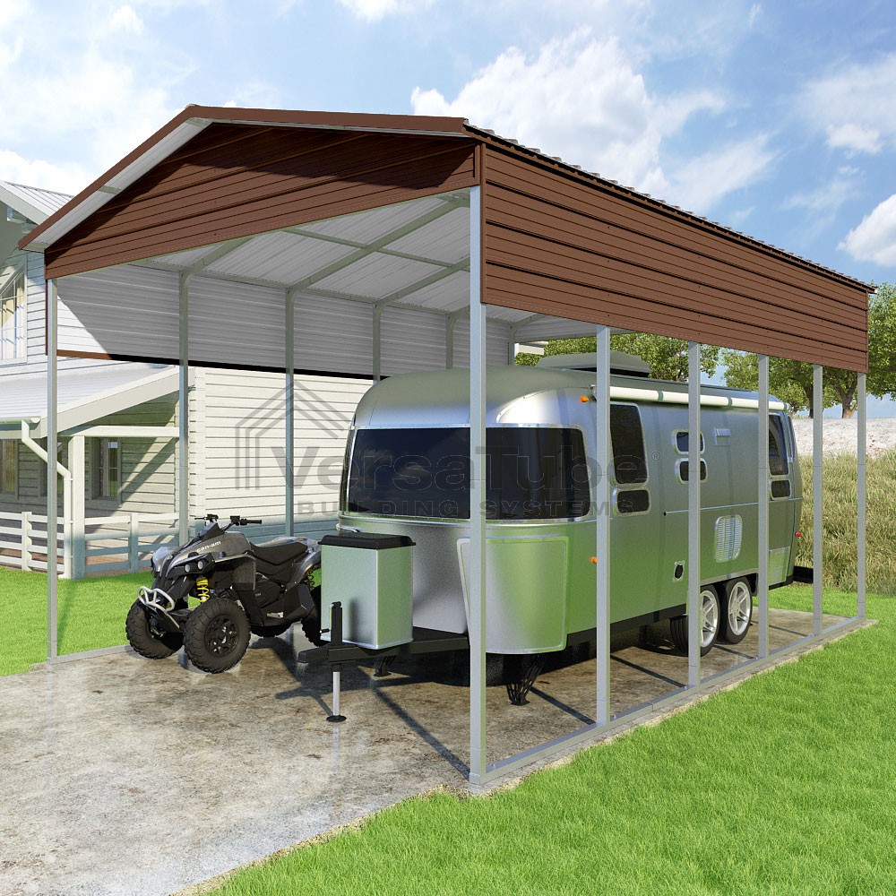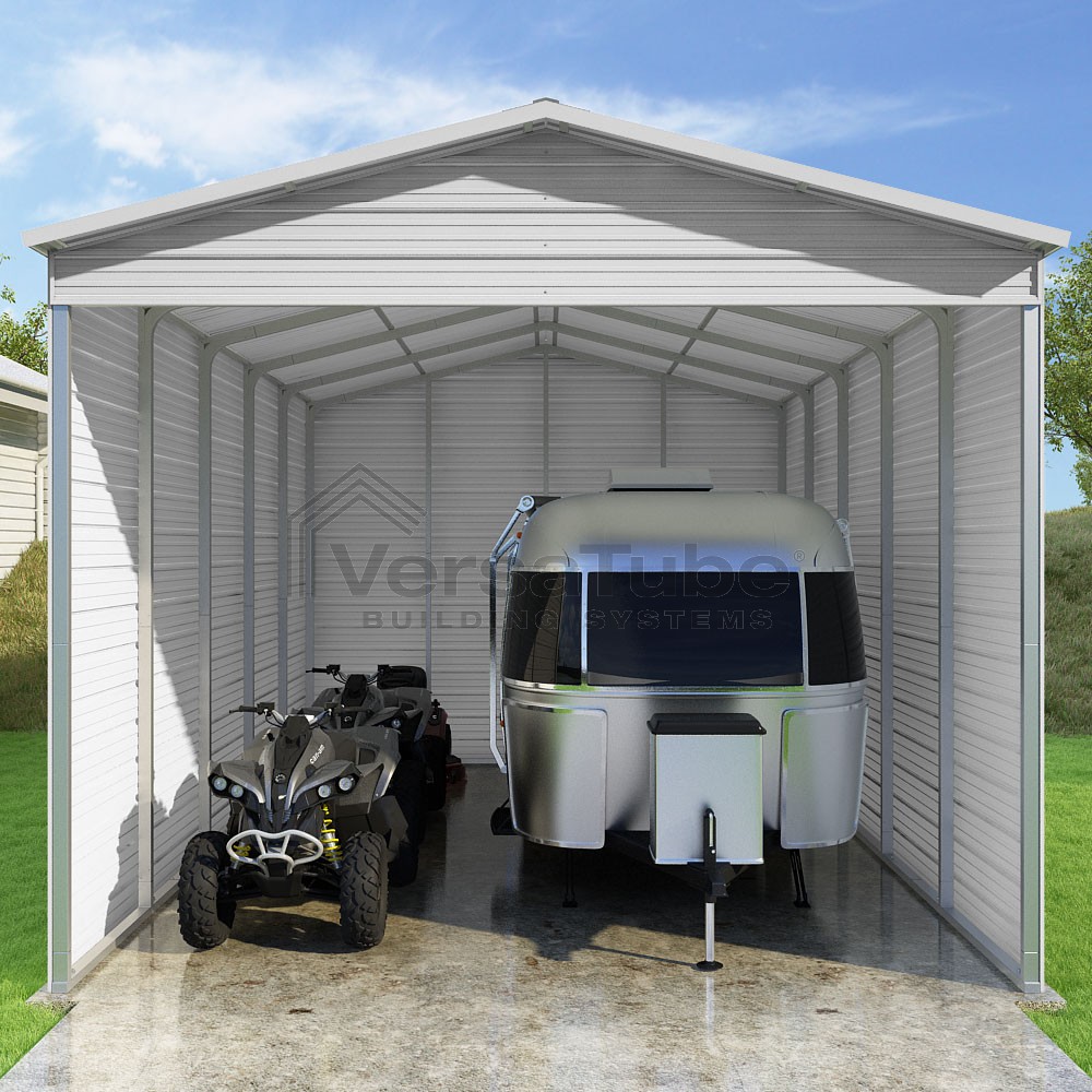 Pinnacle Series DIY carport kit features vertical sheet metal roof panels with ridge cap, gable and eave trim for an A-frame roof style and extended coverage on both ends.