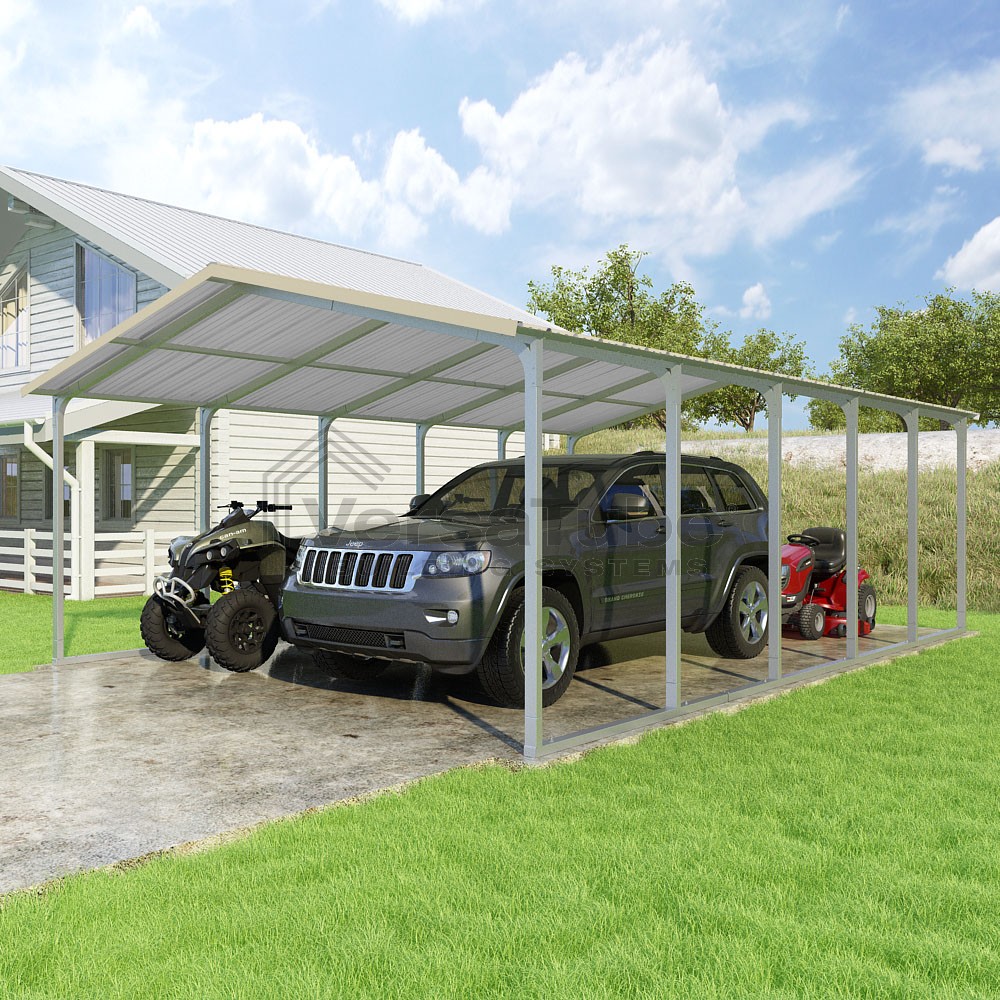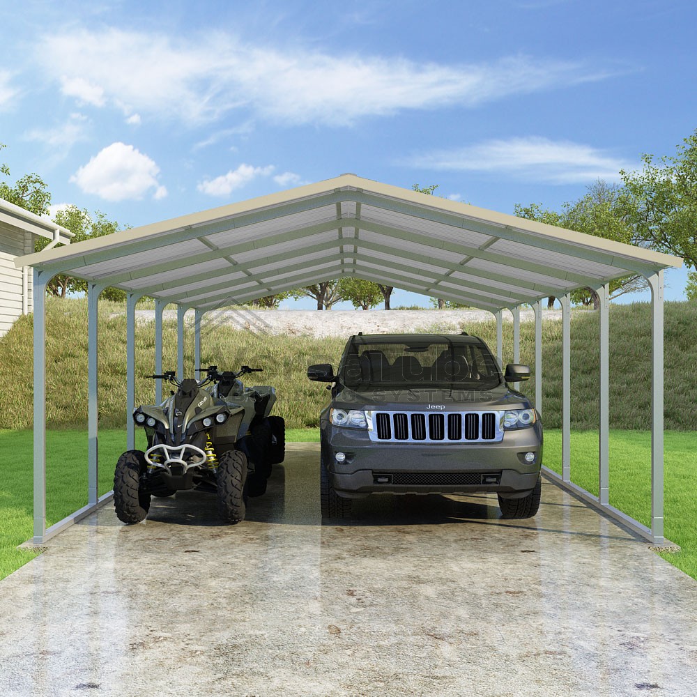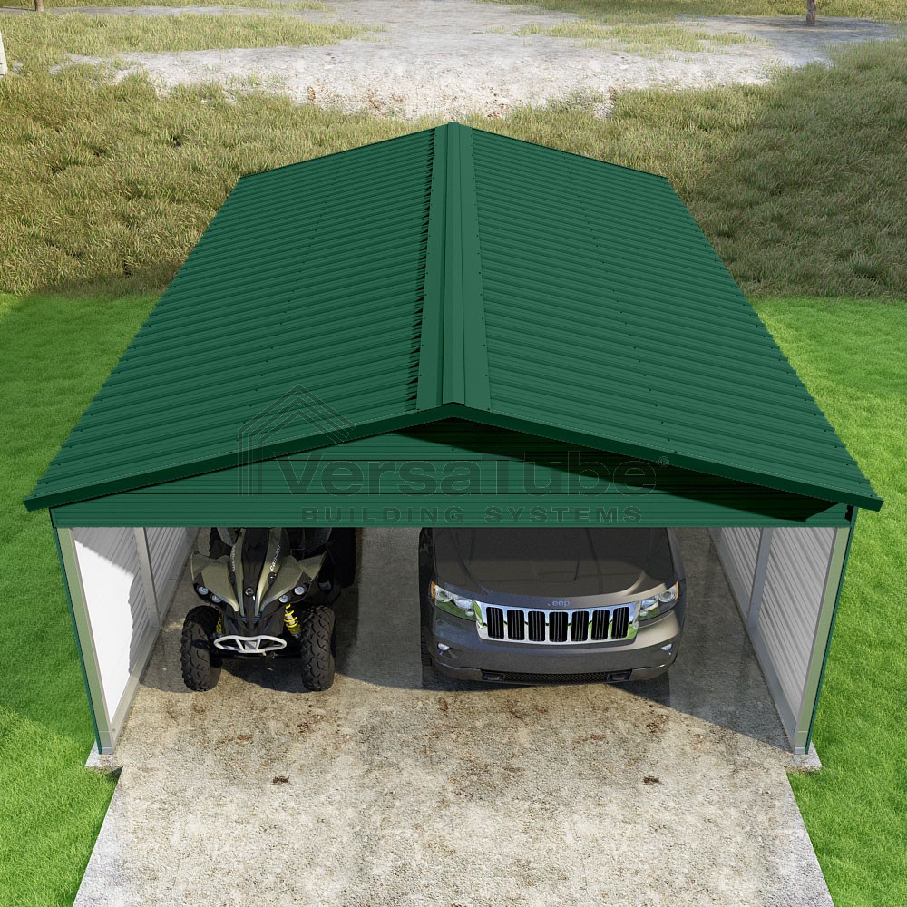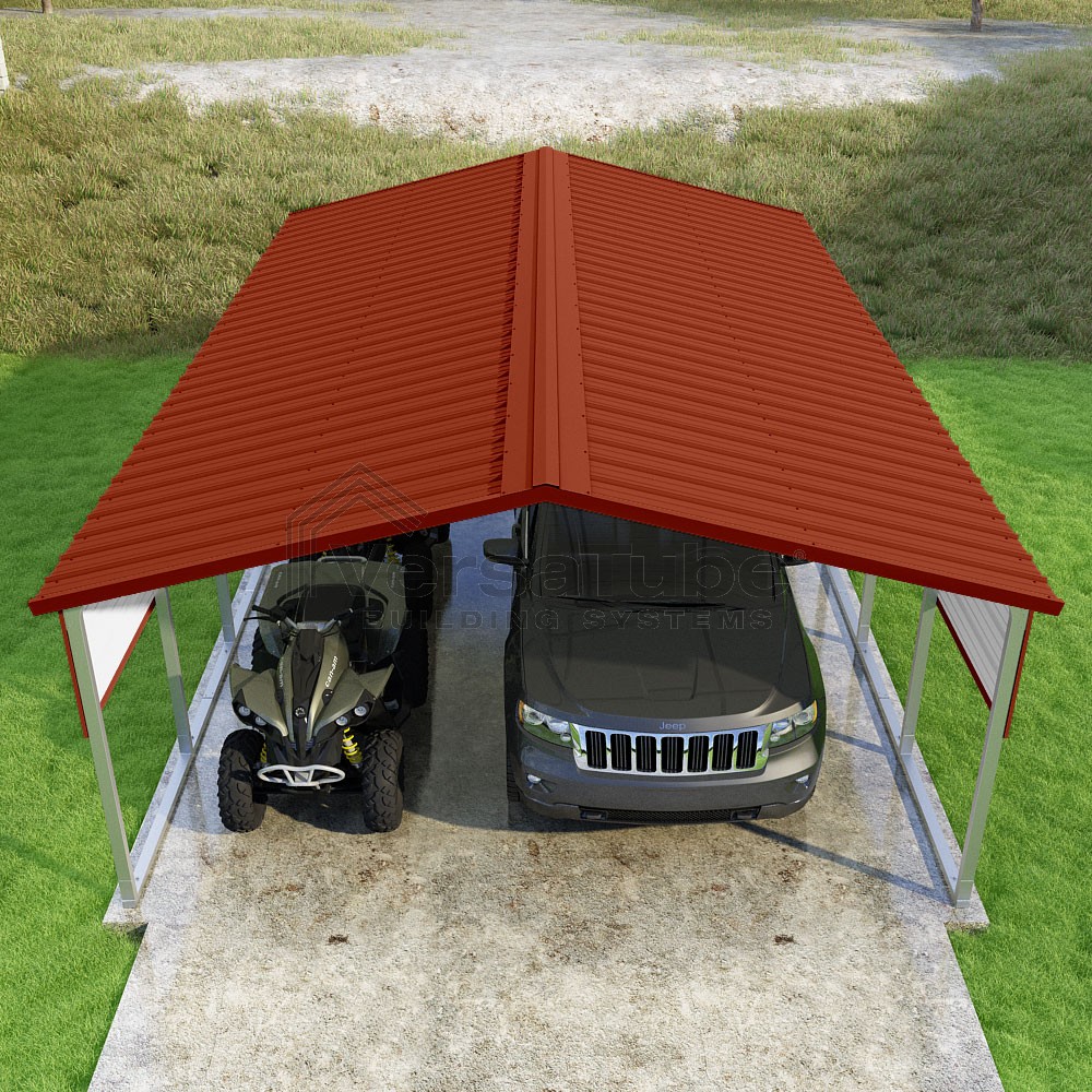 Pinnacle Series DIY carport kit features vertical sheet metal roof panels with ridge cap, gable and eave trim for an A-frame roof style and extended coverage on both ends.