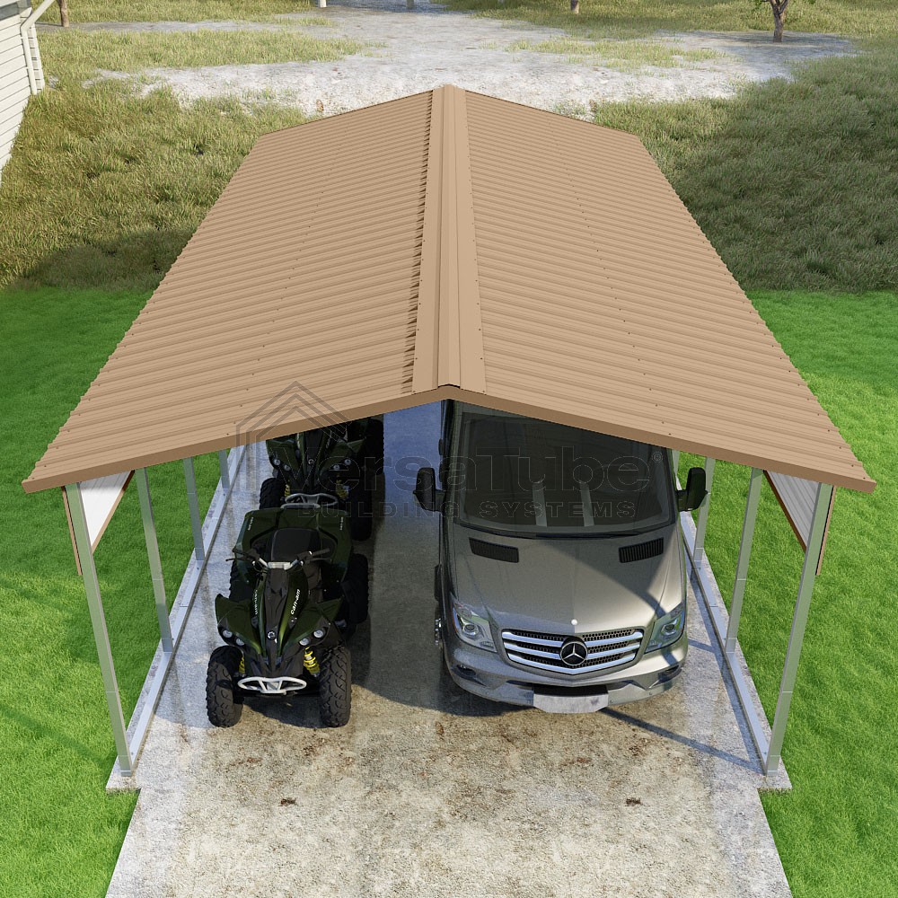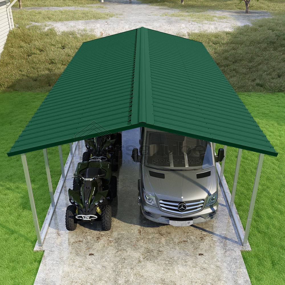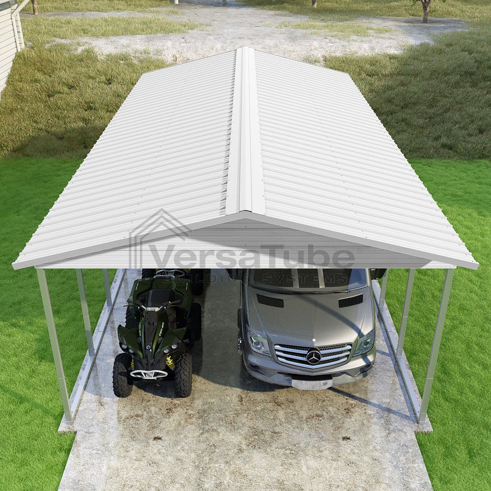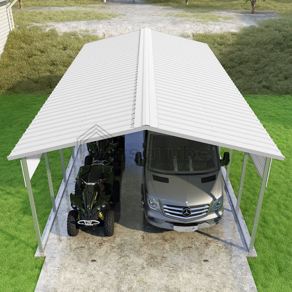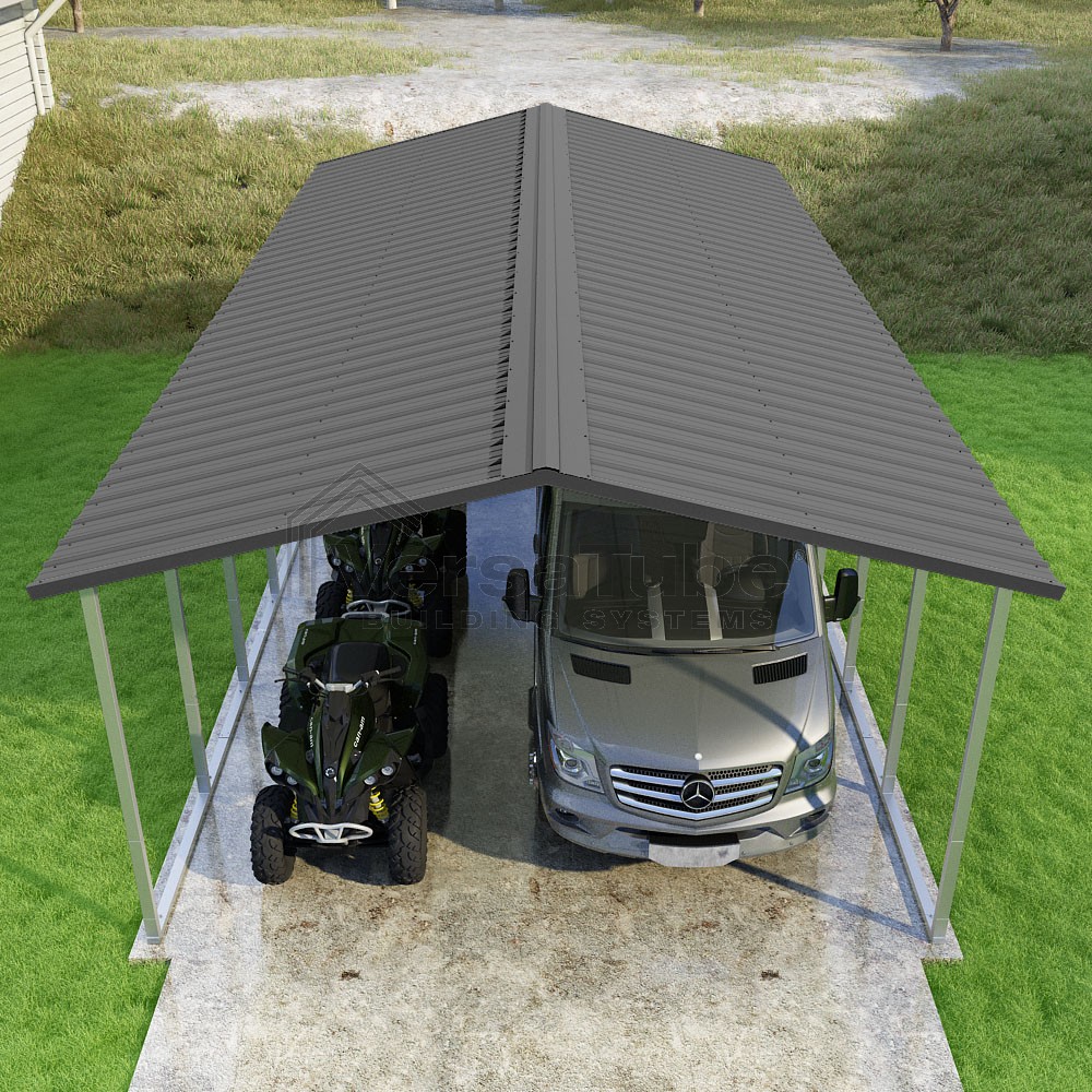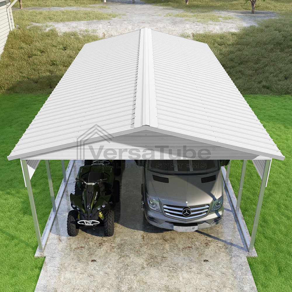 Pinnacle Series DIY carport kit features vertical sheet metal roof panels with ridge cap, gable and eave trim for an A-frame roof style and extended coverage on both ends.
