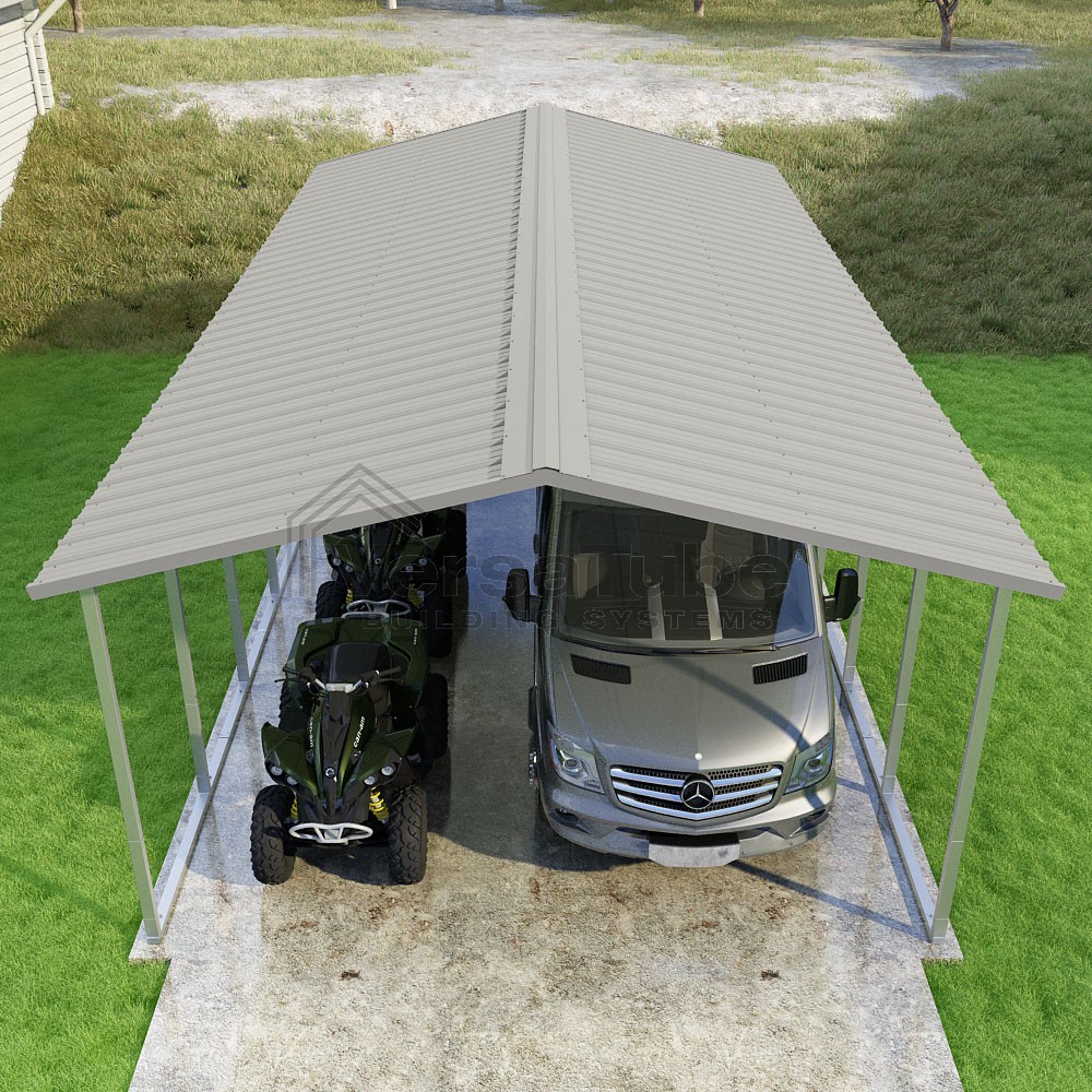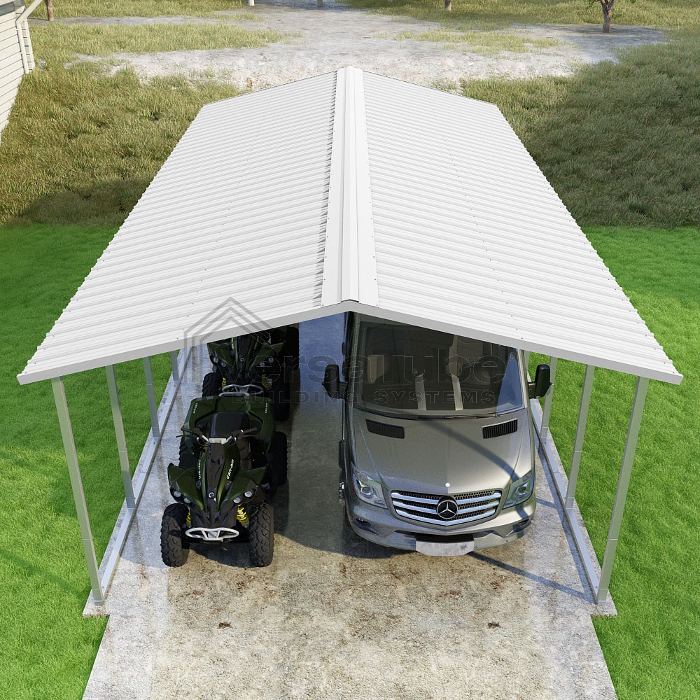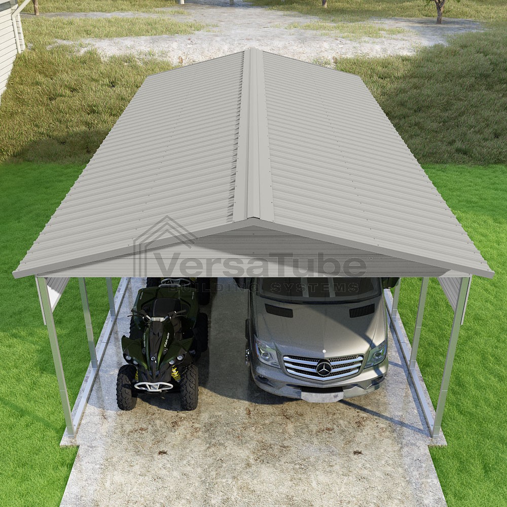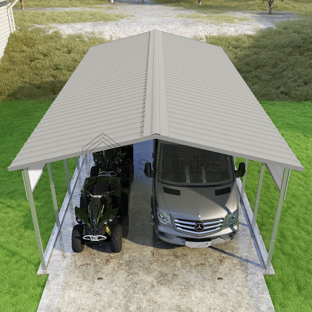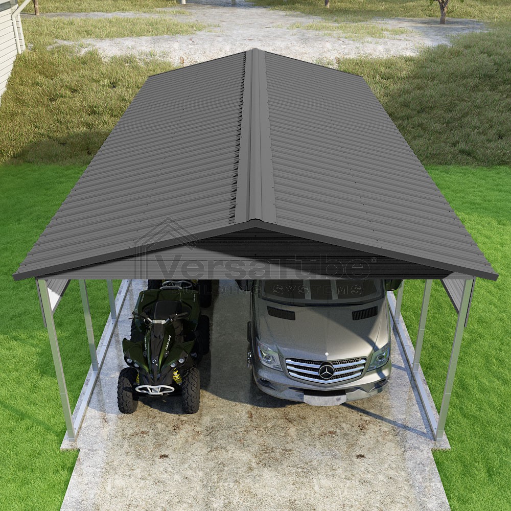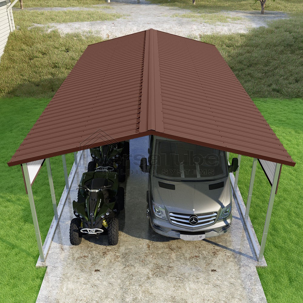 Pinnacle Series DIY carport kit features vertical sheet metal roof panels with ridge cap, gable and eave trim for an A-frame roof style and extended coverage on both ends.