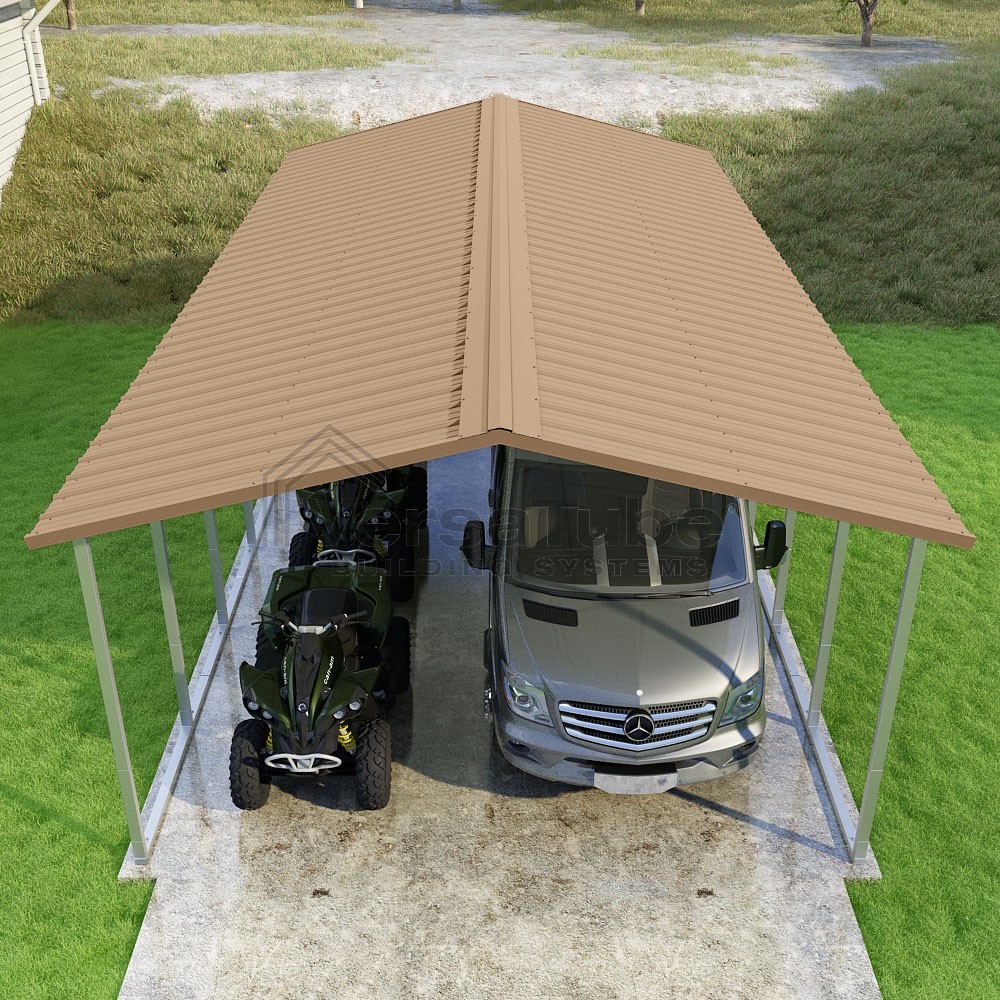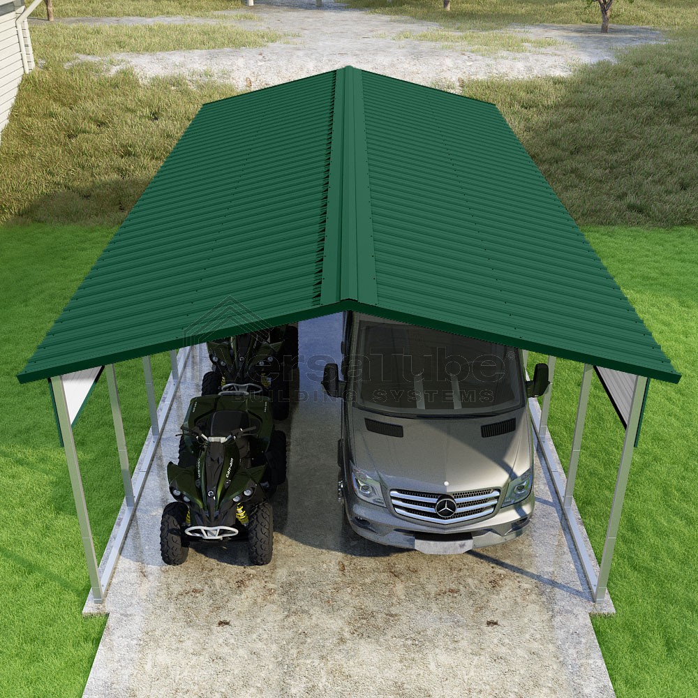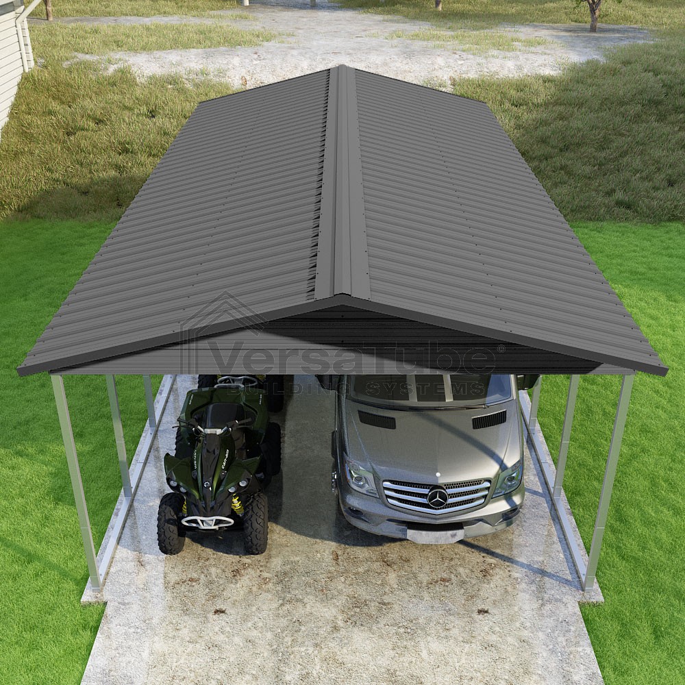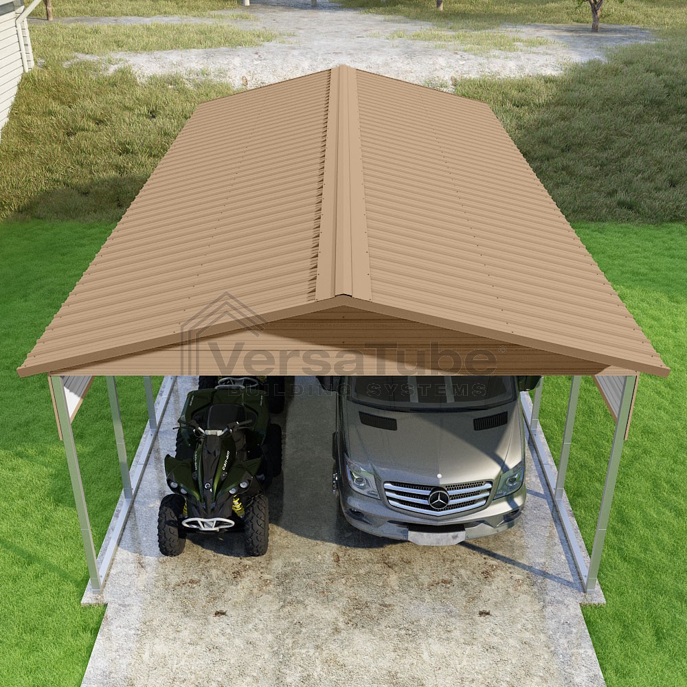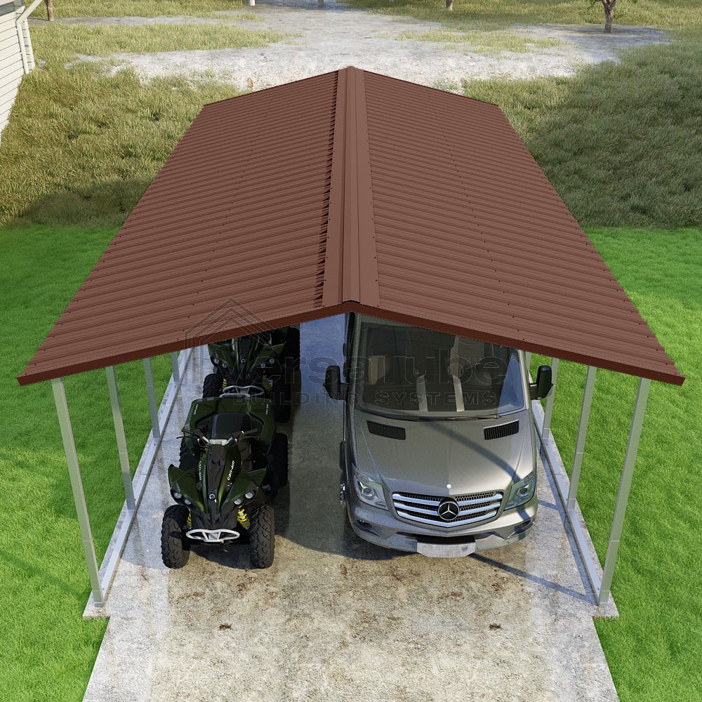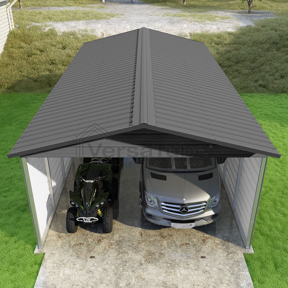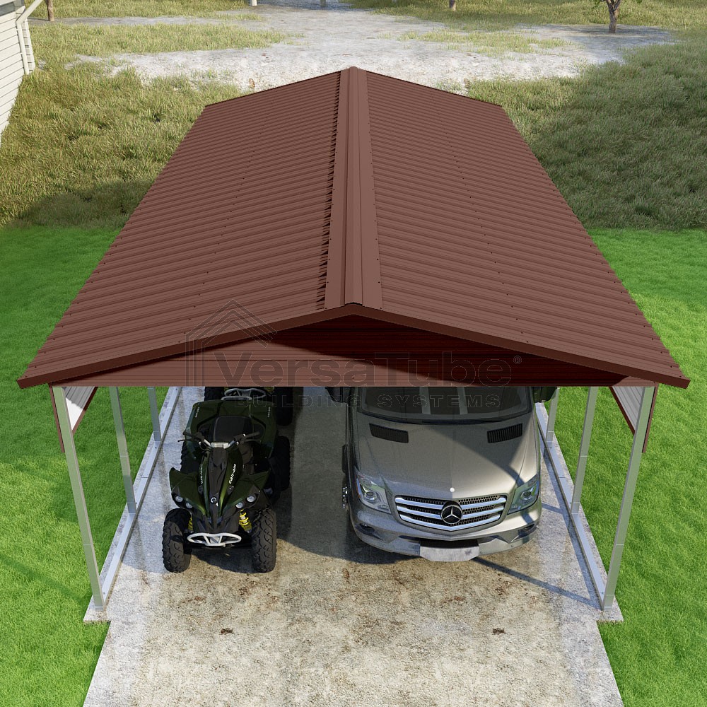Pinnacle Series DIY carport kit features vertical sheet metal roof panels with ridge cap, gable and eave trim for an A-frame roof style and extended coverage on both ends.
