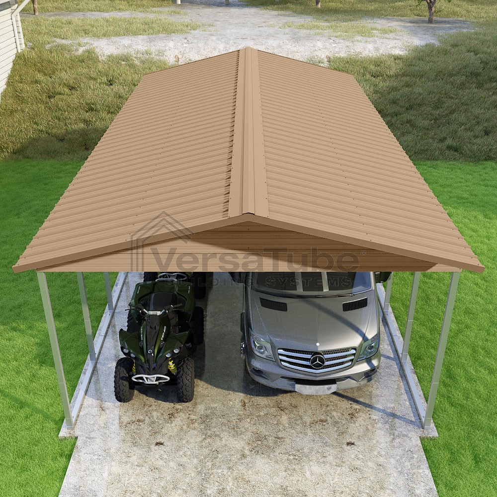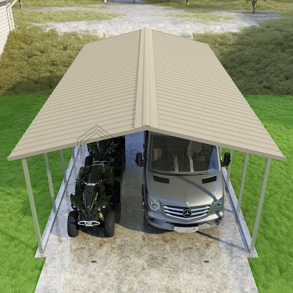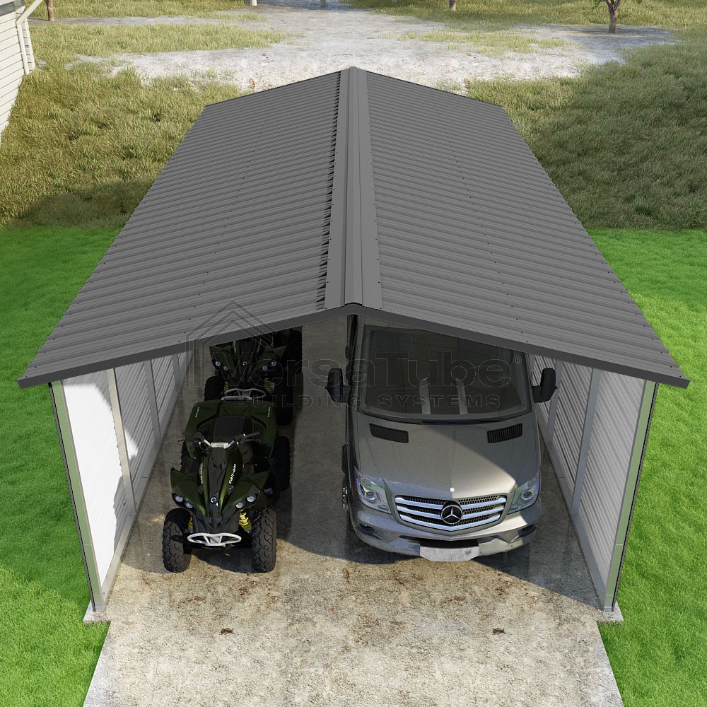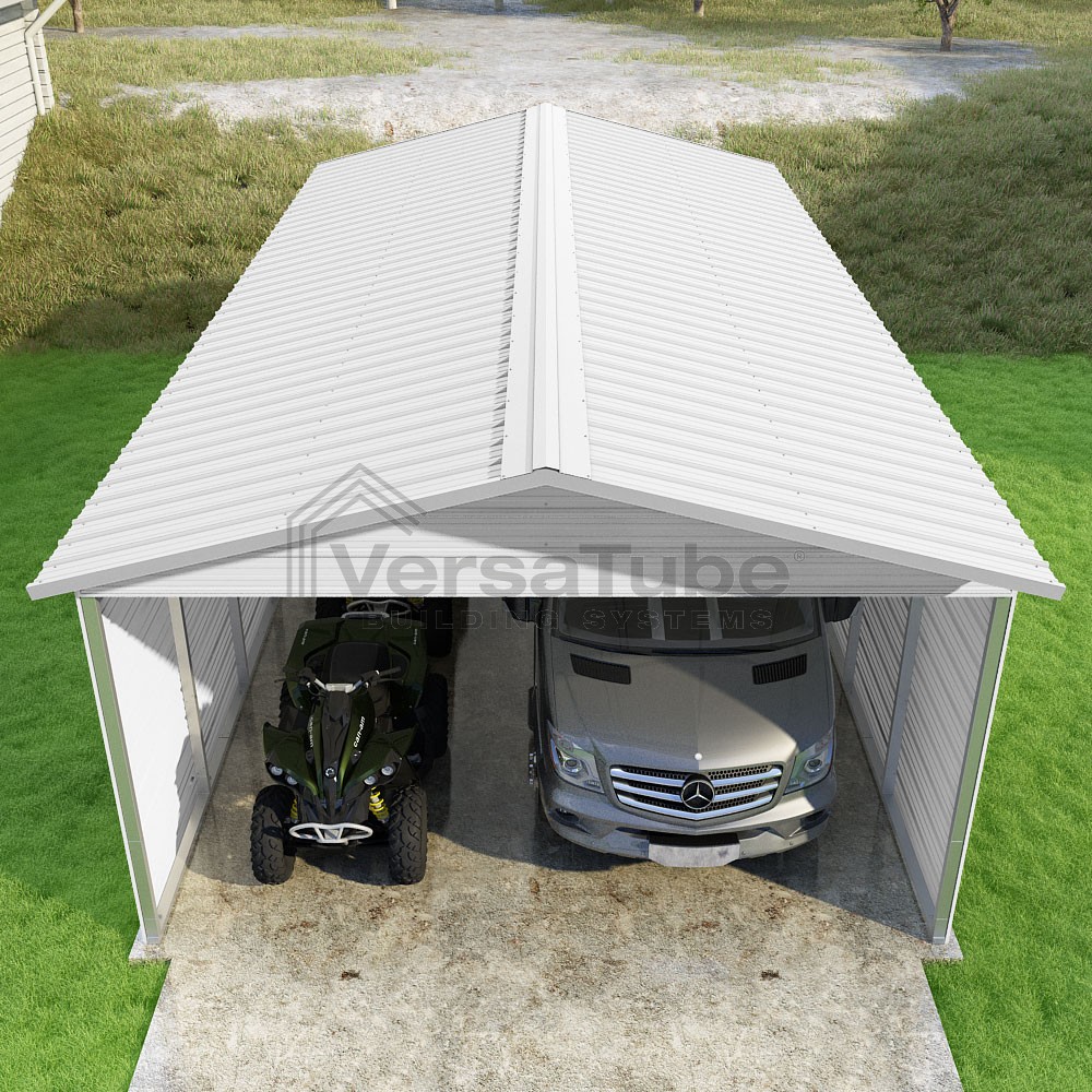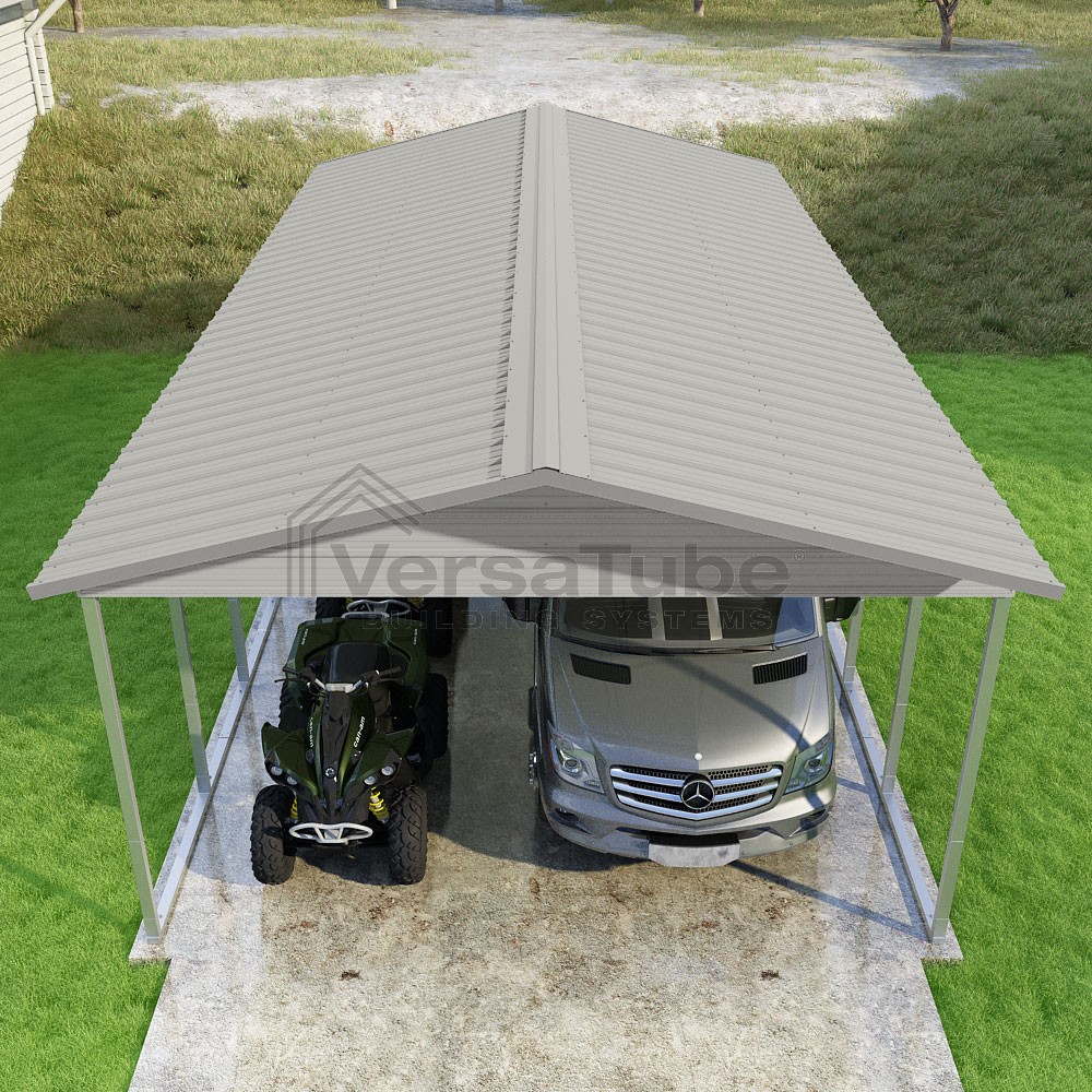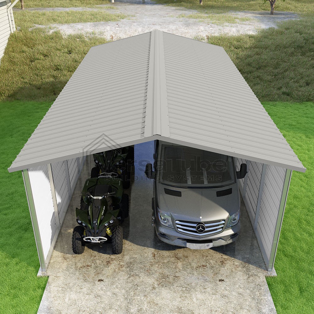Pinnacle Series DIY carport kit features vertical sheet metal roof panels with ridge cap, gable and eave trim for an A-frame roof style and extended coverage on both ends.