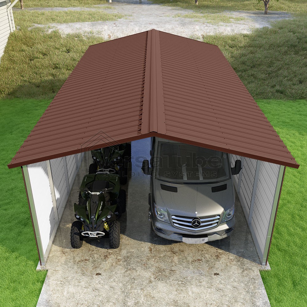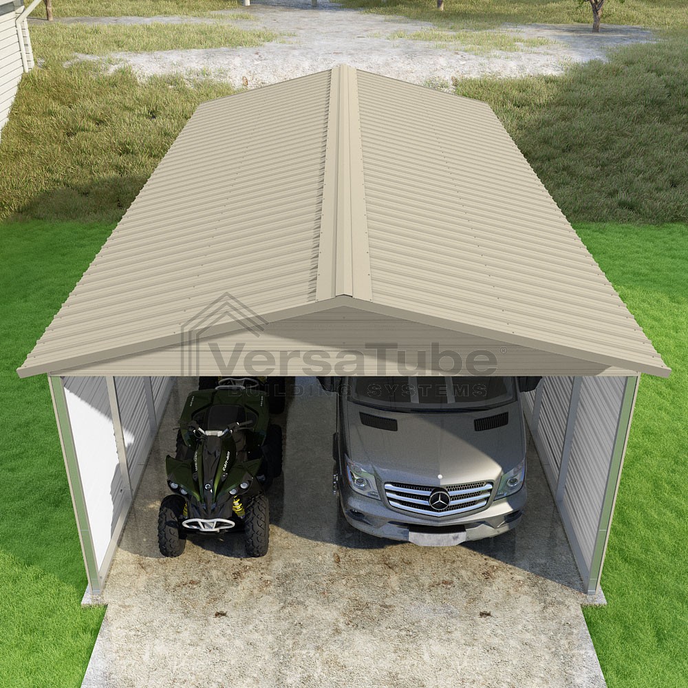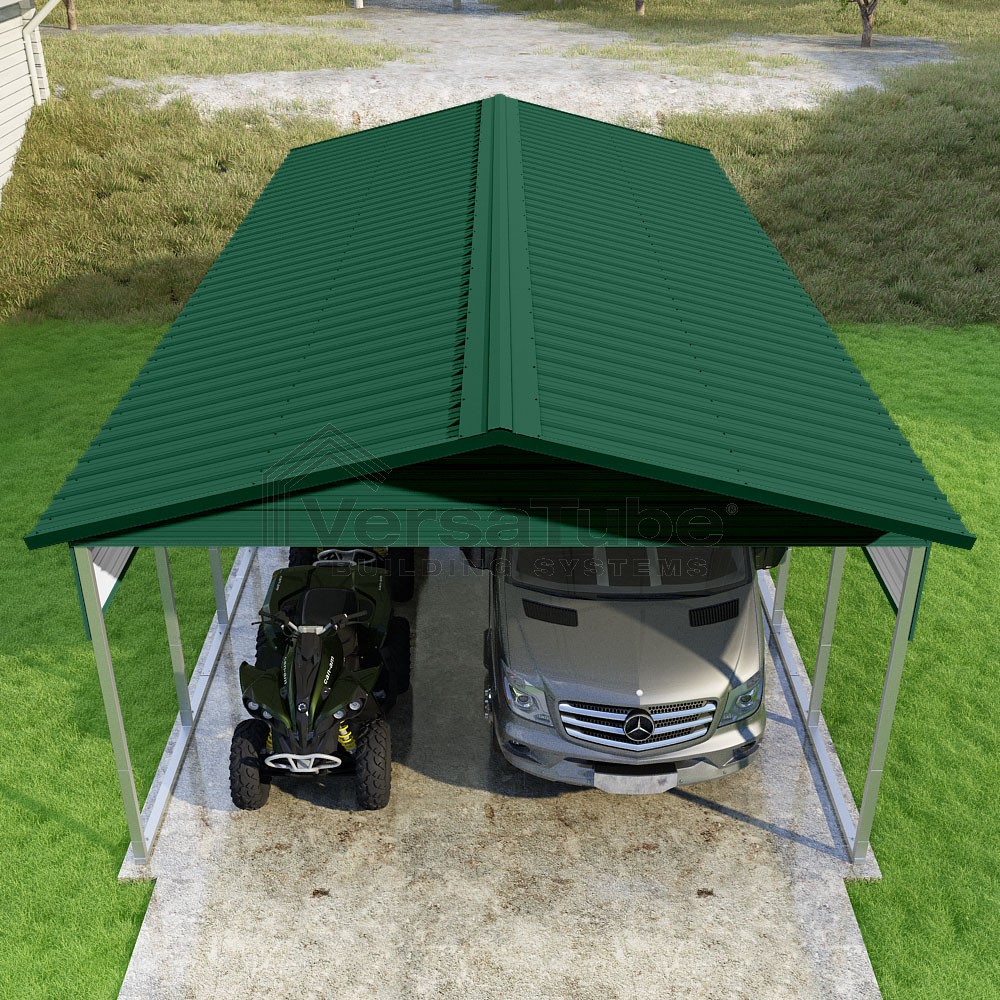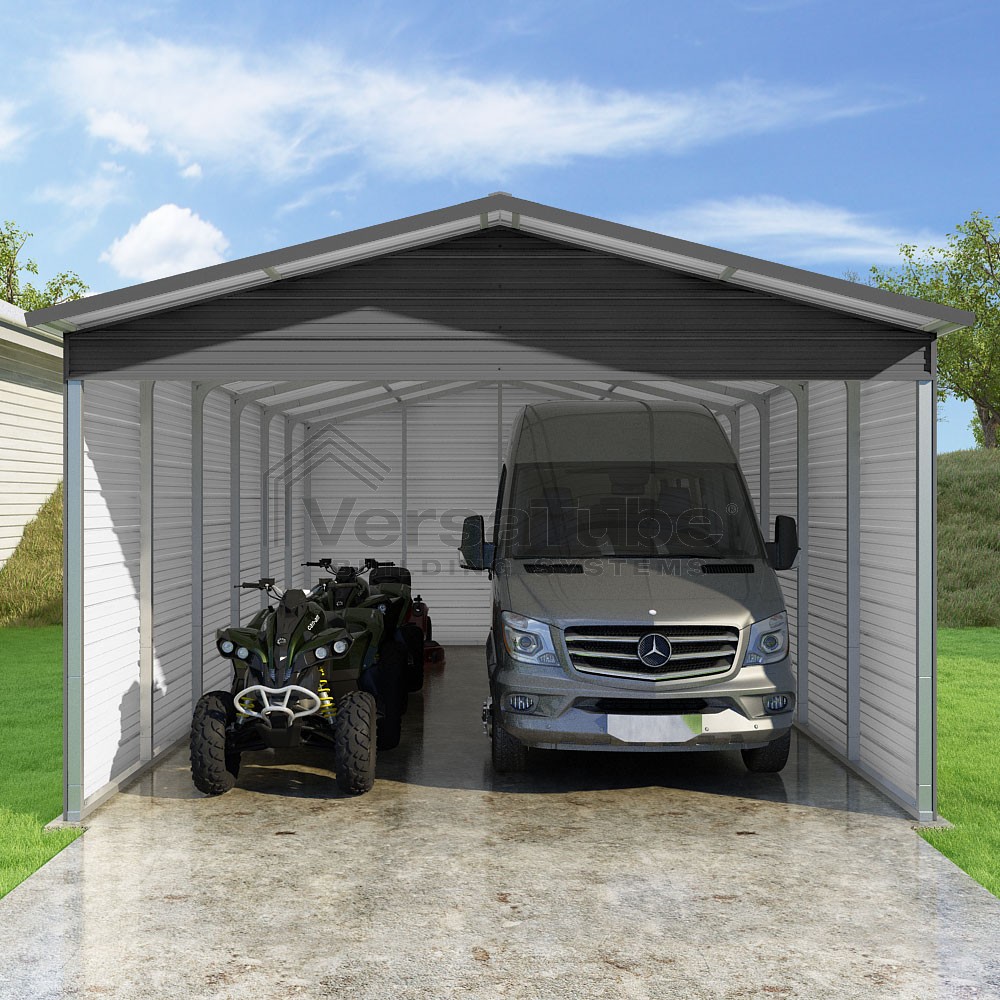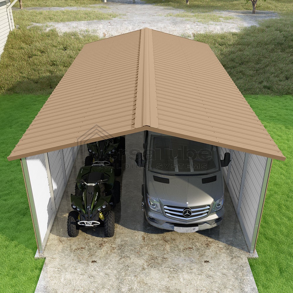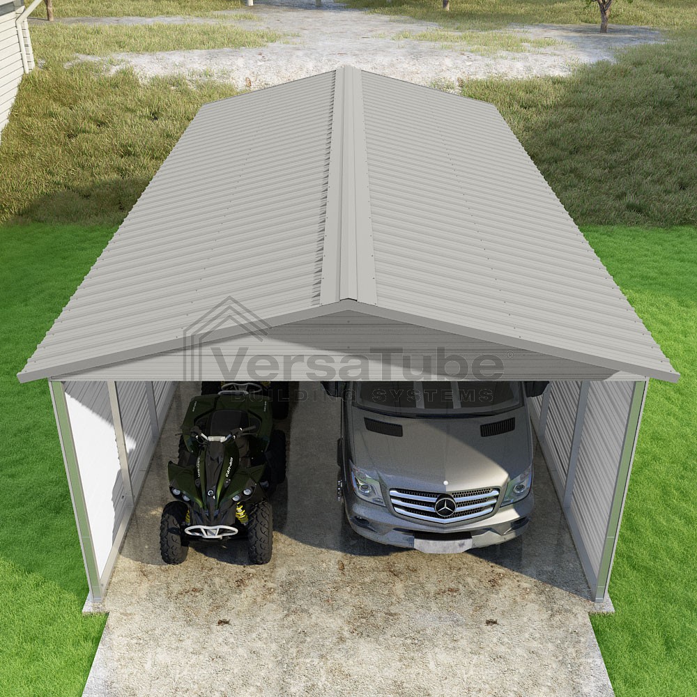 Pinnacle Series DIY carport kit features vertical sheet metal roof panels with ridge cap, gable and eave trim for an A-frame roof style and extended coverage on both ends.