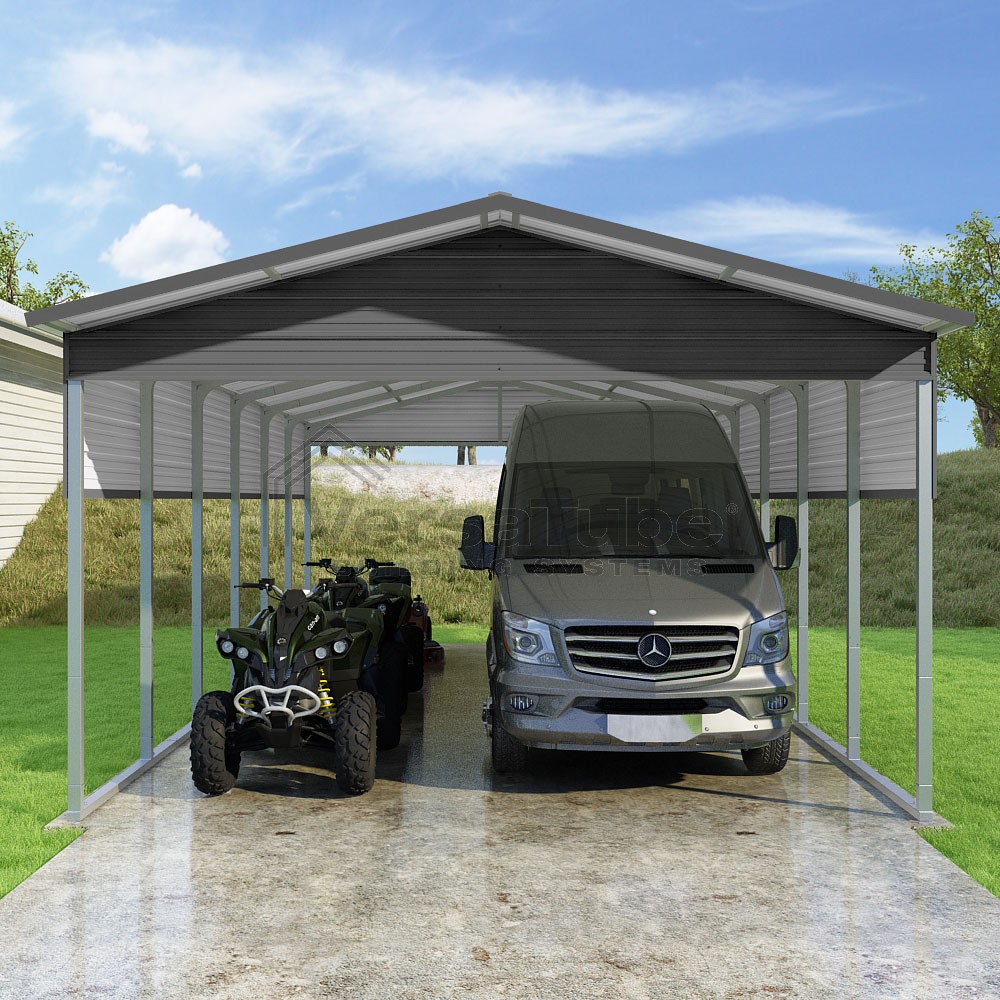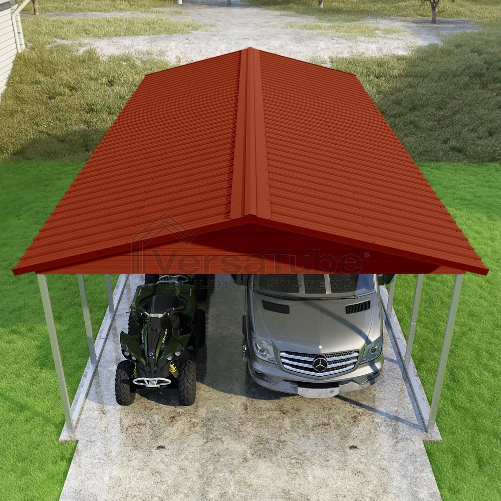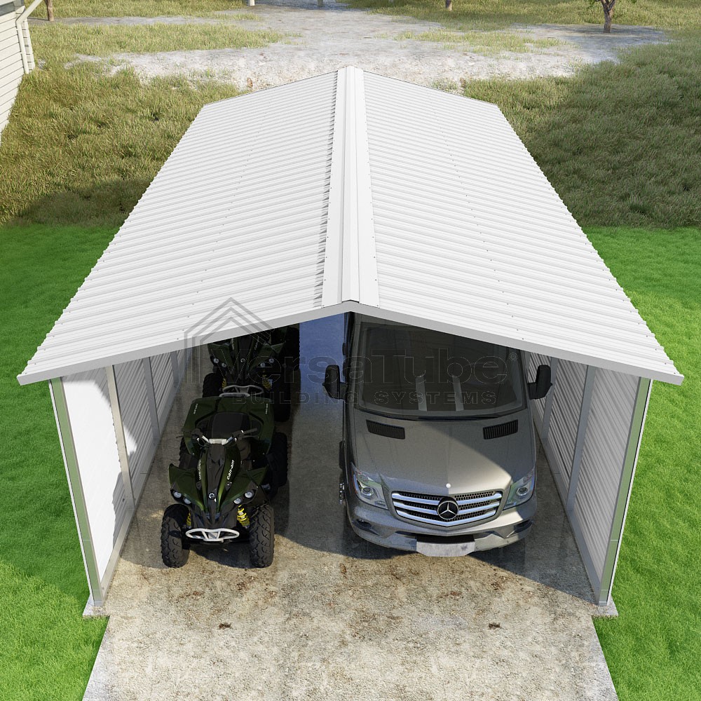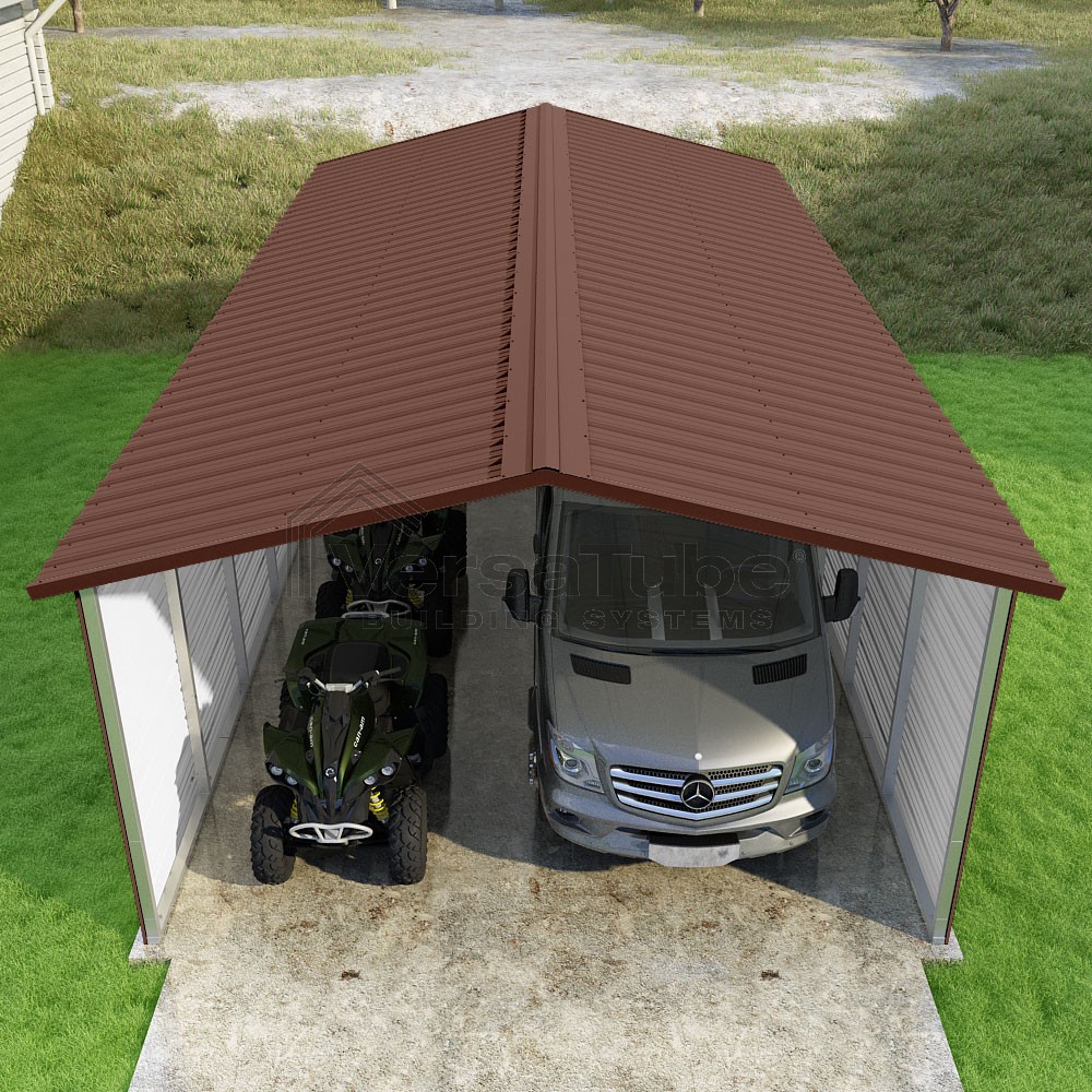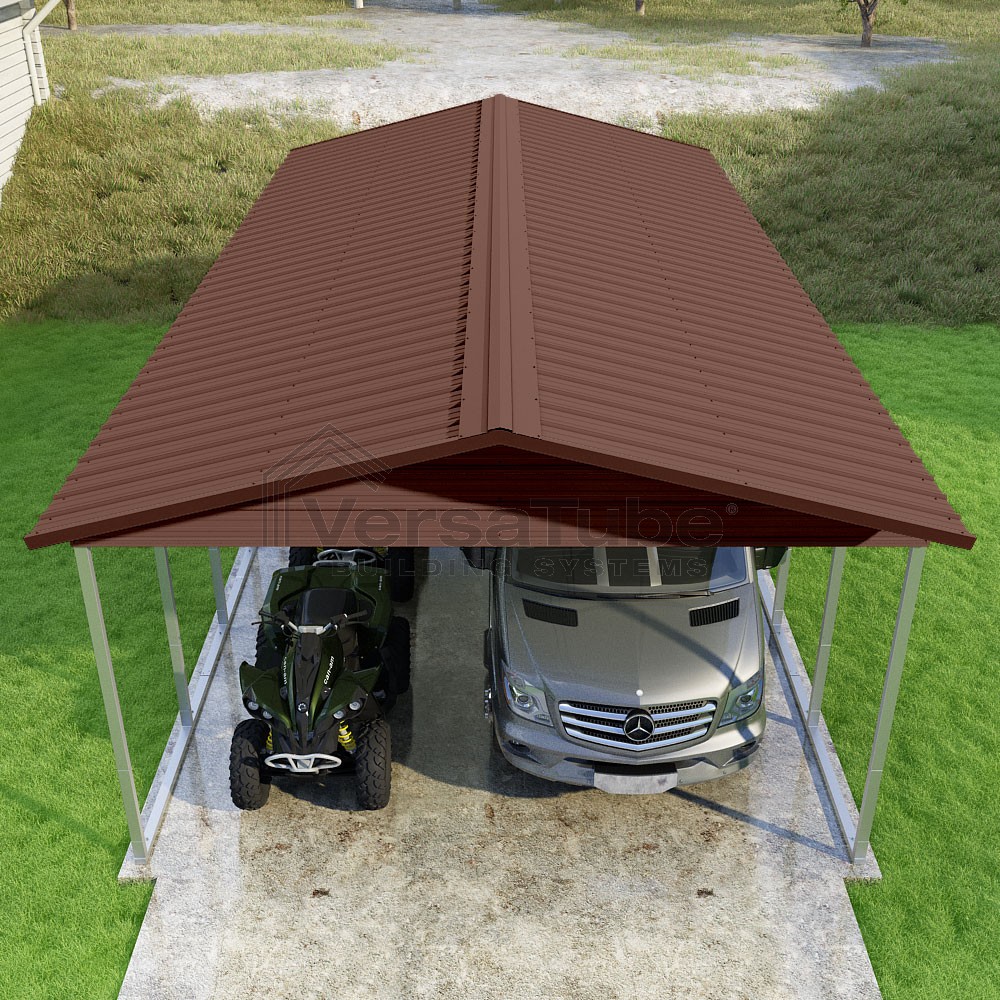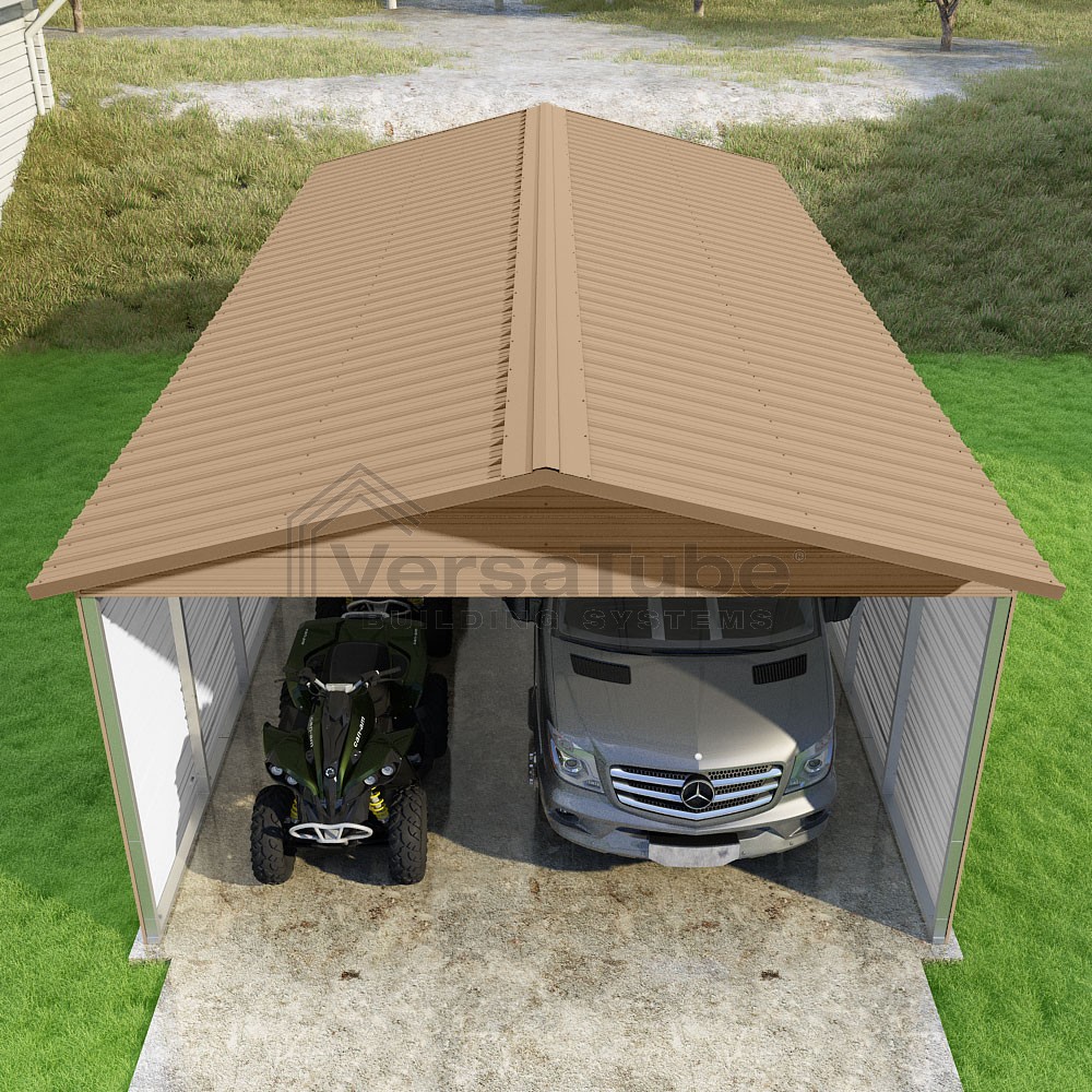 Pinnacle Series DIY carport kit features vertical sheet metal roof panels with ridge cap, gable and eave trim for an A-frame roof style and extended coverage on both ends.