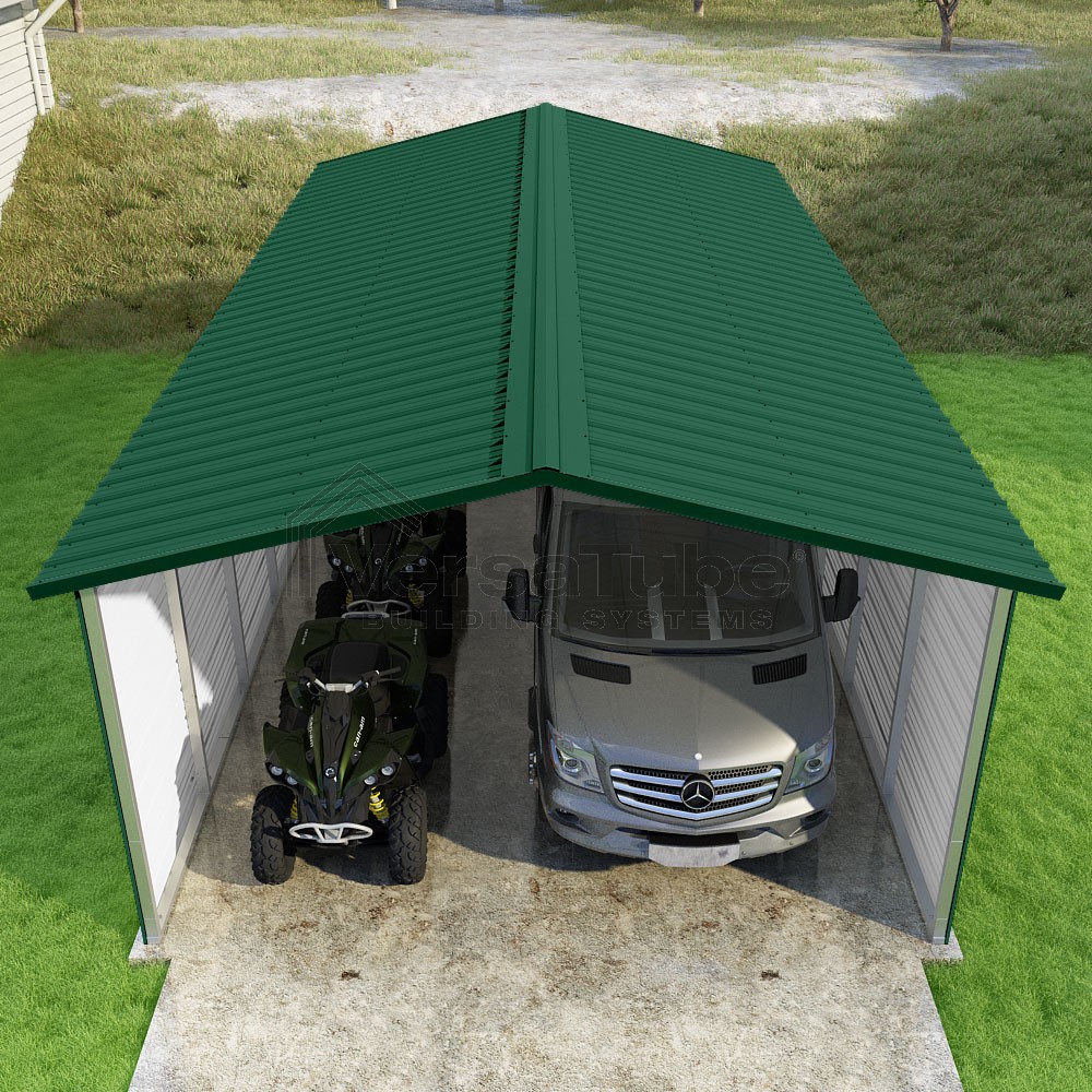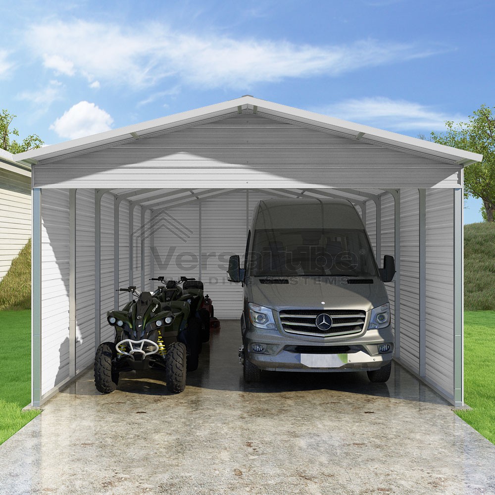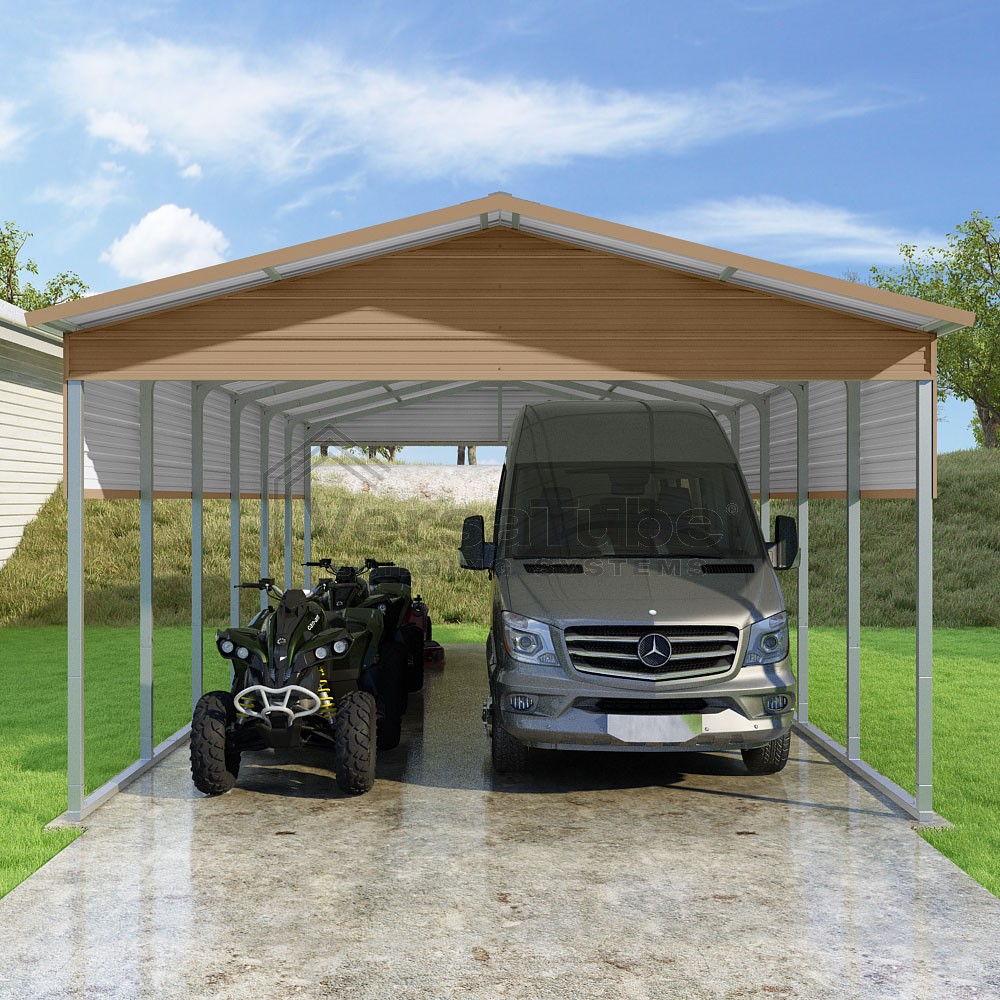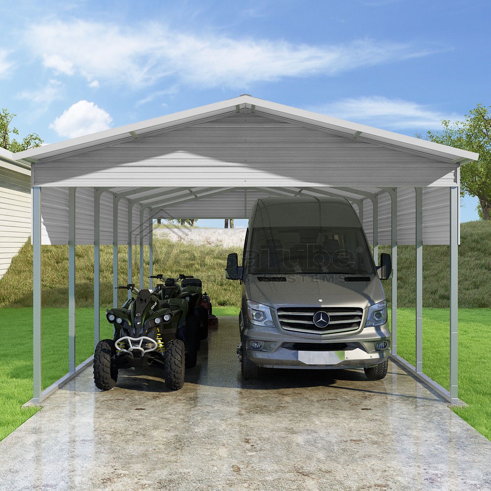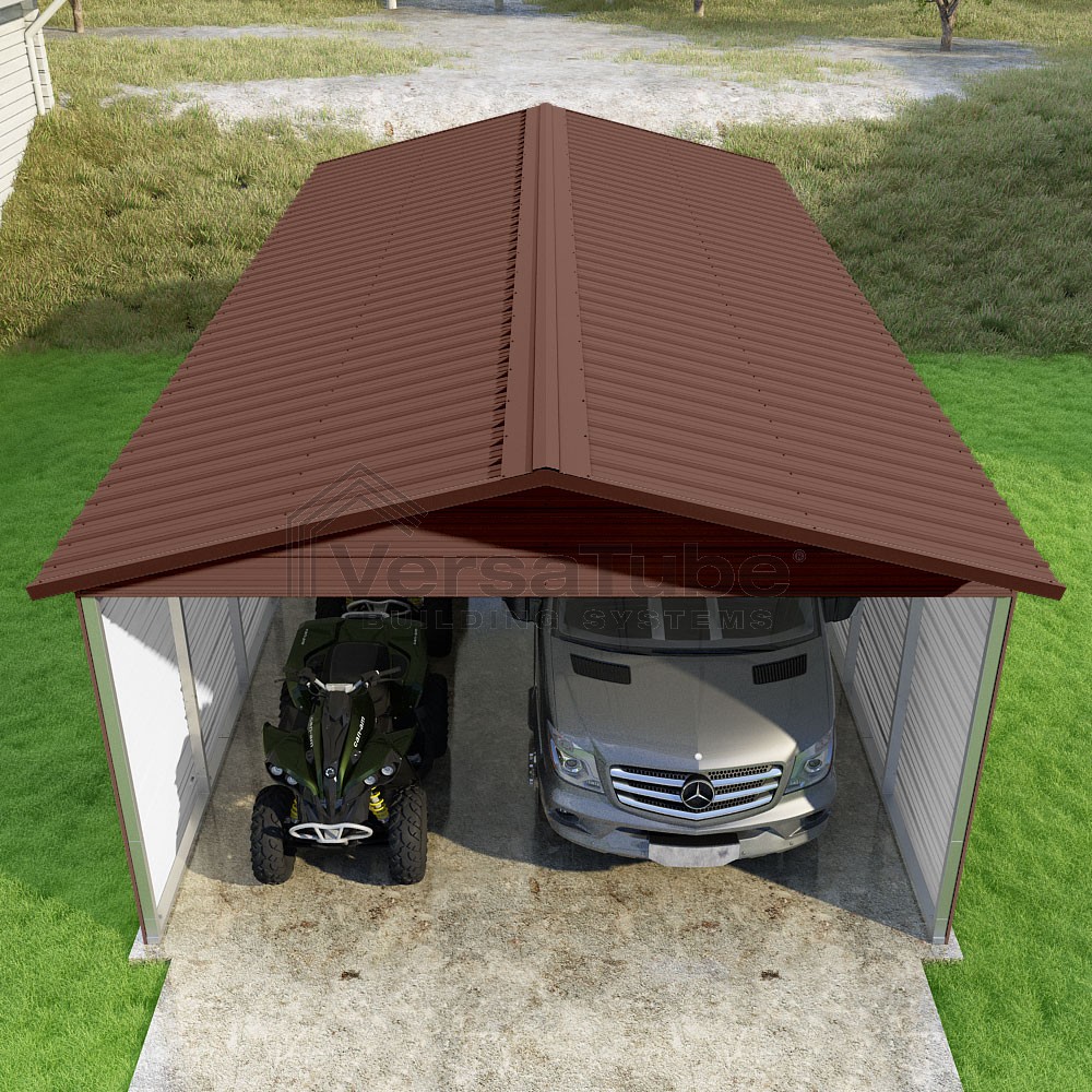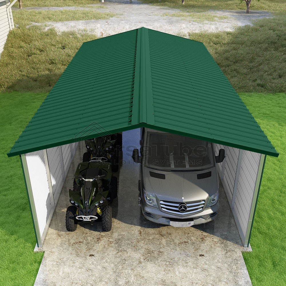 Pinnacle Series DIY carport kit features vertical sheet metal roof panels with ridge cap, gable and eave trim for an A-frame roof style and extended coverage on both ends.