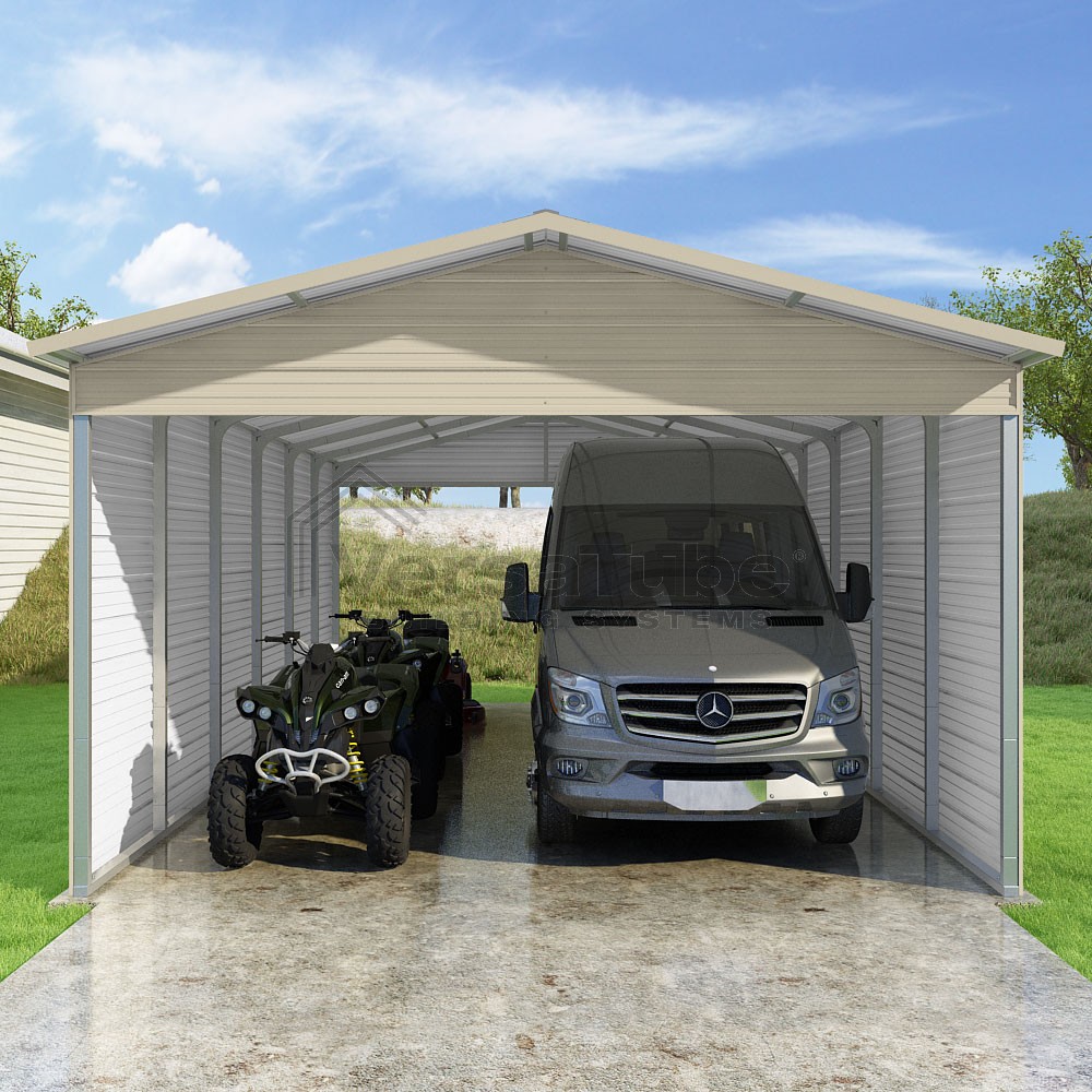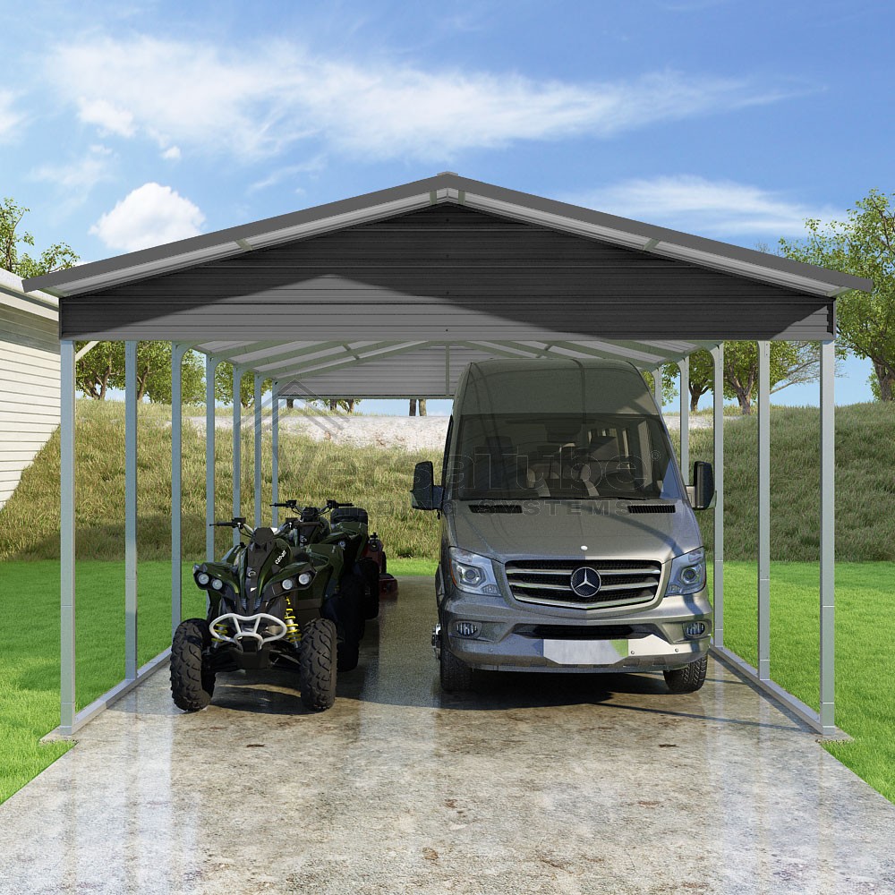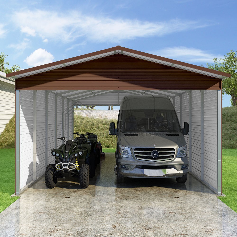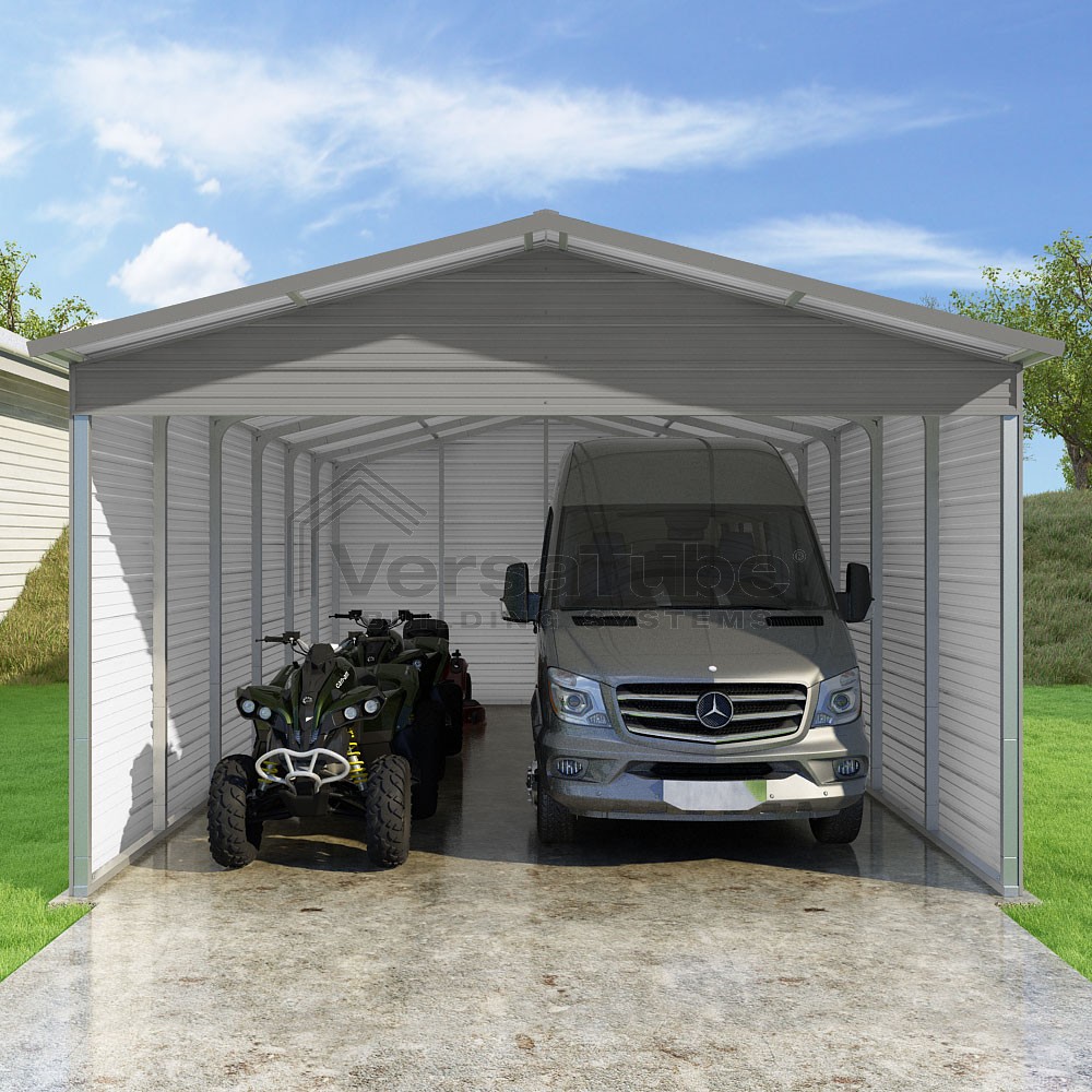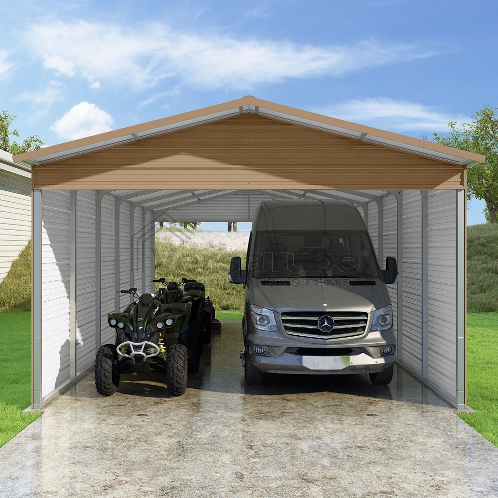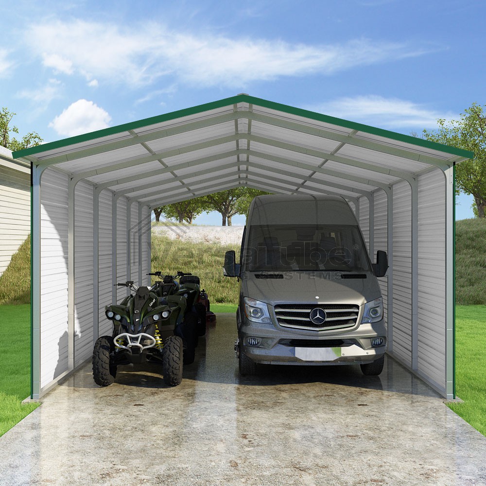 Pinnacle Series DIY carport kit features vertical sheet metal roof panels with ridge cap, gable and eave trim for an A-frame roof style and extended coverage on both ends.