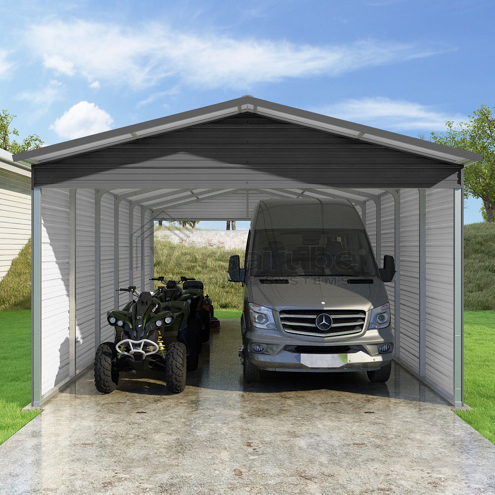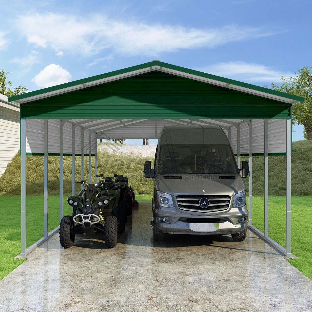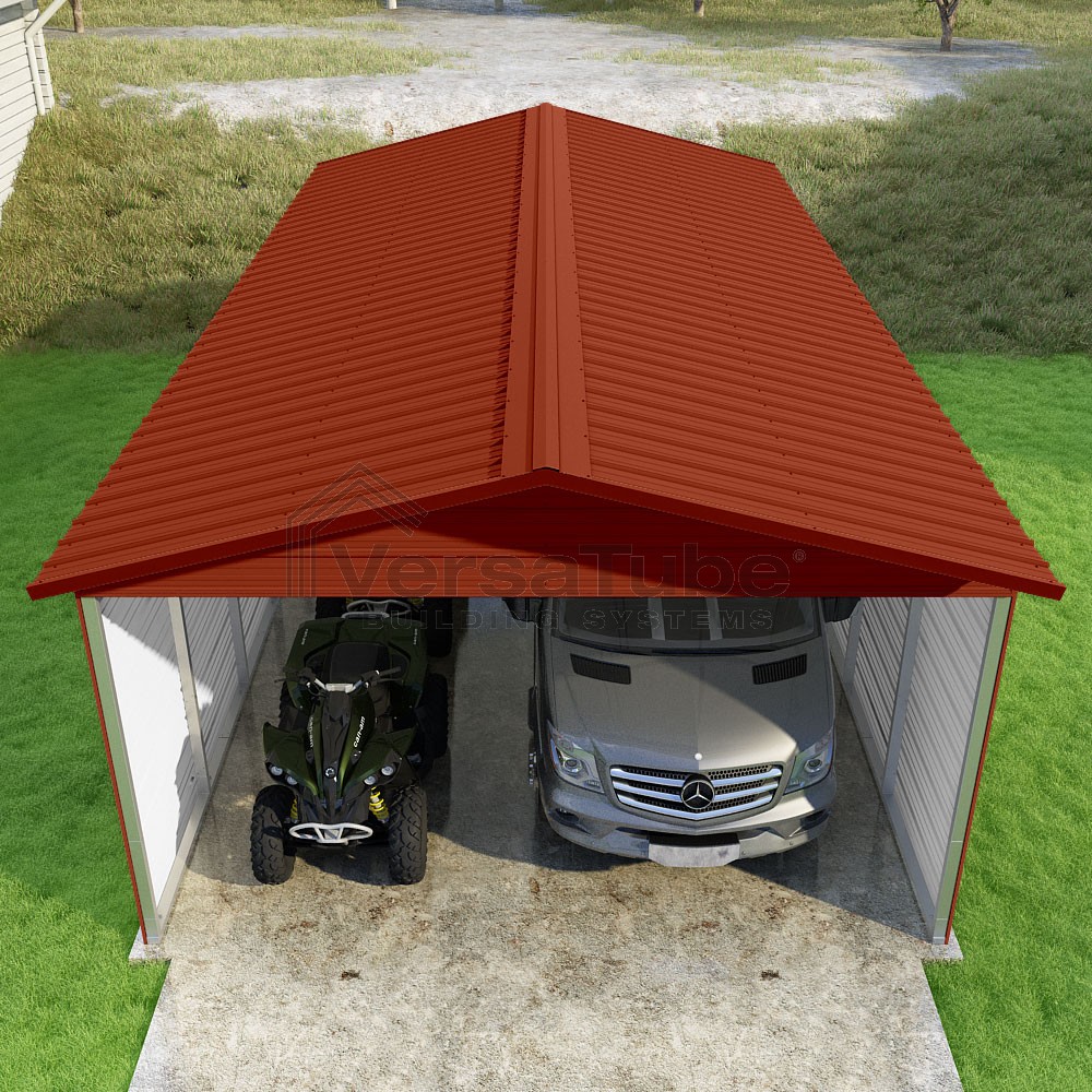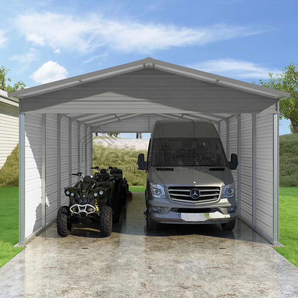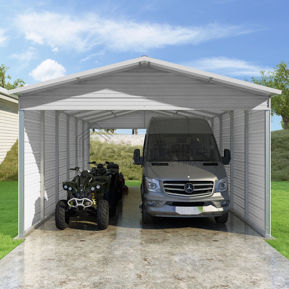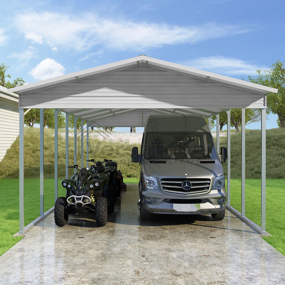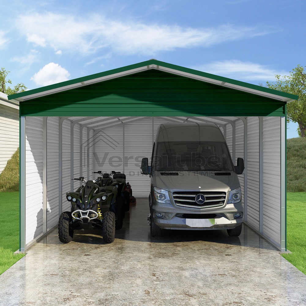 Pinnacle Series DIY carport kit features vertical sheet metal roof panels with ridge cap, gable and eave trim for an A-frame roof style and extended coverage on both ends.