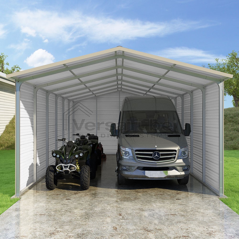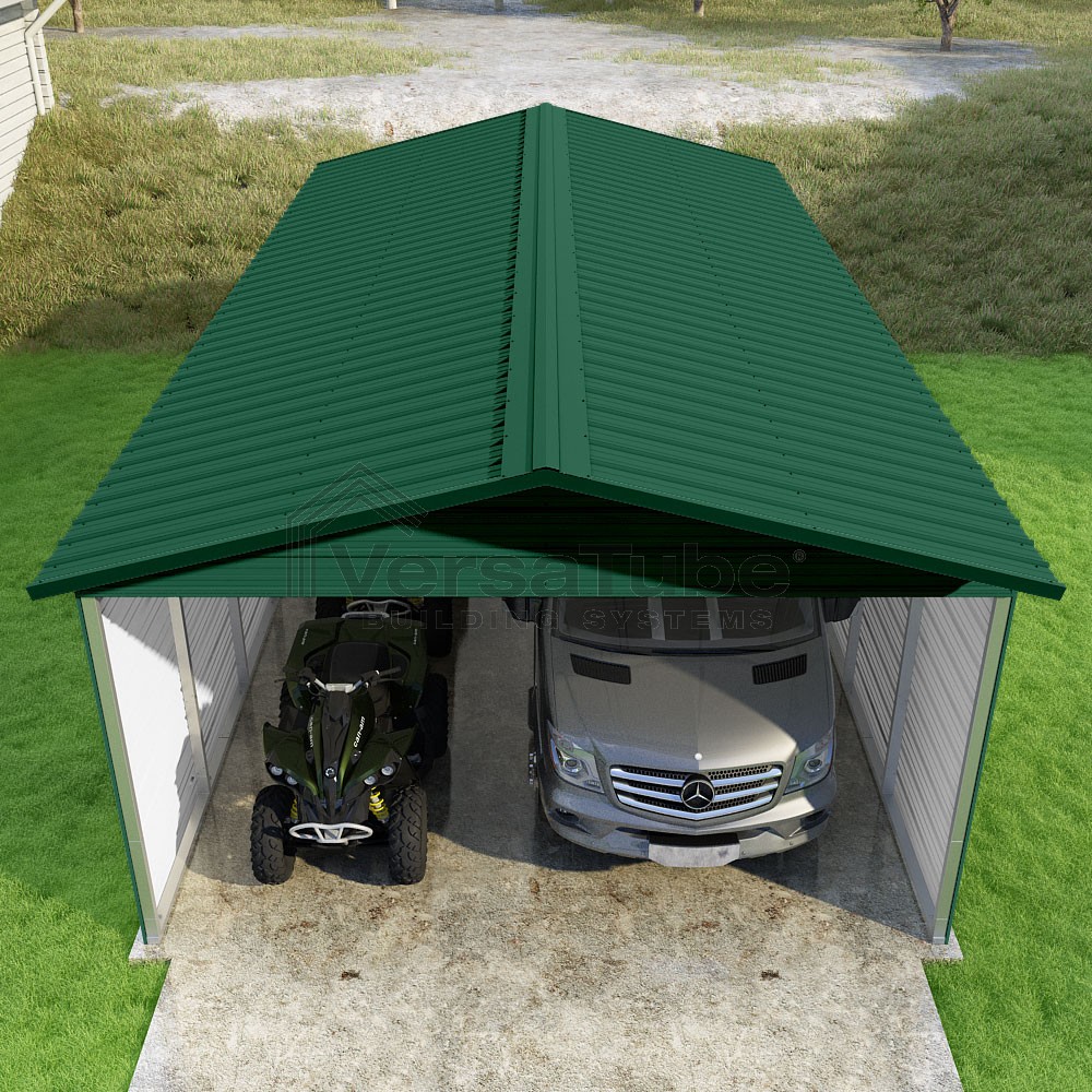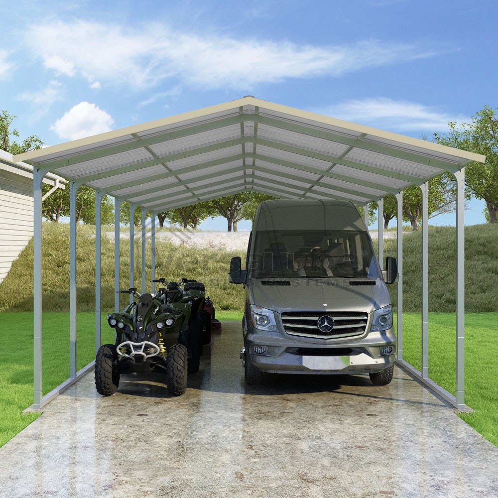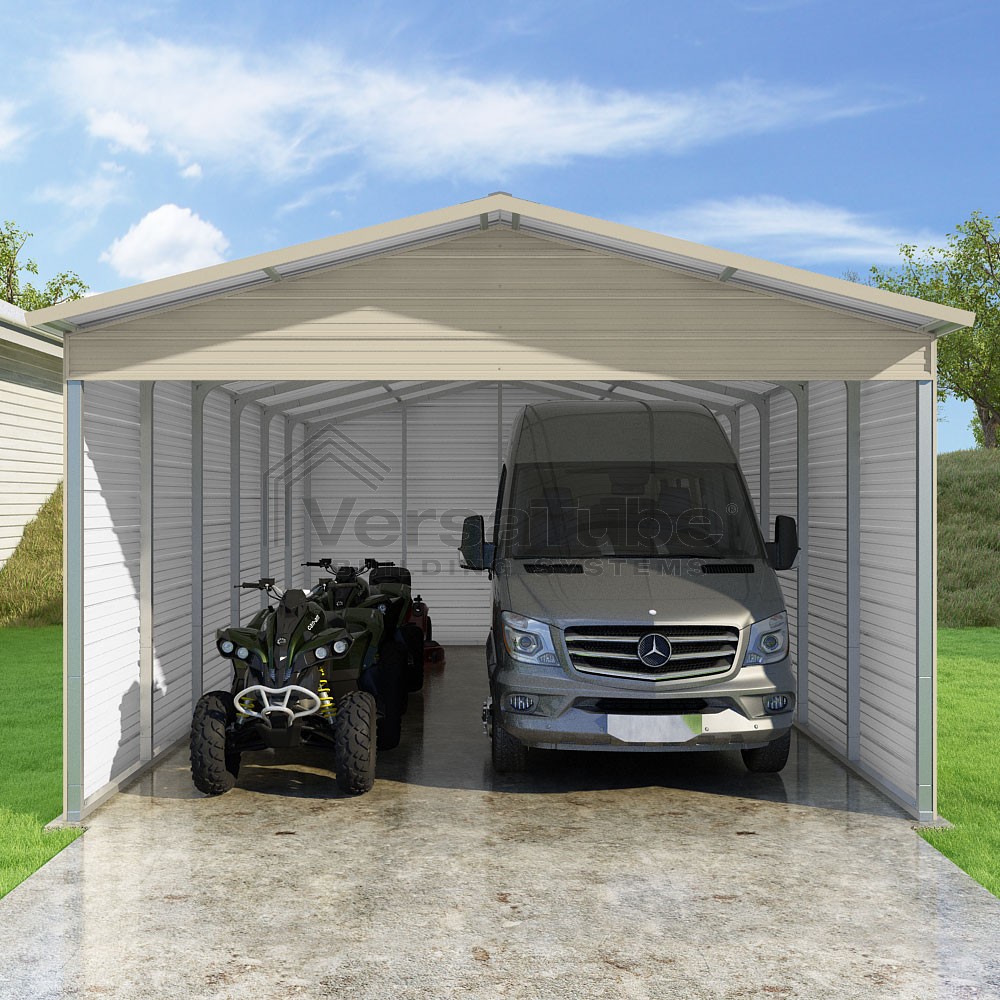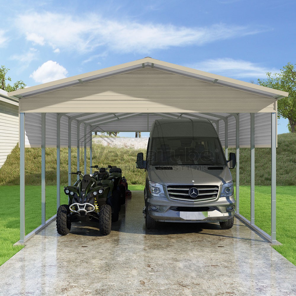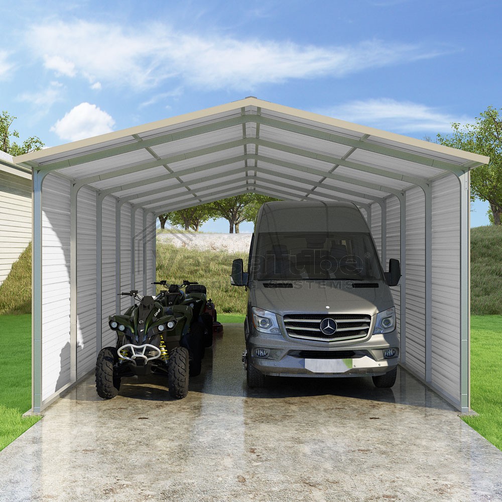Pinnacle Series DIY carport kit features vertical sheet metal roof panels with ridge cap, gable and eave trim for an A-frame roof style and extended coverage on both ends.