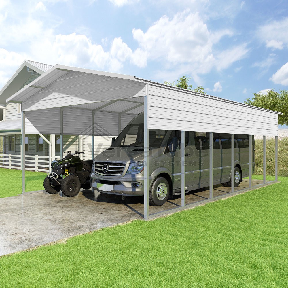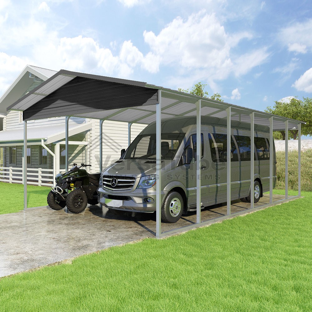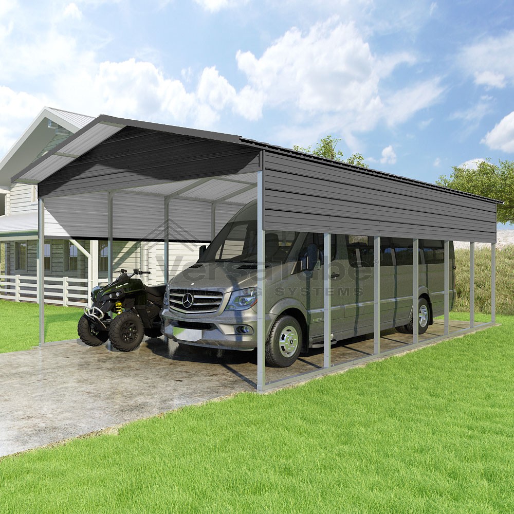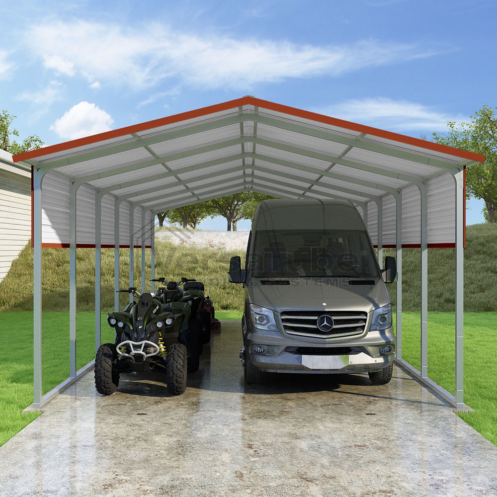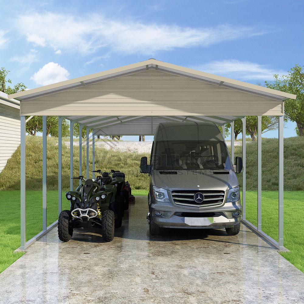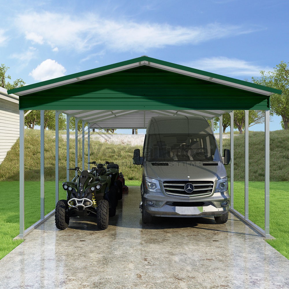 Pinnacle Series DIY carport kit features vertical sheet metal roof panels with ridge cap, gable and eave trim for an A-frame roof style and extended coverage on both ends.
