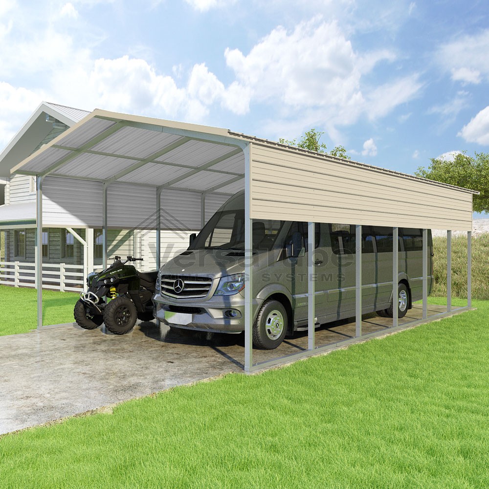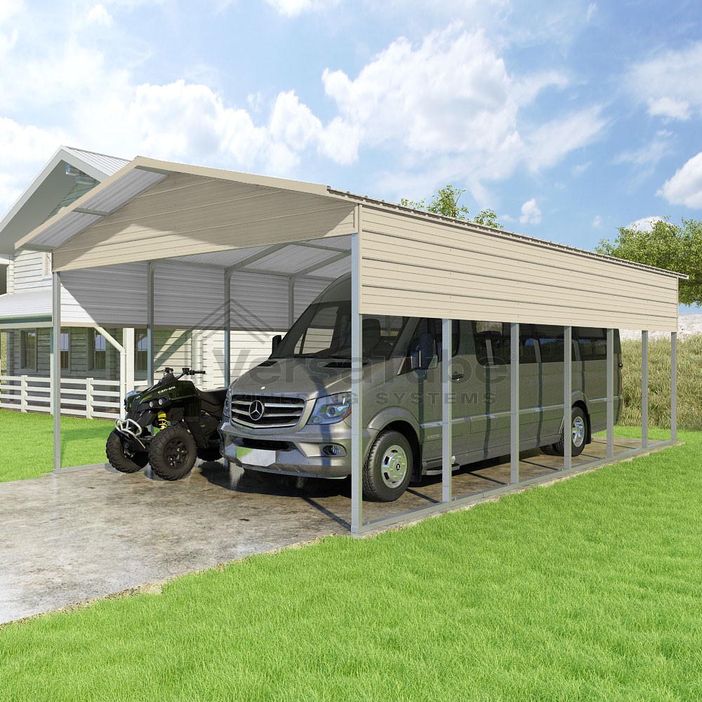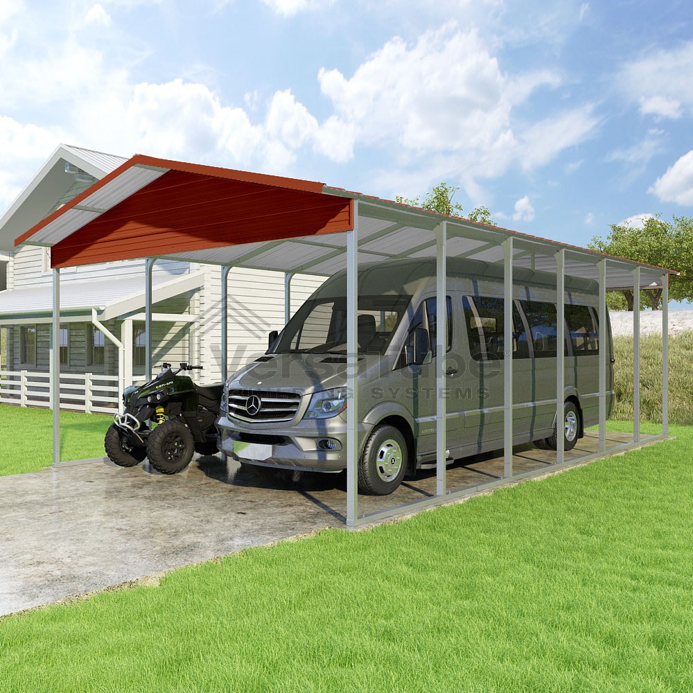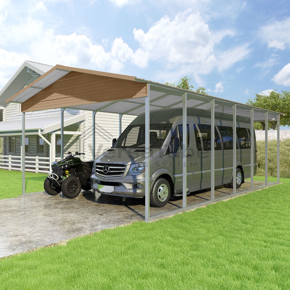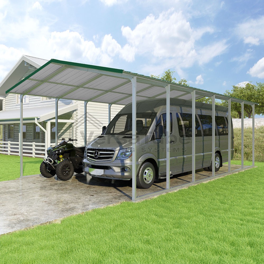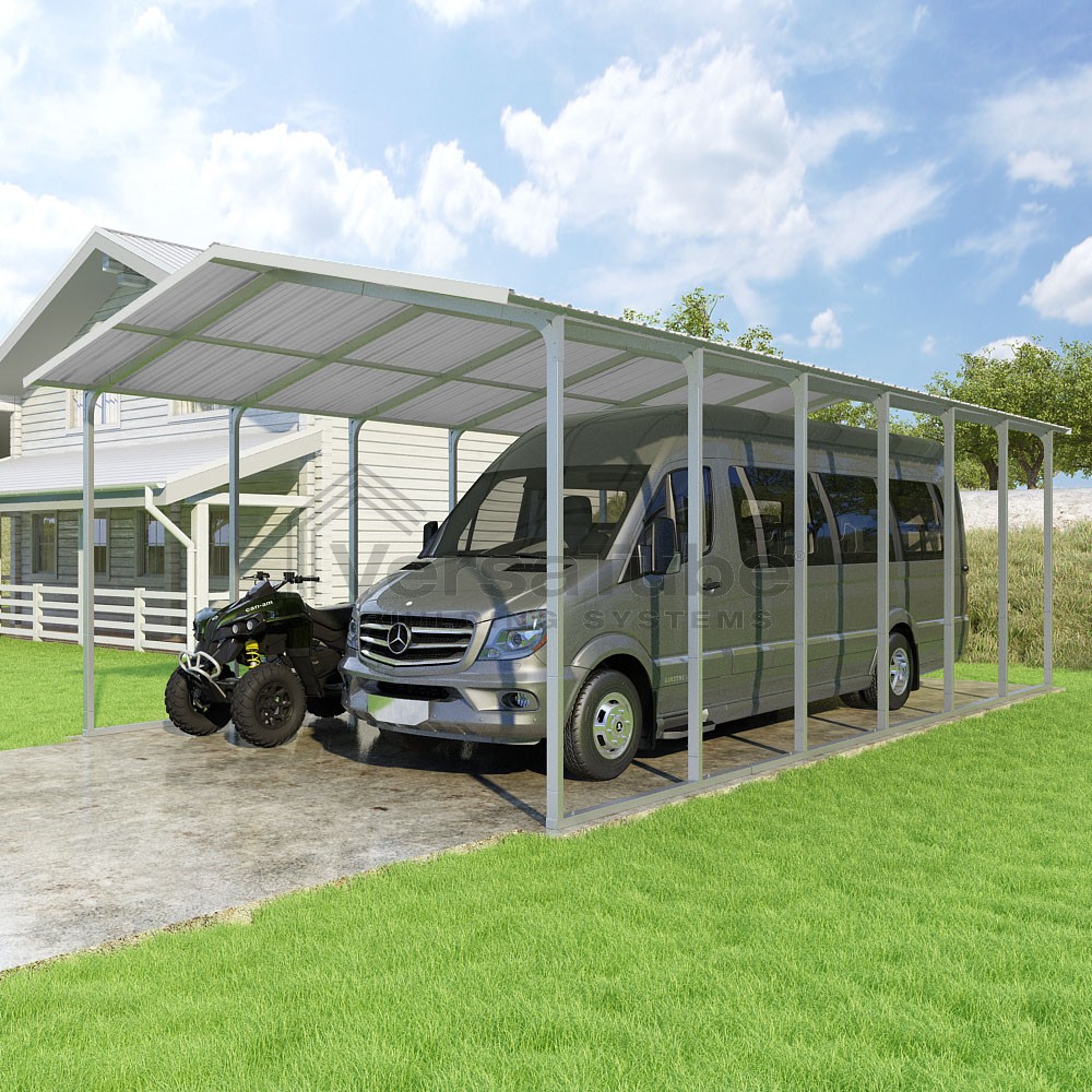 Pinnacle Series DIY carport kit features vertical sheet metal roof panels with ridge cap, gable and eave trim for an A-frame roof style and extended coverage on both ends.