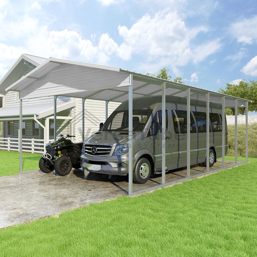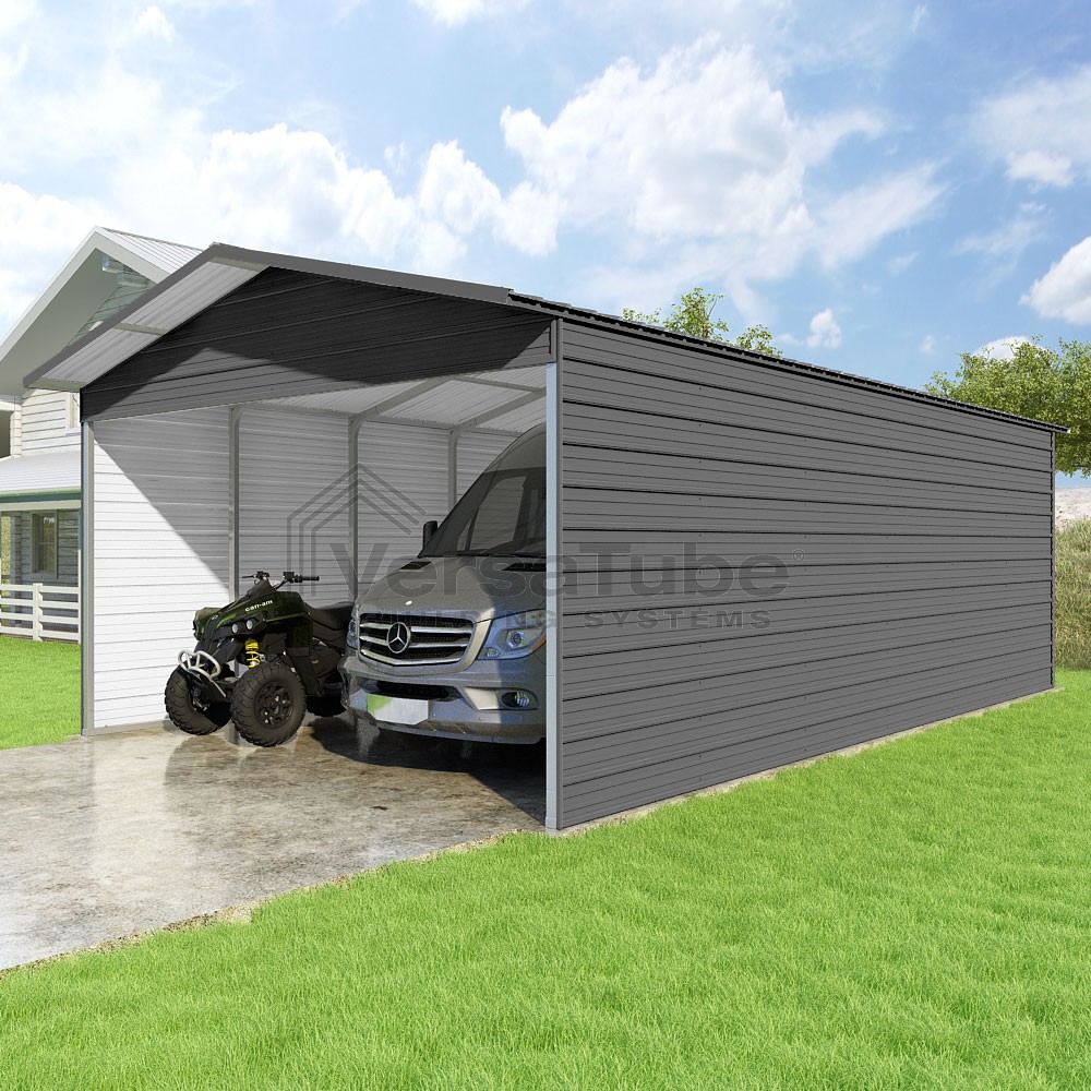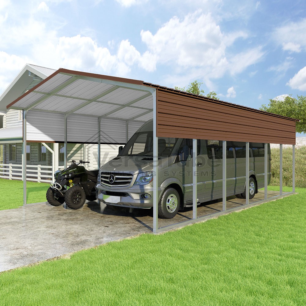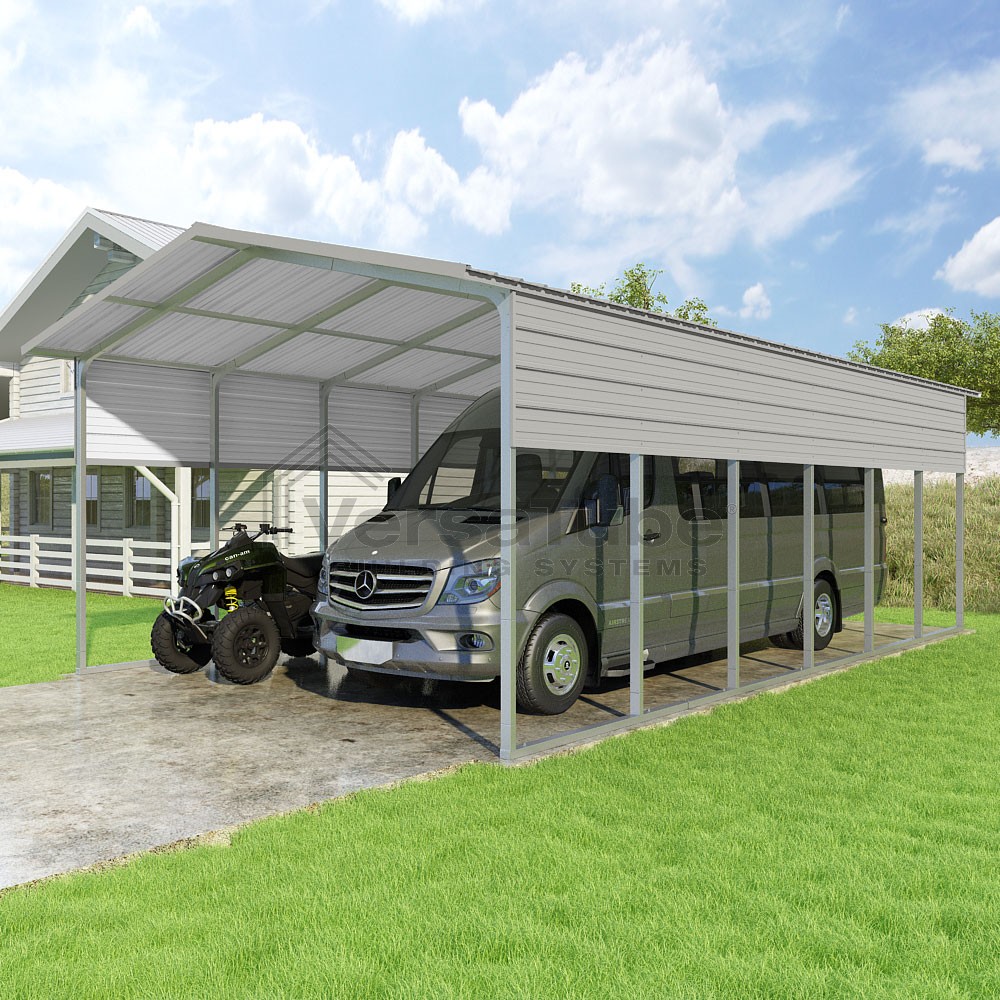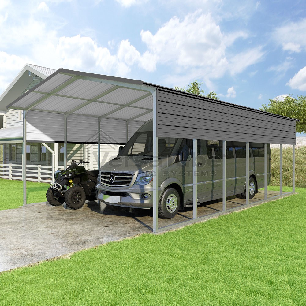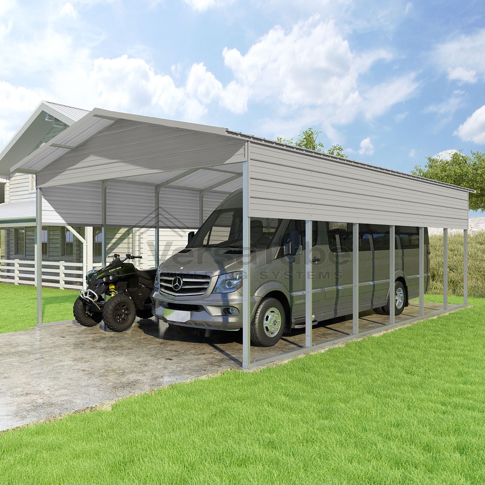 Pinnacle Series DIY carport kit features vertical sheet metal roof panels with ridge cap, gable and eave trim for an A-frame roof style and extended coverage on both ends.